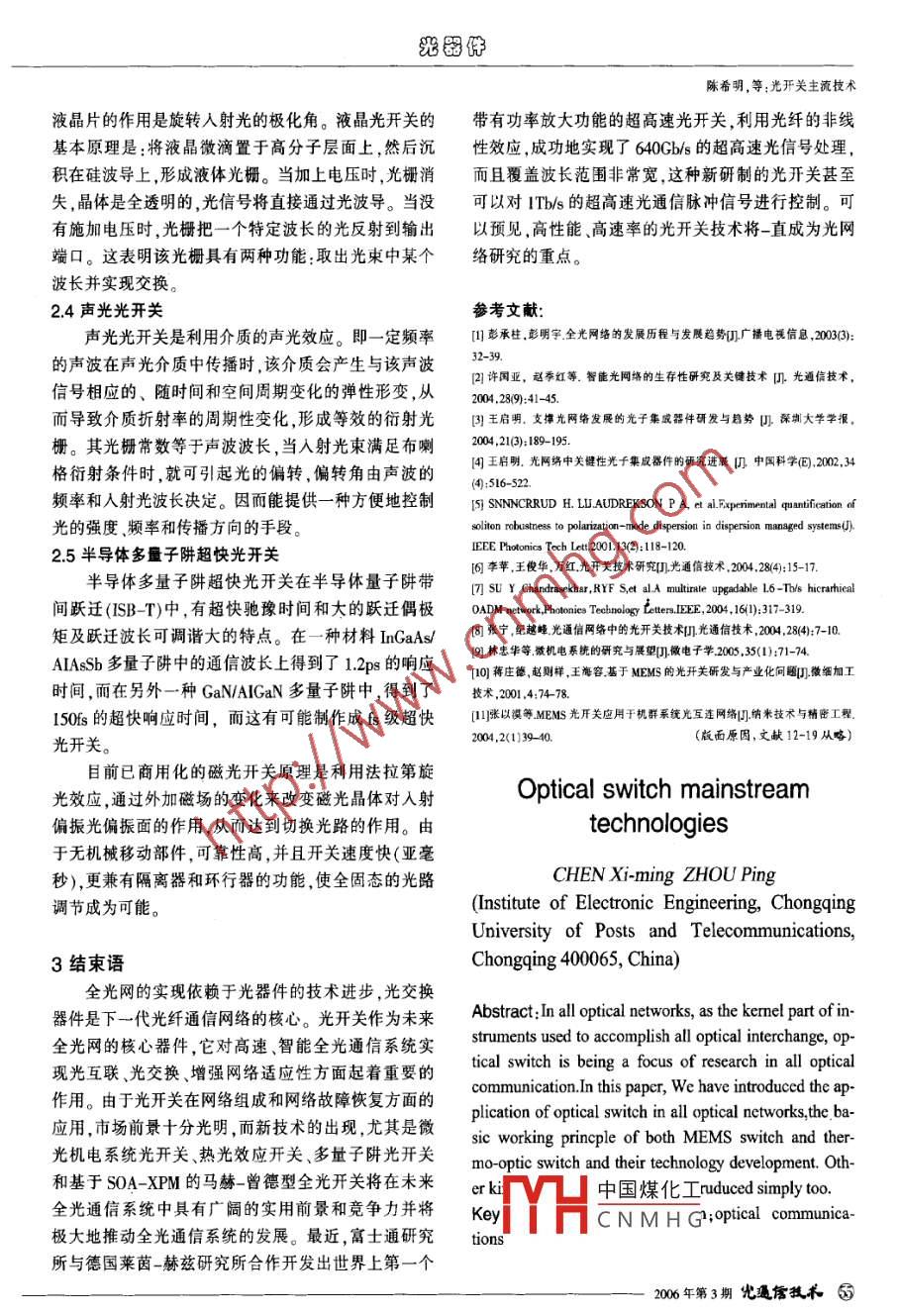 光器件中文核心期刊光開關(guān)主流技術(shù)陳希明,周平(重慶郵電學(xué)院光電工程學(xué)院,重慶400065)摘要:光開關(guān)是光網(wǎng)絡(luò)中完成全光交換的核心器件,關(guān)主要采用硅微加工技術(shù)將開關(guān)集成在單片硅基底它的研究日益成為全光通信領(lǐng)域關(guān)注的焦點(diǎn)。文章重上并能構(gòu)成大規(guī)模矩陣陣列。另外,此類開關(guān)批量生點(diǎn)介紹了光開關(guān)在全光網(wǎng)絡(luò)中的應(yīng)用、MEMS光開關(guān)和.產(chǎn)時(shí)成本較低,在開關(guān)損耗、串?dāng)_消光比、開關(guān)尺寸熱光開關(guān)的基本工作原理及兩種光開關(guān)技術(shù)的進(jìn)展,等性能方面優(yōu)勢明顯,是光開關(guān)的較佳選擇。并就其他光開關(guān)作了簡要介紹。2.1微電子機(jī)械系統(tǒng)(MEMS -micro- electro-me-關(guān)鍵詞:全光網(wǎng)絡(luò);光開關(guān);光通信chanical- systems)中圉分類號:TN929.11文獻(xiàn)標(biāo)志碼:AMEMS是通過微制造技術(shù)將微型機(jī)械元件、微型傳感器、微型執(zhí)行器和信號處理及控制電路等在普通1前言硅基底上集成。我國的MEMS研究始于1989年,經(jīng)過全光網(wǎng)絡(luò)是指上、下載的業(yè)務(wù)信號及交換過程均十幾年的發(fā)展,在多種微型傳感器、微執(zhí)行器和若干以光波的形式進(jìn)行,沒有任何的光電及電光轉(zhuǎn)換,全微系統(tǒng)樣機(jī)等方面已有一定的基礎(chǔ)和技術(shù)儲備,開發(fā)部過程都在光域范圍內(nèi)完成1.2。光開關(guān)是按一定要求出了若干小批量、多品種、高質(zhì)量的MEMS器件和系將一個(gè)光通道的光信號轉(zhuǎn)換到另一個(gè)光通道的器件。統(tǒng),目前已廣泛應(yīng)用于工業(yè)領(lǐng)域!。而MEMS光開關(guān)是光開關(guān)可使光路之間進(jìn)行直接交換,是光網(wǎng)絡(luò)中完成基于半導(dǎo)體微細(xì)加工技術(shù)構(gòu)筑在半導(dǎo)體基片上的微全光交換的核心器件,隨著全光網(wǎng)絡(luò)市場的擴(kuò)大,光鏡陣列,即將電、機(jī)械和光集成為一塊芯片 ,能透明地開關(guān)的研究8益成為全光通信領(lǐng)域關(guān)注的焦點(diǎn)。在全傳送不同速率、不同協(xié)議的業(yè)務(wù)。目前已成為一種最光網(wǎng)絡(luò)中,光開關(guān)可實(shí)現(xiàn)在全光層的路由選擇、波長流行的光開關(guān)制作技術(shù)。其基本原理通過靜電力或電選擇、光交叉連接以及自愈保護(hù)等重要功能,因此光開磁力的作用,使可以活動(dòng)的微鏡產(chǎn)生升降、旋轉(zhuǎn)或移關(guān)是全光通信許多設(shè)備中的關(guān)鍵光器件,其響應(yīng)速動(dòng),從而改變輸人光的傳播方向以實(shí)現(xiàn)光路通斷的功度、串音、插人損耗等性能將直接影響全光通信的質(zhì)能,使任一輸人和輸出端口相連接,且1個(gè)輸出端口量(0。其中光交叉連接設(shè)備(0XC)和光分插復(fù)用設(shè)備在同一時(shí)間只能和1個(gè)輸人端口相連接。與現(xiàn)有的基(OADM)可以說是全光網(wǎng)的核心四。而光開關(guān)和光開關(guān)于光波導(dǎo)技術(shù)的光開關(guān)相比,MEMS光開關(guān)具有低串陣列恰恰是0XC和0ADM的核心技術(shù)。研制全光的音、低插損的優(yōu)點(diǎn)成為全光網(wǎng)絡(luò)中的關(guān)鍵光器件。同交叉連接0XC和分插復(fù)用0ADM設(shè)備,成為建設(shè)大時(shí)它既有機(jī)械光開關(guān)和波導(dǎo)光開關(guān)的優(yōu)點(diǎn),又克服了容量通信干線網(wǎng)絡(luò)十分重要的-環(huán)。光機(jī)械開關(guān)難以集成和擴(kuò)展性差等缺點(diǎn)10-3),它結(jié)構(gòu)全光網(wǎng)絡(luò)中應(yīng)用的光開關(guān)應(yīng)具有快的響應(yīng)速度、緊湊、重量輕,且擴(kuò)展性較好。MEMS光開關(guān)的特性可低的插人損耗、低通道串音、對偏振不敏感、可集成性概括為1416:低插入損耗;低串?dāng)_;與波長、速率、調(diào)制和可擴(kuò)展性、低成本、低功耗、熱穩(wěn)定性好等特性168。方式無關(guān);功耗低;堅(jiān)固、壽命長;可集成擴(kuò)展成大規(guī)模光開關(guān)矩陣;適中的響應(yīng)速度(開關(guān)時(shí)間從100ns~2光開關(guān)在全光網(wǎng)絡(luò)中的應(yīng)用10ms)。在光交叉連接及需要支持大容最交換的系統(tǒng)當(dāng)前業(yè)已成熟的、且已實(shí)現(xiàn)商品化的微電子機(jī)械中,基于MEMS技術(shù)的解決方案已是主流。光開關(guān)和熱光開關(guān),集中了機(jī)械式光開關(guān)和波導(dǎo)光開MEMS光開關(guān)可以分為二維和三維光開關(guān)。二維關(guān)的優(yōu)點(diǎn),同時(shí)又克服了它們固有的缺點(diǎn)。此類光開光開關(guān)由一種受靜電控制的二維微小鏡面陣列組成,光束在二維空間傳輸.準(zhǔn)直米束和旋轉(zhuǎn)微鏡構(gòu)成多端收稿日期:2005-09 -26。基金項(xiàng)目:重慶郵電學(xué)院凝聚態(tài)物理碩士點(diǎn)和微電子與固體電子學(xué)博口光f YH中國煤化工陣,光開關(guān)具有MxN士點(diǎn)學(xué)科建設(shè)經(jīng)費(fèi)資助。個(gè)簡CNMHG反射鏡具有兩個(gè)狀態(tài)0.作者簡介:陳希明(1964-).男,重慶市人,副教授.主要從事大學(xué)物理教和1(通和斷),當(dāng)光開關(guān)處于1態(tài)時(shí),反射鏡處于由輸學(xué)與光通信研究。2006年第3期光通償技術(shù)5光器件陳希明,等:光開關(guān)主流技術(shù)人