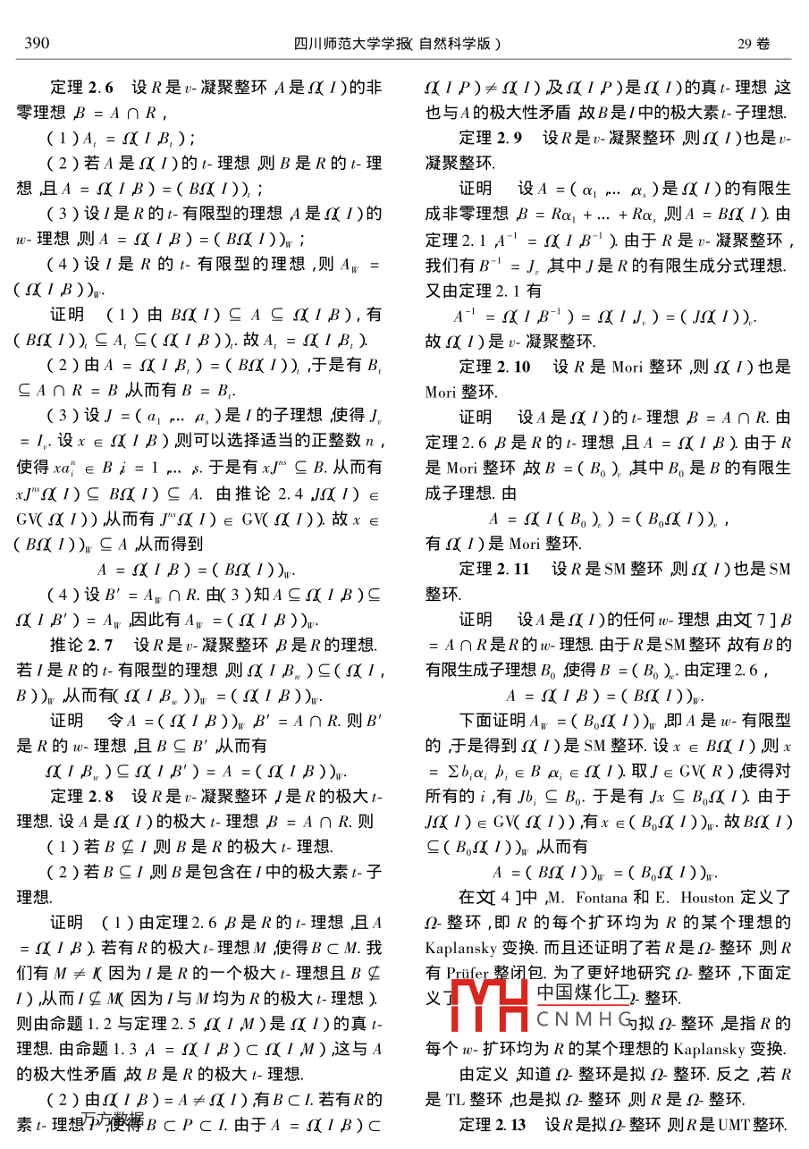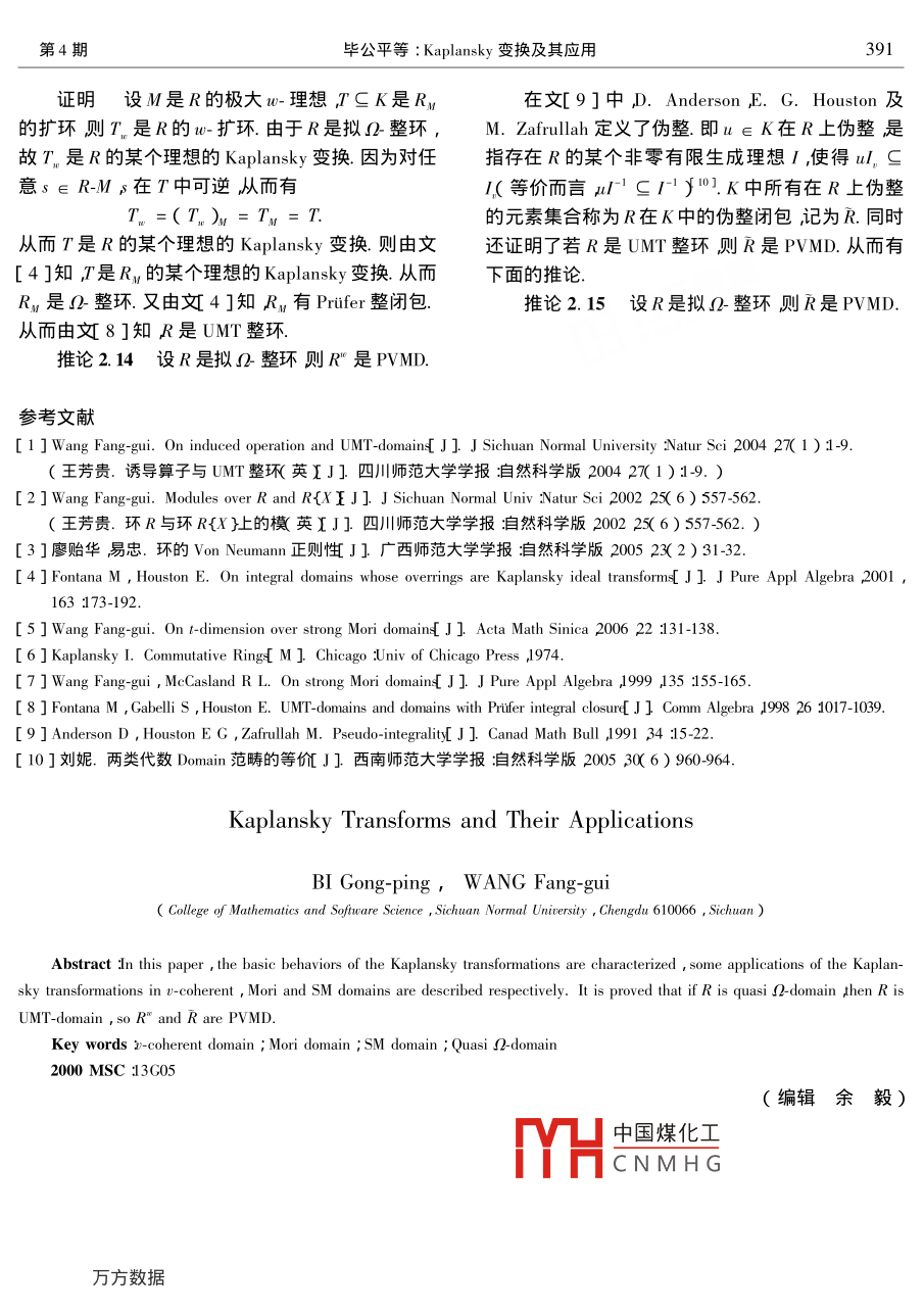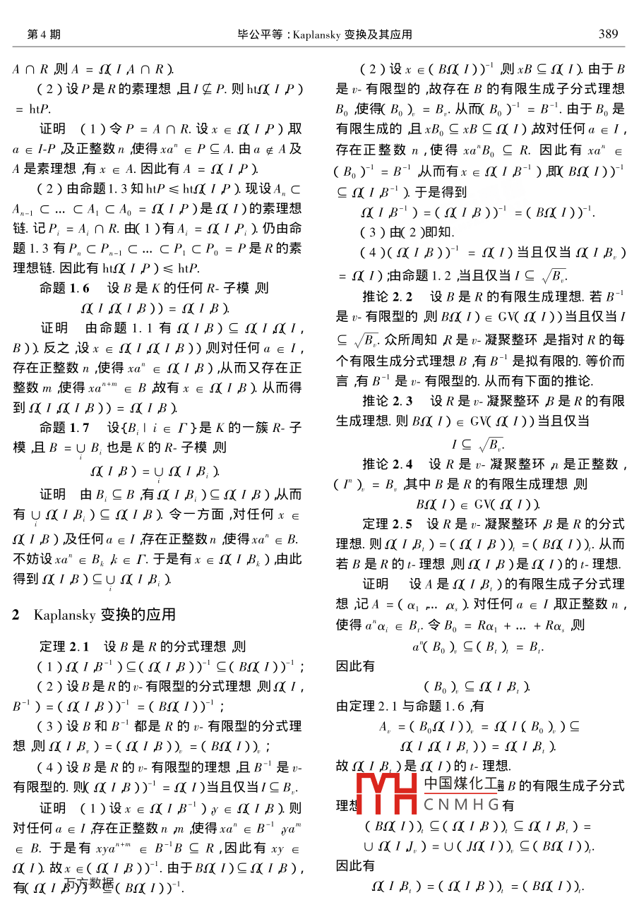 2006年7月四川師范大學學報(自然科學版)july 2006第29卷第4期Journal of Sichuan Normal University( Natural ScienceVol 29 No 4Kaplansky變換及其應用畢公平,王芳貴四川師范大學數學與軟件科學學院,四川成都610066)摘要刻畫了 Kaplansky變換的基本性質描述了 Kaplansky變換在υ-凝聚整環(huán)Moni整環(huán)及SM整環(huán)上的一些應用證明了若R是擬Ω整環(huán)則R是UMT整環(huán)從而R有PVMD的-整閉包及偽整閉包即R及R是PⅤMD關鍵詞-凝聚整環(huán);Mσni整環(huán);SM整環(huán);擬Ω整環(huán)中圖分類號153.3文獻標識碼:文章編號1001-83952006)40387050引件即R的每個理想是有限型的3已知 Noether整環(huán) Krull整環(huán)及 Dedekind整環(huán)均為SM整環(huán)SM整以下恒設R是具有單位元的交換環(huán)K是R的環(huán)是Mori整環(huán)且Mori整環(huán)是υ-凝聚整環(huán).商域.F(R)表示R的所有非零分式理想的集合對在文4]中M. Fontana和E. Houston定義了∈R)l=()且=UJ其中/取遍/的Naga變換即設是R的非零理想則R的擴環(huán)有限生成子理想若I=(=l)則/是一個u-理TK1)=∪[R!]=想(t-理想)Ⅰ是t有限型的-有限型的)是指{x∈K存在正整數n使得x/gR}J,=J(l=J=J,)其中J是的某個有限生稱為理想Ⅰ關于R的 Nagata變換.在文[5]中成子理想.顯然/是t-有限型的等價于是t-有限型的沮且/是t-有限型的-理想等價于/是v-有限型Wang fang-gui討論了 Nagata變換的基本性質,并刻畫了 Nagata變換在Mori整環(huán)及SM整環(huán)上的應的υ-理想.υ-算子與t-算子都是星型算子的例子.關用得到了一系列很好的性質.本文受此啟發(fā),討論于星型算子的例子還有-算子1我們稱丿是R的個GV-理想是指J是R的一個非零有限生成理了一個比 Nagata變換更廣的 Kaplansky變換.在文想且滿足廠=R記為J∈CR)設M是個[6]中設/是R的非零理想 Kaplansky定義了R的擴環(huán)無撓模集合1)={x∈K!對任何a∈I存在正整數M=x∈kM|存在n=Kax)使得xa"eRJ∈GR)使得JxM}這個擴環(huán)在文[4]被稱之為理想Ⅰ關于R的稱為M的-包絡M是有限型的是指M=N其 Kaplansky變換同時我們描述了 Kaplansky變換在中N是M的某個有限生成孑模若M=M。則稱Mr-凝聚整環(huán)Mor整環(huán)及SM整環(huán)上的應用.在此基是-模如果M是R的一個理想且M。=M則稱M礎上定義了擬Ω整環(huán)即R的每個w-擴環(huán)均為R是一個w-理想的某個理想的 Kaplansky變換.這是一類比Ω整環(huán)個整環(huán)R是υ凝聚整環(huán)是指對R中的任何(即R的每個擴環(huán)均為R的某個理想的 Kaplansky有限生成分式理想B,有B-是擬有限的等價而變換)更廣的環(huán)類顯然!整環(huán)是擬Ω整環(huán)言有Bˉ是υ-有限型的一個整環(huán)R是Mon整環(huán),之若R既是TL整環(huán)又是擬Ω整環(huán)則R是Ω整是指R有關于v-理想的升鏈條件等價而言是指R環(huán)的每個非零理想是t-有限型的2.類似地稱一個包中國煤化工不則R有Puer整閉CNMHG整環(huán)則R是UM整整環(huán)R是SM整環(huán)是指R有關于l-理想的升鏈條環(huán)從A號"、m以閉包及偽整閉包即R收稿日期2005-05-25基金項目國家自然科學基金10271052)和四川省應用基礎研究基金資助項目*聯系作據芳貴1955)男教授388四川師范大學學報自然科學版)29卷及R是PVMDIB)證明(1)aB)=從1)當且僅當1∈1 Kaplansky變換的基本知識ⅠB)當且僅當對任何a∈Ⅰ存在正整數n使設是R的理想在文6]中 Kaplansky定義得a"∈B當且僅當/c√B了R的一個擴環(huán)(2)設x∈A則對任何a∈Ⅰ取正整數n使1)={x∈K|對任何a∈存在正整數得xa"∈R.注意xa"∈A因此有xa"∈A∩Rn=ax)使得xa∈R故x∈IB)這個擴環(huán)在文4中被稱之為/的 Kaplansky變換命題13設PP1P2是R的素理想且/gP顯然當1=0時)=K.PI P2對K的任何R-子模B也定義(1)IP)是Ω1)的素理想且a/P)∩ⅠB)={x∈K|對任何a∈Ⅰ存在正整數R= Pn=n(ax)使得xa"∈B(2)IP1)=IP2)當且僅當P1=P2特別地取B=R前面的(1)就是aIB)證明(1)由命題1.2隊IP)≠)設x,命題1.1設BB1B2是K的R子模n∈K,y∈1)xy∈P)則對任何a∈/有正整數(1)若B1sB2則IB1)saIB2);mnk使得x"∈Rma"∈R且xya∈P.于是(2)IB1∩B2)=〖IB1)∩IB2)(xa")ya)=xyam∈P.故或者xa"∈P或(3)1HB)=uB)者y∈P即x∈級P)或者y∈/P)因(4)設B是R的分式理想則(IB)是1)此有ⅠP)是1)的素理想的分式理想顯然有PsΩP)∩R.另一方面,設x∈(5)設B是R的有限生成分式理想,且 BC I P)∩R由于gP故存在一個a∈P.取正1)則B,s1)整數n使得a"∈P.我們有x∈P因此有ΩIP)(6)1)是R的v-擴環(huán)于是若J∈GVR),∩R=P則必有J(1)∈GV1))(2)設P)=P2)則由1)有P1證明(1)與3)是顯然的P1)∩R=P2)∩R=P2(2)蟲1),有B1∩B2)sa1B1)∩命題1.4設B是R的理想,ⅠB2)反之設x∈IB1)∩aIB2)則對(1)√級IB)=B)任何a∈可選擇適當的正整數n使得xa"∈B1,(2)若B是準素理想且IgP=B則(IB)xa"∈B2同時成立于是有aIB1)nxIB2)是g1)的準素理想B1∩B2)證明(1)容易看到,(B)∈AB)(4)取u∈Ku≠0,使得uBR,由1)與(3)有uB)sa)故1B)是1的分反之沒x∈B)對任何a∈取正整數n式理想使得xa"∈√B.從而又有正整數m使得x"am∈B.(5)設B=(b1mb)則對任何a∈1可選于是有x∈√/B)從而得到取適當的正整數n使得b,a"∈Ri=1,,p.于是MIB)=INB)有a"BsR由此有aBR故Bs1)(2)由命題1.3,ⅠP)是1)的素理想(6)設B是1)的有限生成R子模由5),由政H中國煤化工設x∈a1)xgBnCB.c1)故1)是R的-擴環(huán)CNMH可a∈l取合適的正整命題1.2(1)設B是R的理想則aIB)數n使得xa"∈Rwa"∈Rxya"∈B.由xa"gP1)當且僅當I√B.因此若B是R的一個素理我們有ya"∈B.因此有y∈IB)故IB)是想則B)≠()當且僅當ⅠgB)的準素理想(2)使有獎x1)的理想B=A∩R則Ac命題1.5(1)設A是Ω1)的素理想且Ig第4期畢公平等: Ka