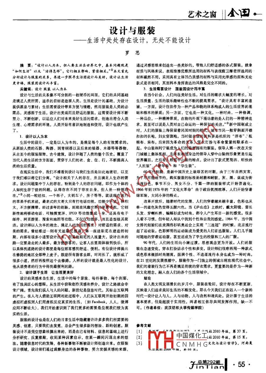 藝術(shù)之窗全田。設(shè)計(jì)與服裝一-生活中處處存在設(shè)計(jì),無(wú)處不能設(shè)計(jì)羅思摘要:“設(shè)計(jì)以人為本,但人要生活在世界之中,基本問(wèn)題就是通過(guò)靈感思維來(lái)創(chuàng)造 出一些美妙的, 帶給人們舒適感的各式服裝。就拿“如何生活”以及“活得怎樣"。它們相互影響、緊密相關(guān)?!彼谋疚氖紫炔馁|(zhì) 與鳳格來(lái)說(shuō),表現(xiàn)浪漫優(yōu)雅所選用的材料與表現(xiàn)前衛(wèi)摩登所選用的分析設(shè)計(jì)與服裝的關(guān)系,再進(jìn)一步探尋生活因設(shè)計(jì)而美好,設(shè)計(jì)讓生活材料截然不用,采用具有立體凹凸質(zhì)感的材料與采用光澤感的面料無(wú)論更幸福,服裝固設(shè)計(jì)而豐富。款式是否相同,其面料本身所表達(dá)的風(fēng)格是完全不同的。關(guān)鍵詞:設(shè)計(jì)服裝以人為本.3. 生活需要設(shè)計(jì) 服裝因設(shè)計(jì)而豐富設(shè)計(jì)與生活的關(guān)系像不可分割的一枚硬幣的兩面,它們的共同基礎(chǔ)在當(dāng)今社會(huì),人們向往美好生活,對(duì)生活的需求大幅度的增長(zhǎng),對(duì)是滿足人類所需,追求的目標(biāo)是造福人類。生活是設(shè)計(jì)的基礎(chǔ),為設(shè)計(jì)生活質(zhì)量、 生活的娛樂(lè)趣味性也不斷的提高要求。" 設(shè)計(jì)具有豐富的意提供源泉與素材;生活需要設(shè)計(jì)帶來(lái)方便與情趣,然而服裝是人類的必涵。一方面,設(shè)計(jì)往往作為-種產(chǎn)品和物的體系構(gòu)成人的生活世界的基需品,靈感源于生活,設(shè)計(jì)出美觀而且舒適的服裝,這需要設(shè)計(jì)師不斷礎(chǔ)和根本的最觀; 另-方面,它也是一種文化,一種時(shí)尚,-種格調(diào),努力、不斷創(chuàng)新,以適應(yīng)人們對(duì)未來(lái)美好生活的需求,創(chuàng)造出符合人類- 種品位,-種精神最觀,在物的外觀下涌動(dòng)著的是人們的一-種精神追生理、心理需求的環(huán)境。人類開始有意識(shí)地制造和使用,設(shè)計(jì)也就產(chǎn)生求,甚至可以說(shuō)是人類對(duì)自己命運(yùn)的一種深切的關(guān)注。”a新中國(guó)剛成立時(shí),人們的服裝上海保留著民國(guó)時(shí)期的樣式。城市市民-般穿側(cè)面開襟1.設(shè)計(jì)以人為本扣扣的長(zhǎng)袍,婦女穿旗袍。當(dāng)時(shí)做衣服的面料多是機(jī)織的“洋布”、粗生活中的設(shè)計(jì),一定是以人為本的,是滿足每個(gè)人的有效需求的。棉布、麻布。后來(lái)因?yàn)楦锩年P(guān)系,穿衣打扮與革命緊緊的聯(lián)系在一從原始人類的石器、陶器、到青銅器以及后來(lái)的銀器、木器等等器物,起。 中山裝和列寧裝成為人們的最想擁有的服裝。領(lǐng)導(dǎo)人第-次在天安從古至今的服裝服飾,古今建筑,設(shè)計(jì)伴隨了人類的整個(gè)歷史。覆蓋了門城樓.上集體亮相,毛澤東和他身邊的領(lǐng)導(dǎo)人穿中山裝的形象更是引起當(dāng)代人類生活的方方面面,貫穿于人們的衣、食、住、行,不斷提高人世界關(guān)目。 之后有人根據(jù)中山裝的特點(diǎn),設(shè)計(jì)出了款式更簡(jiǎn)潔、明快的類的生活質(zhì)量?!叭嗣裱b”.“青年裝"和“學(xué)生裝”。在現(xiàn)實(shí)生活中,我們不難看到設(shè)計(jì)與我們生活是如此地密切,以至60年代初期,是新中國(guó)歷史上最艱苦的時(shí)期,由于三年自然災(zāi)害,于我們難以將它們分離?!霸O(shè)計(jì)相關(guān)于人的存在,并且滿足人生存的需為 了盡可能地節(jié)約,購(gòu)買服裝的標(biāo)準(zhǔn)是耐麝和耐臟,灰、黑、藍(lán)成為街求。設(shè)計(jì)問(wèn)題集中于人的存在,特別是個(gè)人的存在問(wèn)題,即作為個(gè)體的頭流行色,季節(jié)不分、男女不分、千篇一律的服裝樣式開始普遍化。人如何生存于世的問(wèn)題。認(rèn)得存在不同于存在自身,但人是一特別存1966年到1976年的“文化大革命”由于政治氛圍濃厚,人們開始穿著在?!彼男〉?粒紐扣,一個(gè)杯子,大到車子、房子等等。就說(shuō)現(xiàn)在流行綠軍裝, 大同小異的特點(diǎn)。的蘋果手機(jī)來(lái)說(shuō),最老式的大哥大只有打電話功能,功能少不說(shuō),體積改革開放后,隨著時(shí)代的發(fā)展,人們的穿著越來(lái)越豐富,色彩也從大,不方便攜帶。經(jīng)過(guò)多年的創(chuàng)新,到現(xiàn)在風(fēng)靡世界的蘋果手機(jī),它創(chuàng)單- - 的藍(lán)色灰色變得五顏六色。當(dāng)《廬山戀》上映時(shí),戴太陽(yáng)鏡、留長(zhǎng)新性地將移動(dòng)電話、可觸摸寬屏、IPOD 等功能集成一一身,還具有電子頭發(fā)、穿喇叭褲、蝙蝠衫成為時(shí)尚,都令人產(chǎn)生耳目一新的感覺(jué)。很多郵件、網(wǎng)頁(yè)游覽、搜索和地圖等功能,不僅僅功能多,而且造型極其簡(jiǎn)人看不習(xí)慣,但年輕人卻從中找到個(gè)性和自我的感覺(jué)。1984 年,當(dāng)中國(guó)潔。設(shè)計(jì)師以人為本的理念,滿足人對(duì)生活的需求、對(duì)舒適的需求、對(duì)女 排的姑娘們?cè)诿绹?guó)洛杉磯奧運(yùn)會(huì)上實(shí)現(xiàn)“三連冠”的時(shí)候,北京流行美的需求。曾經(jīng)看過(guò)一則有關(guān)迪斯尼報(bào)道,第-座迪斯尼在建造的初起了運(yùn)動(dòng)裝。色彩鮮明的運(yùn)動(dòng)裝成為愛美的人們首選服裝。人們幾乎隨期,內(nèi)