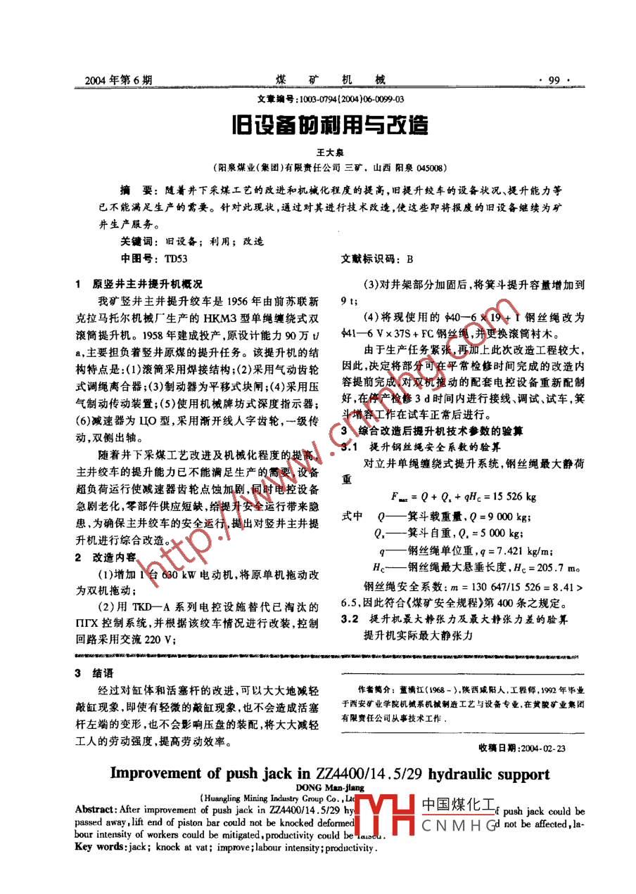 2004年第6期文章編號(hào):103-0m94(2004)06-009903舊設(shè)面的敢用與改造王大泉(陽(yáng)泉煤業(yè)(集團(tuán))有限責(zé)任公司三礦,山西陽(yáng)泉045008)摘要:隨著井下采煤工藝的改進(jìn)和機(jī)械化程度的提高,舊提升絞車(chē)的設(shè)備狀況、提升能力等已不能滿(mǎn)足生產(chǎn)的需要。針對(duì)此現(xiàn)狀,通過(guò)對(duì)其進(jìn)行技術(shù)改逵,使這些即將報(bào)廢的舊設(shè)備繼續(xù)為礦井生產(chǎn)服務(wù)。關(guān)鍵詞:舊設(shè)備;利用;改造中圖號(hào):TD53文獻(xiàn)標(biāo)識(shí)碼:B原豎井主井提升機(jī)概況(3)對(duì)井架部分加固后,將箕斗提升容量增加到我礦豎井主井提升絞車(chē)是1956年由前蘇聯(lián)新9t;克拉馬托爾機(jī)械廠生產(chǎn)的HKM3型單繩繞式雙(4)將現(xiàn)使用的40-6×19+1鋼絲繩改為滾筒提升機(jī)。1958年建成投產(chǎn),原設(shè)計(jì)能力90萬(wàn)41-6V×37s+FC鋼絲繩,并更換滾筒襯木。a,主要擔(dān)負(fù)著豎井原煤的提升任務(wù)。該提升機(jī)的結(jié)由于生產(chǎn)任務(wù)緊張,再加上此次改造工程較大,構(gòu)特點(diǎn)是:(1)滾筒采用焊接結(jié)構(gòu);(2)果用氣動(dòng)齒輪因此決定將部分可在平常檢修時(shí)間完成的改造內(nèi)式調(diào)繩離合器;(3)制動(dòng)器為平移式塊閘;(4)采用壓容提前完成對(duì)雙機(jī)拖動(dòng)的配套電控設(shè)備重新配制氣制動(dòng)傳動(dòng)裝置;(5)使用機(jī)械牌坊式深度指示器;好在停產(chǎn)檢修3d時(shí)間內(nèi)進(jìn)行接線、調(diào)試試車(chē)笑(6)減速器為IO型采用漸開(kāi)線人字齒輪,一級(jí)傳斗增容工作在試車(chē)正常后進(jìn)行。動(dòng),雙側(cè)出軸。3綜合改造后提升機(jī)技術(shù)參數(shù)的驗(yàn)算隨著井下采煤工藝改進(jìn)及機(jī)械化程度的提高3.1提升鋼絲繩安全系數(shù)的驗(yàn)算對(duì)立井單繩纏繞式提升系統(tǒng),鋼絲繩最大靜荷主井絞車(chē)的提升能力已不能滿(mǎn)足生產(chǎn)的需要,設(shè)備重超負(fù)荷運(yùn)行使減速器齒輪點(diǎn)蝕加劇,同時(shí)電控設(shè)備Fu=Q+Q,+qHc=15 526 kg急劇老化,零部件供應(yīng)短缺,給提升安全運(yùn)行帶來(lái)隱患,為確保主井絞車(chē)的安全運(yùn)行提出對(duì)豎井主井提式中Q—箕斗載重量,Q=9000g升機(jī)進(jìn)行綜合改造。Q.箕斗自重,Q.=5000kg2改造內(nèi)容q—鋼絲繩單位重,q=7421kg/m;(1)增加1臺(tái)630kW電動(dòng)機(jī),將原單機(jī)拖動(dòng)改Hc—鋼絲繩最大懸垂長(zhǎng)度,H=2057m(2)用TKD-A系列電控設(shè)施替代已淘汰的6.5,因此符合《煤礦安全規(guī)程》第400條之為雙機(jī)拖動(dòng);鋼絲繩安全系數(shù):m=130647/15526=841∏IX控制系統(tǒng)并根據(jù)該絞車(chē)情況進(jìn)行改裝控制32提升機(jī)最大靜張力及最大靜張力差的驗(yàn)算回路采用交流220V;提升機(jī)實(shí)際最大靜張力3結(jié)語(yǔ)經(jīng)過(guò)對(duì)缸體和活塞桿的改進(jìn),可以大大地減輕作者筒介:董滿(mǎn)江(1968-)陜西成陽(yáng)人,工程師,192年畢業(yè)敲缸現(xiàn)象,即使有輕微的敲缸現(xiàn)象,也不會(huì)造成活塞千西安礦業(yè)學(xué)院機(jī)械系機(jī)械剩造工藝與設(shè)備專(zhuān)業(yè),在黃酸礦業(yè)集團(tuán)桿左端的變形,也不會(huì)影響壓盤(pán)的裝配將大大減輕有限實(shí)任公司從事技術(shù)工作工人的勞動(dòng)強(qiáng)度,提高勞動(dòng)效率。收稿日期:2004-02-Improvement of push jack in ZZA400/14. 5/29 hydraulic supportDONG Man- Jlang( Huangling Mining Industry Group Co.,LaAbstract: After improvement of push jack in ZZA400/14.5/29中國(guó)煤化工 sh jack could beassed away, lift end of piston bar could not be knocked deformeCNMHG not be affected, labour intensity of workers could be mitigated, productivity could beKey words: jack; knock at vat; improve labour intensity; productivity舊設(shè)備的利用與改造—一王大泉Fm =Q+Q+ gH= 154. 25 kN 175 kN(1)在正常情況下,靜荷重所產(chǎn)生的旋轉(zhuǎn)力矩式中H—提升高度,H=192m。M,=(Q+φh)R=208500Nm提升機(jī)實(shí)際最大靜張力差提升機(jī)所需制動(dòng)力矩M≥3M1=625500NmFr=0+gH=104.25 kN< 120 kN由于該提升機(jī)有2副制動(dòng)器,并且各有1套傳可見(jiàn),提升機(jī)的最大靜張力及最大靜張力差均動(dòng)裝置,因此,每副制動(dòng)器所產(chǎn)生的制動(dòng)力矩M“不滿(mǎn)足要求。得小于總制動(dòng)力矩M的0.55倍。33提升系統(tǒng)總變位質(zhì)量即M:≥0.55M山=344030Nm∑M=M+2M+2M4+M,=9285kg安全制動(dòng)重錘的重量C。(該提升機(jī)制動(dòng)裝置式中M——提升機(jī)變位質(zhì)量,M1=23900kg傳動(dòng)尺寸如圖1所示)。天輪變位質(zhì)量,M1=4500kgM4電機(jī)轉(zhuǎn)子變位質(zhì)量,M4=23144kgM——提升負(fù)載容器及鋼絲繩的變位質(zhì)量,M,=21597kg3.4主加(減)遠(yuǎn)度的確定(1)主加速度a1的確定0.75AF=1.58m/82圖1主井提升機(jī)制動(dòng)系統(tǒng)示意圖根據(jù)具體情況確定a1=0.5m/s2。Fig 1 Braking schematic of the main shaft elevator(2)提升機(jī)減速度a3的確定a= 1400 mm b= 400 mm c=430 m d=680∫=420mmD=3.88m為了節(jié)省電能及控制方便,仍沿用原自由滑行減速方式。因此acuna D. =886 kg=0.93ms式中p——閘輪和閘瓦摩擦系數(shù),取g=035;3.5提升電機(jī)等效功率的驗(yàn)算一制動(dòng)杠桿系統(tǒng)的傳動(dòng)效率取7=0.95(1)等效時(shí)間D—制動(dòng)輪直徑,D=3.88m工作閘(常用閘)工作氣壓T=-(t0+41+l3+t)+t2
