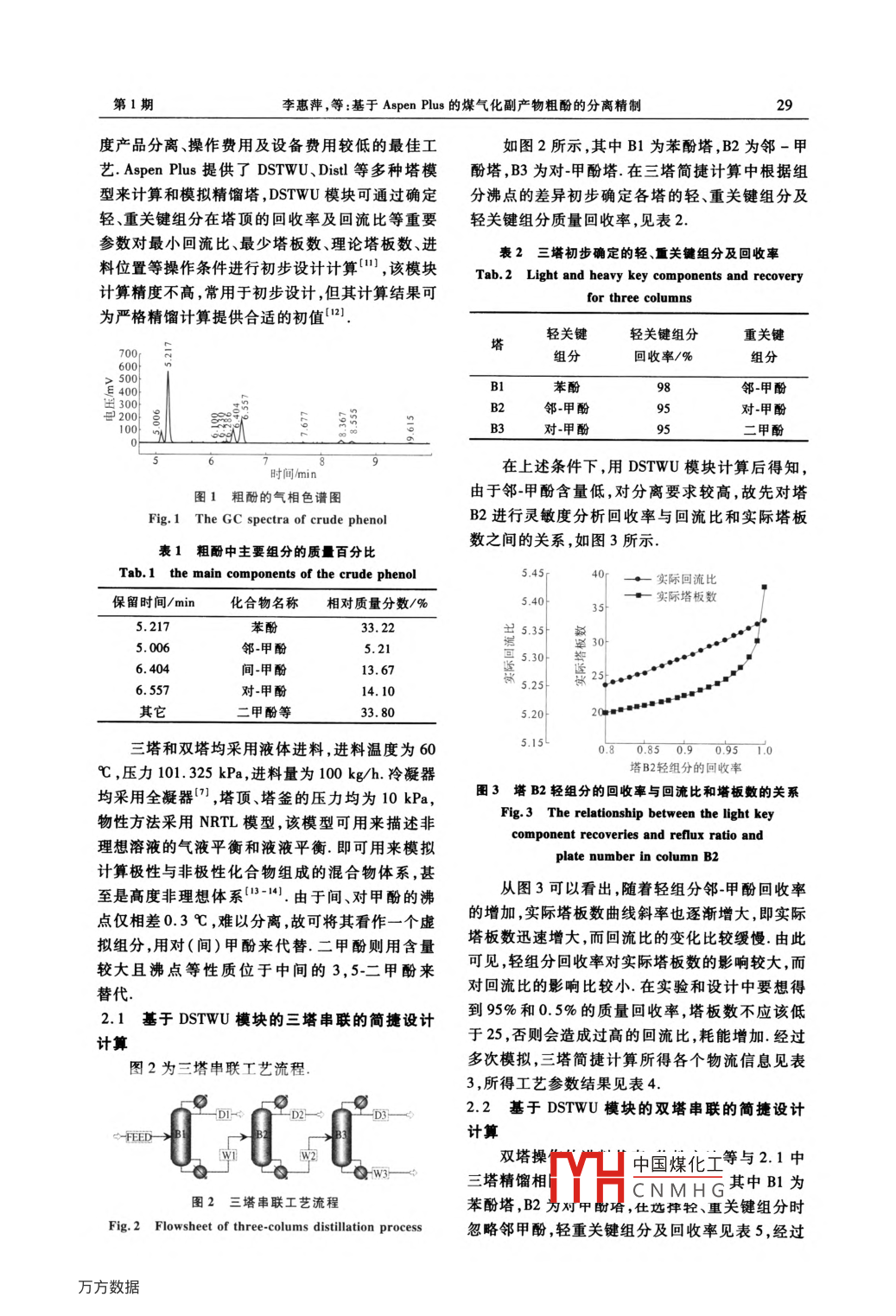 2015年1 月鄭州大學(xué)學(xué)報(bào)(工學(xué)版)Jan. 2015第36卷第1期Joumal of Zhengzhou University ( Engineering Science)Vol.36 No. 1文章編號(hào):1671 - 6833(2015)01 -0028 -05基于AspenPlus的煤氣化副產(chǎn)物粗酚的分離精制李惠萍',李煥新',李雪平”,張丹',梁淑琴',梁學(xué)博”(1.鄭州大學(xué)化工與能源學(xué)院,河南鄭州450001; 2. 河南煤氣集團(tuán)有限責(zé)任公司義馬氣化廠,河南三門峽472300)摘要: 針對(duì)煤氣化副產(chǎn)物粗酚的組分和組成特點(diǎn),設(shè)計(jì)了三塔和雙塔兩條連續(xù)減壓精餾工藝.借助Aspen Plus軟件對(duì)構(gòu)建的分離工藝進(jìn)行系統(tǒng)的模擬研究,物性方法采用NRTL模型.首先利用DSTWU模塊簡(jiǎn)捷設(shè)計(jì)計(jì)算得到了塔板數(shù)、回流比和采出量等操作參數(shù),對(duì)比得出適合該系統(tǒng)的分離工藝為雙塔精餾.然后利用RadFRAC模塊對(duì)設(shè)計(jì)結(jié)果進(jìn)行嚴(yán)格模擬核算,最終得出雙塔B1和B2的塔板數(shù)分別為29和31;進(jìn)料塔板級(jí)數(shù)分別為15和16;回流比分別為2.87和2.44.在最佳操作條件下,所得產(chǎn)品質(zhì)量分:數(shù)分別為苯酚99.0% ,對(duì)(間)甲酚86.1%,二甲酚96.5%.本研究結(jié)果可為粗酚的實(shí)際分離工藝設(shè)計(jì)和操作過程提供參數(shù)依據(jù).關(guān)鍵詞:煤氣化粗酚;雙塔;三塔;減壓精餾;Aspen Plus模擬中圈分類號(hào): TQS23. 59文獻(xiàn)標(biāo)志碼: Adoi:10. 3969/j. isn. 1671 - 6833.2015. 01. 007離困難的粗酚系統(tǒng)分離進(jìn)行了模擬計(jì)算,擬為粗.0引言酚系統(tǒng)的精餾工藝設(shè)計(jì)開發(fā)提供必要的基礎(chǔ)酚類化合物是重要的有機(jī)化工中間體及化工參數(shù).基礎(chǔ)原料,在醫(yī)藥、染料等領(lǐng)域都有著廣泛的應(yīng)用.1原料及組成魯奇(Lurgi)加壓生產(chǎn)城市煤氣的過程,煤氣發(fā)生、洗滌、冷卻過程中產(chǎn)生大量副產(chǎn)物粗酚(1],由于分粗酚由河南煤氣集團(tuán)有限責(zé)任公司義馬氣化離技術(shù)困難等原因,這部分副產(chǎn)物目前大部分低價(jià)廠提供,該廠以長(zhǎng)焰煤為原料,采用先進(jìn)的德國(guó)魯出售,嚴(yán)重污染環(huán)境.國(guó)內(nèi)酚類市場(chǎng)在很長(zhǎng)一段時(shí)奇加玉煤氣化工藝生產(chǎn)城市煤氣[8].系統(tǒng)而準(zhǔn)確間內(nèi)都處于相對(duì)緊缺的狀態(tài),且隨著石油資源的日地分析粗酚的組成是高效提取并合理利用酚類化益緊缺,國(guó)家對(duì)煤炭資源的綜合利用更加重視[2].合物的基礎(chǔ)工作,但是這些化合物的極性強(qiáng),揮發(fā)如果能將這些副產(chǎn)物加以分離、提純,必將提高其性低,所含同分異構(gòu)體性質(zhì)極為相似,色譜分離較產(chǎn)品附加值,增強(qiáng)社會(huì)及經(jīng)濟(jì)效益.開展對(duì)煤氣化為困難.通過查閱文獻(xiàn)[9-10]和實(shí)驗(yàn)對(duì)比得出:副產(chǎn)物粗酚分離精制的研究,不僅能提高煤氣化行FFAP(30mxφ0.32mmx0.5μm)能實(shí)現(xiàn)酚類化業(yè)的整體競(jìng)爭(zhēng)力,而且還符合國(guó)家能源戰(zhàn)略的需合物的基線分離.采用GC7900色譜儀,色譜條件求.但粗酚系酚類同系物,組成復(fù)雜,沸點(diǎn)又十分相為:FID檢測(cè)器250C,柱溫170C,氣化室溫度近,對(duì)其分離存在極大困難')].240C.粗酚氣相進(jìn)樣結(jié)果見圖1,通過標(biāo)準(zhǔn)物定AspenPlus是一款功能強(qiáng)大的工藝模擬軟性及內(nèi)標(biāo)標(biāo)準(zhǔn)曲線法最終確定了粗酚的組成,見件,廣泛應(yīng)用于化工流程設(shè)計(jì)和新工藝開發(fā),結(jié)合表1.利用這項(xiàng)新技術(shù)可以實(shí)現(xiàn)化工工藝全流程的模擬2工藝流程設(shè)計(jì)與優(yōu)化'4].此外,AspenPlus擁有最完善的物性數(shù)據(jù)庫,包含六千多種純組分的物性數(shù)據(jù),它還具有為了得到純度較高的單一酚產(chǎn)物,筆者針對(duì)超強(qiáng)的熱力學(xué)計(jì)算系統(tǒng),以及各種單元操作模煤氣化副產(chǎn)物粗酚的組成和組分特點(diǎn)設(shè)計(jì)了三塔塊[5-6]. 筆者借助Aspen工程軟件對(duì)成分復(fù)雜、分和雙塔連續(xù)精餾工藝,擬通過對(duì)比得出實(shí)現(xiàn)高純收稿日期:2014 -09 -23 ;修訂日期:2014-11-14中國(guó)煤化工、基金項(xiàng)目:河南省重大公益科研資助項(xiàng)目(101100910200) ;河南省自然作者簡(jiǎn)介:李惠萍(1958-),女,河南洛寧人,鄭州大學(xué)教授,博士,主要;MYHCN MH G物的資源化利用方面的研究,E mail: huipingli@ zzu. edu. cn..第1期李惠萍,等:基于AspenPlus的煤氣化副產(chǎn)物粗酚的分離精制29 .度產(chǎn)品分離、操作費(fèi)用及設(shè)備費(fèi)用較低的最佳工如圖2所示,其中B1為苯酚塔,B2為鄰一甲藝AspenPlus提供了DSTWU、Distl等多種塔模酚塔,B3為對(duì)-甲酚塔.在三塔簡(jiǎn)捷計(jì)算中根據(jù)組型來計(jì)算和模擬精餾塔,DSTWU模塊可通過確定分沸點(diǎn)的差異初步確定各塔的輕、重關(guān)鍵組分及輕、重關(guān)鍵組分在塔頂?shù)幕厥章始盎亓鞅鹊戎匾p關(guān)鍵組分質(zhì)量回收率,見表2. .參數(shù)對(duì)最小回流比、最少塔板數(shù)、理論塔板數(shù)、進(jìn)表2三塔初步確定的輕、1 關(guān)鍵組分及回收率料位置等操作條件進(jìn)行初步設(shè)計(jì)計(jì)算1",該模塊Tab.2 Light and heavy key components and recovery計(jì)算精度不高,常用于初步設(shè)計(jì),但其計(jì)算結(jié)