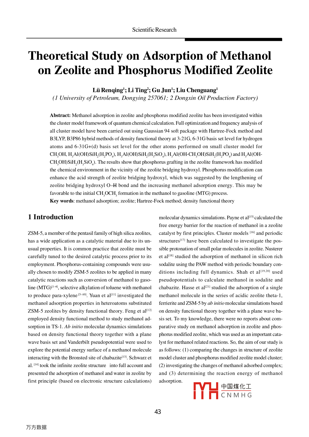 Scientific ResearchTheoretical Study on A dsorption of Methanolon Zeolite and Phosphorus Modified ZeoliteLi Renqing'; Li Ting'; Gu Jun'; Liu Chenguang'(1 University of Petroleum, Dongying 257061; 2 Dongxin Oil Production Factory)Abstract: Methanol adsorption in zeolite and phosphorus modified zeolite has been investigated withinthe cluster model framework of quantum chemical calculation. Full optimization and frequency analysis ofall cluster model have been carried out using Gaussian 94 soft package with Hartree- Fock method andB3LYP, B3P86 hybrid methods of density functional theory at 3-21G, 6-31G basis set level for hydrogenatoms and 6-31G+(d) basis set level for the other atoms performed on small cluster model forCH,OH, HAI(OH)SiH(H,PO), H,Al(OH)SiH(H,SiO), H,AI(OH-CH,OH)SiH,(HPO) and HAI(OH-CH,OH)SiH,(H,SiO). The results show that phosphorus grafting in the zeolite framework has modifiedthe chemical environment in the vicinity of the zeolite bridging hydroxyl. Phosphorus modification canenhance the acid strength of zeolite bridging hydroxyl, which was suggested by the lengthening ofzeolite bridging hydroxyl O- H bond and the increasing methanol adsorption energy. This may befavorable to the initial CH OCH, formation in the methanol to gasoline (MTG) process.Key words: methanol adsorption; zeolite; Hartree Fock method; density functional theory1 Introductionmolecular dynamics simulations. Payne et alsl calculated thefree energy barrier for the reaction of methanol in a zeoliteZSM- 5, a member of the pentasil family of high silica zeolites, catalyst by first principles. Cluster models [161 and periodichas a wide application as a catalytic material due to its un- structuresl7]1 have been calculated to investigate the pos-usual properties. It is common practice that zeolite must be sible protonation of small polar molecules in zeolite. Nusterercarefully tuned to the desired catalytic process prior to its et al81 studied the adsorption of methanol in silicon richemployment. Phosphorus-containing compounds were usu- sodalite using the PAW method with periodic boundary con-ally chosen to modify ZSM-5 zeolites to be applied in many ditions including full dynamics. Shah et al19.201 usedcatalytic reactions such as conversion of methanol to gaso- pseudopotentials to calculate methanol in sodalite andline MTG)I4, selective alkylation of toluene with methanol chabazite. Hasse et all21 studied the adsorption of a singleto produce para-xylene [5 +0]. Yuan et al" investigated the methanol molecule in the series of acidic zeolite theta- 1,methanol adsorption properties in heteroatoms substituted ferrierite and ZSM-5 by ab initio molecular simulations basedZSM-5 zeolites by density functional theory. Feng et all21 on density functional theory together with a plane wave ba-employed density functional method to study methanol ad- sis set. To my knowledge, there were no reports about com-sorption in TS-1. Ab initio molecular dynamics simulations parative study on methanol adsorption in zeolite and phos-based on density functional theory together with a plane phorus modified zeolite, which was used as an important cata-wave basis set and Vanderbilt pseudopotential were used to lyst for methanol related reactions. So, the aim of our study isexplore the potential energy surface of a methanol molecule as follows: (1) comparing the changes in structure of zeoliteinteracting with the Bronsted site of chabazitel131. Schwarz et model cluster and phosphorus modified zeolite model cluster;al. [141 took the infinite zeolite structure into full account and (2) investigating the changes of methanol adsorbed complex;presented the adsorption of methanol and water in zeolite by and (3) determining the reaction energy of methanolfirst principle (based on electronic structure calculations) adsorption.中國煤化工MHCNMH G.China Petroleum Processing and Petrochemical TechnologyNo.1, March 20042 Cluster Models and ComputationalAll calculations have been performed using HP method andMethodselectron correlation considered B3LYP, B3P86 hybrid meth-ods of density functional theory in Gaussian 94 soft-packageFour cluster models considered in this study were H,Al(OH) and 3-21G, 6-31G basis sets for hydrogen atoms as well as 6-SiH,(H,PO) (denoted as AI-Si-P), HAI(OH)SiH,(H,SiO)31G+(d) for the other atoms taking into account the polariza-(denoted asAl-Si- Si), HAI(OH-CH,OH)SiH,(HPO)(denoted tion functions and diffuse functions because of their atomicas Al-Si-P-CH,OH) and HAI(OH-CH,OH)SiH,(H,SiO) properties.(denoted as Al-Si-Si-CH,OH). The cluster models shown inFigure 1 were terminated by hydrogen atoms.Geometry optimization calculations have been carried out toa minimum degree for CH,OH, Al-Si-P and Al- Si Si as well asIn this study, the molecular systems are zeolite cluster and adsorption complexesof Al-Si-P-CH,OHand Al-Si-Si-CH,OH.phosphorus modified zeolitic cluster interacting with The frequency analyses were also performed using secondmethanol. The Al-Si-Si and Al-Si-P have been used to repre- derivatives in order to check the stationary point that exhib-sent the acidic zeolite and phosphorus modified acidic zeolite. ited none of imaginary frequency to a minimum extent.The main consequence of the use of cluster models is theabsence of any cavity-dependent effect. The cluster model The strategy for calculating the interaction energy is a simpleapproach has well known limitations, but on the other hand,one - the energy of the molecular complex (Emole ) was com-because of finite computer resources and because of the size pared to the sum of the energy of the individual monomers.of the systerms, the approximation was invoked. It was pointed The interaction energy of zeolite as well as phosphorus modi-out that especially the concentration of adsorbed molecules fied zeolite and methanol can be calculated using the followsensitively depended on a match of molecular and ing equation:microporous size, our study on interaction betwe
