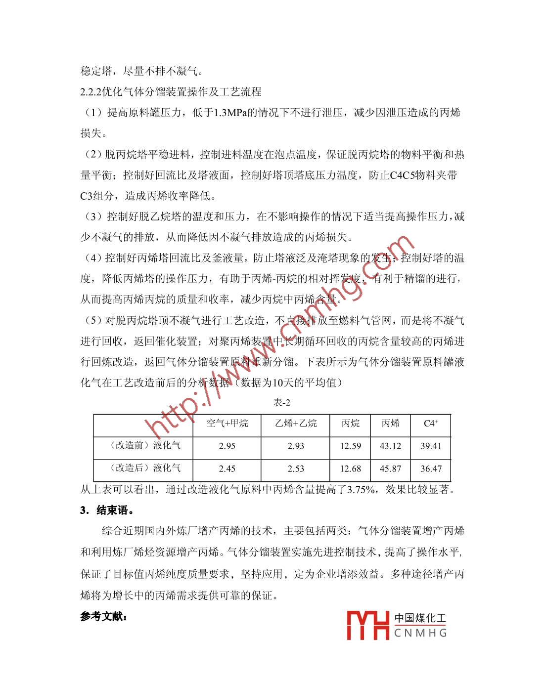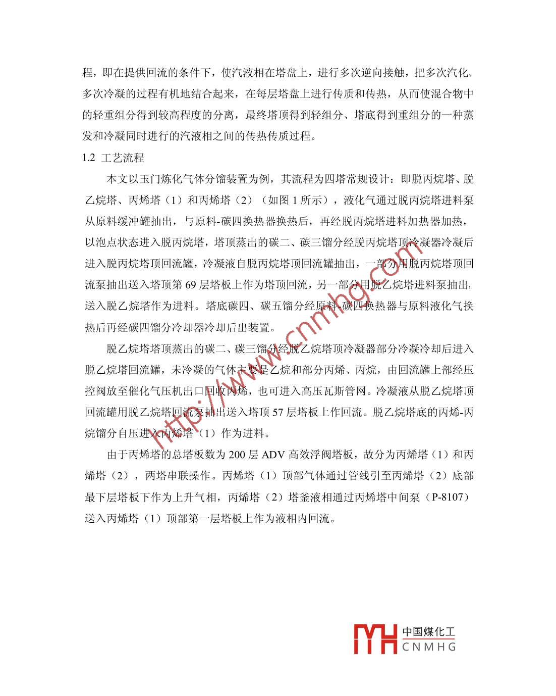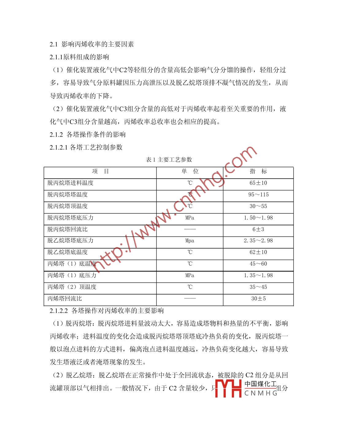 如何提高氣分裝置丙烯收率賀贏鋒玉門油田分公司煉油化工總廠甘肅酒泉735200摘要:本文介紹了氣分裝置的工藝流程,并分析了影響丙烯收率的主要因素,通過改善裝置操作條件和優(yōu)化吸收穩(wěn)定系統(tǒng)等操作措施,使得氣分裝置丙烯收率大幅提高,達(dá)到了增產(chǎn)丙烯提高裝置經(jīng)濟(jì)效益的目的關(guān)鍵詞:氣分裝置;丙烯收率;優(yōu)化吸收;操作Abstract: This paper introduces the technological process of gas fractionation unitand analyzed the influence of propylene recovery factors, through themprovement of equipment operation and optimization of absorption andstabilization system operation measure, make the gas separation devicesubstantially improve yield of propylene to propylene raise device economicbenefitsKey words: gas separation device; propylene yield optimization operationabsorption中圖分類號(hào):TE624文獻(xiàn)標(biāo)識(shí)碼:A目前我國丙烯的發(fā)展速度已經(jīng)超過了乙烯,市場(chǎng)上丙烯價(jià)格也逐漸攀升。因此多產(chǎn)丙烯已成為各煉油廠增加效益的重要手段。世界上丙烯產(chǎn)量中的70%的丙烯來自乙烯生產(chǎn)的裂解裝置,28%則依靠煉油廠,總之,在汽油價(jià)格疲軟和丙烯需求增長(zhǎng)的形勢(shì)下,對(duì)煉油廠來說,增加煉廠丙烯產(chǎn)率是一條提高煉廠效益的有效途徑。體分餾裝置是將催化裂化裝置生產(chǎn)的液化石油氣按后續(xù)加工裝置的要求,分離成各種餾分。如何提高丙烯的收率和回收率一直是裝置生產(chǎn)的主要課題,也是衡量裝置運(yùn)行水平的重要指標(biāo)1.氣體分餾裝置簡(jiǎn)介1.1工藝原理中國煤化工氣體分餾是利用各組分之間相對(duì)揮發(fā)度的不同而將YHaCNMHG留過程,即在提供回流的條件下,使汽液相在塔盤上,進(jìn)行多次逆向接觸,把多次汽化、多次冷凝的過程有機(jī)地結(jié)合起來,在每層塔盤上進(jìn)行傳質(zhì)和傳熱,從而使混合物中的輕重組分得到較高程度的分離,最終塔頂?shù)玫捷p組分、塔底得到重組分的一種蒸發(fā)和冷凝同時(shí)進(jìn)行的汽液相之間的傳熱傳質(zhì)過程。1.2工藝流程本文以玉門煉化氣體分餾裝置為例,其流程為四塔常規(guī)設(shè)計(jì):即脫丙烷塔、脫乙烷塔、丙烯塔(1)和丙烯塔(2)(如圖1所示),液化氣通過脫丙烷塔進(jìn)料泵從原料緩沖罐抽岀,與原料-碳四換熱器換熱后,再經(jīng)脫丙烷塔進(jìn)料加熱器加熱,以泡點(diǎn)狀態(tài)進(jìn)入脫丙烷塔,塔頂蒸岀的碳二、碳三餾分經(jīng)脫丙烷塔頂冷凝器冷凝后進(jìn)入脫丙烷塔頂囯流罐,冷凝液自脫丙烷塔頂回流罐抽岀,一部分用脫丙烷塔頂回流泵抽岀送入塔頂?shù)?9層塔板上作為塔頂回流,另一部分用脫乙烷塔進(jìn)料泵抽出,送入脫乙烷塔作為進(jìn)料。塔底碳四、碳五餾分經(jīng)原料-碳四換熱器與原料液化氣換熱后再經(jīng)碳四餾分冷卻器冷卻后出裝置。脫乙烷塔塔頂蒸岀的碳二、碳三餾分經(jīng)脫乙烷塔頂冷凝器部分冷凝冷卻后進(jìn)入脫乙烷塔回流罐,未冷凝的氣體主要是♂烷和部分丙烯、丙烷,由回流罐上部經(jīng)壓控閥放至催化氣壓機(jī)岀口回收丙烯,也可進(jìn)入高壓瓦斯管網(wǎng)。冷凝液從脫乙烷塔頂回流罐用脫乙烷塔囯流泵抽岀送入塔頂57層塔板上作囯流。脫♂烷塔底的丙烯-丙烷餾分自壓進(jìn)入丙烯塔(1)作為進(jìn)料。由于丙烯塔的總塔板數(shù)為200層ADⅴ高效浮閥塔板,故分為丙烯塔(1)和丙烯塔(2),兩塔串聯(lián)操作。丙烯塔(1)頂部氣體通過管線引至丙烯塔(2)底部最下層塔板下作為上升氣相,丙烯塔(2)塔釜液相通過丙烯塔中間泵(P-8107)送入丙烯塔(1)頂部第一層塔板上作為液相內(nèi)回流。中國煤化工CNMHG催化液化氣自雙脫部分來口院兩烷塔劇冷凝器乙杭培底重沸器碳三餾分白脫乙烷塔來烯產(chǎn)品冷器圖12.如何提高丙烯收率中國煤化工CNMHG21影響丙烯收率的主要因素2.1.1原料組成的影響(1)催化裝置液化氣中C2等輕組分的含量高低會(huì)影響氣分分餾的操作,輕組分過多,容易導(dǎo)致氣分原料罐因壓力髙泄壓以及脫乙烷塔頂排不凝氣情況的發(fā)生,從而導(dǎo)致丙烯收率的下降。(2)催化裝置液化氣中C3組分含量的高低對(duì)于丙烯收率起著至關(guān)重要的作用,液化氣中C3組分含量越高,丙烯收率總收率也會(huì)相應(yīng)的提高2.1.2各塔操作條件的影響2.1.2.1各塔工藝控制參數(shù)表1主要工藝參數(shù)項(xiàng)目單位指標(biāo)脫丙烷塔進(jìn)料溫度65±10脫丙烷塔塔溫度95~115脫丙烷塔頂溫度30~55脫丙烷塔塔底壓力MPa1.50~1.98脫丙烷塔回流比6±3脫乙烷塔塔底壓力脫乙烷塔底溫度62±10丙烯塔(1)底溫度45~60丙烯塔(1)底壓力MPa1.35~1.98丙烯塔(2)頂溫度35~45丙烯塔回流比30±52.1.2.2各塔操作對(duì)丙烯收率的主要影響(1)脫丙烷塔:脫丙烷塔進(jìn)料量波動(dòng)太大,容易造成塔物料和熱量的不平衡,影響丙烯收率;進(jìn)料溫度的變化會(huì)造成脫丙烷塔塔頂塔底冷熱負(fù)荷的變化,脫丙烷塔一般以泡點(diǎn)進(jìn)料的方式進(jìn)料,偏離泡點(diǎn)進(jìn)料溫度越遠(yuǎn),冷熱負(fù)荷變化越大,容易導(dǎo)致發(fā)生塔液泛或者淹塔現(xiàn)象的發(fā)生。(2)脫乙烷塔:脫乙烷塔在正常操作中處于全回流狀態(tài),被脫除的C2組分是從回流罐頂部以氣相排出。一般情況下,由于C2含量較少,H中國煤化工組分CNMHG含量達(dá)到40%~60%時(shí)塔的壓力才能