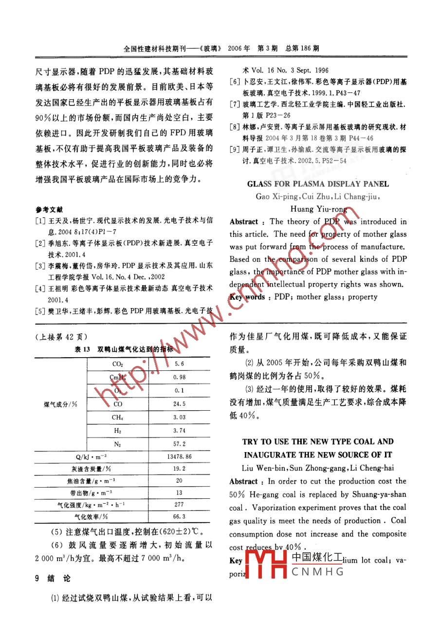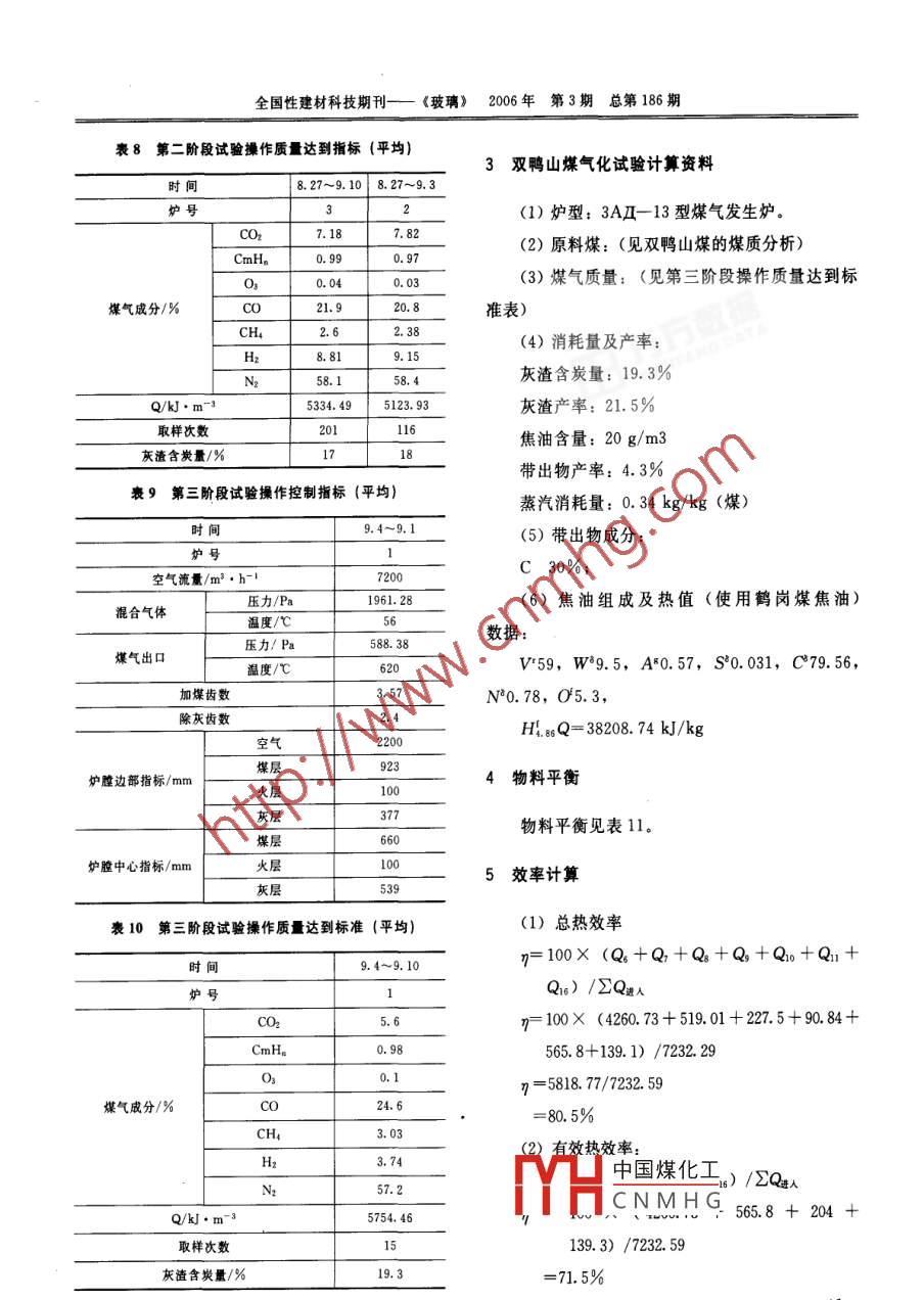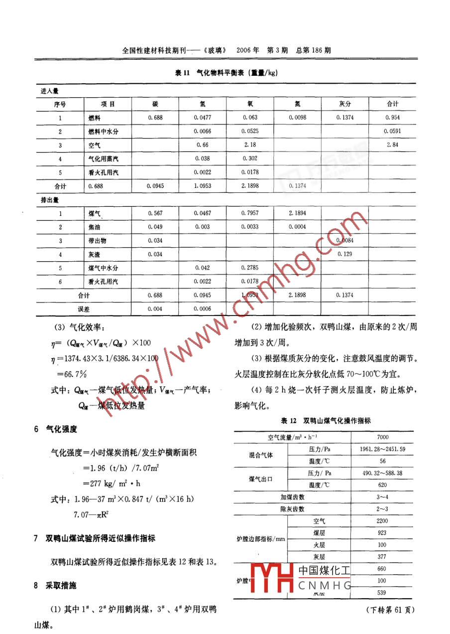 全國性建材科技期刊-《玻璃》2006年 第3期總第186期試燒新煤種開辟新煤源劉文斌孫忠剛李成海(佳木斯大學(xué)材料學(xué)院佳木斯市154007)摘要為有效降低生產(chǎn)成本,用雙鴨山煤替代50%的鶴崗煤。經(jīng)氣化試驗(yàn)和采取適當(dāng)措施后,煤氣質(zhì)量符合要求,煤耗也沒有增加,綜合成本降低40%。關(guān)鍵詞雙鴨山中塊煤 氣化試驗(yàn)成本中圍分類號(hào): TQ171文獻(xiàn)標(biāo)識(shí)碼: A文章編號(hào): 1003- 1987 (2006) 03 - 0039 -05.隨著工業(yè)生產(chǎn)的發(fā)展和國家能源政策的改變,生產(chǎn)的氣煤、弱黏結(jié)煤隨洗隨裝車,所以一批和一混合發(fā)生爐煤氣已經(jīng)成為主要的工業(yè)燃料。據(jù)前幾批的煤質(zhì)有很大的差別,給試驗(yàn)工作帶來很多年的資料統(tǒng)計(jì),全國$3M發(fā)生爐就有1 000臺(tái)之困難。多,目前仍以每年增加150臺(tái)左右的速度發(fā)展著。雙鴨山煤的煤質(zhì)分析:因而氣化用煤量越來越大,但煤的生產(chǎn)量卻增加不(1)工業(yè)分析(見表1)。多。加之氣化用煤有嚴(yán)格的要求,又限制了它的生表1雙鴨山煤工業(yè)分析(換算成應(yīng)用基%)產(chǎn)量,特別是原煤中的塊煤比例越來越小,中塊煤VSorX/mm Y/mn膠質(zhì)層羅加指數(shù)的產(chǎn)量越來越小,已經(jīng)成為大直徑發(fā)生爐生產(chǎn)的主5. 9113.74 36.31| 0.343.5| 126要矛盾。(2)元素分析(見表2)黑龍江佳星玻璃股份有限公司現(xiàn)有3AI- -13表2雙鴨山煤元素分析型煤氣發(fā)生爐5臺(tái),每年需用塊煤7X10*t之多。C ↑0 Q3'w/kJ.kg-INO I Q.rw/J.kg-1鶴崗煤價(jià)格又比較高,不利于降低成本。為了有效68.84.767 6. 36846. 90. 986386. 34降低成本,開辟新煤源成為我們的當(dāng)務(wù)之急,本省(3)工業(yè)分析(見表3)雙鴨山煤的氣化試驗(yàn)就是在這種情況下開始的。表3雙鴨山煤不同取料點(diǎn) 的工業(yè)分析%1雙鴨山水洗中塊煤的現(xiàn)狀與煤質(zhì)分析時(shí)間取樣wIA'ViCo%外在水 .地點(diǎn)8.13|煤場1.5 18.98 | 30.6 38.5| 48.95黑龍江省雙鴨山礦務(wù)局洗煤廠以生產(chǎn)煉焦用的8.22輸煤1.4 15.6| 33.2| 39.99 49. 83.0洗精粉為主,水洗混中塊煤是它的副產(chǎn)品。洗煤廠皮帶k隔24h)4.0所需的煤由雙鴨山礦務(wù)所屬的五個(gè)礦供給,根據(jù)煤8.23|同上| 1.77 12.9| 33.0 38.7 52.3(隔16h)礦提供的資料,嶺東、嶺西礦純屬焦煤,焦質(zhì)層厚8.24|同上 | 1.68 | 16.6 30.9| 37.8| 50.8度y值>14 mm,最高達(dá)25 mm,根本不適合氣k隔31 h)化。寶山、囚方臺(tái)、七星礦煤屬氣煤和弱黏結(jié)煤,8. 25中國煤化工8.451.64.盡管在煤的物理化學(xué)性質(zhì).上還有一缺點(diǎn),但還是比YHC NMH G_k隔23h)平均|同上1.59| 15.7531.9638.68 50.39| 35較適合氣化的。最主要的矛盾是因洗煤廠以生產(chǎn)煉焦用的洗精粉為主,副產(chǎn)中塊煤無貯存設(shè)施,批量(4)篩分分析(見表4)39全國性建材科技期刊一-《玻璃》 2006年 第3期總第186 期表4雙鴨山煤篩分分析表5第一階段試驗(yàn)操作控制指標(biāo)(平均)試樣重量<16 mm | 17~25 mm26~70 mm| >70 mm時(shí)間8.17~26 8. 20~26爐號(hào)/kgkg %| kg|%|kg|%| kg|%空氣流量/m3.b-i6 5007 10018.3536.719. 65|39.3| 12 24| 0.4 0.8混合氣體壓力/Pa1863. 22059.35019.5| 39 17.5| 35 11.5 23 18.53.7溫度/C557壓力/Pa 539. 35588. 3815.531.114.9 29.818.737.31煤氣出口610620(5)煤的堆積密度加煤齒數(shù)4.1.14除灰齒數(shù)33.1平均: 0.847 t/m3空氣2200爐膛邊部指標(biāo)/mm煤層830954.52雙鴨山水洗 中塊煤氣化試驗(yàn)情況火層10000灰層933849730. 4781. 5試驗(yàn)從8月16日開始,至9月10日止,分3爐膛中心指標(biāo)/mm10個(gè)階段,共約26 d.419(1)試驗(yàn)的第一階段表6第一階段試驗(yàn)操作質(zhì)達(dá)到指標(biāo)(平均)3號(hào)發(fā)生爐試驗(yàn)11d, 2號(hào)發(fā)生爐試驗(yàn)8d。試8.17~26| 8. 20~26驗(yàn)期間,兩臺(tái)爐的情況基本上是穩(wěn)定的?;饘訙?.271.68度正常,煤層采取逐漸增加的辦法,飽和溫度適CmH。0.920.98中。結(jié)果除由于煤質(zhì)較差、黏結(jié)性強(qiáng),因而煤氣發(fā)O0.030.07熱量和鶴崗煤相比偏低外,試驗(yàn)基本上正常、煤氣成分/%CO25. 1624.34CH2.54.41穩(wěn)定。H9. 2710.48(2)試驗(yàn)的第二階段N56.255. e從8月28日開始,3號(hào)、2號(hào)兩臺(tái)試驗(yàn)爐的氣.Q/kJ●m~5709. 295704. 52取樣次數(shù)219130化同時(shí)變壞,主要問題是:煤層嚴(yán)重發(fā)黏而導(dǎo)致通灰渣含炭量/%15.2818. 0風(fēng)不均,爐內(nèi)形成的一邊發(fā)黏(火層溫度低)、一表7第二階段試驗(yàn)操作控制指標(biāo)(平均)邊結(jié)煉局部穿火的偏爐現(xiàn)象- - 旦形成,短時(shí)間是調(diào)整不過來的。為什么兩臺(tái)試驗(yàn)爐同時(shí)變壞?我們分8.27~9.1| 8. 27~9.3析主要是煤質(zhì)變化造成的,即嶺東、嶺西礦焦混入空氣流量/m2●h-170126179爐內(nèi)嚴(yán)重黏結(jié)而致。1961. 281863.2(3)試驗(yàn)的第三階段溫度/心55.956壓力/ Pa539. 35從9月3日開始第三階段,試驗(yàn)基本上是穩(wěn)定的。但和鶴崗煤比,試驗(yàn)煤由于黏結(jié)性較強(qiáng),煤層3. 55發(fā)黏,影響空氣的均勻分布,經(jīng)常出現(xiàn)局部穿火2.62.現(xiàn)象,因而影響了發(fā)熱量的提高,司爐工的勞動(dòng)強(qiáng)度也大得多,但試驗(yàn)是有成效的。一周試驗(yàn)的發(fā)中國煤化工. 7781040E 100熱量平均值為5754. 46 kJ/Nm'。本介紹就是以第YHCN M H G102174677593三階段試驗(yàn)數(shù)據(jù)作為主要依據(jù)進(jìn
