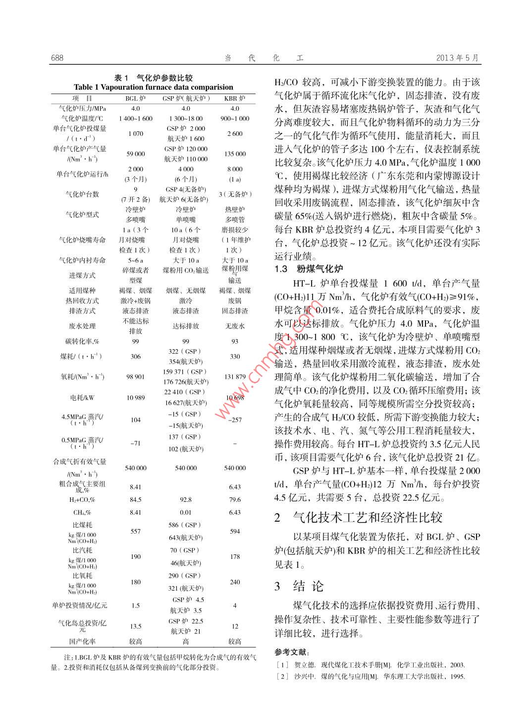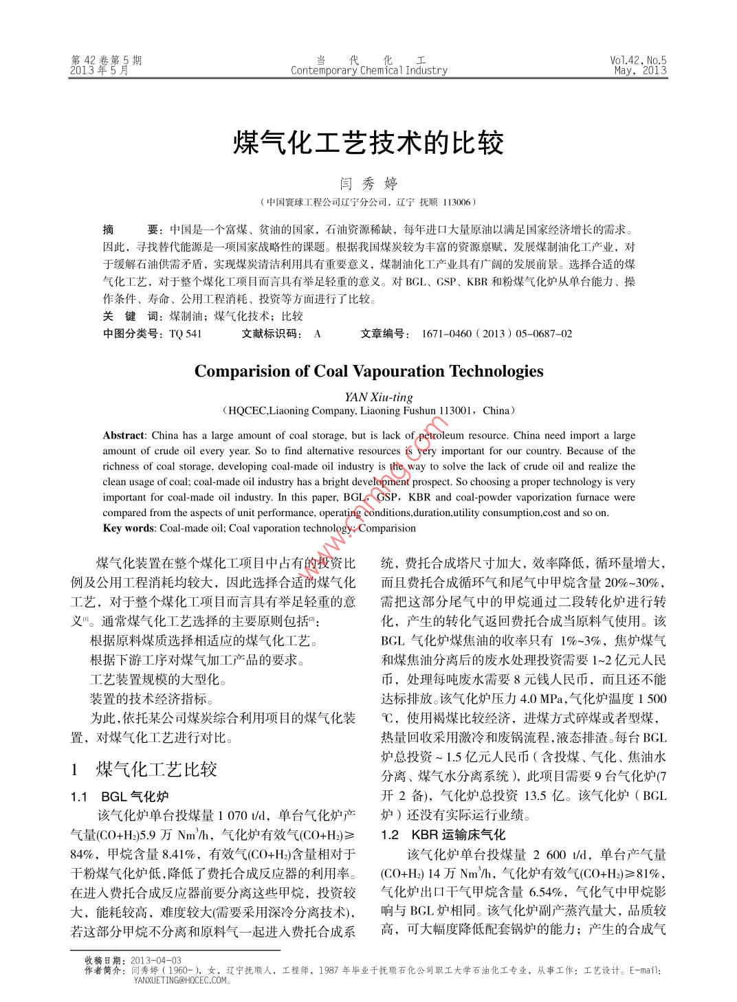 第42卷第5期當(dāng)0142203Contemporary Chemica 1 IndustryMay, 2013。煤氣化工藝技術(shù)的比較閆秀婷(中國(guó)寰球工程公司遼寧分公司,遼寧撫順113006 )摑要:中國(guó)是一個(gè)富煤、貧油的國(guó)家,石油資源稀缺,每年進(jìn)口大量原油以滿足國(guó)家經(jīng)濟(jì)增長(zhǎng)的需求。因此,尋找替代能源是一項(xiàng)國(guó)家戰(zhàn)略性的課題。根據(jù)我國(guó)煤炭較為豐富的資源稟賦,發(fā)展煤制油化工產(chǎn)業(yè),對(duì)于緩解石油供需矛盾,實(shí)現(xiàn)煤炭清潔利用具有重要意義,煤制油化工產(chǎn)業(yè)具有廣闊的發(fā)展前景。選擇合適的煤氣化工藝,對(duì)于整個(gè)煤化工項(xiàng)目而言具有舉足輕重的意義。對(duì)BGL、GSP、KBR和粉煤氣化爐從單臺(tái)能力、操作條件、壽命、公用工程消耗、投資等方面進(jìn)行了比較。關(guān)鍵詞:煤制油;煤氣化技術(shù);比較中圖分類(lèi)號(hào): TQ 541文獻(xiàn)標(biāo)識(shí)碼: A文章編號(hào): 1671-0460 ( 2013) 05-0687-02Comparision of Coal Vapouration TechnologiesYAN Xiu-ting( HQCEC.Liaoning Company, Liaoning Fushun 113001, China)Abstract: China has a large amount of coal storage, but is lack of petroleum resource. China need import a largeamount of crude oil every year. So to find altermative resources is very important for our country. Because of therichness of coal storage, developing coal-made oil industry is the way to solve the lack of crude oil and realize theclean usage of coal; coal made oil industry has a bright development prospect. So choosing a proper technology is veryimportant for coal-made oil industry. In this paper, BGL,GSP,KBR and coal-powder vaporization furnace werecompared from the aspects of unit performance, operating conditions,duration,utility consumption,cost and so on.Key words: Coal made oil; Coal vaporation technology; Comparision煤氣化裝置在整個(gè)煤化工項(xiàng)目中占有的投資比統(tǒng),費(fèi)托合成塔尺寸加大,效率降低,循環(huán)量增大,例及公用工程消耗均較大,因此選擇合適的煤氣化而且費(fèi)托合成循環(huán)氣和尾氣中甲烷含量20%~-30% ,工藝,對(duì)于整個(gè)煤化工項(xiàng)目而言具有舉足輕重的意需把這部分尾氣中的甲烷通過(guò)二段轉(zhuǎn)化爐進(jìn)行轉(zhuǎn)義"。通常煤氣化工藝選擇的主要原則包括!:化,產(chǎn)生的轉(zhuǎn)化氣返回費(fèi)托合成當(dāng)原料氣使用。該根據(jù)原料煤質(zhì)選擇相適應(yīng)的煤氣化工藝。BGL氣化爐煤焦油的收率只有1%~3%,焦?fàn)t煤氣.根據(jù)下游工序?qū)γ簹饧庸ぎa(chǎn)品的要求。和煤焦油分離后的廢水處理投資需要1~2億元人民工藝裝置規(guī)模的大型化。幣,處理每噸廢水需要8元錢(qián)人民幣,而且還不能裝置的技術(shù)經(jīng)濟(jì)指標(biāo)。達(dá)標(biāo)排放。該氣化爐壓力4.0 MPa,氣化爐溫度1 500為此,依托某公司煤炭綜合利用項(xiàng)目的煤氣化裝C,使用褐煤比較經(jīng)濟(jì),進(jìn)煤方式碎煤或者型煤,置,對(duì)煤氣化工藝進(jìn)行對(duì)比。熱量回收采用激冷和廢鍋流程,液態(tài)排渣。每臺(tái)BGL爐總投資~ 1.5億元人民幣(含投煤、氣化、焦油水.1煤氣化工藝比較分離、煤氣水分離系統(tǒng)),此項(xiàng)目需要9臺(tái)氣化爐(71.1 BGL 氣化爐開(kāi)2備),氣化爐總投資13.5 億。該氣化爐( BGL該氣化爐單臺(tái)投煤量1 070t/d,單臺(tái)氣化爐產(chǎn)爐)還沒(méi)有實(shí)際運(yùn)行業(yè)績(jī)。氣量(CO+H)5.9萬(wàn)Nm'/h,氣化爐有效氣(CO+H2)≥1.2 KBR 運(yùn)輸床氣化84%,甲烷含量8.41%,有效氣(C0+H)含量相對(duì)于該氣化爐單臺(tái)投煤量2 600 ld,單臺(tái)產(chǎn)氣量干粉煤氣化爐低,降低了費(fèi)托合成反應(yīng)器的利用率。(C0+H2) 14萬(wàn)Nm'/h,氣化爐有效氣(CO+H2)≥81%,在進(jìn)人費(fèi)托合成反應(yīng)器前要分離這些甲烷,投資較氣化爐出口干氣甲烷含量6.54%, 氣化氣中甲烷影大,能耗較高,難度較大(需要采用深冷分離技術(shù)),響與BGL爐相同。該氣化爐副產(chǎn)蒸汽量大,品質(zhì)較若這部分甲烷不分離和原料氣一起進(jìn)人費(fèi)托合成系高,可大幅度降低配套鍋爐的能力;產(chǎn)生的合成氣收稿日期: 2013-04-03作者簡(jiǎn)介:閆秀婷(1960-). 女,遼寧撫順人,工程師,1987年畢業(yè)于撫順石化公司職工大學(xué)石油化工專(zhuān)業(yè),從事工作:工藝設(shè)計(jì)。E-mail:YANXUETING@HOCEC.COM688當(dāng)代化2013年5月表1氣化爐參數(shù)比較H2/CO較高,可減小下游變換裝置的能力。由于該Table 1 Vapouration furnace data comparision頁(yè)目BGL爐CSP 爐(航天爐) KBR 爐氣化爐屬于循環(huán)流化床氣化爐,固態(tài)排渣,沒(méi)有廢.氣化爐壓力J/MIPa4.04.水,但灰渣容易堵塞廢熱鍋爐管子,灰渣和氣化氣氣化爐溫度/C 1 400-1 6001 300-18 00900-1 000分離難度較大,而且氣化爐物料循環(huán)的動(dòng)力為三分單臺(tái)氣化爐投煤量GSP爐20001 070航天爐1 6002 600之一的氣化氣作為循環(huán)氣使用,能量消耗大,而且單臺(tái)氣化爐產(chǎn)氣量CSP爐120 000進(jìn)入氣化爐的管子多達(dá)100個(gè)左右,儀表控制系統(tǒng)/(Nm'●的航天爐10000135 000比較復(fù)雜。該氣化爐壓力4.0 MPa,氣化爐溫度1 0002 0004 0008 000單臺(tái)氣化爐運(yùn)行h(3個(gè)月)(6個(gè)月)C,使用褐煤比較經(jīng)濟(jì)(廣東東莞和內(nèi)蒙博源設(shè)計(jì)氣化爐臺(tái)數(shù)GSP 4(無(wú)備爐)3(無(wú)備爐)煤種均為褐煤),進(jìn)煤方式煤粉用氣化氣輸送,熱量(7開(kāi)2備) 航天爐6