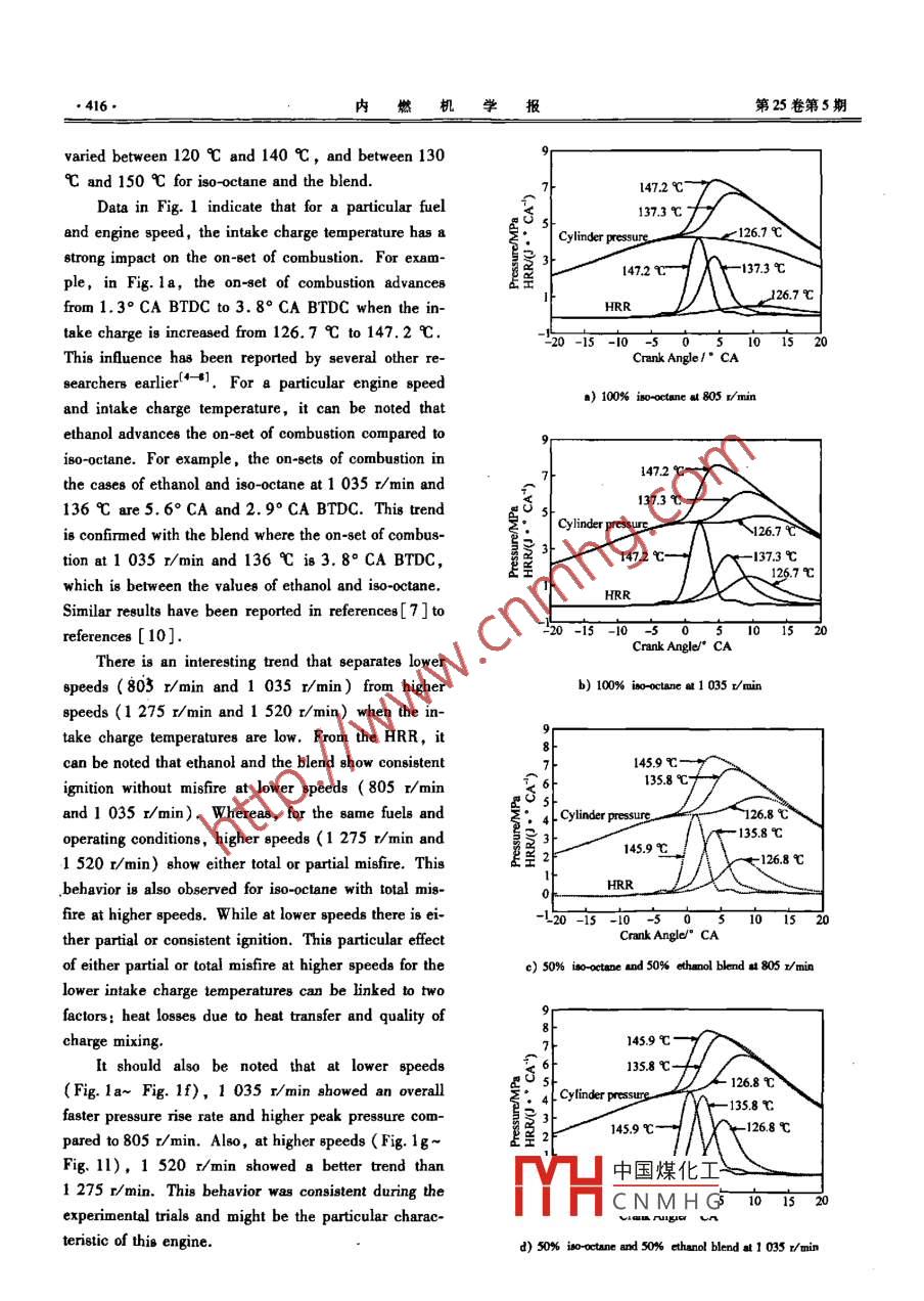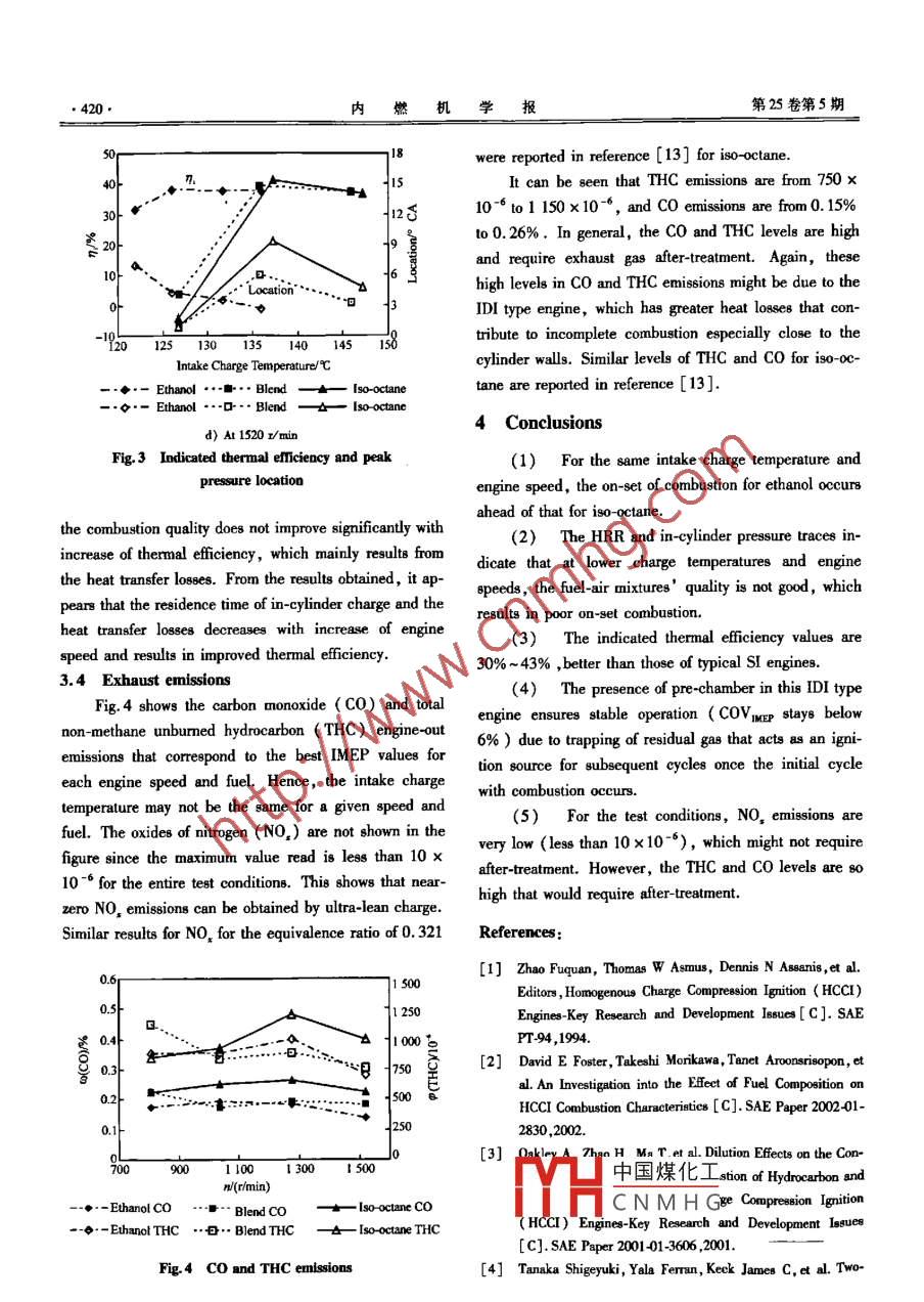 第25卷(2007)第5期內(nèi)燃機(jī)學(xué)報(bào)Transactions of CSICEval.25(2007)No5Article ID:10000909(2007)05-041408254067Experimental Study and analysis on HCCI Combustionof Iso-Octane Ethanol and Their blendZHANG Chun-hua, Gnanam Gnanaprakash, Andrzej Sobiesiak(L. Automobile School, Changan University, Xi'an 710064, China;2. Department of Mechanical Engineering, University of Windsor, Windsor N9B 3P4, Canada)Abstract: This paper investigates homogeneous charge compression ignition( HCCI)combustion on a modifiedengine fuelled with iso-octane, ethanol and iso-octane-ethanol blend. The engine performances are evaluatedbased on in-cylinder measured pressure. The parameters studied include heat-release rate ( HRR), indicatemean effective pressure( IMEP)and indicated thermal efficiency. The experimental results demonstrate that theombustion for ethanol occurs ahead of that for iso-octane The addition of i8o-octane to ethanol retards the on-getof combustion and subsequently leads to a reduction of the IMEP and indicated thermal efficiency. For a particu-lar fuel, the combustion depends mainly on the intake charge temperature and any increase in the initial chargetemperature leads to advance in combustion. At lower charge temperatures and engine speeds, the fuel-air mixturesquality of is poor, resulting in a poor combustion. The indicated thermal efficiency is 30%to 43%,bet-ter than those of typical SI engines. The presence of pre-chamber is advantageous to stable HCCI operation. Operation with ultra lean mixture reduces engine-out NO, emissions significantly.Keywords: HCCI combustion: Iso-octane: Ethanol; Iso-octane-ethanol blendCLC number: TK401Document code: A異辛烷、乙醇及其混合燃料HCCI燃燒的試驗(yàn)研究和分析張春化12, Gnanam Gnanaprakash2, Andrzej Sobiesiak2(1.長安大學(xué)汽車學(xué)院,陜西西安710064;2溫莎大學(xué)機(jī)械工程系,溫莎NB3P4,加拿大)摘要:在一臺(tái)改制的發(fā)動(dòng)機(jī)上進(jìn)行了異辛烷、乙醇及其混合燃料HCCI燃燒的研究。發(fā)動(dòng)機(jī)性能用缸內(nèi)壓力評(píng)估,研究用的參數(shù)包括放熱率、平均指示壓力和熱效率。試驗(yàn)結(jié)果表明,乙醇著火時(shí)刻早于異辛烷;在乙醇中加入異辛烷可以推遲著火,并導(dǎo)致平均指示壓力和熱效率的降低;對(duì)某種特定燃料,HCCI燃燒的發(fā)生主要取決于進(jìn)氣充量溫度,初始充量溫度的增加將導(dǎo)致HCCI燃燒提前;充量溫度低或發(fā)動(dòng)機(jī)轉(zhuǎn)速低時(shí),混合氣形成質(zhì)量差,對(duì)HCCI燃燒有不良影響;指示熱效率為30%-43%,其值高于火花點(diǎn)火發(fā)動(dòng)機(jī);預(yù)燃室的存在有利于穩(wěn)定的HCCI燃燒;超稀充量運(yùn)行可以顯著降低NO排放。關(guān)鍵詞;HCCI燃燒;異辛烷;乙醇;異辛烷—乙醇混合燃料Introductionresults in poor fuel economy and increased engine emis-The automotive industry has been forced to re- sions. The homogenous charge compression ignitepond to the increasing environmental concerns of con- HCCI) engine combines the use of premixed air fuelsumers and the rising cost of fossil fuels. Furthermore, mixture, usually associated with spark ignition SI)the prevailing mode of operation for premixed charge engines, with self-ignition induced by high compressionengines,such as gasoline engines, is mostly in partial ratio,中國煤化工 mpression ignitionload or with the throttle valve partially closed, which (CI)CNMHGuS consequences of2007-01-09;修回日期:2007-05-11。:加拿大21世紀(jì)汽車資助項(xiàng)目(D01DAF)。張春化,博士,教授, E-mail:zch@chd.ddh,m2007年9月張春化等:異辛烷、乙醇及其混合燃料HCCI燃燒的試驗(yàn)研究和分析(英文)such an organization of the engine combustion process, The fuel system is designed to be compatible for operationsuch as increased thermal efficiency, lower cycle tem- with alcoholsperatures and reduced NO, emissions. To ensure de-The HCCI engine has a modified cylinder head withsired ignition timing and to moderate reaction rates dur- a secondary piston and spacer arrangement that plungesing combustion, the air-fuel mixtures need to be lean or into the engine pre-chamber. By adjusting the plungeeven ultra-lean. While there are numerous advantagesspacer widthe compression ratio can be varied bein exploiting HCCI operation, there are also a number tween 15: 1 and 22: 1. A Kistler piezoelectric wall-mount-of issues need to be addressed. HCCI combustion lacks ed transducer is mounted in the glow plug hole to acquirea means of combustion on-set and subsequent pressure in-cylinder pressure. A combustion analysis systemrise control, since both the spark ignition timing( SI CAS)is used to acquire the pressure and crank angleengine)and the injection timing( CI engine)are ab- data. The CAS system has a resolution of 0. 1 CA forsent. HCCI operation is usually limited to part-load both pressure and encoder measurements at the maximumrated speed. The data acquisition system has a real-timeEthanol is used in this study since it is an alternativeto analyze engine parameguch asfuel produced domestically. It has been an attractive fuel maximum pressure rise rate, peak pressure, etc. The en-of choice in IC engines due to the potential reduction of gine-out emissions are measured by a portable Micro-GasCO, that occurs during the production of crops. Oakley et TM 5-gas analyzeal+ experimented with a variety of fuels, including etha2 Test Conditionsnol, to determine the in-cylinder conditions necessary toobtain HCCI combustion in a 4-stroke engine. They foundThe engine specifications and test conditions used inalcohols to be much more tolerant to air and exhaustthis study are shown in Tab. 1recycled(EGR)dilution. The study by Guerrieri et al[33showed that addition of ethanol decreased co and Hc e-Tab 1 Engine specificati