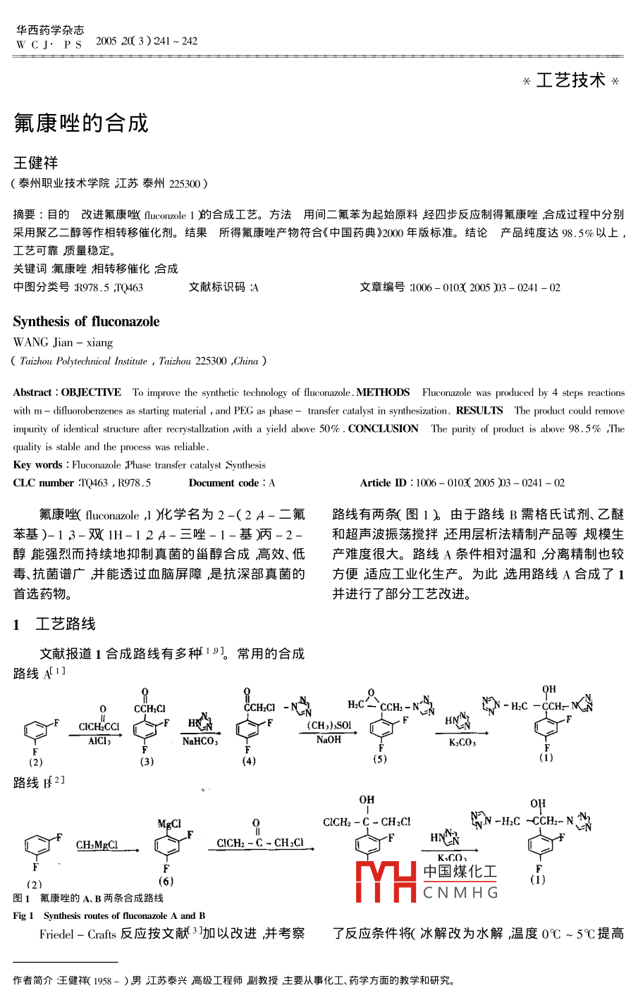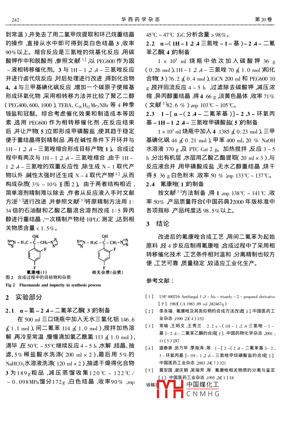 華西藥學(xué)雜志W(wǎng)CJ. PS2005 20 3)241 ~ 242*工藝技術(shù)*氟康唑的合成王健祥(泰州職業(yè)技術(shù)學(xué)院江蘇泰州225300)摘要:目的改進(jìn)氟康唑( fuconzole 1的合成工藝。方法用間二 氟苯為起始原料經(jīng)四步反應(yīng)制得氟康唑合成過程中分別采用聚乙二醇等作相轉(zhuǎn)移催化劑。結(jié)果所得 氟康唑產(chǎn)物符合《中國藥典》2000年版標(biāo)準(zhǔn)。結(jié)論產(chǎn) 品純度達(dá)98. 5%以上,工藝可靠質(zhì)量穩(wěn)定。關(guān)鍵詞氟康唑相轉(zhuǎn)移催化;合成中圖分類號:R978 .5 ,TQ463文獻(xiàn)標(biāo)識碼A文章編號:1006 - 0103( 2005 )03- 0241-02Synthesis of fluconazoleWANG Jian - xiang( Taizhou Polytechnical Institte , Taizhou 225300 ,China )Abstract : OBJECTIVE To improve the synthetic technology of fluconazole. METHODS Fluconazole was produced by 4 steps reactionswith m - difuorobenzenes as starting material , and PEG as phase - transfer catalyst in synthesization. RESULTS The product could removeimpurity of identical structure after rerstallzation ,with a yield above 50% . CONCLUSION The purity of product is above 98. 5% ,Thequality is stable and the process was reliable.Key words : Fluconazole ;Phase transfer catalyst SynthesisCLC number :TQ463 , R978.5Document code :AArticle ID : 1006 - 0103( 2005 )03 - 0241-02.氟康唑( fluconazole ,1 )化學(xué)名為2-(24-二氟路線有兩條(圖1)由于路線B需格氏試劑、乙醚苯基)-1 3-雙(1H-124-三唑-1-基丙-2-和超聲波振蕩攪拌還用層析法精制產(chǎn)品等規(guī)模生.醇能強(qiáng)烈而持續(xù)地抑制真菌的甾醇合成高效、低產(chǎn)難度很大。路線A條件相對溫和,分離精制也較毒、抗菌譜廣并能透過血腦屏障是抗深部真菌的方便適應(yīng)工業(yè)化生產(chǎn)。為此選用路線A合成了1首選藥物。并進(jìn)行了部分工藝改進(jìn)。1工藝路線文獻(xiàn)報(bào)道1合成路線有多種19]。常用的合成路線A[1]9只)HDCCH2ClCCH2C1Hc-ccH-N含HN當(dāng)pN~-H:C -CCH-NKGCICH2CCIyF(CHJ)sSOlAlCI,NaHCO3NaOHK2COzF、(4)5)(i(23)路線B2]OH0HMgCl,CICH2 -C - CH2Cl叭v -HC -CCH- N藥CHMgCL__.,F.CICH2-C- CH:CL.H島KCO:F(6)中國煤化工(1)圖1 氟康唑的A、B兩條合成路線MHCNMHGFig1 Synthesis routes of fluconazole A and BFriedel - Crafts反應(yīng)按文獻(xiàn)3]加以改進(jìn)并考察了反應(yīng)條件將(冰解改為水解溫度0C~5C提高作者簡介:王健祥( 1958- )男江蘇泰興高級工程師副教授主要從事化工、藥學(xué)方面的教學(xué)和研究。242華西藥學(xué)雜志第20卷到常溫)并免去了用二氯甲烷提取和環(huán)己烷重結(jié)晶45C ~47C ;GC 分析含量> 98%。的操作,直接從水中即可得到類白色結(jié)晶3 ,收率2.2 a-(1H-1 2 A三氮唑-1-基)-2 A-二氟90%以上??s合反應(yīng)是三氮唑的烷基化反應(yīng)用碳苯乙酮4 )的制備酸鉀作中和脫酸劑,參照文獻(xiàn)3] ,以PEG600作為固1 x10ml燒瓶中依次加入碳酸鉀36 g. 液相轉(zhuǎn)移催化劑。3與1H-1 2 A-三氮唑反應(yīng)(0.26 mol)1H-1 2 A-三氮唑70g 1.0 mol和化并進(jìn)行鹵代烷反應(yīng)對后處理進(jìn)行改進(jìn)得到化合物合物3)76.2 ( 0.4 mol入EtCN 200 ml和PEG600 104。4與三甲基碘化砜反應(yīng)增加一個(gè)碳原子使羰基g攪拌回流反應(yīng)4~5 h過濾除去碳酸鉀,減壓濃形成環(huán)氧化物采用相轉(zhuǎn)移方法并比較了聚乙二醇.縮異丙醇重結(jié)晶得4 66g淡黃色晶體收率71%( PEC400、600、1000 ) TEBA、C16Hx2MezNBr等4種季(文獻(xiàn)582.6 % ) ,mp 103C ~ 105C。銨鹽和冠醚。綜合考慮催化效果和制造成本等因2.3 1-[a-(24-二氟苯基)]-2 ,3-環(huán)氧丙素選用PEG600作為相轉(zhuǎn)移催化劑,在反應(yīng)結(jié)束基-1H-12A-三氮唑甲磺酸鹽(5)的制備后并讓產(chǎn)物5 )立即形成甲磺酸鹽使其趨于穩(wěn)定1x 10 ml燒瓶中加入4 1385 (0.23 mol)三甲便于重結(jié)晶得到精制品再在堿性條件下開環(huán)并與基碘化砜44 g0.21 mol) 甲苯400 ml、20 % NaOH1H-1 2 A-三氮唑縮合形成目標(biāo)產(chǎn)物1)合成過水溶液370g及PTC Cat2 go加熱攪拌反應(yīng)3~5程中有兩次與1H-1 2 A-三氮唑縮合,由于1H -h分出有機(jī)層水層用乙酸乙酯提取( 20 mlx3)與12A-三氮唑的雙重反應(yīng)性除生成N-1取代產(chǎn)反應(yīng)液合并用甲磺酸成鹽無水乙醇重結(jié)晶烘干物以外堿性太強(qiáng)時(shí)還生成N-4取代產(chǎn)物4],從而得5 36g白色粉末收率50 % ;mp 133C ~ 137C。構(gòu)成雜質(zhì)(3%~ 10% Y圖2)由于兩者結(jié)構(gòu)相近,2.4氟康唑( 1的制備簡單溶劑精制難以除去,作者從反應(yīng)液入手對文獻(xiàn)按文獻(xiàn)5]方法制備得1 ,mp 138C~ 141C收方法1進(jìn)行改進(jìn)并參照文獻(xiàn)5)將原精制方法用1:率50%產(chǎn)品質(zhì)量符合《中國藥典》>2000年版標(biāo)準(zhǔn)中34倍的石油醚和乙酸乙酯混合溶劑改成1:5異丙.各項(xiàng)指標(biāo)產(chǎn)品純度達(dá)98. 5%以上。醇進(jìn)行重結(jié)晶,-次精制產(chǎn)物經(jīng)HPLC測定,達(dá)到相3結(jié)論關(guān)物質(zhì)含量<1.5%。QHOH改進(jìn)后的氟康唑合成工藝,用間二氟苯為起始SN-H:C-C-CH2-N5-H:C-C-CH.-NCN9原料經(jīng)4步反應(yīng)制得氟康唑合成過程中了采用相轉(zhuǎn)移催化技術(shù)工藝條件相對溫和分離精制也較方便工藝可靠質(zhì)量穩(wěn)定較適應(yīng)工業(yè)化生產(chǎn)。氟康唑(1)相關(guān)雜質(zhì)(雜質(zhì))圖2合成過程中的目標(biāo)物和雜質(zhì)參考文獻(xiàn):ig 2 Fluconazole and impurity in synthesis process2實(shí)驗(yàn)部分[1 ] USP 440216 Antifungal 1 3- bis - tiaxoly - 2 - propanol derivative[P] 1983