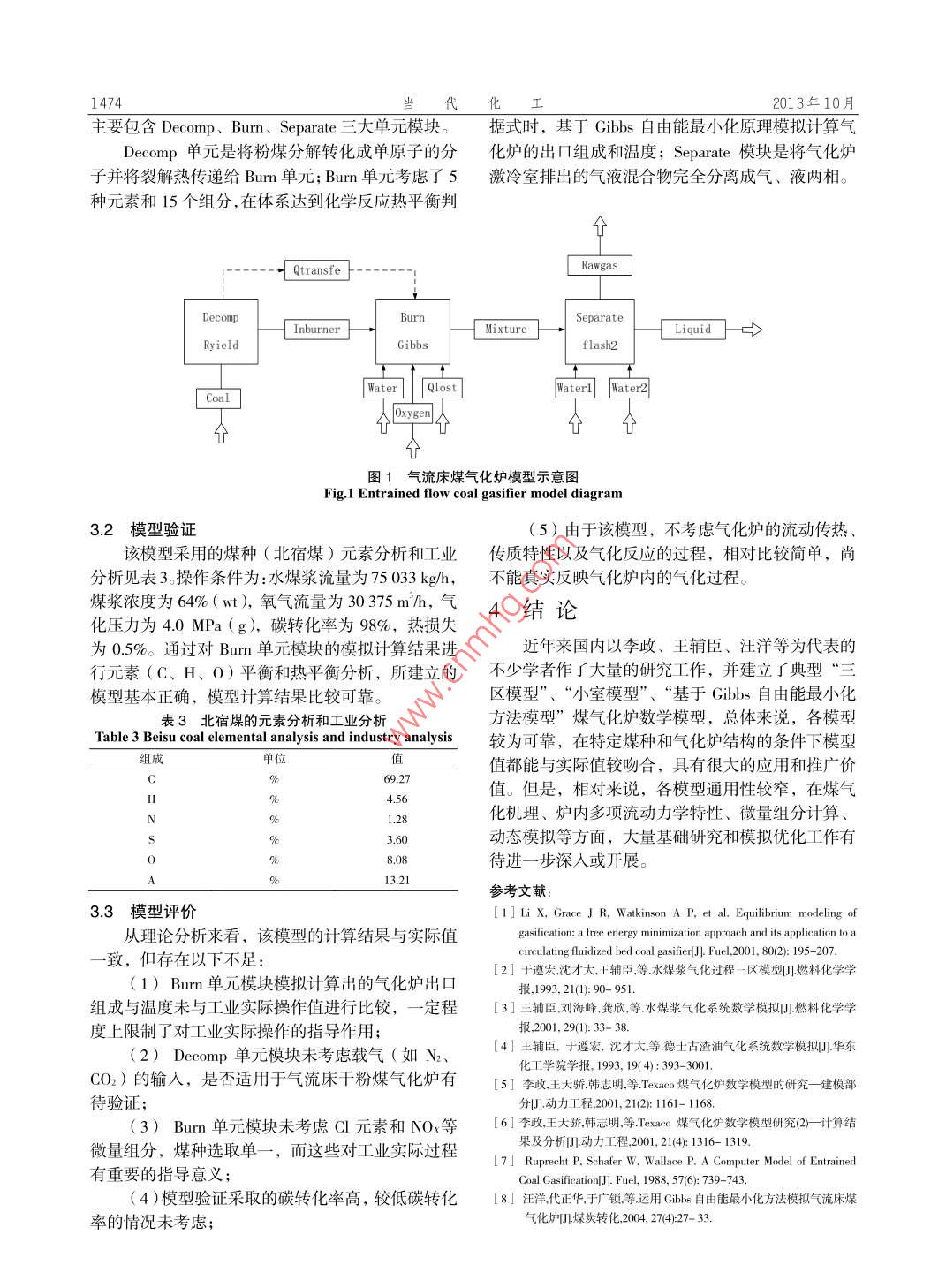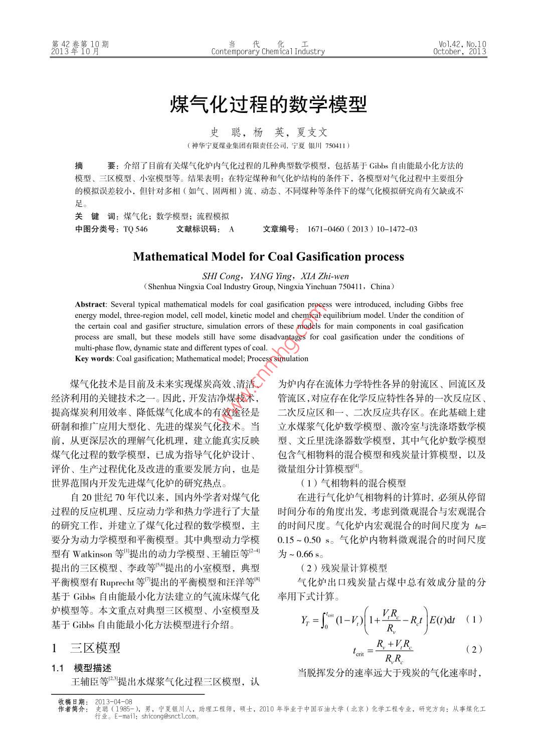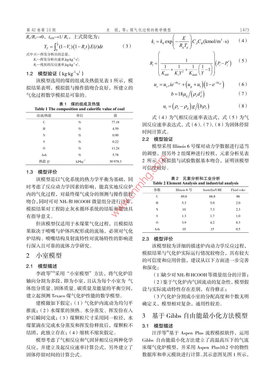 第42卷第10期工2013年10月Contemporary Chemical IndustryOctober,2013煤氣化過程的數(shù)學模型史聰,楊英,夏支文(神華寧夏煤業(yè)集團有限責任公司,寧夏銀川750411 )摑要:介紹了目前有關煤氣化爐內氣化過程的幾種典型數(shù)學模型,包括基于Gibbs自由能最小化方法的模型、三區(qū)模型、小室模型等。結果表明:在特定煤種和氣化爐結構的條件下,各模型對氣化過程中主要組分的模擬誤差較小,但針對多相(如氣、固兩相)流、動態(tài)、不同煤種等條件下的煤氣化模擬研究尚有欠缺或不關鍵詞:煤氣化;數(shù)學模型;流程模擬中圖分類號: TQ 546文獻標識碼: A文章編號: 1671-0460 ( 2013) 10-1472-03Mathematical Model for Coal Gasification processSHI Cong, YANG Ying, XIA Zhi-wen( Shenhua Ningxia Coal Industry Group, Ningxia Yinchuan 750411, China)Abstract: Several typical mathematical models for coal gasification process were introduced, including Gibbs freeenergy model, three-region model, cell model, kinetic model and chemical equilibrium model. Under the condition ofthe certain coal and gasifier structure, simulation errors of these models for main components in coal gasificationprocess are small, but these models still have some disadvantages for coal gasification under the conditions ofmulti-phase flow, dynamic state and different types of coal.Key words: Coal gasifcation; Mathematical model; Process simulation煤氣化技術是目前及未來實現(xiàn)煤炭高效、清潔、為爐內存在流體力學特性各異的射流區(qū)、回流區(qū)及經(jīng)濟利用的關鍵技術之- -。因此,開發(fā)潔凈煤技術,管流區(qū),對應存在化學反應特性各異的一-次反應區(qū)、提高煤炭利用效率、降低煤氣化成本的有效途徑是二次反應區(qū)和一、二次反應共存區(qū)。在此基礎上建研制和推廣應用大型化、先進的煤炭氣化技術。當立水煤漿氣化爐數(shù)學模型、激冷室與洗滌塔數(shù)學模前,從更深層次的理解氣化機理,建立能真實反映型、文丘里洗滌器數(shù)學模型,其中氣化爐數(shù)學模型煤氣化過程的數(shù)學模型,已成為指導氣化爐設計、包含氣相物料的混合模型和殘?zhí)苛坑嬎隳P?,以及評價、生產過程優(yōu)化及改進的重要發(fā)展方向,也是微量組分計算模型"。世界范圍內開發(fā)先進煤氣化爐的研究熱點。( 1)氣相物料的混合模型自20世紀70年代以來,國內外學者對煤氣化在進行氣化爐氣相物料的計算時,必須從停留過程的反應機理、反應動力學和熱力學進行了大量時間分布的角度出發(fā),考慮到微觀混合與宏觀混合的研究工作,并建立了煤氣化過程的數(shù)學模型,主的時間尺度。 氣化爐內宏觀混合的時間尺度為M=要分為動力學模型和平衡模型。其中典型動力學模0.15~0.50 s。氣化爐內物料微觀混合的時間尺度型有Watkinson等"提出的動力學模型、王輔臣等B 41為~0.66s。提出的三區(qū)模型、李政等19提出的小室模型,典型(2)殘?zhí)苛坑嬎隳P推胶饽P陀蠷uprecht等' "提出的平衡模型和汪洋等8氣化爐出口殘?zhí)苛空济褐锌傆行С煞至康姆只贕ibbs自由能最小化方法建立的氣流床煤氣化率用 下式計算。爐模型等。本文重點對典型三區(qū)模型、小室模型及基于Gibbs自由能最小化方法模型進行介紹。y-=f% (1-V)|1+-- R.t E()dt (1)R1三區(qū)模型_ R.+V.R.(2)R,R1.1模型描述當脫揮發(fā)分的速率遠大于殘?zhí)康臍饣俾蕰r,王輔臣等”提出水煤漿氣化過程三區(qū)模型,認收稿日期: 2013-04-08作者簡介:史聰 (1985-).男,寧夏銀川人,助理工程師,碩士,2010年畢業(yè)于中國石油大學(北京)化學工程專業(yè),研究方向:從事煤化工行業(yè)。E-mail: shicong@snctl.com.第42卷第10期史聰,等:煤氣化過程的數(shù)學模型1473RJR,- +0, terir →1/Re,上式簡化為:y= p*(-V)(I-RI)E()dr .(3)k =kgexp|R.Tg|CCe(kmolm'.s) (4)式中:V- -揮發(fā)分析出的總量,R.一揮發(fā)分析出速率,kgkg"'s;(5)R-殘?zhí)康姆磻俾?kgkg's'。R=(P-P")1.2模型驗證 (kgkg's' )Kan Ky2° Kan(該模型選用的煤的組成及熱值見表1所示,模u, =u,iel""+(ug +u)(1-e)(6)擬結果表明,模擬值與操作值吻合良好,所建立的氣化過程數(shù)學模擬是可靠的。b=1842/(pd)(7)Table 1 The composition and calorific value of coal表1煤的組成及熱值u,=(p,-p2)g/(bp,)(8)組成/熱值單位值式(4)為氣相反應速率表達式,式(5)為氣77.18固反應速率表達式,式(6)(7)、(8)為固體停留4.59時間計算式。0.902.2模型驗證0.22模型采用lliois 6號煤對動力學數(shù)據(jù)進行適當Ash5.78的調整,用另外2組煤種進行校核,元素分析見表熱值Qkkg'30 978.32所示。模擬值與試驗數(shù)據(jù)基本吻合,證明該模型可信度較好。1.3 模型評價該模型是以氣化系統(tǒng)的熱力學平衡為基礎,同表2元素分析和工業(yè)分析Table 2 Element Analysis and industrial analysis時考慮了反應動力學因素的影響,能真實地反應爐參數(shù)llinois 6號Austrilia/UBEFluid ceoke內的氣化過程,對最終煤氣成分的預測與操作值較66.886吻合,同時可對NH;和HC00H微量組分進行計算,H5.35.02.0模擬結果對工程防止灰水循環(huán)系統(tǒng)的結垢和腐蝕具7.32.3有指導意義。1.3.7.0.2.3但該模型僅適用于水煤漿氣化過程,且模擬結15).5果取決于噴嘴與爐體匹配形成的流場,必須對氣化爐結構、噴嘴結構及射流特性對流場特性的影響進2.3模型評價行深人且可靠的流體力學研究。該模型較為詳細的描述爐內動力學反應過程,2小室模型模擬結果與氣化爐實際運行情況較吻合,具有較大的可信度和應用價值,建議從以下方面進-