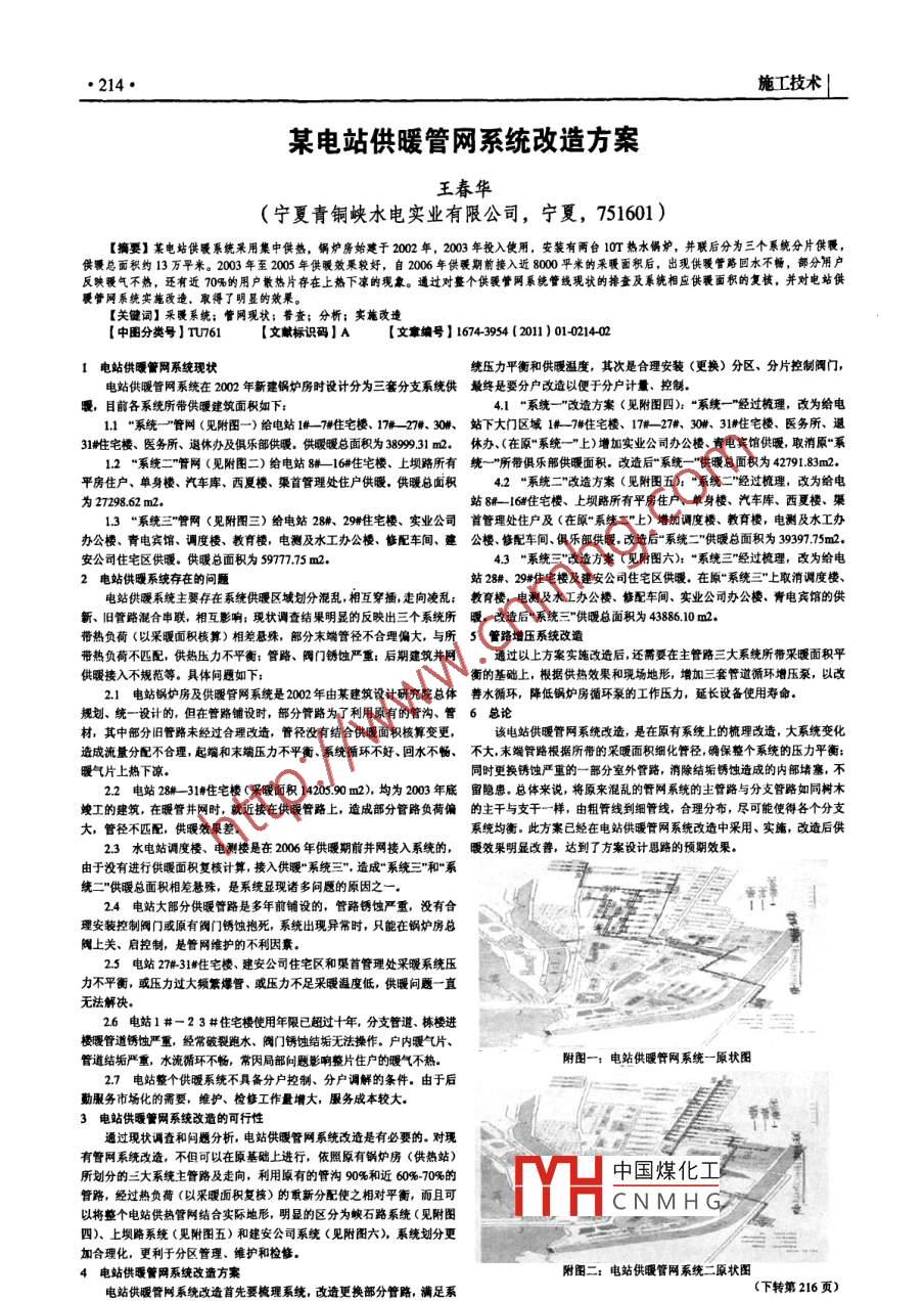 ·214·施工技術(shù)某電站供暖管網(wǎng)系統(tǒng)改造方案王春華(寧夏青銅峽水電實業(yè)有限公司,寧夏,751601)【摘要】某電站供暖系統(tǒng)采用集中供熱,鍋爐房始建于2002年,200年投入使用,安裝有兩臺10熱水鍋爐,并聯(lián)后分為三個系統(tǒng)分片供覆供總面積約13萬平來。2003年至200年供暖效果較好,自2006年供暖期前接入近8000平米的采暖面積后,出現(xiàn)供暖管路回水不暢,部分用戶反映暖氣不熱,還有近70%的用戶散熱片存在上熱下涼的現(xiàn)象。通過對整個供暖管網(wǎng)系統(tǒng)管線現(xiàn)狀的排查及系統(tǒng)相應(yīng)供暖面積的復(fù)核,并對電站供粳管網(wǎng)系統(tǒng)實施改造,取得了明顯的效果【關(guān)鍵詞】采暖系統(tǒng);管網(wǎng)現(xiàn)狀;普查;分析;實施改造【中圍分類號】TU61【文獻標識碼】A【文章編號】16743954(2011)014021401電站供暖管網(wǎng)系統(tǒng)現(xiàn)狀統(tǒng)壓力平衡和供暖溫度,其次是合理安裝(更換)分區(qū)、分片控制閥門,電站供暖管網(wǎng)系統(tǒng)在2002年新建鍋爐房時設(shè)計分為三套分支系統(tǒng)供最終是要分戶改造以便于分戶計量控制暖,目前各系統(tǒng)所帶供暖建筑面積如下:4l“系統(tǒng)一”改造方案(見附圖四)2“系統(tǒng)一”經(jīng)過梳理,改為給電11“系統(tǒng)一管網(wǎng)(見附圖一)給電站17住宅樓、17#27#、30解、站下大門區(qū)域1#7#住宅樓、17#27#、30、31住宅樓、醫(yī)務(wù)所、退3]住宅樓、醫(yī)務(wù)所、退休辦及俱樂部供暖。供暖暖總面積為389931m2,休辦、(在原“系統(tǒng)一”上)增加實業(yè)公司辦公樓、青電賓館供暖取消原“系12“系統(tǒng)二”管網(wǎng)(見附圖二)給電站816#住宅樓、上壩路所有繞一“所帶俱樂部供暖面積。改造后“系統(tǒng)一”供暖總面積為4279183m2,平房住戶、單身樓、汽車庫、西夏樓、渠首管理處住戶供暖,供暖總面積42“系統(tǒng)二”改造方案(見附圖五)“系統(tǒng)二經(jīng)過植理,改為給電站8解16住宅樓、上壩路所有平房住戶、單身棱、汽車庫、西夏樓、渠3“系統(tǒng)三“管網(wǎng)(見附圖三)給電站28#、29住宅樓、實業(yè)公司首管理處住戶及(在原“系統(tǒng)二”上)增加調(diào)度樓、教育樓,電測及水工辦辦公樓、青電賓館、調(diào)度樓、教育樓,電測及水工辦公樓、修配車間、建公樓、修配車間、俱樂部供暖。改造后“系統(tǒng)二”供暖總面積為3939775m2安公司住宅區(qū)供暖。供暖總面積為5977775m243“系統(tǒng)三"改造方案(見附圖六):“系統(tǒng)三”經(jīng)過梳理,改為給電2電站供暖系統(tǒng)存在的問題站28#、29#住宅樓及建安公司住宅區(qū)供暖,在原“系統(tǒng)三”上取消調(diào)度樓電站供暖系統(tǒng)主要存在系繞供暖區(qū)域劃分混亂,相互穿插,走向凌亂;教育樓,電測及水工辦公樓、修配車間、實業(yè)公司辦公樓,青電賓館的供新、舊管路混合串聯(lián),相互影響;現(xiàn)狀調(diào)查結(jié)果明顯的反映出三個系統(tǒng)所。改造后“系統(tǒng)三”供暖總面積為4388610帶熱負荷(以采暖面積核算)相差懸殊,部分末端管徑不合理偏大,與所5管路增壓系統(tǒng)改造帶熱負荷不匹配,供熱壓力不平衡;管路、閥門銹蝕嚴重:后期建筑并網(wǎng)通過以上方案實施改造后,還需要在主管路三大系統(tǒng)所帶采暖面積平供暖接入不規(guī)范等。具體問題如下衡的基礎(chǔ)上,根據(jù)供熱效果和現(xiàn)場地形,增加三套管道循環(huán)增壓泵,以改21電站鍋爐房及供暖管網(wǎng)系統(tǒng)是2002年由某建筑設(shè)計研究院總體善水循環(huán),降低鍋爐房循環(huán)泵的工作壓力,延長設(shè)備使用壽命。規(guī)劃、統(tǒng)一設(shè)計的,但在管路鋪設(shè)時,部分管路為了利用原有的管溝、管6總論材,其中部分舊管路未經(jīng)過合理改造,管徑?jīng)]有結(jié)合供暖面積核算變更,該電站供暖管網(wǎng)系統(tǒng)改造,是在原有系統(tǒng)上的梳理改造,大系統(tǒng)變化造成流量分配不合理,起端和末端壓力不平衡、系統(tǒng)循環(huán)不好、回水不暢、不大末端管路根據(jù)所帶的采暖面積細化管徑確保整個系統(tǒng)的壓力平衡;暖氣片上熱下涼同時更換銹蝕嚴重的一部分室外管路,消除結(jié)垢銹蝕造成的內(nèi)部堵塞,不22電站2831住宅樓(采暖面積1420590m2)均為2003年底留隱患,總體來說,將原來混亂的管網(wǎng)系統(tǒng)的主管路與分支管路如同樹木竣工的建筑,在暖管并網(wǎng)時,就近接在供暖管路上,造成部分管路負荷偏的主干與支干一樣,由粗管線到細管線,合理分布,盡可能使得各個分支大,管徑不匹配,供暖效果差系統(tǒng)均衡。此方案已經(jīng)在電站供暖管網(wǎng)系統(tǒng)改造中采用、實施,改造后供23水電站調(diào)度樓、電測樓是在2006年供暖期前并網(wǎng)接入系統(tǒng)的,曖效果明顯改善,達到了方案設(shè)計思路的預(yù)期效果由于沒有進行供暖面積復(fù)核計算,接入供暖“系統(tǒng)三”,造成“系統(tǒng)三”和“系統(tǒng)二”供暖總面積相差懸殊,是系統(tǒng)顯現(xiàn)諸多問題的原因之24電站大部分供暖管路是多年前鋪設(shè)的,管路銹蝕嚴重,沒有合理安裝控制閥門或原有閥門銹蝕抱死,系統(tǒng)出現(xiàn)異常時,只能在鍋爐房總閥上關(guān)、啟控制,是管網(wǎng)維護的不利因素。25電站27#31#住宅樓、建安公司住宅區(qū