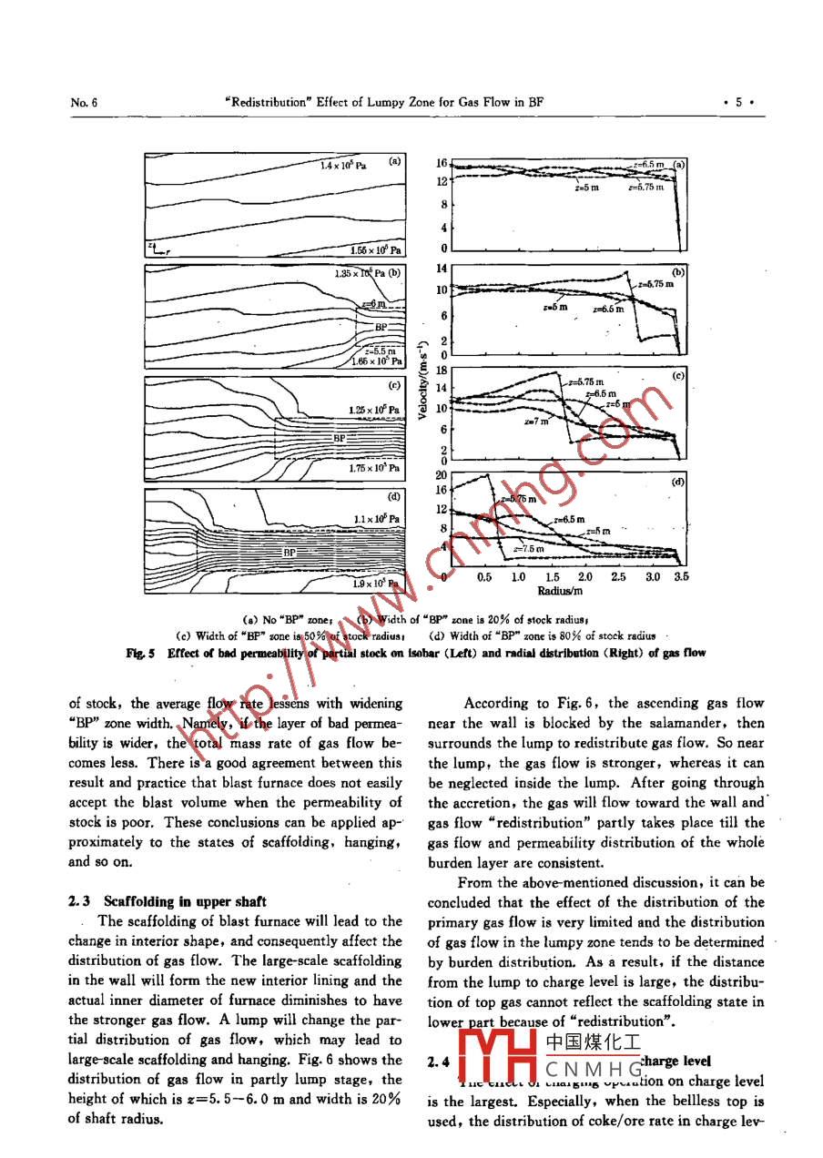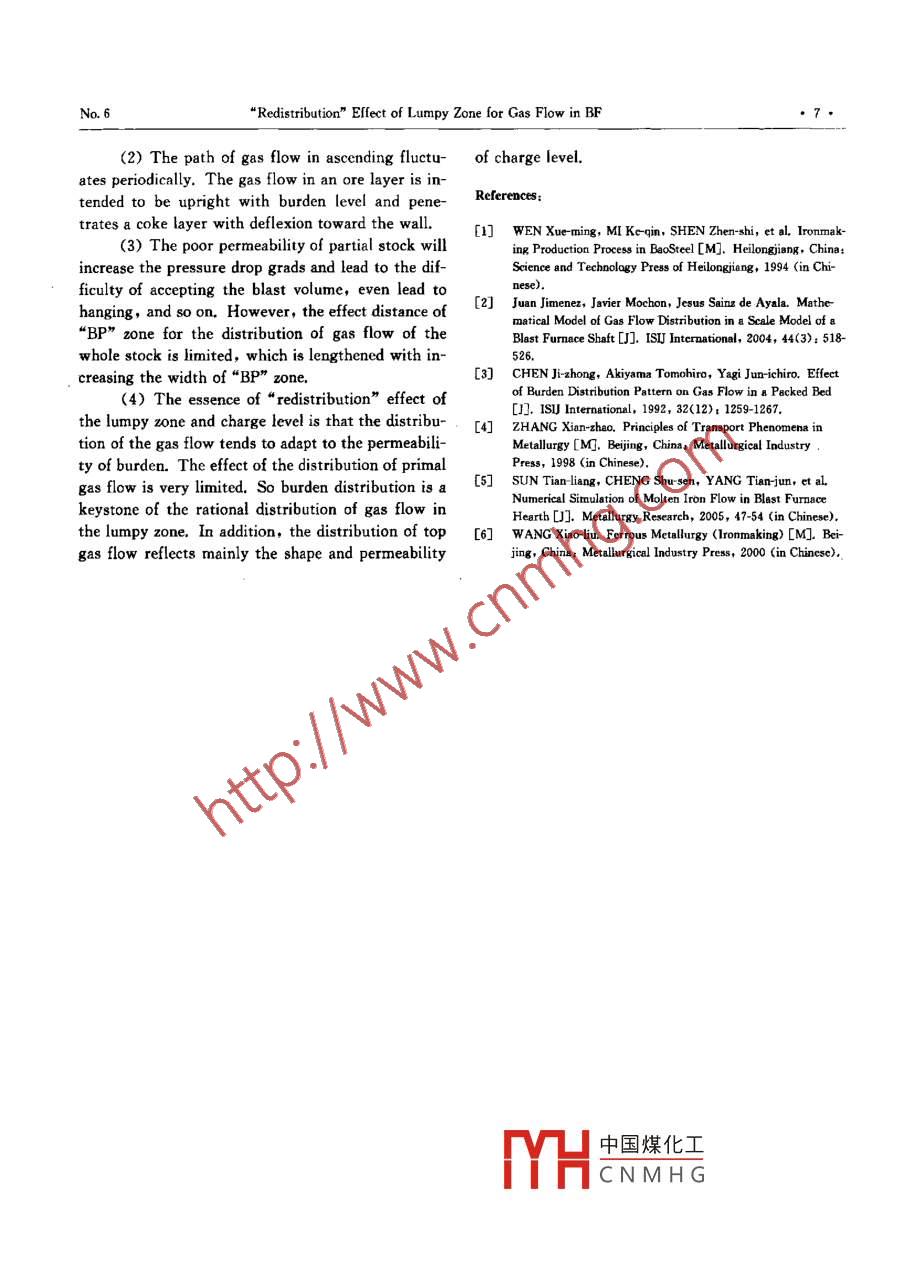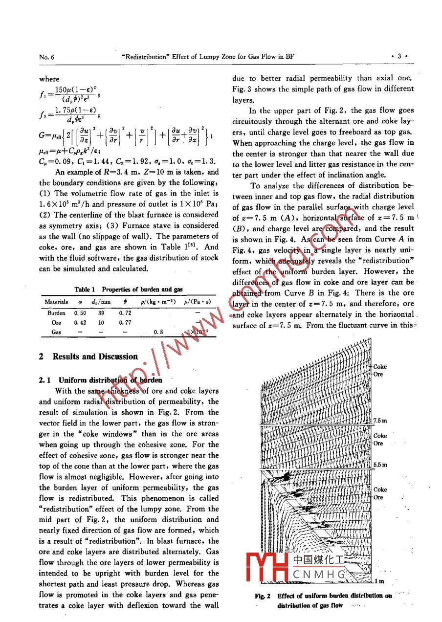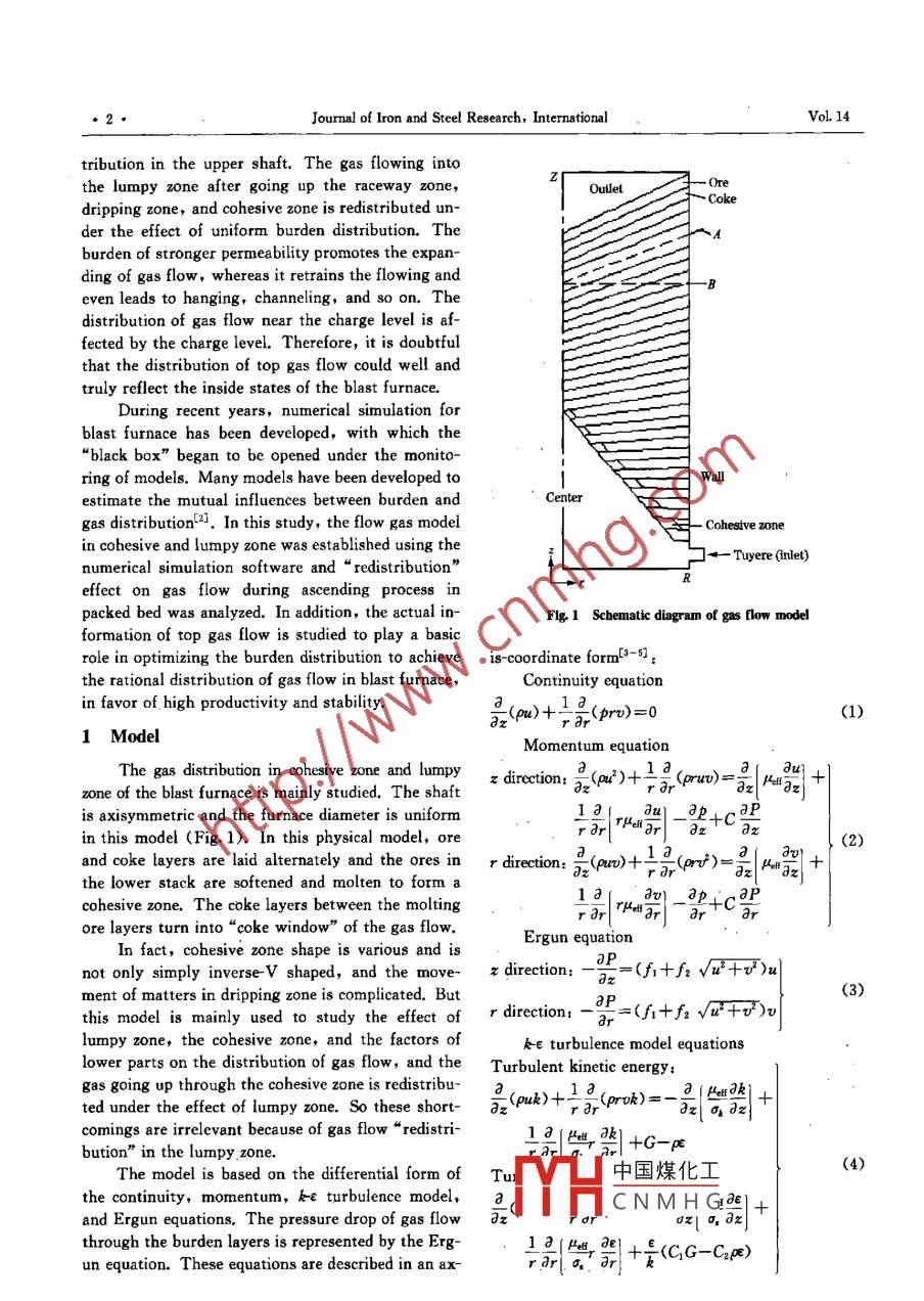 Availableonlineatwww.sciencedirect.comScienceDirectJOURNAL OF IRON AND STEEL RESEARCH, INTERNATIONAL. 2007, 14(6): 01-07Redistribution"Effect of Lumpy Zone for Gas Flow in BFZHU Qing-tian, CHENG Shu-sen(School of Metallurgical and Ecological Engineering, University of Science and Technology beijing, Beijing 100083, China)Abstract, The gas flow from tuyere to raceway zone by blasting involves three distributional zones, such as drippingcohesive, and lumpy zone. The gas flow distribution in lumpy zone directly affects the gas utilization ration andsmooth operation in the blast furnace. However, the furnace closeness brings about great difficulty in the study ofhigh-temperature gas flow. The charging and blasting system affecting the gas flow and whether the top gas flowdistribution could reflect its inner condition as well as the furnace state, such as hanging or scaffolding, which havebecome the main problems for the research on gas flow. Recently, several researches overseas studied gas flow dis-ribution using the numerical simulation method, however, such a research was rare amongst the natives. In thisstudy, the flow model of gas in cohesive and lumpy zone was established using the numerical simulation software anthe gas flow distributions with uniform distribution of burden permeability, scaffolding of wall, and nonuniformcharge level were analyzed. As a result, the effects of cohesive zone and lower parts on the gas flow are very limitedand the charge level largely affects the distribution of top gas flow. Therefore, it was found that the distribution oftop gas flow could hardly reflect the inner gas flow. The process is called"redistribution"effect, which means thatthe gas flow after passing through the raceway, dripping, and cohesive zone is distributed when it flows into theKey words, blast furnace; gas flow: lumpy zone: numerical simulationboILCConstant, C=0 in freeboard, and C=l in packe-Turbulence dissipation raterbed;ped factor of particled.-Effective diameter of particlea, o. Effective Prandtl number for k, t, respective-ic energy, m/s-Pressure of gas, Pa-Static pressure drop of gas in packed bed, PaViscosity coefficient of gas, Pa.8:u,velocity in z, r direction, m/s-Void fraction of charge layer.The rational distribution of radial gas flow in a tem as top operation pf the blast furnace is impor-blast fumace is of great importance to stable smooth op- tant in the distribution of gas flow.eration and improving gas utilization. It is one of theThe furnace closeness and reaction complexity bringbasic methods for blast furnace operation that adopts about great difficulty in the study of distribution of gasappropriate blasting and charging systems to control flow. In this study, the inner furnace state, distributionand adjust the distribution of gas flown. The sound of gas flow, and cohesive zone shape are estimated bydistribution of gas flow is to achieve the highest gas monitoring the distribution of top gas. However, theutilization efficiency and the lowest fuel consumption distribution of gas flow from bottom to top containson the basis of the smooth operation of the furnace. thend raceway zone,According to long-term practice, the charging sys- mid di中國(guó)煤某化二ck, and upper dis-CNMHGFoundation Item: Item Sponsored by National Natural Science Foundation of ChinBiography,ZHUQing-tian(1981-),Male,Master:Bmall,bluersky1@yahoo.com.cr,RevisedDate:September15,2006Journal of Iron and Steel Research, Internationaol,14tribution in the upper shaft. The gas flowing intothe lumpy zone after going up the raceway zone,Outletdripping zone, and cohesive zone is redistributed un-der the effect of uniform burden distribution, Theburden of stronger permeability promotes the expan-ding of gas flow, whereas it retrains the flowing andeven leads to hanging, channeling, and so on. Thedistribution of gas flow near the charge level is af-fected by the charge level. Therefore, it is doubtfulthat the distribution of top gas flow could well andtruly reflect the inside states of the blast furnace.During recent years, numerical simulation forblast furnace has been developed, with which the“ black box” began to be opened under the monitoring of models. Many models have been developed toestimate the mutual influences between burden andCentergas distribution 2J, In this study, the flow gas modelin cohesive and lumpy zone was established using thenumerical simulation software and "redistributioneffect on gas flow during ascending procespacked bed was analyzed. In addition, the actual in-Flg. 1 Schematic diagram of gas flow modelformation of top gas flow is studied to play a basicrole in optimizing the burden distribution to achieve is-coordinate form[3-5:he rational distribution of gas flow in blast furnaceContinuity equationin favor of high productivity and stability.a()+:(prv)=0(1)1 Modelam equationThe gas distribution in cohesive zone and lumpy t direction, azone of the blast furnace is mainly studied. The shaft02(a)+13(m)=az|"az+is axisymmetric and the furnace diameter is uniformI aPin this model (Fig. 1). In this physical model, oreand coke layers are laid alternately and the ores in r direction: a(puo)+13the lower stack are softened and molten to form acohesive zone. The coke layers between the moltingencop i/*ore layers turn into" coke window"of the gas flow.Ergun equationIn fact, cohesive zone shape is various and isnot only simply invvs, and the move- z dir(+√+u)ment of matters in dripping zone is complicated. But(3)this model is mainly used to study the effect of r direction=(1+f2√a2+)lumpy zone, the cohesive zone, and the factors ofk-e turbulence model equationslower parts on the distribution of gas flow, and the Turbulent kinetic energygas going up through the cohesive zone is redistribu- ated under the effect of lumpy zone. So these short- az(puk)+10,(prok)=a fa akiz032comings are irrelevant because of gas flow redistri-13{bution"in the lumpy zone.,+G-cThe model is based on th