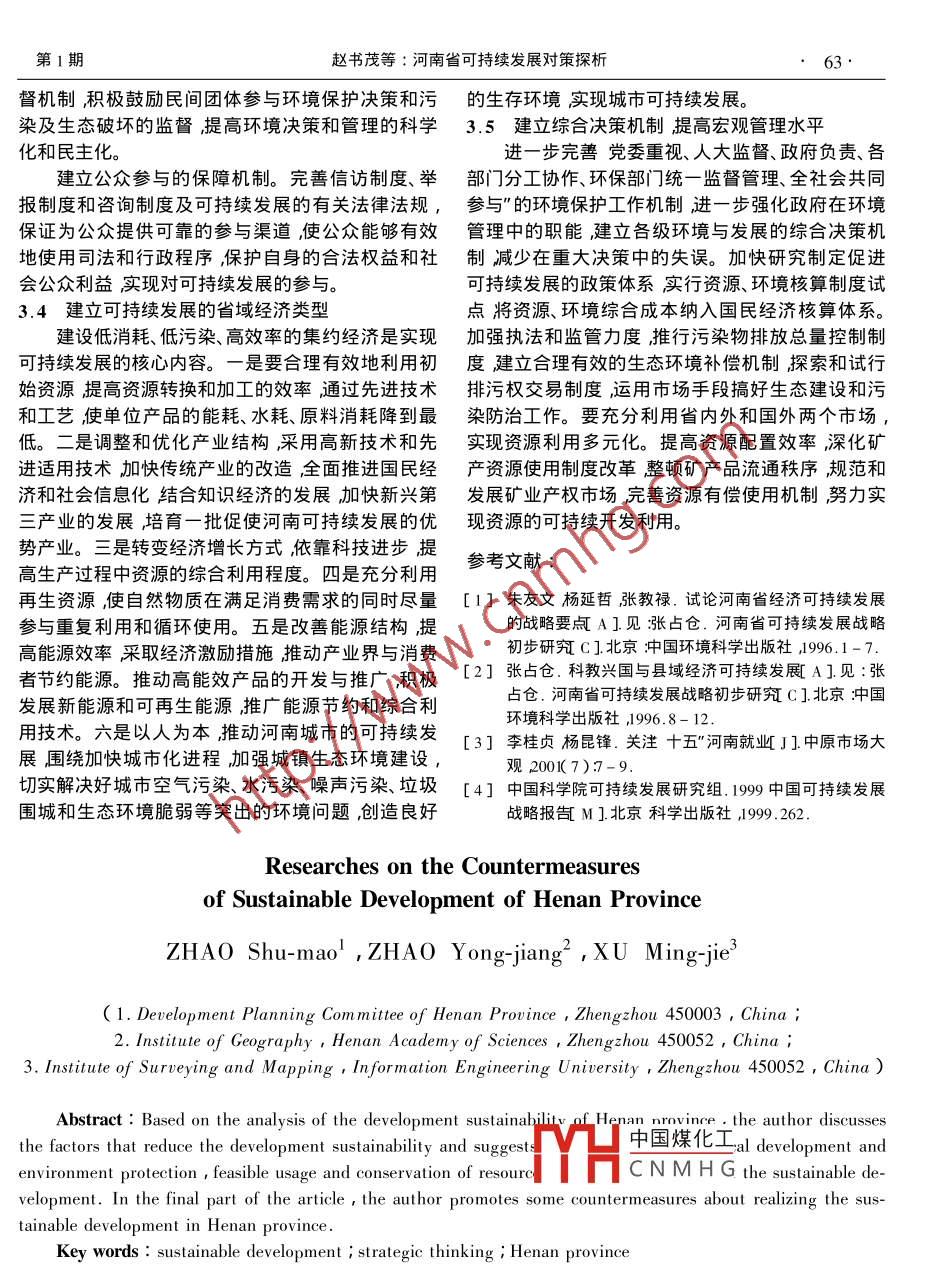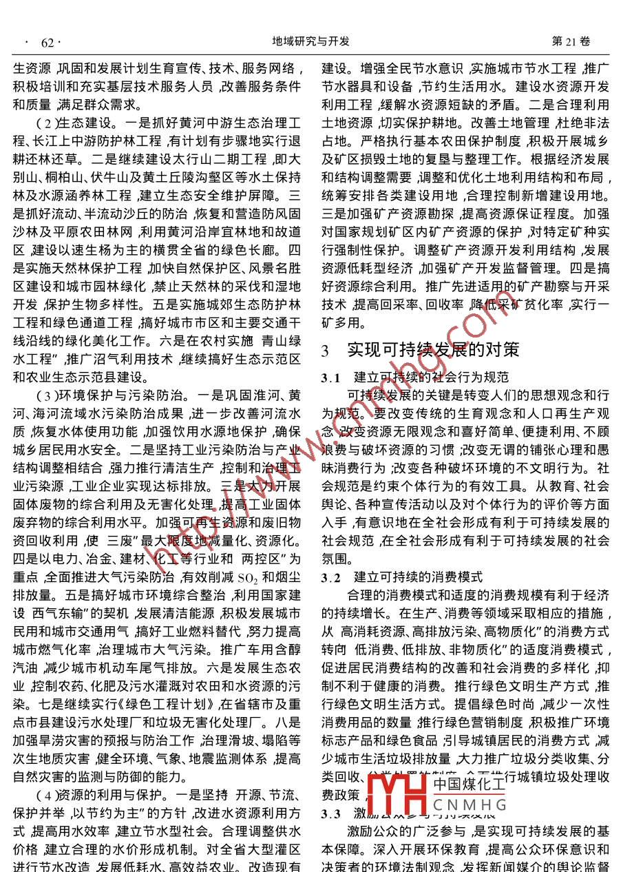 第21卷第1期地域研究與開發(fā)Vol.21 No. 12002年3月AREAL RESEARCH AND DEV ELOPMENTMar. 2002文章編號(hào): 1003-2363( 2002 )01-0060-04河南省可持續(xù)發(fā)展對(duì)策探析趙書茂| ,趙永江2 ,徐銘杰3( 1.河南省發(fā)展計(jì)劃委員會(huì)河南鄭州450003 ;2.河南省科學(xué)院地理研究所河南鄭州450052 ;3.信息工程大學(xué)測(cè)繪學(xué)院河南鄭州450052 )摘要:文章探討了河南省可持續(xù)發(fā)展中存在的主要制約因素,明確了河南省可持續(xù)發(fā)展的指導(dǎo)思想及人口、生態(tài)建設(shè)與環(huán)境保護(hù)、資源利用與保護(hù)等領(lǐng)域的重點(diǎn)任務(wù)提出了實(shí)現(xiàn)可持續(xù)發(fā)展的對(duì)策。關(guān)鍵詞:河南省河持續(xù)發(fā)展戰(zhàn)略構(gòu)想.中圖分類號(hào): X22文獻(xiàn)標(biāo)識(shí)碼: A用水量約為240m3 ,萬(wàn)元GDP(當(dāng)年價(jià))用水量約為497 m’。1主要 制約因素(4水土資源組合不盡如人意。水熱資源相對(duì)1.1自然資源的結(jié)構(gòu)性缺陷豐富的北亞熱帶地區(qū)面積較小,只占全省土地面積(1河南人均資源擁有量很少,雖能形成-定的的30%。在地貌形態(tài)上,水資源的分布也不利于農(nóng)基礎(chǔ)生存能力,但不能構(gòu)成強(qiáng)大的發(fā)展支持能力。業(yè)生產(chǎn)。徑流分布總的趨勢(shì)是南部多于北部,山地人口密度高出全國(guó)平均水平3.4倍主要資源的人多于平原、谷地。全省耕地大部分集中在平原地區(qū)均占有量大都低于全國(guó)平均水平。優(yōu)勢(shì)資源和資源雖有地下水彌補(bǔ)部分不足,但平原地區(qū)的水資源仍產(chǎn)品中煤炭?jī)H為全國(guó)人均量的28%石油和天然氣難以滿足工農(nóng)業(yè)生產(chǎn)所需,水、 土資源在空間分布上也只有70%左右。許多資源和資源產(chǎn)品的總量,一相背離11。般都在全國(guó)前10名之內(nèi)而人均占有量則一般都在(5資源承載力有限。資源承載力是反映地區(qū)20名以后。可持續(xù)發(fā)展能力的-一個(gè)重要指標(biāo)據(jù)世界糧農(nóng)組織( 2少數(shù)重要資源相對(duì)貧乏,保證程度較低。礦提供的標(biāo)準(zhǔn)人均耕地面積0.08 hm2是土地資源對(duì)產(chǎn)資源組合的明顯缺陷在于少數(shù)重要的礦產(chǎn)資源短可持續(xù)發(fā)展壓力的臨界值。河南自1990年以來(lái)人缺保證程度較低。在煤、 石油、鐵、銅4種最基本的均耕地面積處在警戒線以下。 若按人均0.07 hm2耕礦種中除煤炭、石油儲(chǔ)量相對(duì)豐富產(chǎn)量較大,保證地作為土地承載界限,則河南土地資源的人口容量程度較高外,鐵礦和銅礦保證程度偏低。主要礦產(chǎn)為1.1億,而現(xiàn)實(shí)人口規(guī)模已突破9400萬(wàn)。品種開發(fā)利用程度較高,全省煤礦區(qū)(井)有70%已1.2潛在的環(huán)境壓力開發(fā)利用,已開發(fā)利用的鋁土礦占總保有儲(chǔ)量的(1)經(jīng)濟(jì)增長(zhǎng)方式與環(huán)境保護(hù)的矛盾將長(zhǎng)期存30%土地利用率約89%左右土地墾殖率約49% ,在能源消費(fèi)帶來(lái)的環(huán)境問(wèn)題突出。受工業(yè)結(jié)構(gòu)影二者均居全國(guó)前列。資源開發(fā)利用中存在著掠奪性響全省能源需求總量很大伴隨著經(jīng)濟(jì)總量的持續(xù)開采等問(wèn)題造成資源的破壞和浪費(fèi)削弱了優(yōu)勢(shì)資增長(zhǎng)電力和原材料工業(yè)仍將快速發(fā)展能源需求將源的優(yōu)勢(shì)度和緊缺資源的供給能力。繼續(xù)上升,以煤炭為主的能源消費(fèi)結(jié)構(gòu)難以發(fā)生根(3水資源緊缺。人 均水資源量只相當(dāng)于全國(guó)本性改變大量的能源消費(fèi)帶來(lái)的SO,和NOx的排平均水平的1/5在開源節(jié)流前提下,21 世紀(jì)初中等放將對(duì)環(huán)境造成更大的壓力。干旱年也將缺水60億m3以上。因缺水,-些地區(qū)(2 )捕十省*程加街海無(wú)個(gè)理的城市功能和滯的基礎(chǔ)生存能力將受到損害,-些優(yōu)勢(shì)資源如耕地、后的城中國(guó)煤化工矛盾十分突出生煤炭等的利用受到影響。2000 年全省水資源總量消CNMH(L人T文出大了人口密集區(qū)域耗率為55%左右地表水利用率為47%左右人均環(huán)境質(zhì)量改善的難度。(3)脆弱生態(tài)區(qū)的保護(hù)與發(fā)展矛盾突出。大部收稿日期: 2001-12-05;修回日期: 2002 -01-24作者簡(jiǎn)介:趙書茂1962-) 男河南鞏義市人碩士主要從事分縣域經(jīng)濟(jì)和眾多鄉(xiāng)鎮(zhèn)企業(yè)多是從重污染產(chǎn)業(yè)起步區(qū)域經(jīng)濟(jì)與可持續(xù)發(fā)展研究。技術(shù)水平和污染防治能力較低小散、弱的狀況十分第1期趙書茂等:河南省可持續(xù)發(fā)展對(duì)策探析61 .突出對(duì)環(huán)境承載力沖擊很大2。農(nóng)業(yè)生產(chǎn)中大量施眾利益和長(zhǎng)遠(yuǎn)利益 使企業(yè)生產(chǎn)成本外部化。- -些用化肥、農(nóng)藥等使環(huán)境污染由點(diǎn)向面不斷擴(kuò)大。地方政府在經(jīng)濟(jì)和社會(huì)發(fā)展中仍未真正確立可持續(xù)(4科學(xué)技術(shù)水平不能適應(yīng)可持續(xù)發(fā)展模式的發(fā)展思想,不能正確處理近期和長(zhǎng)遠(yuǎn)、現(xiàn)時(shí)和后代發(fā)要求缺乏各行業(yè)適用的清潔生產(chǎn)技術(shù)和環(huán)境達(dá)標(biāo)展能力之間的關(guān)系,對(duì)原生環(huán)境問(wèn)題和次生環(huán)境問(wèn)技術(shù)清潔生產(c