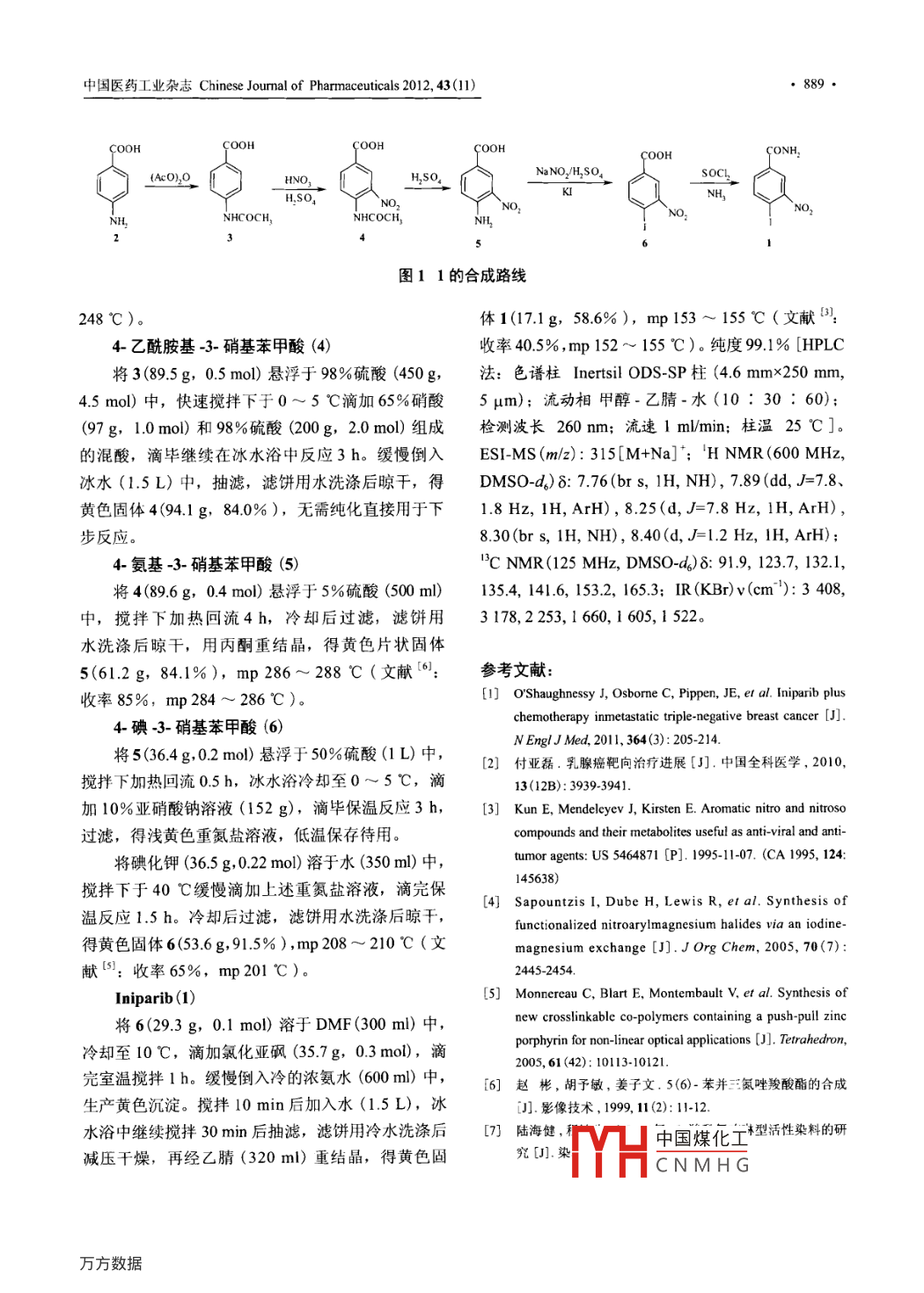 888●中國醫(yī)藥工業(yè)雜志Chinese Journal of Pharmaceuticals 2012, 43(11)Iniparib的合成紀文華',高乾善'*,李瑞梅’(1.山東省分析測試中心,山東濟南250014; 2. 美國VRL實驗室,馬里蘭州20705)摘要:對氨基苯甲酸經(jīng)?;⑾趸?、水解、重氮化及碘代反應(yīng)制得4-碘-3-硝基苯甲酸,再依次與氯化亞砜、氨水反應(yīng)生成聚腺苷二磷酸核糖聚合酶抑制劑iniparib,總收率約35%。關(guān)鍵詞: iniparib;: 聚腺苷二磷酸核糖聚合酶抑制劑:抗腫瘤藥:合成中圖分類號: R979.1*9文獻標志碼: A文章編號: 1001-8255 (2012) 1088-0828Synthesis of IniparibJI Wenhua', GAO Qianshanl*, LI Ruimei?2(I. Shandong Analysis and Test Center, Jinan 250014; 2. USA VRL International, Maryland 20705. USA)ABSTRACT: Iniparib, a poly-ADP-ribose polymerase inhibitor, was synthesized from 4-aminobenzoic acid byacetylation, nitration, hydrolysis, diazotization and iodination to give 4-iodo-3-nitrobenzoic acid, which was subjected toreaction with SOCI2 and ammonium hydroxide successively with an overall yield of about 35%.Key Words: iniparib; poly-ADP -ibose polymerase inhibitor;, antitumor agent; synthesisIniparib (BSI-201,1),化學名為4-碘-3-硝性,再依次與濃鹽酸/亞硝酸鈉、碘化鉀進行重氮化、基苯甲酰胺,是賽諾菲-萬安特公司研制的聚腺苷碘代反應(yīng)制得6,收率65% [51。二磷酸核糖聚合酶(PARP)抑制劑,目前處于II期本研究參考相關(guān)文獻I.6,以對氨基苯甲酸(2)臨床研究階段“。本品可阻止腫瘤修復化療損傷與乙酐反應(yīng)得對乙酰胺基苯甲酸(3),3經(jīng)硝化、的DNA,抑制腫瘤發(fā)展或加速其凋亡。但1不能水解得5。本研究用50%硫酸代替氫氧化鈉1濃鹽完全殺死腫瘤細胞,需與其他細胞毒抗腫瘤藥如卡酸(5),收率可提高到91%。6先后與氯化亞砜、氨鉑(carboplatin)、 吉西他濱(gemcitabine) 等聯(lián)合應(yīng)水反應(yīng)即可得131。改進后的工藝反應(yīng)溫和,后處.用(12)。理簡便,適合工業(yè)化生產(chǎn),總收率為34.5%。1的文獻[3]用4-碘-3-硝基苯甲酸(6)與氯化亞合成路線見圖1。砜在DMF中反應(yīng)得4-碘-3-硝基苯甲酰氯,直接實驗部分與濃氨水作用得1,總收率為40.5%。6主要有以對乙酰胺基苯甲酸(3)下合成方法:①對碘苯甲酸酯經(jīng)硝化、酯水解反應(yīng)將2(購自常州陽光藥業(yè)有限公司,純度99%,得到6*,總收率約52%,但原料不易得。②4-氨137g,1mol) 懸浮于乙酸(280g)中,80 C水浴加基-3-硝基苯甲酸(5)先與氫氧化鈉成鹽增加溶解熱下攪拌至全溶。滴加乙酐(127.5 g,1.25 mol),收稿日期: 2012-05-21生成大量白色不溶物。2h后TLC顯示反應(yīng)完全[展作者簡介:紀文華(1983-), 男,碩士研究生,專業(yè)方向: 有機合開劑:氯仿-甲醇.三乙胺(98:11:2)]。冷卻成E-mail: jwh519@163 com至室溫,反應(yīng)液倒入冰水(約400 m1)中,抽濾, .通信聯(lián)系人:高乾善(1964-),男, 副研究員,從事新藥研發(fā)及精濾餅用水洗滌后晾干,用乙酸乙酯-甲醇(1 : 1)細化工品合成。Tel: 0531-82605315重結(jié)晶,得中國煤化工91.1%),mpE-mail: gaoqianshan@163.com246~ 247CNMHG%,mp246~中國醫(yī)藥工業(yè)雜志Chinese Jourmal of Pharmaceuticals 2012, 43(11)●889●COOH(Ac0)2H.SCNaNO/H,SO。_soch,KIH,SO,NCNO2NHNHCOCH,2”6圖1 1的合成路線248 C )。體1(17.1g, 58.6%), mp153~ 155C (文獻()!:4-乙酰胺基-3-硝基苯甲酸(4)收率40.5%, mp 152~ 155 C)。純度99.1% [HPLC將3(89.5g,0.5 mol)懸浮于98%硫酸(450 g,法:色譜柱Inertsil ODS-SP柱(4.6 mmx250 mm,4.5 mol)中,快速攪拌下于0~ 5 C滴加65%硝酸5μm);流動相甲醇-乙腈-水(10:30:60);(97g,1.0 mol)和98%硫酸(200g, 2.0 mol)組成檢測波長260nm;流速1m/min;柱溫25C]。的混酸,滴畢繼續(xù)在冰水浴中反應(yīng)3 h。緩慢倒入ESI-MS (m/z): 315[M+Na]*; 'H NMR (600 MHz,冰水(1.5L)中,抽濾,濾餅用水洗滌后晾干,得DMSO-d,)8: 7.76(br s, 1H, NH), 7.89 (dd, J=7.8、黃色固體4(94.1 g, 84.0%), 無需純化直接用于下1.8 Hz, 1H, ArH), 8.25(d,J=7.8 Hz, 1H, ArH),步反應(yīng)。8.30(br s, 1H, NH), 8.40(d, J=1.2 Hz, 1H, ArH);4-氨基-3-硝基苯甲酸(5) ."C NMR(125 MHz, DMSO-d)8: 91.9, 123.7, 132.1,將4(89.6g,0.4 mol)懸浮于5%硫酸(500 ml)135.4, 141.6, 153.2, 165.3; IR(KBr)v(cm~): 3 408,中,攪拌下加熱回流4h,冷卻后過濾,濾餅用3178, 2253, 1 660, 1 605, 1 522。水洗滌后晾干,用丙酮重結(jié)晶,得黃色片狀固體5(61.2g, 84.1%), mp286~288 C (文獻[6:參考文獻: .收率85%,mp284 ~ 286 °C )。1] O'Shaughnessy J, Osborne C, Pippen, JE, e1 al. Iniparib pluschemotherapy inmetastatic triple-negative breast cancer [J]4-碘-3-硝基苯甲酸(6)N Eng/ J Med, 2011, 364(3): 205-214.將5(36.4 g,0.2 mol)懸浮于50%硫酸(1L)中,2] 付亞磊.乳腺癌靶向治療進展[J]. 中國全科醫(yī)學, 2010,攪拌下加熱回流0.5h,冰水浴冷卻至0~5C,滴13(12B): 3939-3941.加10%亞硝酸鈉溶液(152 g),滴畢保溫反應(yīng)3 h,[3] Kun E, Mendeleyev J, Kirsten E. Aromatic nitro and nitroso過濾,得淺黃色重氮鹽溶液,低溫保存待用。compounds and their metabolites useful as antiviral and anti-tumor agents: US 5464871 [P]. 195-11-07. (CA 199, 124:將碘化鉀(36.5 g,0.22 mol)溶于水(350 ml)中,145638)攪拌下于40 C緩慢滴加上述重氮鹽溶液,滴完保4] Sapountzis I, Dube H, Lewis R, et al. Synthesis of溫反應(yīng)1.5 h。冷卻后過濾,濾餅用水洗滌后晾干,functionalized nitroarylmagnesium halides via an iodine-得黃色固體6(53.6g,91.5%),mp208~ 210C (文magnesium exchange [J]. J Org Chem, 2005, 70(7):獻'5]:收率65%,mp201 C)。2445-2454.Iniparib (1)[5] Monnereau C, Blart E, Montembault V, et al. Synthesis of將6(29.3g, 0.1 mol)溶于DMF(300 ml)中,new crosslinkable co-polymers containing a push-puill zincporphyrin for non-linear optical applications [J]. Tetrahedr