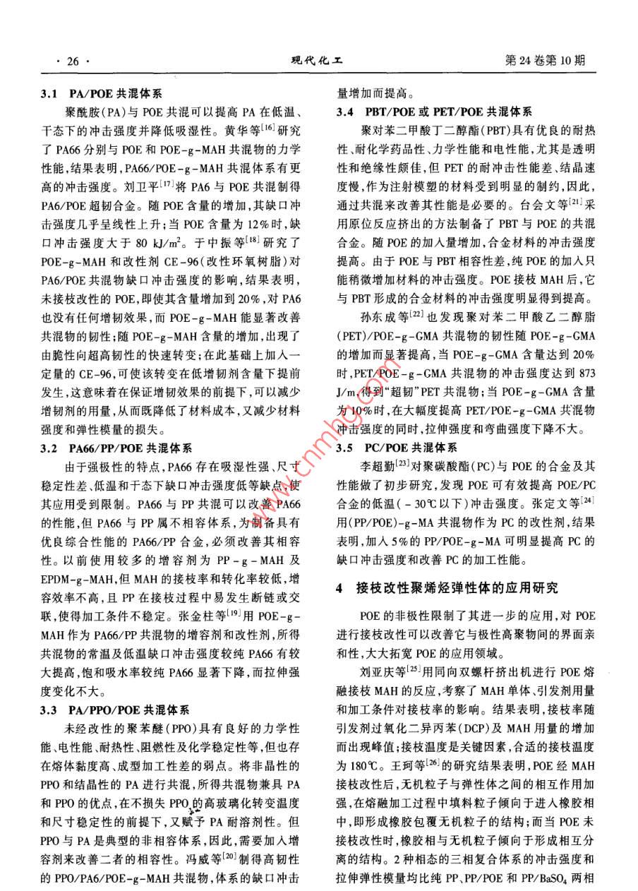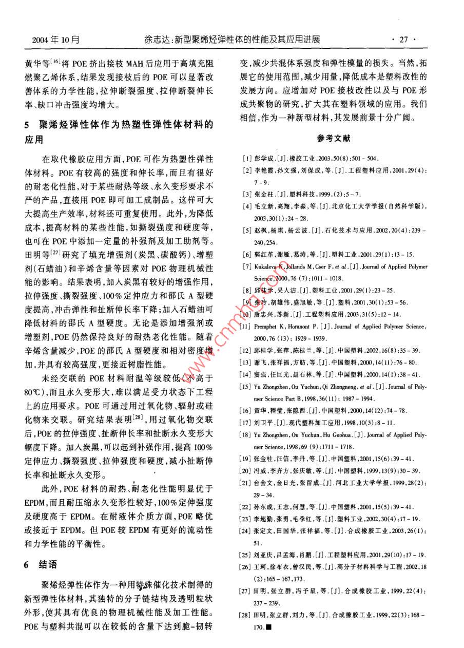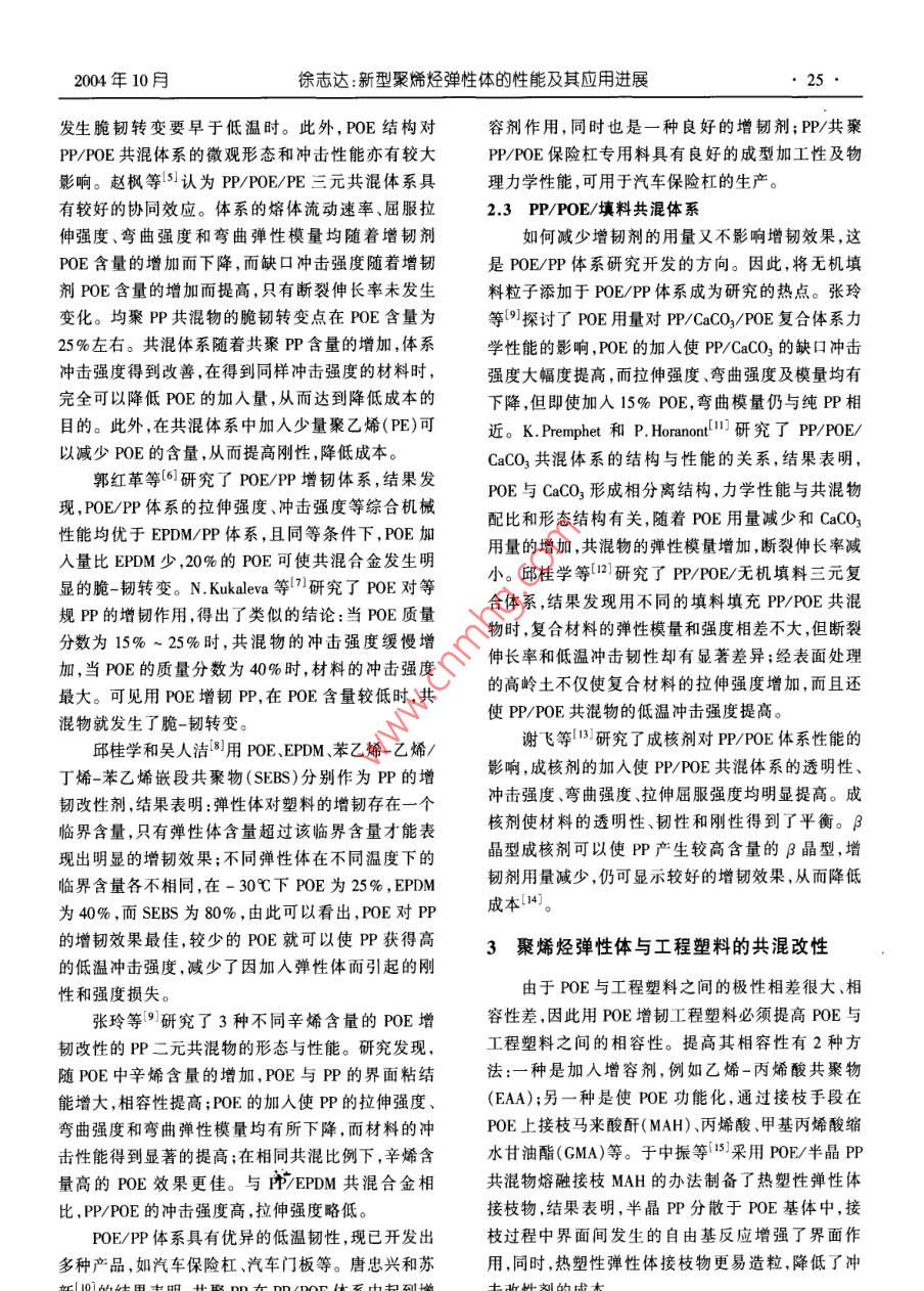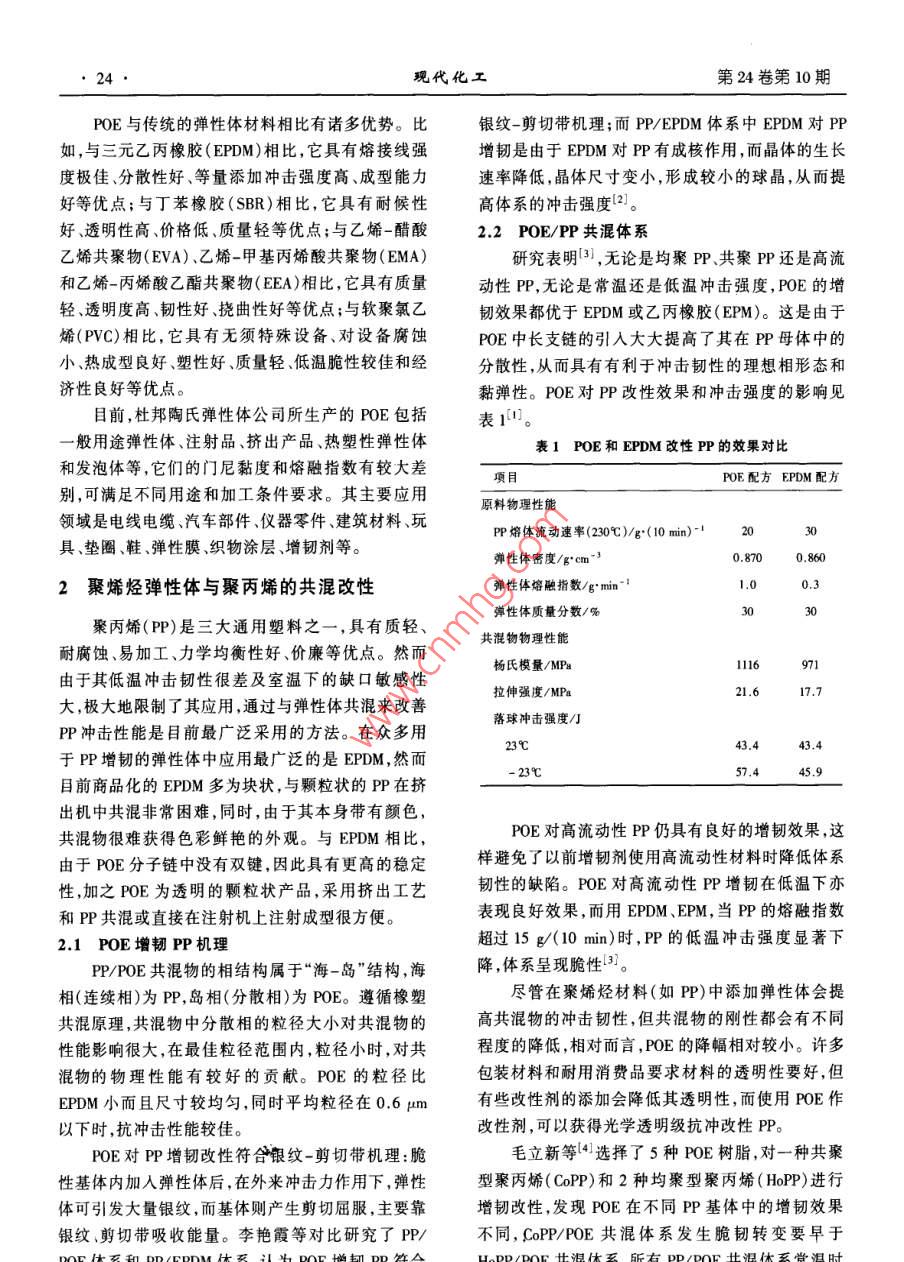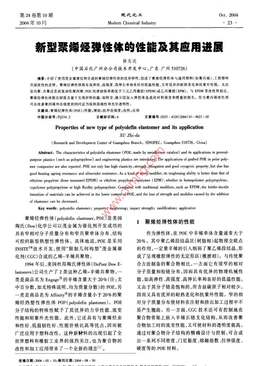 第24卷第10期現(xiàn)代化工Oct. 20042004年10月Modern Chemical Industry●23.新型聚烯烴彈性體的性能及其應用進展徐志達(中國石化廣州分公司技術開發(fā)中心,廣東廣州510726)摘要:介紹了使用茂金屬催化劑合成的聚烯烴彈性體的優(yōu)異特性,綜述了聚烯烴彈性體與通用塑料(如聚丙烯)、工程塑料共混改性的進展。聚烯烴彈性體既有高彈性、高強度、高伸長率和良好的低溫性能,又有優(yōu)異的耐熱老化和抗紫外性能。無論是均聚、共聚還是高流動性聚丙烯,P0E的增韌效果都優(yōu)于三元乙丙橡膠(EPDM)或乙丙橡膠(EPM)。與EPDM等改性劑相比,聚烯烴彈性體能在較低含量下實現(xiàn)材料的脆-韌轉(zhuǎn)變,減少因加人彈性體造成的材料強度和模量的損失。作為聚丙烯改性劑可在改善聚丙烯沖擊強度的同時適當保持其剛性和光學透明性。關鍵詞:聚烯烴彈性體(POE);性能;增韌;抗沖擊強度;改性:應用中團分類號:T0334.2文獻標識碼:A文章編號:0253 - 4320(200)10- 0023 -05Properties of new type of polyolefin elastomer and its applicationXU Zhi-da(Research and Development Center of Guangzhou Branch, SINOPEC, Guangzhou 510726, China)Abstract: The characleristics of polyolefin elastomer ( POE, made by meallocene catalyst) and is applications in general-pupose plastics ( such as polypropylene) and engineering plastis are introduced . The aplications of grafted POE in polar poly-mer composites are also reported。POE not only has high elasticity , strength, elongation and good cryogenic property , but also hasgood heating ageing resistance and ultraviolet resitance . As a kind of novel modifer , its toughening ability is better than that ofethylene propylene diene monomer( EPDM) or ethylene propylene copolymer ( EPM) , whether in homopolymer polypropylene,copolymer polypropylene or high fluidity polypropylene . Compared wih taiona modifers, such as EPDM, the britle duciletransition of materials can be achieved in the lower content of POE , and the loss of strength and modulus eaused by the additionof elastomer can be decreased.Key words: polyolefin elastomer; property; toughening; impuct strengh; modification; pplication聚烯烴彈性體(polyolefnelastomer,POE)是美國1聚烯烴彈性體的性 能陶氏(Dow)化學公司以茂金屬為催化劑開發(fā)成功的具有窄相對分子質(zhì)量分布和窄共聚單體分布、結(jié)構(gòu)作為彈性體,在POE中辛烯單體含量通常大于可控的新型熱塑性彈性體。具體地說,POE是采用20%。其中聚乙烯段結(jié)晶區(qū)(樹脂相)起物理交聯(lián)點INSITEM技術開發(fā),使用“限制幾何構(gòu)型”茂金屬催的作用,一定量辛烯的引入削弱了聚乙烯段結(jié)晶,形化劑(CC)合成的乙烯-辛烯共聚物。成了呈現(xiàn)橡膠彈性的無定形區(qū)(橡膠相)。與傳統(tǒng)聚1994年后,美國杜邦陶氏彈性體(DuPont Dow E-合方法制備的聚合物相比,一方面它有很窄的相對lastomers)公司生產(chǎn)了2類這種乙烯-辛烯共聚物,一分子質(zhì)量和短鏈分布,因而具有優(yōu)異的物理機械性類是商品名為Engage8 的辛烯含量大于20%(注:文能,如高彈性、高強度、高伸長率和良好的低溫性能。中百分數(shù),如無特殊說明,均為質(zhì)量分數(shù))的POE,另又由于其分子鏈是飽和的,所含叔碳原子相對較少,一-類是商品名為Affinity的辛烯含量小于20%的聚因而又具有優(yōu)異的耐熱老化和抗紫外性能。窄的相烯烴熱塑性彈性體POP( polyolein plastomer)。 P0E對分子質(zhì)量分布使材料在注射和擠出加工過程中不分子結(jié)構(gòu)的特殊性賦予了其優(yōu)異的力學性能流變易產(chǎn)生翹曲。另一方面,CGC技術還可有控制地在性能和耐紫外光性能。此外,它還具有與聚烯烴親聚合物骨架上嵌人辛烯長鏈支化結(jié)構(gòu),從而改善聚和性好、低溫韌性好、性能價格比高等優(yōu)點,因而被合物加工時的流變性能,又可使材料的透明度提高。廣泛應用于塑料改性。這種新材料的出現(xiàn)引起了全通過對聚合物分子結(jié)構(gòu)的精確設計與控制,可合成世界塑料和橡膠工業(yè)界的強烈關注,也為聚合物的出一系列不同密度、門尼黏度、熔融指數(shù)、拉伸強度、改性和加工應用帶來了一個全新的理念。硬度等的POE材料。收稿日期:2004 - 05 - 10;修回日期:2004-08 - 3024●現(xiàn)代化工第24卷第10期POE與傳統(tǒng)的彈性體材料相比有諸多優(yōu)勢。比銀紋-剪切帶機理;而PP/EPDM體系中EPDM對PP如,與三元乙丙橡膠(EPDM)相比,它具有熔接線強增韌是由于EPDM對PP有成核作用,而晶體的生長度極佳、分散性好、等量添加沖擊強度高、成型能力速率降低,晶體尺寸變小,形成較小的球晶,從而提好等優(yōu)點;與丁苯橡膠(SBR)相比,它具有耐候性高體系的沖擊強度口。好、透明性高、價格低、質(zhì)量輕等優(yōu)點;與乙烯-醋酸2.2 POE/PP 共混體系乙烯共聚物(EVA).乙烯-甲基丙烯酸共聚物(EMA)研究表明[3],無論是均聚PP、共聚PP還是高流和乙烯-丙烯酸乙酯共聚物( EEA)相比,它具有質(zhì)量動性PP,無論是常溫還是低溫沖擊強度,POE的增輕、透明度高韌性好、撓曲性好等優(yōu)點;與軟聚氯乙韌效果都優(yōu)于EPDM或乙丙橡膠(EPM)。這是由于烯(PVC)相比,它具有無須特殊設備、對設備腐蝕POE中長支鏈的引入大大提高了其在PP母體中的.小熱成型良好、塑性好、質(zhì)量輕、低溫脆性較佳和經(jīng)分散性,從而具有有利于沖擊韌性的理想相形態(tài)和濟性良好等優(yōu)點。黏彈性。POE對PP改性效果和沖擊強度的影響見目前,杜邦陶氏彈性體公