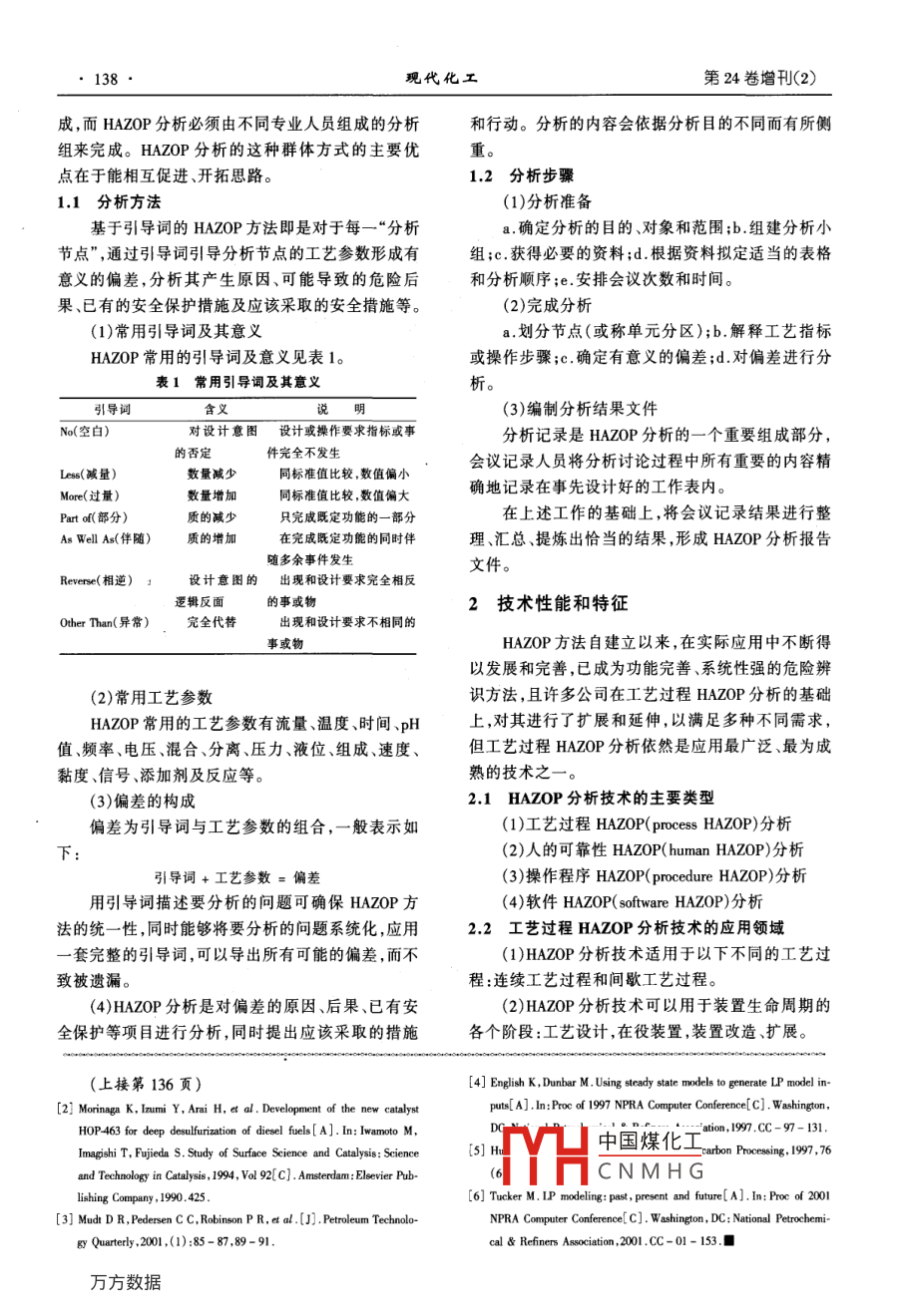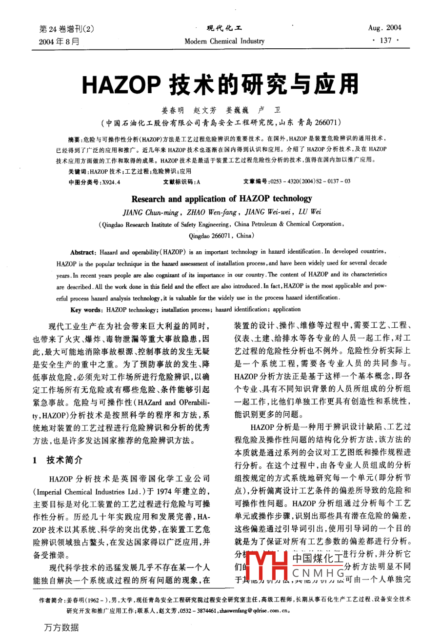 第24卷增刊(2)現(xiàn)代化工Aug.20042004年8月Modern Chemical Industry137HAZOP技術(shù)的研究與應(yīng)用姜春明趙文芳姜巍巍盧衛(wèi)(中國石油化工股份有限公司青島安全工程研究院,山東青島26071)摘要:危險與可操作性分析( HAZOP)方法是工藝過程危險辨識的重要技術(shù)。在國外, HAZOP是裝置危險辨識的通用技術(shù)已經(jīng)得到了廣泛的應(yīng)用和推廣。近幾年來HAZP技術(shù)也逐漸在國內(nèi)得到認(rèn)識和應(yīng)用。介紹了 HAZOP分析技術(shù),及在HAOP技術(shù)應(yīng)用方面做的工作和取得的成果。HAZO技術(shù)是最適于裝置工藝過程危險性分析的技術(shù)值得在國內(nèi)加以推廣應(yīng)用。關(guān)鍵詞: HAZOP技術(shù);工藝過程;危險辨識;應(yīng)用中圖分類號:X924.4文獻標(biāo)識碼:A文章編號:0253-4320(2004)s2-0137-03Research and application of HAZOP technologyJIANG Chun-ming, ZHAO Wen-fang, JIANG Wei-tcei, LU WeQingdao Research Institute of Safety Engineering, China Petroleum Chemical CorporationAbstract: Hazard and operability(HAZOP)is an important technology in hazard identification. In developed countriesHAZOP is the popular technique in the hazard assessment of installation process, and have been widely used for several decadeyears. In recent years people are also cognizant of its importance in our country. The content of HAZOP and its characteristicsare described. All the work done in this field and the effect are also introduced. In fact, HAZOP is the most applicable and powit is valuable for the widely use in the process hazard identificationKey words: HAZOP technology installation process: hazard identification; application現(xiàn)代工業(yè)生產(chǎn)在為社會帶來巨大利益的同時裝置的設(shè)計、操作、維修等過程中,需要工藝、工程、也帶來了火災(zāi)爆炸、毒物泄漏等重大事故隱患,因儀表、土建給排水等各專業(yè)的人員一起工作,對工此,最大可能地消除事故根源控制事故的發(fā)生無疑藝過程的危險性分析也不例外。危險性分析實際上是安全生產(chǎn)的重中之重。為了預(yù)防事故的發(fā)生、降是一個系統(tǒng)工程,需要各專業(yè)人員的共同參與。低事故危險,必須先對工作場所進行危險辨識以確 HAZOP分析方法正是基于這樣一個基本概念,即各定工作場所有無危險或有哪些危險、條件能夠引起個專業(yè)、具有不同知識背景的人員所組成的分析組緊急事故。危險與可操作性( HAZard and OPerabil一起工作,比他們單獨工作更具有創(chuàng)造性和系統(tǒng)性ty, HAZOP)分析技術(shù)是按照科學(xué)的程序和方法,系能識別更多的問題。統(tǒng)地對裝置的工藝過程進行危險辨識和分析的優(yōu)秀HAZOP分析是一種用于辨識設(shè)計缺陷、工藝過方法,也是許多發(fā)達國家推薦的危險辨識方法。程危險及操作性問題的結(jié)構(gòu)化分析方法,該方法的本質(zhì)就是通過系列的會議對工藝圖紙和操作規(guī)程進1技術(shù)簡介行分析。在這個過程中,由各專業(yè)人員組成的分析HAZOP分析技術(shù)是英國帝國化學(xué)工業(yè)公司組按規(guī)定的方式系統(tǒng)地研究每一個單元(即分析節(jié)( Imperial Chemical Industries Ltd.)于1974年建立的,點),分析偏離設(shè)計工藝條件的偏差所導(dǎo)致的危險和主要目標(biāo)是對化工裝置的工藝過程進行危險與可操可操作性問題。 HAZOP分析組通過分析每個工藝作性分析。歷經(jīng)幾十年實踐應(yīng)用和發(fā)展完善,HA-單元或操作步驟,識別出那些具有潛在危險的偏差ZOP技術(shù)以其系統(tǒng)、科學(xué)的突出優(yōu)勢,在裝置工藝危這些偏差通過引導(dǎo)詞引出,使用引導(dǎo)詞的一個目的險辨識領(lǐng)域獨占鰲頭,在發(fā)達國家得以廣泛應(yīng)用,并就是為了保證對所有工藝參數(shù)的偏差都進行分析。備受推崇。分中國煤化工行分析,并分析它現(xiàn)代科學(xué)技術(shù)的迅猛發(fā)展幾乎不存在某一個人們能獨自解決一個系統(tǒng)或過程的所有問題的現(xiàn)象,在YHSCNMHG分析方法明顯不同,把力力云可由一個人單獨完作者簡介:姜春明(1962-),男,大學(xué),現(xiàn)任青島安全工程研究院過程安全研究室主任,高級工程師,長期從事石化生產(chǎn)工藝過程、設(shè)備安全技術(shù)研究開發(fā)和推廣應(yīng)用工作;聯(lián)系人,趙文芳,0532-3874461,zhaowenfang@qdie,com.cne138代第24卷增刊(2)成,而 HAZOP分析必須由不同專業(yè)人員組成的分析和行動。分析的內(nèi)容會依據(jù)分析目的不同而有所側(cè)組來完成。 HAZOP分析的這種群體方式的主要優(yōu)重點在于能相互促進、開拓思路。12分析步驟11分析方法(1)分析準(zhǔn)備基于引導(dǎo)詞的 HAZOP方法即是對于每一“分析a確定分析的目的、對象和范圍;b組建分析小節(jié)點”,通過引導(dǎo)詞引導(dǎo)分析節(jié)點的工藝參數(shù)形成有組;c.獲得必要的資料;d.根據(jù)資料擬定適當(dāng)?shù)谋砀褚饬x的偏差,分析其產(chǎn)生原因、可能導(dǎo)致的危險后和分析順序;e安排會議次數(shù)和時間。果、已有的安全保護措施及應(yīng)該采取的安全措施等。(2)完成分析(1)常用引導(dǎo)詞及其意義劃分節(jié)點(或稱單元分區(qū));b.解釋工藝指標(biāo)HAZOP常用的引導(dǎo)詞及意義見表1?;虿僮鞑襟E;c確定有意義的偏差;d對偏差進行分表1常用引導(dǎo)詞及其意義析引導(dǎo)詞(3)編制分析結(jié)果文件N(空白)對設(shè)計意圖設(shè)計或操作要求指標(