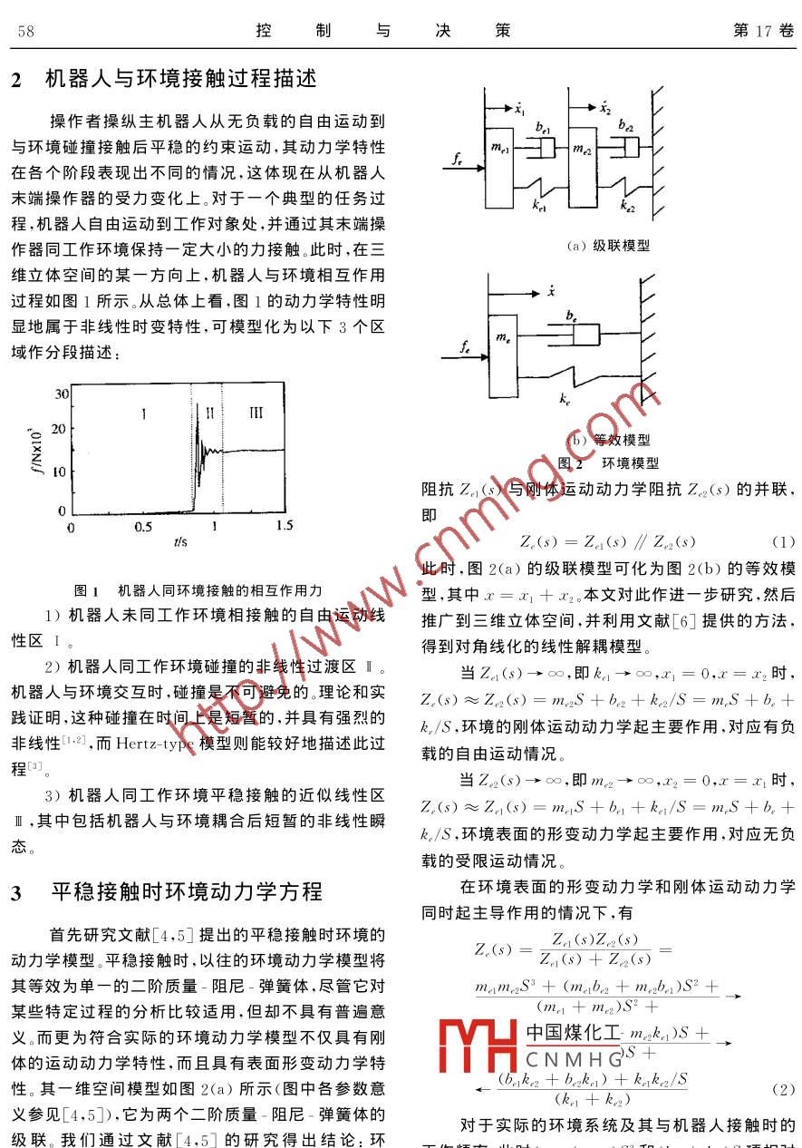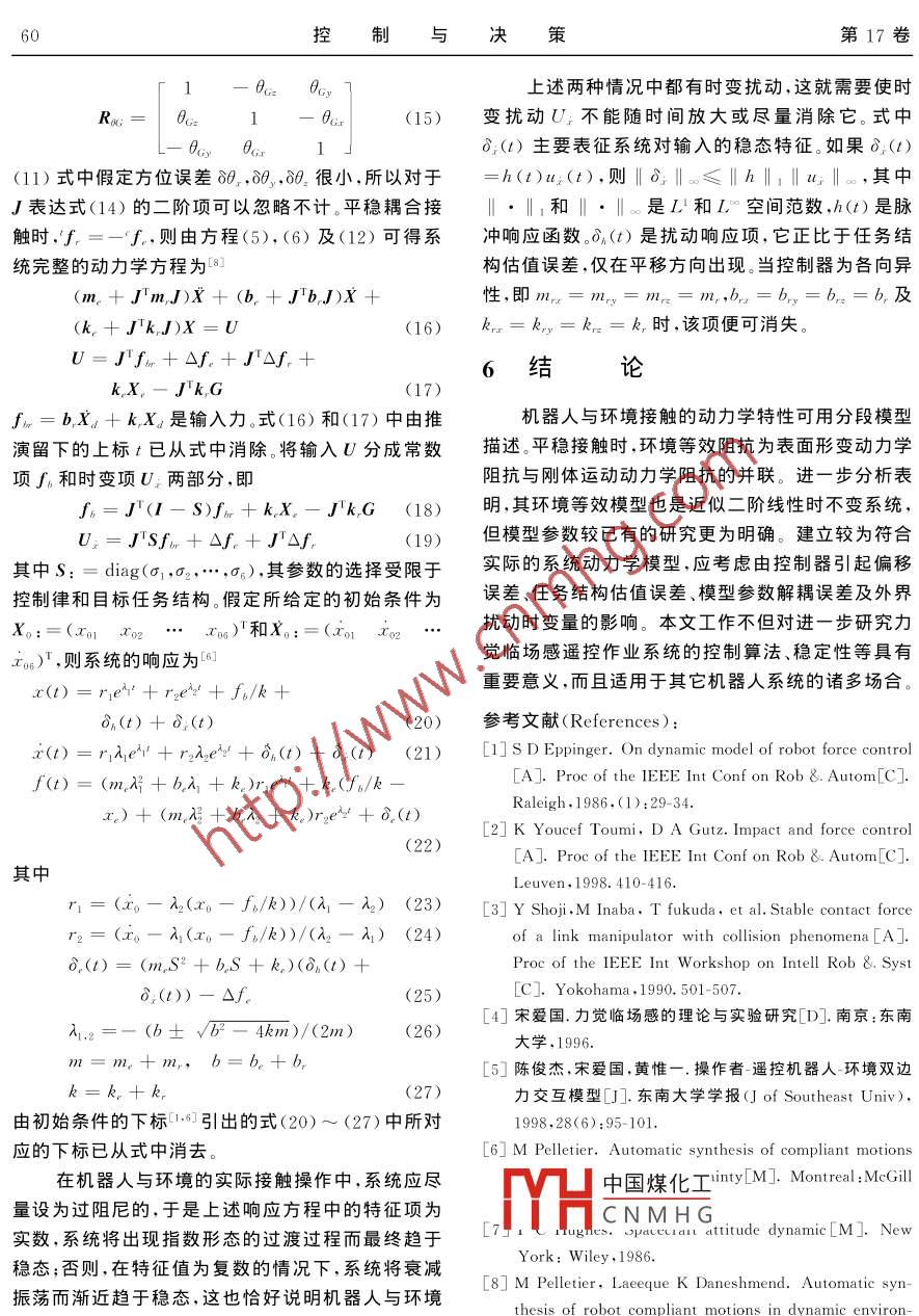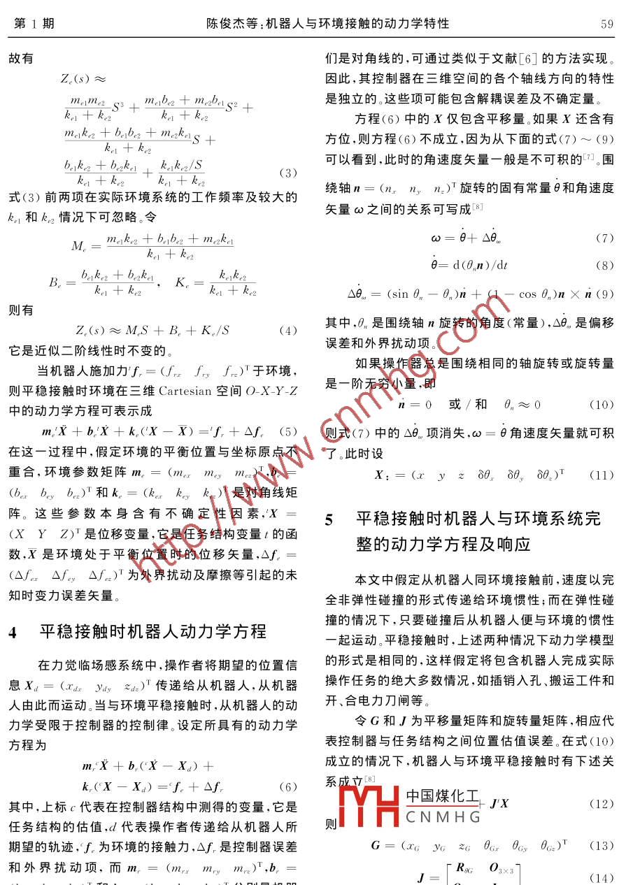 第17卷第1期控制與決策2002年1月Vol 17 No. 1Control and DecisionJan.2002文章編號:1001-0920(2002)01-0057-04機(jī)器人與環(huán)境接觸的動力學(xué)特性陳俊杰,黃惟一,宋愛國(東南大學(xué)儀器科學(xué)與工程系,江蘇南京210096)摘要:對機(jī)器人與環(huán)境接觸的動力學(xué)特性進(jìn)行分段描述,對平穩(wěn)接觸時環(huán)境的級聯(lián)等效動力學(xué)模型作了進(jìn)一步研究,在此基礎(chǔ)上描述并分析了系統(tǒng)完整的三維動力學(xué)方程及其響應(yīng)。指出更為符合實(shí)際系統(tǒng)的動力學(xué)模型,應(yīng)考慮控制器的輸出偏移、任努結(jié)構(gòu)估值和模型參數(shù)解耦誤差及外界擾動時變量關(guān)鍵詞:機(jī)器人;環(huán)境;模型;動力學(xué)特性;偏移中圖分類號:TP242文獻(xiàn)標(biāo)識碼:ADynamic character of robot gettingin touch with environmentCHEN Jun-jie, HUANG Wei-yi, SONG Ai-guoDepartment of Instrument Science and Engineering, Southeast University, Nanjing 210096, ChinaAbstract Dynaharacter of robot getting in touch with environment is described by dividisection. The series equivalent dynamic model of the environment in steady contact is further re-earched Complete three-dimensional dynamic equations of the system and their responses are anayzed. The deviations of the controller outputs, task frame estimates and de-coupled errors of the modelparameters, and time-varying values of external disturbance are taken into account to found the dynamKey words: robot; environment model; dynamic character; deviation1引言此,對從端機(jī)器人與環(huán)境接觸的動力學(xué)特性進(jìn)行分析與研究具有重要的意義。許多臨場感技術(shù)研究者在力覺臨場感遙控作業(yè)系統(tǒng)中,主端操作者通對此做了不少工作,并取得了一定的進(jìn)展。過主機(jī)器人能感受到從端機(jī)器人與環(huán)境交互的力反以往的研究在建立環(huán)境的集中參數(shù)模型上過于饋信息,那么從端機(jī)器人與環(huán)境必存在接觸作用對簡略而許多實(shí)際情況并非如此。為此,針對上述問于這種接觸影響如果不能有效地加以控制,則可能題,充分考慮到由于控制、結(jié)構(gòu)參數(shù)估計和環(huán)境不確造成整個作業(yè)系統(tǒng)工作不穩(wěn)定,并降低系統(tǒng)的操作定性及外界擾動等引起的誤差,本文作了更為切合性能,嚴(yán)重時還會使機(jī)械手以及環(huán)境造成損壞。因?qū)嵵袊夯な崭迦掌?2000-09-14;修回日期:2001-06-14CNMHG基金項目:國家自然科學(xué)基金項目(69875004);國家863高新技術(shù)項目(863-512-9805-09);教育部博士點(diǎn)基金項目(98028619)作者簡介:陳俊杰(1958-),男,江蘇南通人,副教授,博士生,從事測控技術(shù)、臨場感技術(shù)等研究;黃惟一(1933--),男,江蘇京人,教授,博士生導(dǎo)師,從事智能機(jī)器人傳感器、測試?yán)碚摷皯?yīng)用研究58控制與決策第17卷2機(jī)器人與環(huán)境接觸過程描述操作者操縱主機(jī)器人從無負(fù)載的自由運(yùn)動到與環(huán)境碰撞接觸后平穩(wěn)的約束運(yùn)動,其動力學(xué)特性在各個階段表現(xiàn)出不同的情況,這體現(xiàn)在從機(jī)器人末端操作器的受力變化上。對于一個典型的任務(wù)過程,機(jī)器人自由運(yùn)動到工作對象處,并通過其末端操作器同工作環(huán)境保持一定大小的力接觸。此時,在三(a)級聯(lián)模型維立體空間的某一方向上,機(jī)器人與環(huán)境相互作用過程如圖1所示。從總體上看,圖1的動力學(xué)特性明x顯地屬于非線性時變特性,可模型化為以下3個區(qū)m二域作分段描述kHlⅢ(b)等效模型圖2環(huán)境模型阻抗Z1(s)與剛體運(yùn)動動力學(xué)阻抗Z2()的并聯(lián)0即0.5Z.(s)=Z(s)∥Z2(s)(1)此時,圖2(a)的級聯(lián)模型可化為圖2(b)的等效模圖1機(jī)器人同環(huán)境接觸的相互作用力型,其中x=x1+x2。本文對此作進(jìn)一步研究,然后1)機(jī)器人未同工作環(huán)境相接觸的自由運(yùn)動線推廣到三維立體空間并利用文獻(xiàn)[6]提供的方法性區(qū)得到對角線化的線性解耦模型。2)機(jī)器人同工作環(huán)境碰撞的非線性過渡區(qū)當(dāng)Z(s)→∞,即k1→∞,x1=0,x=x2時機(jī)器人與環(huán)境交互時碰撞是不可避免的理論和實(shí)2()≈z2(s)=mnS+b2+k2S=m,S+b+踐證明,這種碰撞在時間上是短暫的,并具有強(qiáng)烈的k,/S,環(huán)境的剛體運(yùn)動動力學(xué)起主要作用,對應(yīng)有負(fù)非線性,而Hertκ-type模型則能較好地描述此過載的自由運(yùn)動情況。程31當(dāng)Z2(s)→∞,即m2→時3)機(jī)器人同工作環(huán)境平穩(wěn)接觸的近似線性區(qū)Ze(s)Ze(s)=mes+betke/s=ms+be+Ⅲ,其中包括機(jī)器人與環(huán)境耦合后短暫的非線性瞬k/S,環(huán)境表面的形變動力學(xué)起主要作用,對應(yīng)無負(fù)態(tài)載的受限運(yùn)動情況。3平穩(wěn)接觸時環(huán)境動力學(xué)方程在環(huán)境表面的形變動力學(xué)和剛體運(yùn)動動力學(xué)同時起主導(dǎo)作用的情況下,有首先研究文獻(xiàn)匚4,5]提岀的平穩(wěn)接觸時環(huán)境的Z(s)Z,(s)動力學(xué)模型。平穩(wěn)接觸時,以往的環(huán)境動力學(xué)模型將Z(s)Z,1(s)+Z(s)其等效為單一的二階質(zhì)量-阻尼-彈簧體,盡管它對某些特定過程的分析比較適用,但卻不具有普遍意(mn+m2)S2+而更為符合實(shí)際的環(huán)境動力學(xué)模型不僅具有剛中國煤化工m2kn)S+體的運(yùn)動動力學(xué)特性,而且具有表面形變動力學(xué)特CNMHG