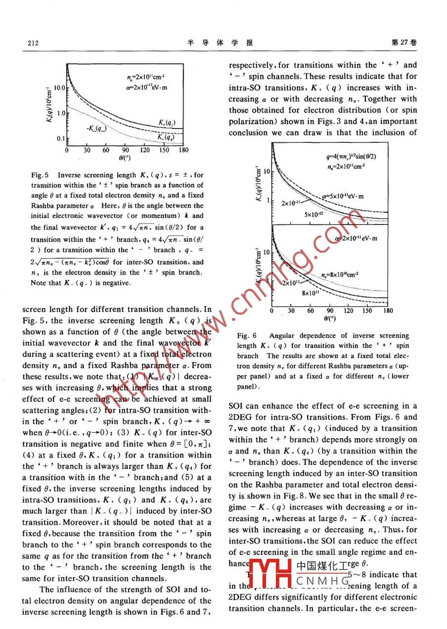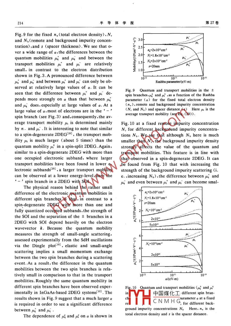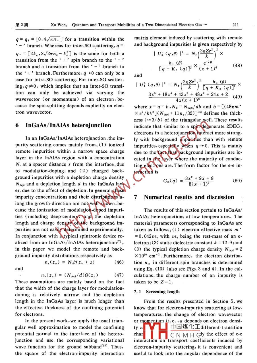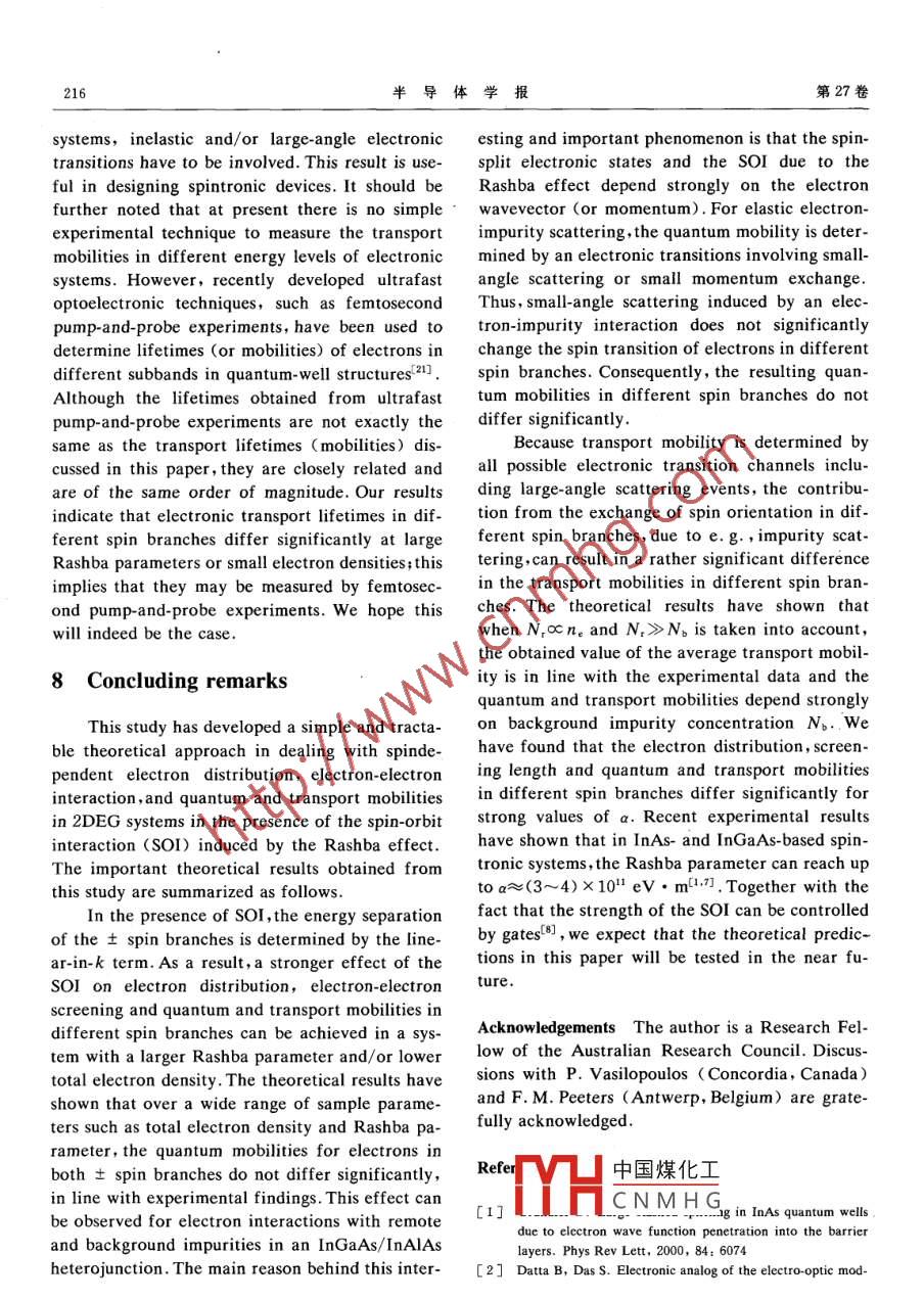 第27卷第2期半導(dǎo)體學(xué)報(bào)Vol.27 No.22006年2月CHINESE JOURNAL OF SEMICONDUCTORSFeb. ,2006Quantum and Transport Mobilities of a Two-Dimensional ElectronGas in the Presence of the Rashba Spin-Orbit InteractionXu Wen-.2,↑(1 Deparlment of Theoretical Physics, Research School of Physical Sciences and Engineering ,Australian National Universiy, Canberra ACT 0200, Australia)(2 Institute of Solid State Physis, Chinese Academy of Sciences, Hefei 230031, China)Abstract: A systematic theoretical approach is developed to study the electronic and transport properties of a two-dimensional electron gas (2DEG) in the presence of spin-orbit interactions induced by the Rashba effect. Thestandard random- phase approximation is employed to calculate the screening length caused by electron-electron in-teraction in different transition channels. The quantum and transport mobilities in different spin branches are eval-uated using the momentum- balance equation derived from the Boltzmann equation,in which the electron interac-tions with both the remote and background impurities are taken into account in an InAlAs/ InGaAs heterojunctionat low-temperatures.Key words: InGaAs/ InAlAs HEMT; 2D modeling and simulation; polarization charges; quantum effectsPACC: 7200; 7110CCLC number: 047Document code: AArticle D: 0253-4177(2006)02-0204-14magnetic-field, such as InAs- and InGaAs-based1 Introductiontwo-dimensional electron gases ( 2DEGs)[1,has .led to recent proposals dealing with advancedIn recent years ,the investigation of spin po-electronic devices such as spin-transistorsl,spin-larized electronic systems has become a fast-grow-filters[3] ,and spin-waveguides(4]. It is known thatng research field in condensed matter physics andin narrow-gap semiconductor nanostructures suchsemiconductor electronics, owing to the interest-as quantum wells, the zero-magnetic-field spinng physics behind them and to important devicesplitting (or spontaneous spin spltting) of theapplications. It has been realized that spin-elec-carriers can be achieved by the inversion asymme-tronic ( or spintronic) systems and devices can betry of the microscopic confining potential due torealized on the basis of diluted magnetic semicon-the presence of the heterojunction5J . This corre-ductors and narrow-gap semiconductor nanostruc-sponds to an inhomogeneous surface electric fieldtures. In the former case , the spin-orbit interactionand , hence , is electrically equivalent to the Rashba(SOI) is achieved in the presence of an externalspin-spltting or Rashba effectf6]. The publishedmagnetic field, and devices can be operated evenexperimental results-7,8] have indicated that inat room-temperature. In the latter case,the SOI isInAs- and InGaAs-based 2DEG systems, the spon-introduced due to the innate features of the mate-taneous spin splitting is mainly induced by therial systems, and a strong spin polarization caRashba effect ( with an SU(2) symmetry) whichnormally be achieved at relatively low-tempera-can be enhanced further with increasing the gatetures. At present ,one important aspect in the fieldvoltage applied. Other contributions such as theof spintronics is the study of electronic systemsDresselhaus term (with an SU(1, 1) symmetry)with a finite spin-splitting realized from narrow-are relatively weak, because they come mainlygap semiconductor nanostructures in the absencefrom the bulk- inversion asymmetry of the materi-of an external magnetic field. The progress madealL9中國(guó)煤化工ength of the Rash-in realizing spin-split electron gas systems at zero-baTresponding SOI inHHCNMHG↑Corresponding author. Email: wen105@ rsphysse. anu. edu. auReceived 17 October 2005⑥2006 Chinese Institute of Electronics第2期Xu Wen: Quantum and Transport Mobilities of a Two-Dimensional Electron Gas ...205these systems can be controlled artificially by ap-tion[1,5] . Including the lowest order of the SOI in-plying a gate voltagel7.8], changing the sampleduced by the Rashba effect, the single-electrongrowth parameters[1o] ,etc.Hamiltonian is given, in the absence of electronicIn order to apply spintronic systems as elec-scattering centers,bytronic devices such as spin-transistors,it is of fun-damental importance to study the effect of SOI onHo=P+°(σXp)z+U(z)(1)the electronic and transport properties of thesenovel systems. At present,one of the most power-where p =(px,p,) is the momentum operator inful and most popularly used experimental tech-which px= - iha/ax,m' is the electron effectiveniques to identify the Rashba spin splitting ismass, U (z) is the confining potential energymagneto-transport measurement carried out inalong the growth-direction, and a is the Rashbaquantized magnetic fields and low-temperatures atparameter which measures the strength of thewhich the Shubnikov-de Hass (SdH) oscillationsspin-orbit coupling. Due to the Pauli spin matricesσ= (σx ,, ,σz) ,this Hamiltonian is a 2x2 matrix.are observable1.8.10~12) . From the periodicity, am-plitude, and profile of the SdH oscillations, theFurthermore, this Hamiltonian suggests that thedensity and quantum mobility (or lifetime) in dif-SOI induced by the Rashba effect does not affectferent spin branches ,together with the Rashbathe electronic states along the growth direction.parameter, can be determined experimentally.The solutions of the corresponding SchrodingerThese techniques are akin to those employed inequation are readily obtained4] as .the investigation of spin-degenerate 2DEGs in theWan(R)=|σ,k,n)= ()e"ψ,(z) (2) .2\ isepresence of more than one occupied electronicsubbandC13,14] . It has been observed experimentallywhere k= (kx,k,) is the electron wavevector alongthat in InAs- and' InGaAs-based spintronic sys-the 2D plane,R= (r,z)= (x,y,z),中is the angletems, although the electron densities can differbetween k and the x-axis, and σ=土1 refers tosignificantly in different spin branches[10~12] ,thedifferent spin branches in k-space. The corre-quantum mob