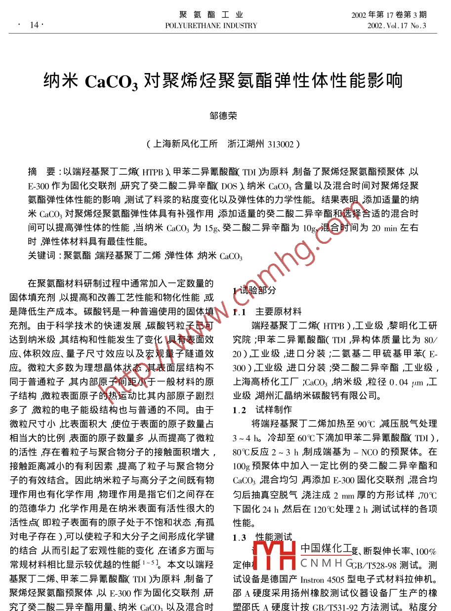 聚氨酯工業(yè)002年第17卷第3期14POLYURETHANE INDUSTRY2002.Vol.17No.3納米CaCO3對聚烯烴聚氨酯彈性體性能影響鄒德榮上海新風化工所浙江湖州313002)摘要:以端羥基聚丁二爔HIPBλ甲苯二異氰酸釀T)為原料制備了聚烯烴聚氨酯預聚體以E-300作為固化交聯(lián)劑研究了癸二酸二異辛DOS納米CaCO3含量以及混合時間對聚烯烴聚氨酯彈性體性能的影響測試了料漿的粘度變化以及彈性體的力學性能。結(jié)果表明添加適量的納米CaCO3對聚烯烴聚氨酯彈性體具有補強作用添加適量的癸二酸二異辛酯和選擇合適的混合時間可以提高彈性體的性能,當納米CaCO3為15g癸二酸二異辛酯為10g混合時間為20min左右時彈性體材料具有最佳性能。關(guān)鍵詞:聚氨酯端羥基聚丁二烯彈性體納米CaCO3在聚氨酯材料研制過程中通常加入一定數(shù)量的固體填充劑以提高和改善工藝性能和物化性能或1試驗部分是降低生產(chǎn)成本。碳酸鈣是一種普遍使用的固體填1.1主要原材料充劑。由于科學技術(shù)的快速發(fā)展碳酸鈣粒子已可端羥基聚丁二烯(HPB),工業(yè)級黎明化工研達到納米級其結(jié)構(gòu)和性能發(fā)生了變化具有表面效究院呷苯二異氰酸酯(TD,異構(gòu)體質(zhì)量比為80應、體積效應、量子尺寸效應以及宏觀量子隧道效20)工業(yè)級,進口分裝;二氨基二甲硫基甲苯(E-應。微粒大多數(shù)為理想晶體狀態(tài)其表面層結(jié)構(gòu)不300)工業(yè)級進口分裝淡二酸二異辛酯工業(yè)級,同于普通粒子其內(nèi)部原子間距小于一般材料的原上海高橋化工廠:CaCO3納米級粒徑0.04m江工子結(jié)構(gòu)微粒表面原子的熱運動比其內(nèi)部原子劇烈業(yè)級湖州匯晶納米碳酸鈣有限公司。多了微粒的電子能級結(jié)構(gòu)也與普通的不同。由于1.2試樣制作微粒尺寸小比表面積大使位于表面的原子數(shù)量占將端羥基聚丁二烯加熱至90℃減壓脫氣處理相當大的比例表面的原子數(shù)量多從而提高了微粒3~4h。冷卻至60℃下滴加甲苯二異氰酸(TDI),的活性存在著粒子與聚合物分子的接觸面積增大,80℃反應2~3h制成端基為-NCO的預聚體。在接觸距離減小的有利因素提高了粒子與聚合物分100g預聚體中加入一定比例的癸二酸二異辛酯和子的有效結(jié)合。因此納米粒子與高分子之間既有物GaCO3混合均勻再添加E-300固化交聯(lián)劑混合均理作用也有化學作用物理作用是指它們之間存在勻后抽真空脫氣澆注成2m厚的方形試樣,70℃的范德華力北學作用是在納米表面有活性很大的下固化24h然后在120℃處理2h測試試樣的各項活性點即粒子表面有的原子處于不飽和狀態(tài)有孤性能。對電子存在)可以使粒子和大分子之間形成化學鍵1.3性能測試的結(jié)合從而引起了宏觀性能的變化在諸多方面與中國煤化工度、斷裂伸長率、100%常規(guī)材料相比顯示較優(yōu)越的性能1-5。本文以端羥定伸CNMHGGB/T52898測試。測基聚丁二烯、甲苯二異氰酸(T)為原料制備了試設(shè)備是德國產(chǎn) Instron4505型電子式材料拉伸機。聚烯烴聚氨酯預聚體以Σ-300作為固化交聯(lián)劑研邵A硬度采用揚州橡膠測試儀器設(shè)備廠生產(chǎn)的橡究了癸二酸二異辛酯用量、納米CaCO3以及混合時塑邵氏A硬度計按GB/T531-92方法測試。粘度分間對聚烯烴聚氨酯彈性體性能的影響。析的恒溫水浴溫度為25℃,每隔一定時間作一次測第3期鄒德榮納米CaCO3對聚烯烴聚氨酯彈性體性能影響試記錄粘度測試儀器采用日產(chǎn) Viscosimeter bh型防止凝膠保證具有足夠長的澆注時間,采用二步轉(zhuǎn)子粘度計。法即先將預聚體與納米CaCO3混合然后再與固化2結(jié)果與討論劑E-300進行混合。表1是混合時間對聚烯烴聚氨酯彈性體性能影響的測試結(jié)果。2.1混合時間對聚烯烴聚氨酯彈性體性能影響表1混合時間對聚烯烴聚氨酯彈性體性能影響般來說納米CaCO3粒子在聚合物中的微觀結(jié)構(gòu)分為三種:CaCO3粒子在聚合物中形成鏈式的拉伸強度/MPa3.14.75.96.I6.I第二聚集態(tài)在這種情況下如果結(jié)合的比較好會斷裂伸長率/%160260340350350有很好的增強效果,CaCO3粒子如同剛性鏈條一樣彈性模量/MPa1.891.861.871.841.87100%定伸模量/MPa1.000.971.010.980.99對聚合物起到增強作用;CaCO3粒子以無規(guī)的分散邵A硬度狀態(tài)存在有的聚集成團有的個別分散這種分散密度形式既不能增強也不能增韌zaCO3粒子比較均勻注表中的配方為預聚體100g納米GaCO315g癸二酸二異辛地分散在基體中在這種情況下無論是否具有良好10g混合時間是指預聚體與納米aC0的混合時間的界面結(jié)合都會產(chǎn)生明顯的增強、增韌效果。在研由表1的測試結(jié)果可知采用二步法進行混合究中解決aCO3粒子均勻分散問題是發(fā)揮潛能的隨著混合時間的增加聚烯烴聚氨酯彈性體的拉伸關(guān)鍵問題。由于納米CaCO3粒子的超細化其晶體強度、斷裂伸長率增加而彈性模量、100%定伸模結(jié)構(gòu)和表面電子結(jié)構(gòu)發(fā)生了變化納米材料的比表量、邵A硬度、密度基本沒有變化,說明納米CaCO面積大表面能高內(nèi)聚吸附作用很強難以均勻分在預聚體中的均勻度得到提高當混合時間大于20布、分散而且CaCO3粒子表面層內(nèi)含有的官能團帶min時拉伸強度斷裂伸長率的測試值趨于平衡,有電荷決定了粒子表面電性而電荷類型以及大小說明納米GCO2在預聚體中的均勻度達到極限?;煊绊懥W又g的靜電作用