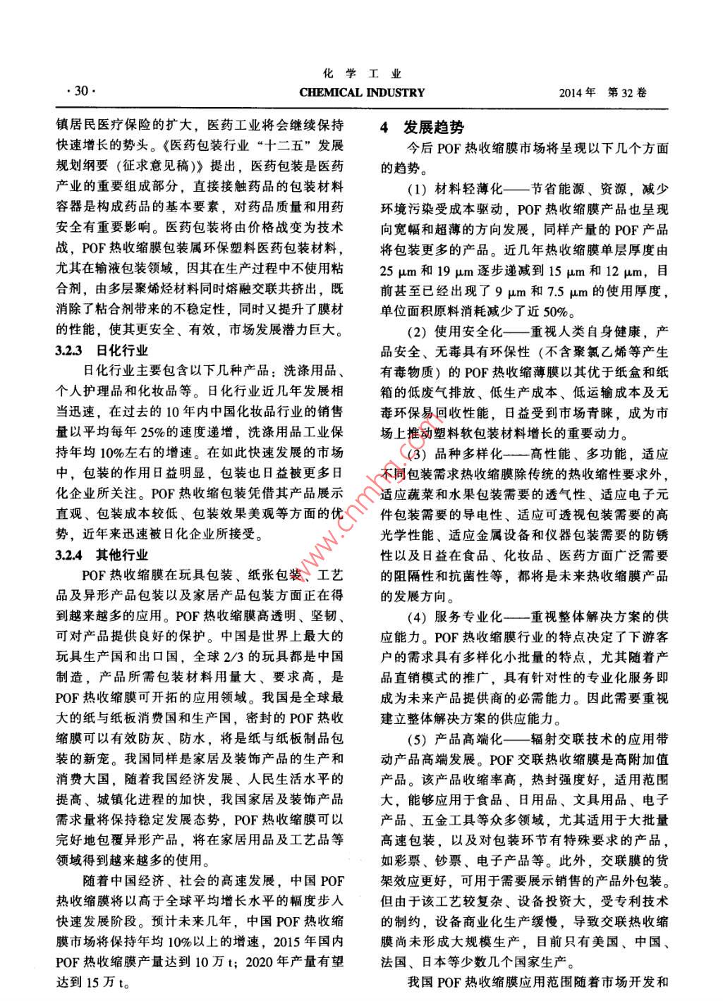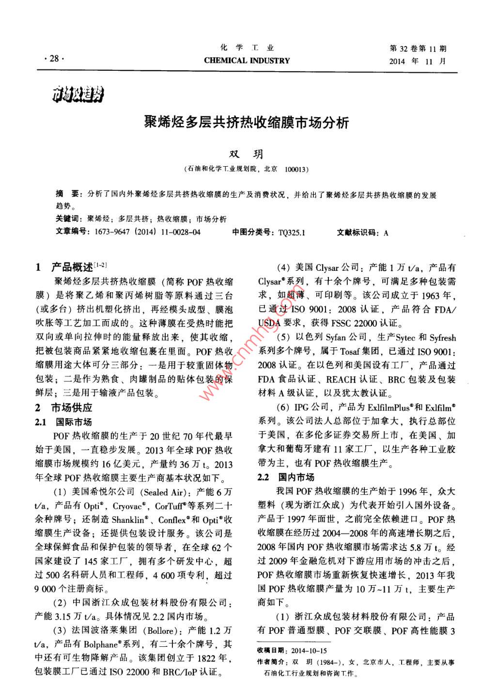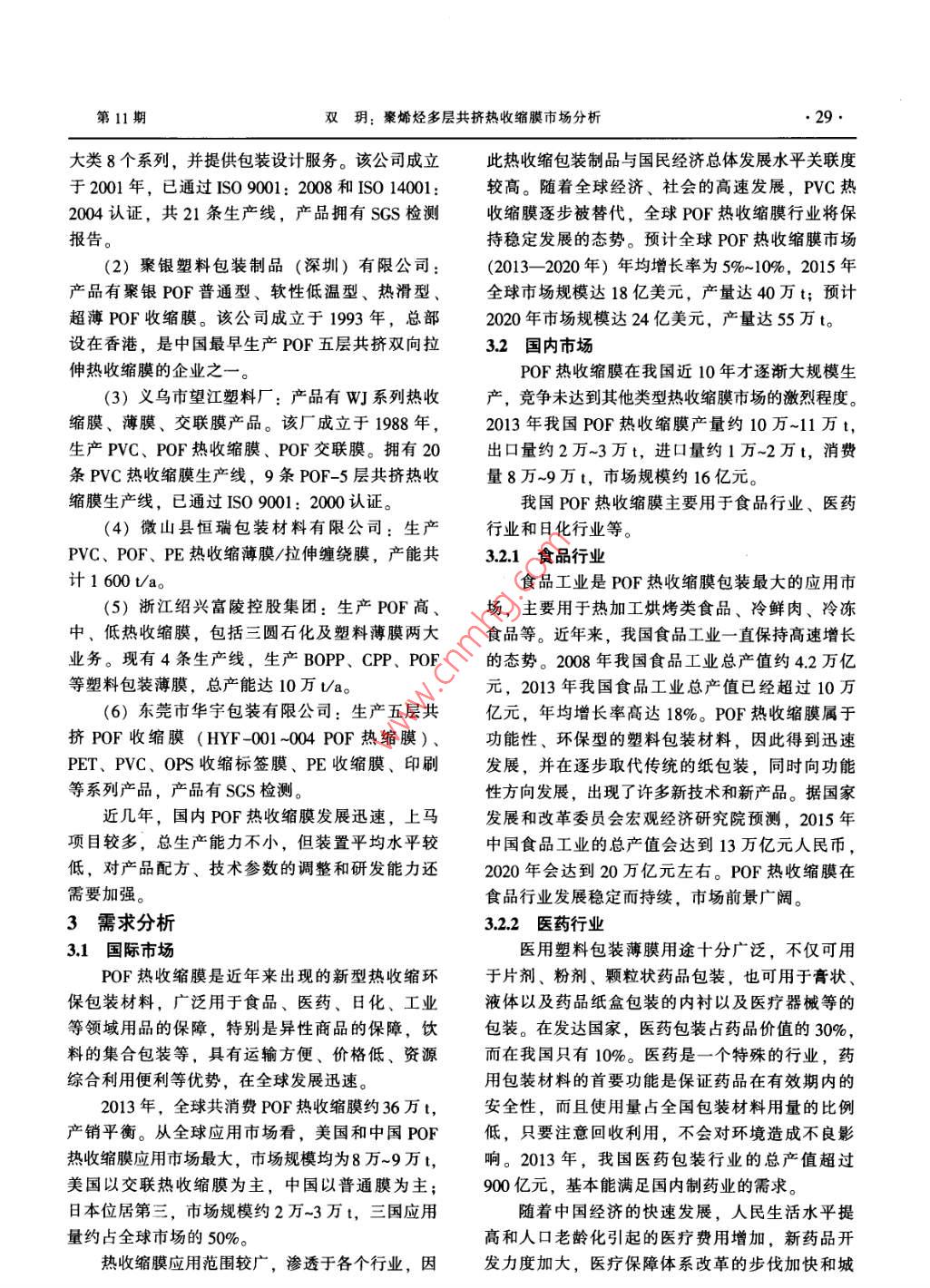 化學(xué)工業(yè)第32卷第11期●28●CHEMICAL INDUSTRY2014年11月市打及趨勢(shì)聚烯烴多層共擠熱收縮膜市場(chǎng)分析雙玥(石油和化學(xué)工業(yè)規(guī)劃院,北京100013)摘要:分析了國(guó)內(nèi)外聚烯烴多層共擠熱收編膜的生產(chǎn)及消費(fèi)狀況,并給出了聚烯烴多層共擠熱收縮膜的發(fā)展趨勢(shì)。關(guān)鍵詞:聚烯烴;多層共擠;熱收縮膜;市場(chǎng)分析文章編號(hào): 1673-9647 (2014) 11-0028-04中圖分類號(hào): TQ325.1文獻(xiàn)標(biāo)識(shí)碼: A1產(chǎn) 品概述1[12)(4)美國(guó)Clysar公司:產(chǎn)能1萬(wàn)V/a,產(chǎn)品有聚烯烴多層共擠熱收縮膜( 簡(jiǎn)稱POF熱收縮Clysar°系列,有十余個(gè)牌號(hào),可滿足多種包裝需膜)是將聚乙烯和聚丙烯樹(shù)脂等原料通過(guò)三臺(tái)求,如超薄、可印刷等。該公司成立于1963年,(或多臺(tái))擠出機(jī)塑化擠出,再經(jīng)模頭成型、膜泡已通過(guò)ISO 9001: 2008 認(rèn)證,產(chǎn)品符合FDA/吹脹等工藝加工而成的。這種薄膜在受熱時(shí)能把USDA要求,獲得FSSC 22000認(rèn)證。雙向或單向拉伸時(shí)的能量釋放出來(lái),使其收縮,(5)以色列Syfan公司,生產(chǎn)Sytec 和Syfresh把被包裝商品緊緊地收縮包裹在里面。POF熱收系列多個(gè)牌號(hào),屬于Tosaf集團(tuán),已通過(guò)ISO 9001:縮膜用途大體可分三部分:一是用于較重固體物2008認(rèn)證。在以色列和美國(guó)設(shè)有工廠,產(chǎn)品通過(guò)包裝;二是作為熟食、肉罐制品的貼體包裝的保FDA食品認(rèn)證、REACH認(rèn)證、BRC包裝及包裝鮮層;三是用于輸液產(chǎn)品包裝。材料A級(jí)認(rèn)證,以及猶太教認(rèn)證。2市場(chǎng)供應(yīng)(6) IPG 公司,產(chǎn)品為ExfilmPlus*和Exfilm*2.1 國(guó)際市場(chǎng)系列。該公司法人總部位于加拿大,執(zhí)行總部位POF熱收縮膜的生產(chǎn)于20世紀(jì)70年代最早于美國(guó),在多倫多證券交易所上市,在美國(guó)、加始于美國(guó),一直穩(wěn)步發(fā)展。2013 年全球POF熱收拿大和葡萄牙建有11家工廠,以生產(chǎn)各種工業(yè)膠縮膜市場(chǎng)規(guī)模約16億美元,產(chǎn)量約36萬(wàn)t。2013帶為主,也有POF熱收縮膜生產(chǎn)。年全球POF熱收縮膜主要生產(chǎn)商基本狀況如下。2.2國(guó)內(nèi)市場(chǎng)(1)美國(guó)希悅爾公司(Sealed Air): 產(chǎn)能6萬(wàn)我國(guó)POF熱收縮膜的生產(chǎn)始于1996年,眾大t/a,產(chǎn)品有Opti*, Cryovac, CorTuff等系列二十塑料(現(xiàn)為浙江眾成)為代表開(kāi)始引入國(guó)外設(shè)備。余種牌號(hào);還制造Shanklin、Conflex" 和Opti°收產(chǎn)品于1997年面世,之前完全依賴進(jìn)口。POF熱縮膜生產(chǎn)設(shè)備;還提供包裝設(shè)計(jì)服務(wù)。該公司是收縮膜在經(jīng)歷過(guò)2004- -2008 年的高速增長(zhǎng)期之后,全球保鮮食品和保護(hù)包裝的領(lǐng)導(dǎo)者,在全球62個(gè)2008年國(guó)內(nèi)POF熱收縮膜市場(chǎng)需求達(dá)5.8萬(wàn)t。經(jīng)國(guó)家建設(shè)了145家工廠,擁有多個(gè)研發(fā)中心,超過(guò)2009年金融危機(jī)對(duì)下游應(yīng)用市場(chǎng)的沖擊之后,過(guò)500名科研人員和工程師,4 600項(xiàng)專利,超過(guò)POF熱收縮膜市場(chǎng)重新恢復(fù)快速增長(zhǎng),2013 年我9000個(gè)注冊(cè)商標(biāo)。國(guó)POF熱收縮膜產(chǎn)量為10萬(wàn)~11萬(wàn)t,主要生產(chǎn)(2)中國(guó)浙江眾成包裝材料股份有限公司:商如下。產(chǎn)能3.15萬(wàn)t/a。具體情況見(jiàn)2.2國(guó)內(nèi)市場(chǎng)。(1)浙江眾成包裝材料股份有限公司:產(chǎn)品(3) 法國(guó)波洛萊集團(tuán)(Bollore): 產(chǎn)能1.2萬(wàn)有POF普通型膜、POF交聯(lián)膜、POF高性能膜3Va,產(chǎn)品有Bolphane" 系列,有二十余個(gè)牌號(hào),其收稿日期: 2014-10-15中還有可生物降解產(chǎn)品。該集團(tuán)創(chuàng)立于1822年,作者簡(jiǎn)介:雙玥(1984-),女,北京市人,工程師,主要從事包裝膜工廠已通過(guò)ISO 22000和BRC/IoP認(rèn)證。石油化工行業(yè)規(guī)劃和咨詢T.作。第11期雙玥: 聚烯烴多層共擠熱收縮膜市場(chǎng)分析. 29.大類8個(gè)系列,并提供包裝設(shè)計(jì)服務(wù)。該公司成立此熱收縮包裝制品與國(guó)民經(jīng)濟(jì)總體發(fā)展水平關(guān)聯(lián)度于2001年,已通過(guò)Iso 9001: 2008和ISO 14001:較高。隨著全球經(jīng)濟(jì)、社會(huì)的高速發(fā)展,PVC 熱2004認(rèn)證,共21條生產(chǎn)線,產(chǎn)品擁有SGS檢測(cè)收縮膜逐步被替代,全球POF熱收縮膜行業(yè)將保報(bào)告。持穩(wěn)定發(fā)展的態(tài)勢(shì)。預(yù)計(jì)全球POF熱收縮膜市場(chǎng)(2)聚銀塑料包裝制品(深圳) 有限公司:(2013- -2020 年)年均增長(zhǎng)率為5%~10%,2015 年產(chǎn)品有聚銀POF普通型、軟性低溫型、熱滑型、全球市場(chǎng)規(guī)模達(dá)18億美元,產(chǎn)量達(dá)40萬(wàn)t;預(yù)計(jì).超薄POF收縮膜。該公司成立于1993年,總部2020年市場(chǎng)規(guī)模達(dá)24億美元,產(chǎn)量達(dá)55萬(wàn)t。設(shè)在香港,是中國(guó)最早生產(chǎn)POF五層共擠雙向拉3.2國(guó)內(nèi)市場(chǎng)伸熱收縮膜的企業(yè)之- - 。POF熱收縮膜在我國(guó)近10年才逐漸大規(guī)模生(3)義烏市望江塑料廠:產(chǎn)品有WJ系列熱收產(chǎn),競(jìng)爭(zhēng)未達(dá)到其他類型熱收縮膜市場(chǎng)的激烈程度??s膜、薄膜、交聯(lián)膜產(chǎn)品。該廠成立于1988 年,2013年我國(guó)POF熱收縮膜