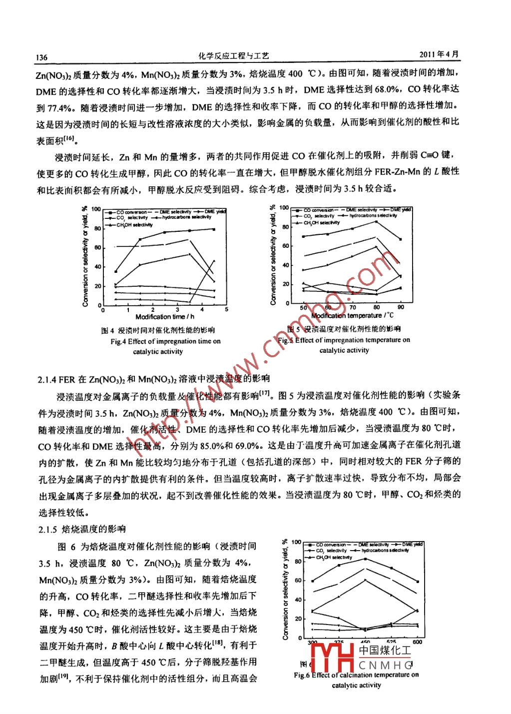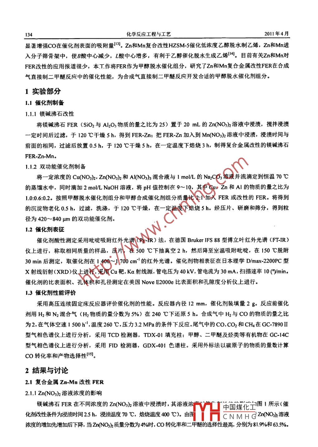 第27卷第2期化學(xué)反應(yīng)T程與T藝Vol 27. No 22011年4月Chemical Reaction Engineering and TechnoloApr.2011文罩編號(hào):1001-7631(2011)02-013306復(fù)合金屬改性鎂堿沸石在合成氣制二甲醚中的應(yīng)用張海燕,郝治富,吳瑋,寧英男,毛國(guó)梁(東北石油大學(xué)化學(xué)化工學(xué)院石油與天然氣化工省重點(diǎn)實(shí)驗(yàn)室,黑龍江大慶163318)摘要:采用沒(méi)淡法對(duì)鋏堿沸石(FER)進(jìn)行了Zn-Mn復(fù)合金屬改性,將改性后的FER作為合成氣直接制二甲醚做化劑的甲醉脫水組分,制備出了Cu- Zn-Al/FER-Zn-Mn雙功能催化劑,在連續(xù)定床高版反應(yīng)器中,考察了改性條件對(duì)俳化劑性能的影響。采川吡啶吸附紅外光譜(PyJR)和X射線們射(XRD)對(duì)改性前后的俐化劑進(jìn)行表征,并測(cè)足了催化劑的比表向積、孔體積及孔徑。結(jié)果表明,當(dāng)Zn(NOh質(zhì)量分?jǐn)?shù)為4%,Mn(NO1)2質(zhì)量分?jǐn)?shù)為3%,改性沒(méi)吋間35h,沒(méi)旗溫度80℃和焙燒溫度450℃時(shí), Cu-Zn-Al/FER-Zn-Mn催化劑的催化效果較好,在反應(yīng)溫度260℃、反應(yīng)壓力32MPa、空速1500h4和H2與CO物質(zhì)的量之比為2的條件下,CO的轉(zhuǎn)化率為830%,甲醚選擇性為730%,催化劑性能優(yōu)于改性前的FER關(guān)鍵詞:合成氣二甲醚鎂堿沸石硝酸鋅硝酸錳浸漬法金屬改性中圖分類號(hào):TQ426;TQ223.2文獻(xiàn)標(biāo)識(shí)碼:A二甲醚(DME)作為清潔的替代燃料在國(guó)內(nèi)外得到廣泛的關(guān)注和應(yīng)用,如以二甲醚作為汽車(chē)燃料和以二甲醚替代液化氣作為民用燃料等山,并在工業(yè)窯爐、金屬切割、工業(yè)鍋爐燃料方面也已得到應(yīng)用1。目前合成二甲醚的主要技術(shù)路線是合成氣、二氧化碳及生物質(zhì)氣一步合成法4。一步法是利用既有甲醇合成催化功能又有甲醇脫水催化功能的雙功能催化劑把原料直接轉(zhuǎn)化成二甲醚。以二氧化碳為原料合成二甲醚,其轉(zhuǎn)化率和選擇性比較低,而以生物質(zhì)氣為原料的合成工藝涉及的單元過(guò)程比較多,且其中所含的少量焦油和其他污染物會(huì)造成催化劑失活阿,所以以合成氣為原料一步法合成二甲醚成為研究熱點(diǎn)。以合成氣為原料一步法合成二甲醚的關(guān)鍵是雙功能催化劑,催化劑中甲醇合成催化劑組分主要為CuznAl,甲醇脫水催化劑組分主要以固體酸為主,研究較多的是Al2O3和HzSM5。yA1O3具有比表面積大、穩(wěn)定性好等特點(diǎn),但由于表面分布的多為L(zhǎng)酸位,總酸性較低,因此在合成二甲醚催化反應(yīng)中的催化性能較低,因此需要增加酸的數(shù)量和強(qiáng)度,以提高催化劑活性3。HZSM5的酸性比較強(qiáng),催化活性高,但易生成烷烯烴,且易積炭失活,需通過(guò)改善其酸性,以提高二甲醚的選擇性用于甲醇脫水催化劑組分的還有Y型,SAPO和HMCM22等分子篩,但這些固體酸有的催化活性較低,有的穩(wěn)定性較差,因此研究者們期望通過(guò)對(duì)其進(jìn)行改性以獲得較好的催化性能間!選擇合適的固體酸與銅基催化劑組分匹配,使之具有較好的協(xié)同效應(yīng)是雙功能催化劑研究中需要解決的問(wèn)題,而鎂堿沸石(FER)相對(duì)于HZSM5具有較高比表面積,較好的化學(xué)和熱力學(xué)穩(wěn)定性,可塑性強(qiáng),易于修飾和改性。Sa等2研究發(fā)現(xiàn),FER作為雙功能催化劑的脫水組分,更有利于銅基催化劑的還原活化,且FER獨(dú)特的孔道結(jié)構(gòu)不利于分子較大的烴類副產(chǎn)物的進(jìn)出,可抑制副反應(yīng)發(fā)生。但FER酸性也比較強(qiáng),Kang等利用Zr對(duì)FER進(jìn)行改性,發(fā)現(xiàn)在負(fù)載了3%(質(zhì)量分?jǐn)?shù))zr時(shí),CO的轉(zhuǎn)化率和二甲醚的選擇性有明顯的提高,而且改變了分子篩上的酸量分布。Zn和Mn金屬離子在催化劑改性方面能表現(xiàn)出較好的協(xié)同效應(yīng)。Zn和Mn修飾合成低碳醇的CuFe催化劑,能中國(guó)煤化工收稿日期:20100g14:修訂日期:201103-30作者簡(jiǎn)介:張海燕(1957-),女,敦投,E-mi. zhining@126cmCNMHG薔金項(xiàng)目:大慶市科學(xué)技術(shù)計(jì)劃項(xiàng)H(sGG200739l34化學(xué)反應(yīng)工程與工藝2011年4月顯著增強(qiáng)CO在催化劑表面的吸附量。Zn和Mn復(fù)合改性HZSM-5催化低濃度乙醇脫水制乙烯,Zn和Mn進(jìn)入分子篩骨架中,使B酸中心減少,L酸中心增多,有利于乙醇催化脫水生成乙烯。目前有關(guān)Zn和Mn對(duì)FER改性的應(yīng)用報(bào)道很少,本T作將FER作為甲醇脫水催化組分,研究了Zn和Mn復(fù)合金屬改性FER在合成氣直接制二甲醚反應(yīng)中的催化性能,為合成氣直接制二甲醚反應(yīng)開(kāi)發(fā)合適的甲醇脫水催化劑組分。1實(shí)驗(yàn)部分1催化劑制備1.1.1鎂堿沸石改性將鎂堿沸石FER(SO2與A2O3物質(zhì)的量之比為25)置于20mL的Zn(NO)溶液中浸漬,攪拌浸潰一定時(shí)間后過(guò)濾,于120℃干燥5h,得到 FER-Zn;把 FER-Zn加入到Mn(NO)溶液中浸漬,浸漬時(shí)間與前面的相同,過(guò)濾后放置0.5h,于120℃干燥5h,在一定溫度下焙燒3h,制得復(fù)合金屬改性的鎂堿沸石FER-ZnMn。1.12雙功能催化劑制備將一定濃度的Cu(NO2h,Zn(NO)2和AQNO)3混合液與1moL的Na2CO3溶液并流滴定到恒溫70℃的蒸餾水中,同時(shí)滴加2 mol/L NaOH溶液,將pH值控制在9~10,其中Cu,zn和Al的物質(zhì)的量之比為10:06:.0,2。按照甲醇脫水催化劑組分和甲醇合成催化劑組分質(zhì)量比2:1加入FER或改性的FER。將得到