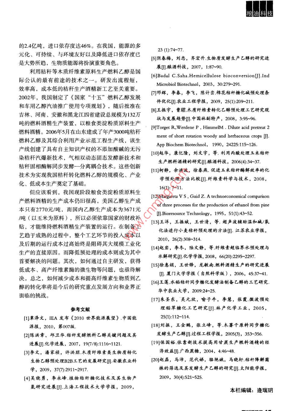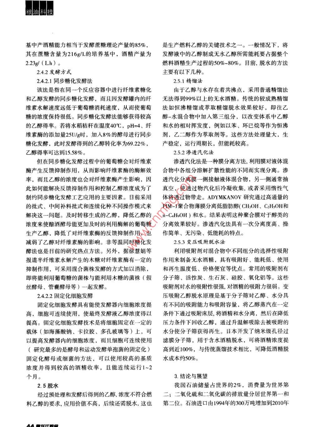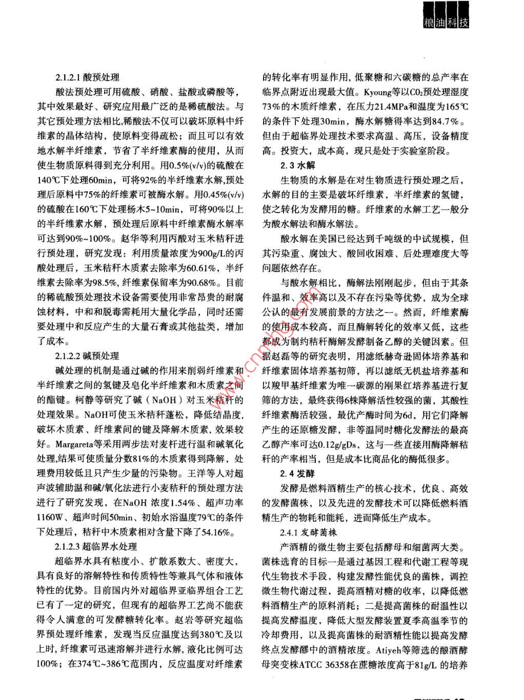 齦糧迪科技赤質(zhì)等維翥為愿樹制備乙醇的三藝楊晨陽馮哲(黑龍江糧食職業(yè)學(xué)院,黑龍江哈爾濱150080)摘要:木質(zhì)纖維素是秸稈的主要成分,將木質(zhì)纖維素轉(zhuǎn)換為清潔的可再生能源,不但可以緩解能源危機(jī),而且對環(huán)境友好。文章介紹了國內(nèi)外生物質(zhì)能制備乙醇的研究進(jìn)展,包括木質(zhì)纖維素的預(yù)處理、水解、發(fā)酵和脫水工藝,對各種工藝的優(yōu)缺點(diǎn)進(jìn)行了論述。關(guān)鍵詞:木質(zhì)纖維素;燃料乙醇;預(yù)處理;發(fā)酵能源是當(dāng)今社會賴以生存和發(fā)展的基礎(chǔ)。隨著醇生產(chǎn)的主要原料是糖質(zhì)和淀粉。2006年,美國由世界經(jīng)濟(jì)的迅速發(fā)展,傳統(tǒng)化石能源面臨短缺的危玉米淀粉生產(chǎn)乙醇的產(chǎn)量達(dá)50億加侖。然而要依靠機(jī)。據(jù)國際能源專家預(yù)言,適合于經(jīng)濟(jì)開采的石油糖質(zhì)和糧食淀粉作為原料來解決燃料問題顯然是不和天然氣資源只能再開采30~50年,煤炭儲量也僅夠現(xiàn)實(shí)的。我國是一個農(nóng)業(yè)大國,每年僅農(nóng)作物秸稈開采300年。傳統(tǒng)化石能源不但在儲量上面臨枯竭的的產(chǎn)量達(dá)7億噸,相當(dāng)于3.5億噸標(biāo)準(zhǔn)煤,這是一個問題,而且由于化石燃料所造成的環(huán)境污染也日益巨大的可再生資源。利用秸稈等木質(zhì)纖維素生物質(zhì)嚴(yán)重,大量溫室氣體排放,使氣候變曖,給環(huán)境帶生產(chǎn)乙醇,不但可緩解能源危機(jī),而且減少環(huán)境污來破壞。因此,尋找新的清潔的可再生替代能源已染,具有十分廣闊的生產(chǎn)前景。迫在眉睫生物質(zhì)能是蘊(yùn)藏在生物質(zhì)中的能量,是可再生1.木質(zhì)纖維素的能源。許多國家將生物質(zhì)能的研究擺到非常重要木質(zhì)纖維素主要由纖維素(40%~50%)、半纖的位置。如美國提出到2020年生物質(zhì)燃料油取代全維素(25%-35%)和木質(zhì)素(15%-20%)構(gòu)成,國燃油消耗量10%的目標(biāo);歐盟委員會提出到2020纖維素是由100~1000個β-D-吡喃型葡萄糖單體以年有20%的運(yùn)輸燃料由燃料乙醇等生物燃料替代。β-1,4糖苷鍵連接的直鏈多糖,多個分子平行排燃料乙醇作為能源,是生物質(zhì)能中最主要的能列成絲狀不溶性微小纖維;半纖維素主要是由木糖源之一,也是最現(xiàn)實(shí)的液體燃料用品之一。目前乙以及少量阿拉伯糖、半乳糖、甘露糖組成;而木質(zhì)梱科技素則是以苯丙烷及其衍生物為基本單位構(gòu)成的高分道說,100g甘蔗渣在加入1%的硫酸,并且水:固體子芳香族化合物。目前的研究表明,纖維素和半纖=2:1的情況下,在220℃進(jìn)行蒸汽爆破,然后進(jìn)行維素是可發(fā)酵糖的來源,纖維素和半纖維素可水解酶解,可產(chǎn)生65.1g蔗糖。為單糖,但是木質(zhì)素不能水解為單糖。一旦形成單以蒸汽爆破法預(yù)處理木質(zhì)纖維原料在進(jìn)行工業(yè)糖,微生物就可以把它們發(fā)酵生成乙醇化推廣中,存在一些缺陷。高壓作用下會產(chǎn)生對發(fā)酵微生物起抑制作用的水解產(chǎn)物。再有,經(jīng)過蒸汽2.木質(zhì)纖維素制備乙醇工藝爆破法預(yù)處理的物料需要用水進(jìn)行清洗,使得可木質(zhì)纖維素原料發(fā)酵法制備乙醇工藝流程可分溶性的半纖維組分也被清洗掉了,從而使總糖化成4步:①預(yù)處理纖維素和半纖維素,去除阻礙糖化率降低。和發(fā)酵的物質(zhì);②用酸或酶水解聚合物成單糖;③低壓無污染蒸汽爆破是近些年出現(xiàn)的一種新蒸用發(fā)酵菌發(fā)酵六碳糖和五碳糖成乙醇;④蒸餾脫水汽爆破法,該法是基于秸稈在化學(xué)組成和結(jié)構(gòu)上的獲得乙醇。差異而提出的。據(jù)陳洪章等人的報(bào)道,該技術(shù)在汽21預(yù)處理爆的過程中不需要添加任何化學(xué)藥品,只需控制秸木質(zhì)纖維素由纖維素、半纖維素和木質(zhì)素的混稈的含水量即可以分離出80%以上的半纖維素,且合物組成,它們之間存在著化學(xué)鍵、氫鍵等作用,使秸稈纖維素的酶解率達(dá)到90%以上纖維素物質(zhì)的預(yù)處理就是借助化學(xué)的、物理的方2113高能輻射法及微波法法,使纖維素與木質(zhì)素、半纖維素分離。如未經(jīng)處高能輻射法是利用高能射線(電子射線、γ射理的秸稈原料在纖維素酶過量(100FPug底物的條件線)對纖維原料進(jìn)行預(yù)處理,使纖維素聚合度和結(jié)下,直接進(jìn)行纖維素酶水解,酶解率很低,而且糖晶度降低,膨潤性增加,從而促進(jìn)纖維素的酶水得率也都在理論得率的20%以下。解,同時亦可減少溶解用或反應(yīng)用化學(xué)藥品造成的2.1.1物理預(yù)處理環(huán)境污染等。但是輻射處理的成本較高,目前還很物理預(yù)處理主要包括機(jī)械粉碎、蒸汽爆破、微難用于大規(guī)模的生產(chǎn)。波、高能輻射處理、冷凍粉碎等。21.14冷凍粉碎2.1.1.1機(jī)械粉碎冷凍粉碎法是在碎料呈凍結(jié)狀態(tài)時進(jìn)行粉碎常用的雙滾壓碎機(jī)、球磨機(jī)將天然纖維素原料般利用液氮制冷到-100℃C下后進(jìn)行粉碎,像其他物粉碎,促進(jìn)酶解。一般當(dāng)粉碎粒徑為10~30μm時,理方法一樣,木質(zhì)素仍然保留著,但木質(zhì)素和半纖纖維素酶解率達(dá)到80%以上。用該法處理后的粉末維素的結(jié)合層被破壞,這樣也增加了酶對纖維素的纖維素類物質(zhì)