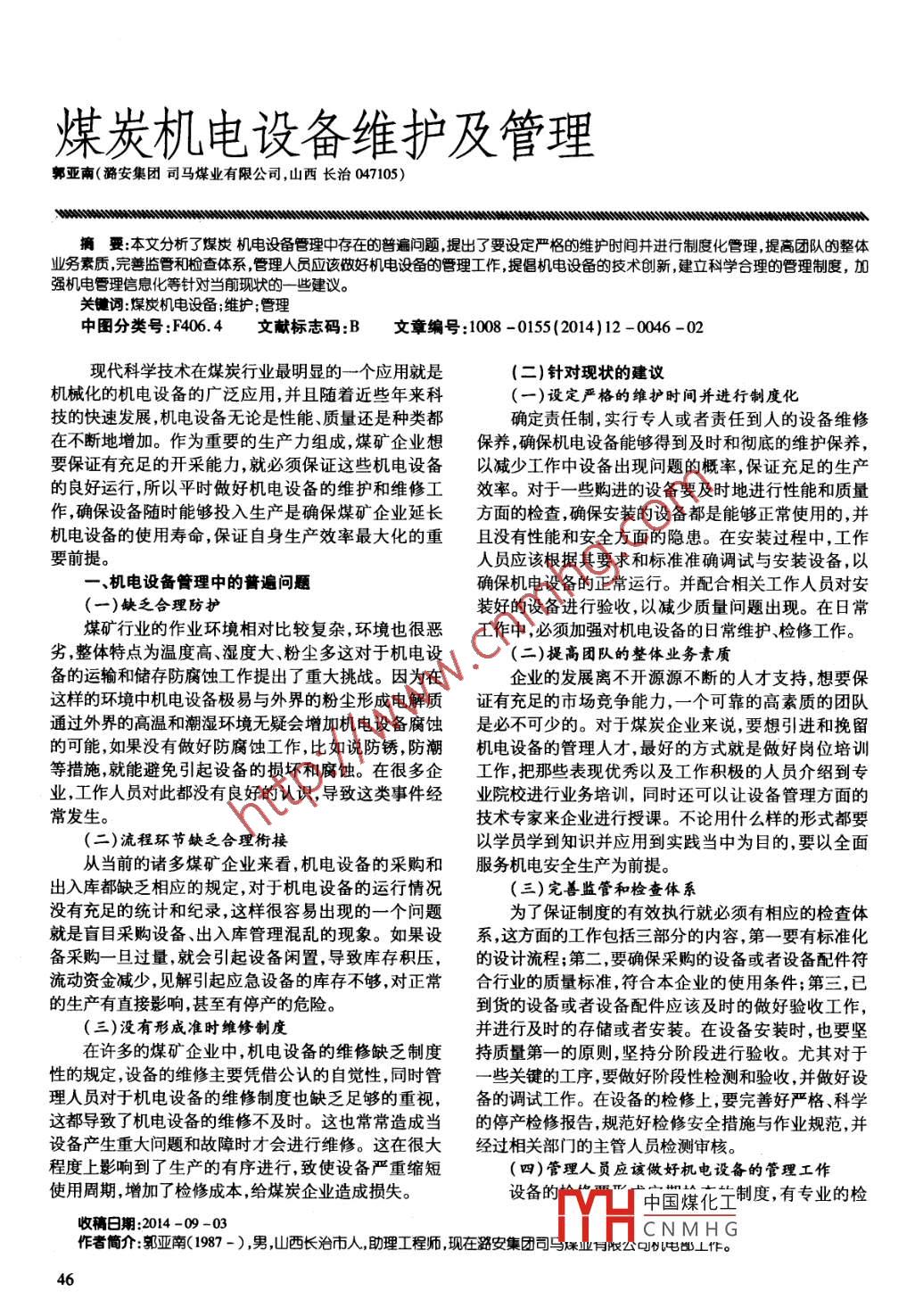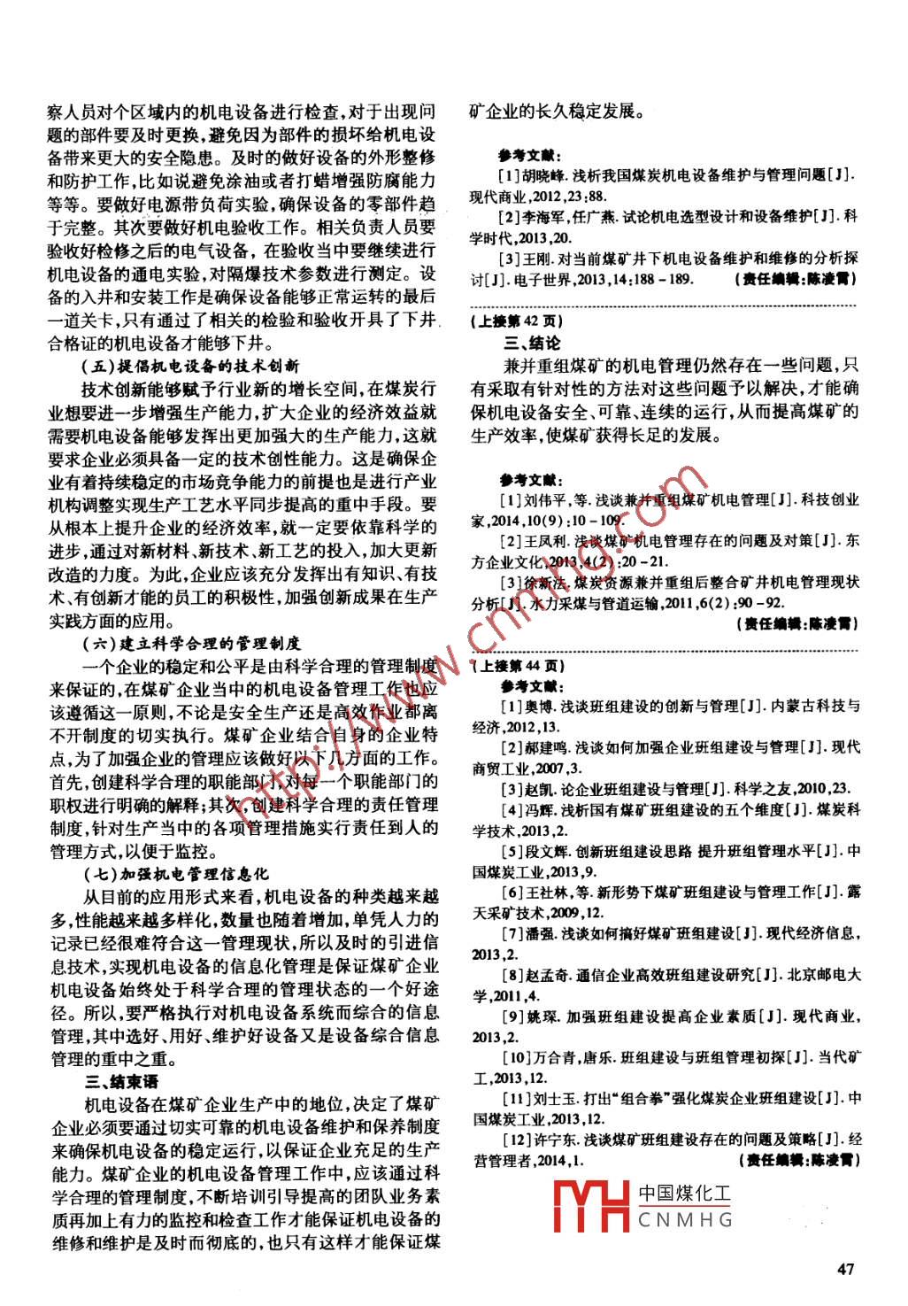 察人員對個區(qū)域內(nèi)的機電設(shè)備進行檢查,對于出現(xiàn)問礦企業(yè)的長久穩(wěn)定發(fā)展。題的部件要及時更換,避免因為部件的損壞給機電設(shè)備帶來更大的安全隱患。及時的做好設(shè)備的外形整修參考文獻:和防護工作,比如說避免涂油或者打蠟增強防腐能力[1]胡曉峰.淺析我國煤炭機電設(shè)備維護與管理問題[J].等等。要做好電源帶負荷實驗,確保設(shè)備的零部件趨現(xiàn)代商業(yè),2012 ,23 :88.[2]李海軍,任廣燕試論機電選型設(shè)計和設(shè)備維護[].科于完整。其次要做好機電驗收工作。相關(guān)負責人員要學時代,2013,20. .驗收好檢修之后的電氣設(shè)備,在驗收當中要繼續(xù)進行[3]王剛.對當前煤礦井下機電設(shè)備維護和維修的分析探機電設(shè)備的通電實驗,對隔爆技術(shù)參數(shù)進行測定。設(shè)討[J].電子世界,2013,14:188 - 189.(責任編輯:陳凌霄)備的入井和安裝工作是確保設(shè)備能夠正常運轉(zhuǎn)的最后-道關(guān)卡,只有通過了相關(guān)的檢驗和驗收開具了下井.(上接第42頁)合格證的機電設(shè)備才能夠下井。三、結(jié)論(五)提倡機電設(shè)備的技術(shù)創(chuàng)新兼并重組煤礦的機電管理仍然存在一些問題,只技術(shù)創(chuàng)新能夠賦予行業(yè)新的增長空間,在煤炭行有采取有針對性的方法對這些問題予以解決,才能確業(yè)想要進一步增強生產(chǎn)能力,擴大企業(yè)的經(jīng)濟效益就保機電設(shè)備安全、可靠、連續(xù)的運行,從而提高煤礦的需要機電設(shè)備能夠發(fā)揮出更加強大的生產(chǎn)能力,這就生產(chǎn)效率,使煤礦獲得長足的發(fā)展。要求企業(yè)必須具備- -定的技 術(shù)創(chuàng)性能力。這是確保企業(yè)有著持續(xù)穩(wěn)定的市場競爭能力的前提也是進行產(chǎn)業(yè)機構(gòu)調(diào)整實現(xiàn)生產(chǎn)工藝水平同步提高的重中手段。要[1]劉偉平,等.淺談兼并重組煤礦機電管理[J].科技創(chuàng)業(yè)從根本上提升企業(yè)的經(jīng)濟效率,就一定要依靠科學的家,2014 ,10(9):10- 109. .進步,通過對新材料新技術(shù)、新工藝的投入,加大更新[2]王鳳利.淺談煤礦機電管理存在的問題及對策[J].東改造的力度。為此,企業(yè)應(yīng)該充分發(fā)揮出有知識、有技方企業(yè)文化,2013 ,4(2) :20 -21.[3]徐新法.煤炭資源兼并重組后整合礦井機電管理現(xiàn)狀術(shù)、有創(chuàng)新才能的員工的積極性,加強創(chuàng)新成果在生產(chǎn)分析[J].水力采煤與管道運輸,2011,6(2) :90 -92.實踐方面的應(yīng)用。(貴任編輯:陳凌霄)(六)建立科學合理的管理制度一個企業(yè)的穩(wěn)定和公平是由科學合理的管理制度(.上接第44頁)來保證的,在煤礦企業(yè)當中的機電設(shè)備管理工作也應(yīng)參考文獻: .該遵循這--原則,不論是安全生產(chǎn)還是高效作業(yè)都離[1]奧博淺談班組建設(shè)的創(chuàng)新與管理[J].內(nèi)蒙古科技與不開制度的切實執(zhí)行。煤礦企業(yè)結(jié)合自身的企業(yè)特經(jīng)濟,2012,13.[2]郝建鳴.淺談如何加強企業(yè)班組建設(shè)與管理[J].現(xiàn)代點,為了加強企業(yè)的管理應(yīng)該做好以下幾方面的工作。商貿(mào)工業(yè),2007,3.首先,創(chuàng)建科學合理的職能部門,對每一個職能部門的[3]趙凱.論企業(yè)班組建設(shè)與管理[J].科學之友,2010,23.職權(quán)進行明確的解釋;其次,創(chuàng)建科學合理的責任管理[4]馮輝.淺析國有煤礦班組建設(shè)的五個維度[J].煤炭科制度,針對生產(chǎn)當中的各項管理措施實行責任到人的學技術(shù),2013,2.管理方式,以便于監(jiān)控。[5]段文輝.創(chuàng)新班組建設(shè)思路提升班組管理水平[J]中(七)加強機電管理信息化國煤炭工業(yè),2013,9.從目前的應(yīng)用形式來看,機電設(shè)備的種類越來越[6]王社林,等.新形勢下煤礦班組建設(shè)與管理工作[J].露多,性能越來越多樣化,數(shù)量也隨著增加,單憑人力的天采礦技術(shù),2009,12.[7]潘強.淺談如何搞好煤礦班組建設(shè)[3]現(xiàn)代經(jīng)濟信息,記錄已經(jīng)很難符合這一管理現(xiàn)狀,所以及時的引進信2013,2.息技術(shù),實現(xiàn)機電設(shè)備的信息化管理是保證煤礦企業(yè)[8]趙孟奇.通信企業(yè)高效班組建設(shè)研究[J].北京郵電大機電設(shè)備始終處于科學合理的管理狀態(tài)的-一個好途學,2011,4.徑。所以,要嚴格執(zhí)行對機電設(shè)備系統(tǒng)而綜合的信息[9]姚琛.加強班組建設(shè)提高企業(yè)素質(zhì)[J].現(xiàn)代商業(yè),管理,其中選好、用好維護好設(shè)備又是設(shè)備綜合信息管理的重中之重。[10]萬合青,唐樂.班組建設(shè)與班組管理初探[J].當代礦三、結(jié)柬語工,2013,12.機電設(shè)備在煤礦企業(yè)生產(chǎn)中的地位,決定了煤礦[11 ]劉士玉打出“組合拳”強化煤炭企業(yè)班組建設(shè)[J].中企業(yè)必須要通過切實可靠的機電設(shè)備維護和保養(yǎng)制度國煤炭工業(yè),2013,12.[12]許寧東.淺談煤礦班組建設(shè)存在的問題及策略[J].經(jīng)來確保機電設(shè)備的穩(wěn)定運行,以保證企業(yè)充足的生產(chǎn)營管理者,2014,1.能力。煤礦企業(yè)的機電設(shè)備管理工作中,應(yīng)該通過科學合理的管理制度,不斷培訓引導提高的團隊業(yè)務(wù)素中國煤化工質(zhì)再加_上有力的監(jiān)控和檢查工作才能保證機電設(shè)備的MHCNM
