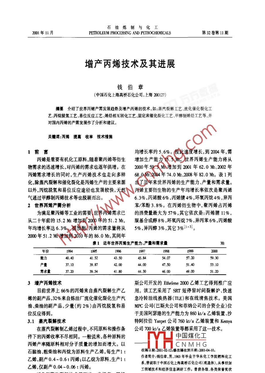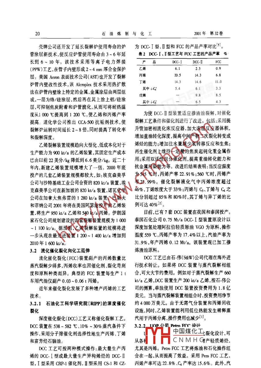 石油煉制與化工2001年11月PETROLEUM PROCESSING AND PETROCHEMICALS第32卷第11期增產(chǎn)丙烯技術(shù)及其進(jìn)展錢(qián)伯章(中國(guó)石化上海高橋石化公司,上海200127)搞要介紹了世界丙烯產(chǎn)需發(fā)展趨勢(shì)及增產(chǎn)丙烯的技術(shù),如:蒸汽裂解工藝、流化催化裂化工藝丙烷脫氫工藝易位反應(yīng)工藝烯烴相互轉(zhuǎn)化工藝、固定床催化裂化工藝、甲醇制烯烴工藝等,并對(duì)國(guó)內(nèi)丙烯的產(chǎn)需發(fā)展作了分析和建議關(guān)詞:丙烯提高收率技術(shù)措施均增長(zhǎng)率約5.6%。按此速度增長(zhǎng),到2004年,需丙烯是重要有機(jī)化工原料,隨著聚丙烯等衍生增加生產(chǎn)能力155M。世界丙烯生產(chǎn)能力將從物需求的迅速增長(zhǎng),對(duì)丙烯的需求也逐年俱增。在2000年593Mt增加到21年62.0Mt、200年丙烯需求增長(zhǎng)的同時(shí),生產(chǎn)丙烯技術(shù)也走向多樣68.0M、204年740Mt、2008年82.0Mt。表1列化,除蒸汽裂解和催化裂化是丙烯生產(chǎn)的主要來(lái)源出了歷年來(lái)世界丙烯的生產(chǎn)能力、產(chǎn)量和需求量。以外,丙烷脫氫和易位反應(yīng)途徑也發(fā)展較快,天然丙烯主要衍生物的生產(chǎn)年均增長(zhǎng)率依次是聚丙烯氣通過(guò)甲醇制丙烯技術(shù)等也脫穎而出63%丙烯酸6%,丙烯腈4%,環(huán)氧丙烷4%,異丙2世界丙烯產(chǎn)需分析苯/苯酚3.8%。在丙烯衍生物中,聚丙烯占丙烯為滿足聚丙烯等工業(yè)的需要,世界丙烯需求已的消費(fèi)量最大為57%,其它依次是丙烯腈11%從二十年前的152Mt增加到2000年的512Mt,羰基合成醇8%,環(huán)氧丙烷7%,異丙苯6%,丙烯酸年均增長(zhǎng)率達(dá)6.3%。據(jù)預(yù)測(cè),丙烯的需求量將從5%,異丙醇3%,其它3%132000年512Mt增加到2010年的860Mt,其間年衰1近年世界丙烯生產(chǎn)能力、產(chǎn)量和需求量年份能力40.4041.5243.5045.8454.0757.2059.3037.1039,8744.0047.5051.4053.10需求量395444.303增產(chǎn)丙烯技術(shù)斯公司開(kāi)發(fā)的 Ethelene200乙烯工藝得到推廣應(yīng)目前世界上66%的丙烯來(lái)自蒸汽裂解生產(chǎn)乙用。該工藝采用了SRT短停留時(shí)間裂解爐、快速烯的副產(chǎn)品,32%來(lái)自煉油廠流化催化裂化生產(chǎn)汽急冷轉(zhuǎn)油線換熱器(TLE)和在線清焦技術(shù)。美國(guó)油柴油的副產(chǎn)品,少量(約2%)由丙烷脫氫和易MPC公司(巴斯夫公司和菲納公司的合資企業(yè))位位反應(yīng)得到。于美國(guó)阿瑟港的生產(chǎn)能力為860k/a乙烯裝置、沙31萊汽裂解技術(shù)特阿拉伯 Yanpet公司760k/a乙烯裝置和 Kema在蒸汽裂解制乙烯過(guò)程中,不同原料和操作條公司700k/a乙烯裝置等都采用了這一技術(shù)。件下的丙烯收率不盡相同。一般說(shuō)來(lái),各種原料的中國(guó)煤化工丙烯產(chǎn)率隨原料相對(duì)分子質(zhì)量的增加而增大。以CNMHG石腦油粗柴油和丙烷為原料生產(chǎn)乙烯,每生產(chǎn)1t收稿日期:201212;修改收到日期:201410乙烯副產(chǎn)04~06t丙烯;以乙烷為原料,生產(chǎn)1t作者簡(jiǎn)介錢(qián)伯章男,19年畢業(yè)于華東化工學(xué)院燃料化工乙烯,僅副產(chǎn)0.04~0.06t丙烯。系曾就職于中國(guó)石化上海高橋石化公司(現(xiàn)退休),從事烴加工領(lǐng)域技術(shù)和經(jīng)濟(jì)信息調(diào)研工作。曾獲各級(jí)各類榮譽(yù)獎(jiǎng)狀萬(wàn)方返年蒸汽裂解技術(shù)得到進(jìn)一步提高。羅姆8余項(xiàng)發(fā)表科技論文4余篇2001年第32卷殼牌公司還開(kāi)發(fā)了延長(zhǎng)裂解爐使用壽命的爐為DCC-I型、Ⅱ型和FCC的產(chǎn)品產(chǎn)率對(duì)比。管涂層新技術(shù),使反應(yīng)爐管使用壽命由3~6年延表2DOC【、『型工藝與FCC工藝的產(chǎn)品產(chǎn)率%長(zhǎng)到6~10年。該技術(shù)采用等離子電力焊接(PPw)工藝,在管子內(nèi)壁形成2-4mm厚合金保護(hù)乙爝層:美國(guó)Aemn表面技術(shù)公司(AST)也開(kāi)發(fā)了裂解丙烯20.5爐管內(nèi)壁改性技術(shù),該 Alcroplex技術(shù)采用熱擴(kuò)散丁烯法在爐管內(nèi)壁涂上特定的金屬,金屬涂層由兩層組其中iC433戊烯成,一層為絡(luò)/硅涂層,然后再在其上涂上鋁/硅涂其中iC層,可抑制焦炭附著和爐管脆化,從而可將耐熱溫度從1000℃提高到1200℃,使乙烯和丙烯產(chǎn)率為使DCⅡ型裝置適應(yīng)摻渣油裂解,對(duì)催化提高:道化學(xué)公司推出CA500抗垢劑技術(shù),使裂解工藝條件和催化劑進(jìn)行了改進(jìn)。包括:采用提裂解爐運(yùn)轉(zhuǎn)時(shí)間延長(zhǎng)2~8倍,同時(shí)提高了轉(zhuǎn)化率升管加密相流化床反應(yīng)器加大床層反應(yīng)器體積,和裂解深度。增加重油轉(zhuǎn)化深度,提高中間產(chǎn)物二次裂化轉(zhuǎn)變成乙烯裂解裝置規(guī)模趨向大型化、低成本化對(duì)于烯烴的能力;增加注水量減少氫轉(zhuǎn)移反應(yīng)和生焦;生產(chǎn)能力為90ka的乙烯裝置,其固定生產(chǎn)成本再生催化劑上維持一定量的焦炭起鈍化重金屬作已由以前22美分/kg降低到6.6美分/kg。近二十用;采用雙活性組分催化劑,提高重油轉(zhuǎn)化能力和年內(nèi),新建乙烯裝置規(guī)模增大了一倍。200年底抗金屬污染能力等。改進(jìn)后結(jié)果表明:當(dāng)反應(yīng)溫度投產(chǎn)的幾套乙烯裝置規(guī)模都較大,如:埃克森美孚為545℃時(shí),丙烯產(chǎn)率2.919%;560℃時(shí),丙烯產(chǎn)公司與沙特基礎(chǔ)工業(yè)公司合資的820ka裝置,埃率23.9%