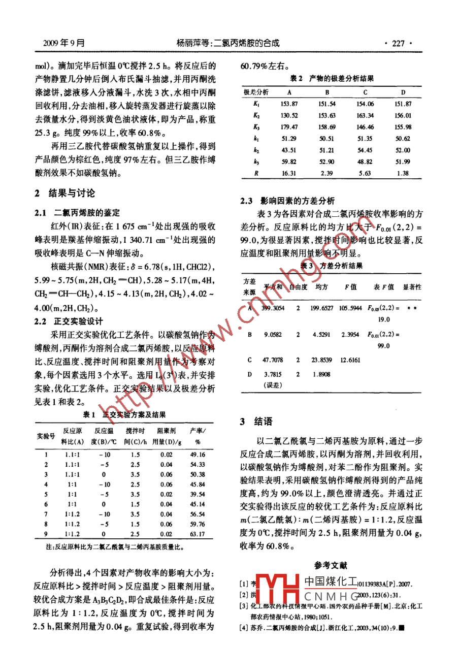2009現(xiàn)代化工第29卷增刊(1)226Modem Chemieal Ind2009年9月氯丙烯胺的合成楊麗萍,劉永杰,錐廷亮,劉國際(鄭州大學(xué)化工與能源學(xué)院,河南鄭州45000摘要:報道了以二氯乙酰氯與二烯丙基胺為原料通過一步反應(yīng)合成二氯丙烯胺分別用堿酸氫鈉和三乙胺作為縛酸劑。實驗結(jié)果表明,采用碳酸氫鈉作縛酸劑得到的產(chǎn)品純度更高約為99.0%以上顏色更加澄清透亮。并通過正交實驗得出該反應(yīng)的較優(yōu)工藝條件,目標(biāo)化合物通過紅外、核磁等分析手段進(jìn)行了確認(rèn)關(guān)鍵詞:二氯內(nèi)烯胺;一步反應(yīng);縛酸劑;正交實驗中圖分類號:TQ457文獻(xiàn)標(biāo)識碼:A文章編號:0253-43020(2009)S1-0226-02Synthesis of dichlorimidYANG Li-ping, LU Yong-jie, LUo Ting-liang, LU Guo-ji(School of Chemical and Energy Engineering, Zhengzhou University, Zhengzhou 450001, China)Abstract:One-step synthesis of dichlorimid with dichloroacetyl chloride and diallylamine as raw material and with sodiumbicarbonate or triethylamine as catalyst is introduced. The experimental results show that the purity of product withbicarbonate as catalyst is higher than that with triethylamine as catalyst. The purity of product is about 99.0% and theproduct is clearer. The opitimal conditions are obtained by orthogonal tests. Target compounds are confimed by IR, NMR andother analysisKey words: dichlormid; one-step synthesis; catalyst; orthogonal test二氯丙烯胺是一種頡頏型除草劑解毒劑。這種目前國內(nèi)采用兩步法合成二氯丙烯胺較多,第解毒劑可以增進(jìn)谷胱甘肽含量及提高谷胱甘肽-S步先合成中間體二烯丙基胺,第二步合成二氯丙轉(zhuǎn)移酶活性來加快谷胱甘肽氨基甲?;俣?起到烯胺。一種專利二氯丙烯胺的生產(chǎn)方法中二氯丙烯解毒作用,主要用于玉米、水稻、小麥、高粱、燕麥等胺純度在96%左右口。本文直接利用二烯丙基胺作物,既可作拌種處理,又可與其他除草劑混用作土壤與二氯乙酰氯為原料,一步法合成二氯丙烯胺純度處理。能解除丁草胺、乙草胺、阿特拉津、異丙甲草胺、高、色澤好。甲草胺丙草丹、燕麥畏等除草劑對作物的藥害1-2。二氯丙烯胺( dichlormid),又名烯丙酰草胺,是目1實驗部分前應(yīng)用最為廣譜的安全添加劑。二氯丙烯胺于1.1試劑與儀器1972年由 Stauffer Chemical(現(xiàn)為 ICI Agrochemicals)公二氯乙酰氯(99.41%),淄博鎮(zhèn)榮工貿(mào)有限公司開發(fā),由FY, Chang等報道本品可增加除草劑選司;二烯丙基胺(99.38%),山東鄒平銘興化工有限擇性。通用名稱:R-25788。分子式:CHn1C2NO;相公司;碳酸氫鈉、三乙胺、丙酮、對苯二酚,均為分對分子質(zhì)量:2081;化學(xué)結(jié)構(gòu)式:C2 CHCON(CH2CH析純。CH2)2;化學(xué)名稱:N,N-二烯丙基-22一二氯乙酰Nicolet FT-IR00傅里葉變換紅外光譜儀;Bnk胺;CAS號:[37764-25-3]。二氯丙烯胺純度≥erAV-Ⅲ400核磁共振儀; agilent10高效液相色∞9%時為澄清黏性液體,純度≥95%時為琥珀至棕譜儀;RE-52AA旋轉(zhuǎn)蒸發(fā)器等。色液體,100℃以上不穩(wěn)定,在鐵存在下會迅速分解,1.2實驗步驟20℃水中溶解度為5g/L;與丙酮、乙醇4-甲基戊在裝有回流冷凝管、恒壓滴液管、溫度計的四口2酮、二甲苯混溶。熔點5.0~6.5℃,對光穩(wěn)瓶中投入固體碳酸氫鈉約20g、丙酮約80mL阻聚定3-4。二氯丙烯胺的合成工藝路線為:劑對烯丙甚肪23.28g(0.24mol),(CH2-CHCH)2 NH CLCHCOCI通過中國煤化工令卻下通過恒壓滴(CH-CHCH2)2NCOCHCh+HCI液管CNMHG酰氯1926mL(0.2收稿日期:2009-07-20作者簡介:楊麗萍(1984-),女,碩士生;劉國際(1964-),男博士,教授博士生導(dǎo)師研究方向為化學(xué)反應(yīng)工程通訊聯(lián)系人,liu@m,dhmn00年9月楊麗萍等:二氯丙烯胺的合成227mo)滴加完畢后恒溫0℃攪拌25h。將反應(yīng)后的6079%左右。物靜置幾分鐘后倒入布氏漏斗抽濾,并用丙酮洗表2產(chǎn)物的極差分析結(jié)果滌濾餅濾液移入分液漏斗,水洗3次,水相中丙酮極差分析回收利用,分去油相移入旋轉(zhuǎn)蒸發(fā)器進(jìn)行旋蒸以除154.06去微量水分,得到淡黃色油狀液體,即為產(chǎn)品,稱重153.63163.3425.3g純度9%以上,收率60.8%。k17.4751.2950.5151.3550.62再用三乙胺代替碳酸氫鈉重復(fù)以上操作,得到51.2154.4552.00產(chǎn)品顏色為棕紅色,純度97%左右。但三乙胺作縛59.848.82酸劑效果不如碳酸氫鈉。1.382結(jié)果與討論23影響因素的方差分析1二氯丙烯胺的鑒定表3為各因素對合成二氯丙烯胺收率影響的方紅外(IR)表征:在1675cm-處出現(xiàn)強的吸收差分析。反應(yīng)原料比的均方比大于F01(2,2)=峰表明是羰基伸縮振動,1340.71cm-1處出現(xiàn)強的990,為很顯著因素,攪拌時間影響也比較顯著,反吸收峰表明是C一N伸縮振動。應(yīng)溫度和阻聚劑用量影響不明顯。核磁共振(NMR)表征:8=678(8,1H,CHC2)表3方差分析結(jié)果599~5.75(m,2H,CH2=CH),528~5.17(m,4H,方差平方和自由度均方CH2=CHCH2),4.15~4.13(m,2H,CH2),402來源值表F值顯著性4.00(m,2H,CH2)。199.6527105.5944Fg(2,2)=“22正交實驗設(shè)計采用正交實驗優(yōu)化工藝條件。以碳酸氫鈉作為9.0582452912.3954Fo(2,2)=縛酸劑,丙酮作為溶劑合成二氯丙烯胺,以反應(yīng)原料比、反應(yīng)溫度、攪拌時間和阻聚劑用量作為考察對23.853912.6161象每個因素選用3個水平。選用L4(3)表,并安排實驗優(yōu)化工藝條件。正交實驗結(jié)果以及極差分析(誤差)見表1和表2。表1正交實驗方案及結(jié)果3結(jié)語反應(yīng)原反應(yīng)溫攪拌時阻聚劑產(chǎn)率實驗號料比(A)度(B)/℃