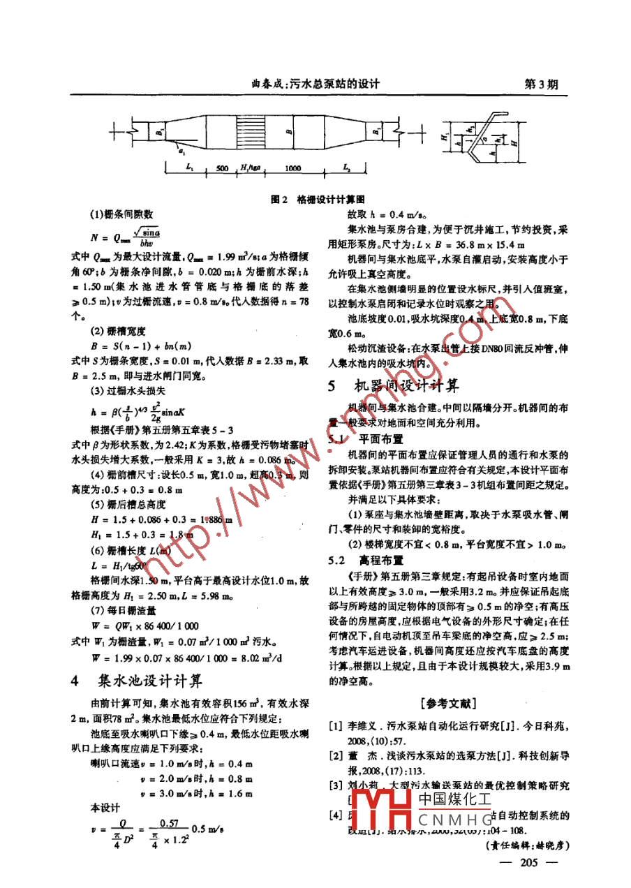 第15卷第3期.水利科技與經(jīng)濟(jì)Vol.15 No.32009年3月Water Conservancy Science and Technology and EconomyMar. ,2009污水總泵站的設(shè)計(jì)曲春成(鏵子山水庫(kù)灌區(qū)管理站,黑龍江通河150900)[摘要]隨著城市工業(yè)的發(fā)展及人們生活水平的不斷提高,城市生活污水量和工業(yè)廢水量也相應(yīng)的大幅增加,為保障人民的身體健康,提高生活質(zhì)量,城市排水量的解決問(wèn)題也日益迫切。本設(shè)計(jì)的處理對(duì)象為城市污水,提出污水總泵站的設(shè)計(jì)思路。[關(guān)鍵詞]污水;總泵站 ;設(shè)計(jì);計(jì)算[中田分類號(hào)] TV675 [文獻(xiàn)標(biāo)識(shí)碼] B [文章編號(hào)] 1006 - 7175(200903 - 0203- 03The Design of the Sewage Base Pump StationQU Cun - cheng(Imigation Distict Mangement Station of Huarishan Reservior, Tonghe 150900, Heilongjiang, China)Ahstract: With the development of the urban industry and the improverment of the living standard, thequantity of sanitary sewage and the industril wastewater in the eity ane increasing correspondingly at largeamplitude. For the pupoee of ensuring the people' 8 health and improving the quality of life, it is increas-ingly ungent for u to solve the problem of the urban discharge of water. This paper puts forward a design-ing train of thought for the sewage base pump station.Key words: sewage; base pump station; desigm; calculation水池。1概述2污水泵站設(shè)計(jì)計(jì)算1.1 設(shè)計(jì)數(shù)據(jù)(1)污水泵站平均秒流量。泵房簡(jiǎn)圖見圖1。Q=1584 L/e最大秒流量Q =1967 L/s(2)水管管底高程為57.560 m,管徑DN 1 500,充滿度0.75,水面高程63.000 tno土0.000(3)出水井水面高程62.912 m,壓水管長(zhǎng)50 m。一中格棚 mmm.88888888(4)泵站設(shè)在處理廠內(nèi),地面高程62.56 mo進(jìn)水總管(5)地質(zhì)條件較好,地下水位高程47.56 m,地下水無(wú)侵蝕性,土壤冰凍深度1.2 m。1.2 泵房形式為運(yùn)行方便,采用自灌式泵房。由于自灌式啟動(dòng),故采用集水池與機(jī)器間合建,泵房選用半地下式。污水提升泵房簡(jiǎn)圖見圖1。圈1污水提升泵房計(jì)算簡(jiǎn)圈1.3 工藝布置2.1 水泵的選擇本設(shè)計(jì)來(lái)水為- -根污水千管,無(wú)滯留、禍流等不利現(xiàn)(1)設(shè)計(jì)流量.象,故不設(shè)進(jìn)水井,來(lái)水管直接經(jīng)進(jìn)水閘門、格柵,流人集中國(guó)煤化工的容量為433 IsoYHCNMHG[收稿日期]' 2008-11-04 .[作者簡(jiǎn)介]曲春成(1976- ),男,黑龍江通河人,助理工程師.一203一第15卷第3期.水利科技與經(jīng)濟(jì)Vol.15 No.32009年3月Water Conservancy Science and Technology and EconomyMar. ,2009(3)集水他有效容積,采用相當(dāng)于1臺(tái)泵6 min的容量90P彎頭-個(gè)(e =0.5),DN 350 mm閘門一個(gè)(ξ =0.1),W =433x60x6/1 000= 155.80m',取w =156 m。DN 500x DN 250漸縮管ε = 0.25。有效水深采用H =2 m,則集水池面積為F= W/H沿程損失:1.2x 19.6/1 000= 0.023 m。=78 m2。局部損失:(0.1 + 0.5+ 0.1) x 2.55/2g+ 0.25(4)選泵前總揚(yáng)程的估算。設(shè)經(jīng)過(guò)格柵的水頭損失為x5.72/2 g=0.634 m0.15 m,則集水池最低工作水位與所需提升泵站最高水位吸水管路水頭損失:0.634 + 0.023= 0.657 m差為出水管路水頭損失:DN 300x DN 500漸擴(kuò)管1個(gè)(ξ62.912- (57.56+ 1.0x0.75-0.15-2)=6.752 m=0.375),DN 500單項(xiàng)閘閥一個(gè)(ξ = 1.7),DN 500 mm00出水管水頭損失的估算:彎頭- -個(gè)(∈=0.5),DN 500閥門一個(gè)(ε =0.1)。各泵出水管匯合后,總出水管DN 1 200,查表得:局部損失:0.375 x 5.7/2g+ (1.7 + 0.5 + 0.1)流速。=1.92 m/(在1.5~2.0之間),1000i =2.8x2.06/2g=1.12 m當(dāng)一臺(tái)水泵運(yùn)轉(zhuǎn)時(shí)Q = 433L/e,。= 1.43 m/aDN s00 mo管徑,Q =433[/s, v =1.43 m/e,1 000i> 0.7 m/s,不會(huì)發(fā)生淤積。=4.27。丁字管2個(gè)(∈= 0.2), DN 500彎頭一個(gè)(ξ設(shè)總出水管中心埋深1.2 m,局部水頭損失為沿程水=0.6)。頭水頭損失的30% ,則泵站外管線的水頭損失為DN 500閥門- -個(gè)(ε =0.2)[50+ (64.112-57.56+ 1.2)]x2.8x1.3/1 000沿程損失:6.4x4.2P/1 00=0.117皿=0.20 m局部損失:(0.2 + 0.6+ 0.4+ 0.2) x 1.432/19.6假設(shè)泵站內(nèi)管線水頭損失為1.5 m,考慮自由水頭為=0.46 m1.0 m,則總揚(yáng)程為丁字管2個(gè)(E =0.1).DN 500 mm閘門( ξ =0.2)。H=1.5+ 1.0+0.20+ 6.752=9.452 m出水管路水頭總損失:0.30+ 1.2+ 0.53 + 0.32(5)選泵。本設(shè)計(jì)由于流量大,揚(yáng)程低,無(wú)合適的污水=2.35 m泵,故選用單級(jí)雙吸、泵殼中開的臥式離心清水泵。查則水泵所需總揚(yáng)程H =1.2+2.35+8.4+1=12.95 m .《手冊(cè))第11冊(cè),選泵型號(hào)為DW350 - 460B/4/160,其主要故選用12MN - 24E型水泵是合適的。性能參數(shù)如下:3格柵間設(shè)計(jì)計(jì)算流量:Q =433 L/s揚(yáng)程: H=12 m3.1格柵設(shè)計(jì)的一 -般要求及部分參數(shù)的確定轉(zhuǎn)速: n =2 900 r/min(1)水泵前格柵柵條間隙,應(yīng)根據(jù)水泵要求確定。本軸功率: N =160.68 kW設(shè)計(jì)選用柵條間隙為b = 20 mm,采用機(jī)械清渣。配電動(dòng)機(jī):Y355MZ型(2)水泵前格柵間歐≤25mm,故污水處理系統(tǒng)前不泵重:1200kg另設(shè)格柵。2.2泵站平面布量 t(3)機(jī)械格柵不宜少于兩臺(tái),本設(shè)計(jì)為節(jié)約投資,僅設(shè)水泵的平面布置形式,可直摟影響機(jī)器間的面積大機(jī)械清渣格柵一臺(tái),同時(shí)設(shè)計(jì)平臺(tái),供人工清渣使用。小,同時(shí),也關(guān)系到養(yǎng)護(hù)管理的方便與否。機(jī)組間距以不(4)過(guò)柵流速-般采用0.8~ 1.0 m/s,本設(shè)計(jì)取0.9。妨礙操作和維護(hù)的需