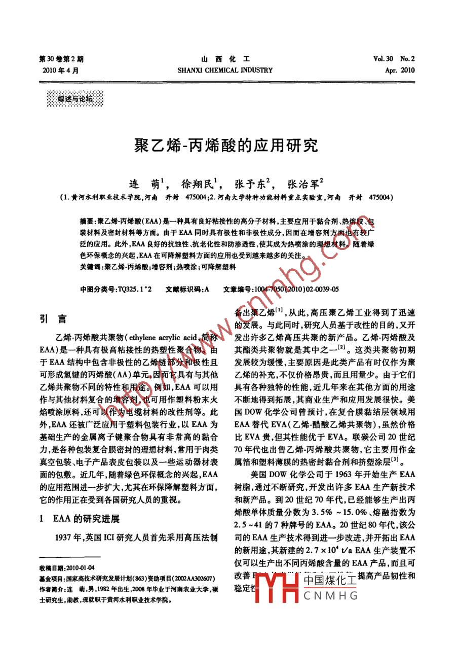 第30卷第2期山西化工Vol. 30 No.22010年4月SHANXI CHEMICAL INDUSTRYApr. 2010,綿述與論壇,聚乙烯-丙烯酸的應(yīng)用研究連萌',徐翔民', 張予東”,張治軍”(1.黃河水利職業(yè)技術(shù)學(xué)院,河南開(kāi)封475004;2. 河南大學(xué)特種功能材料重點(diǎn)實(shí)驗(yàn)室,河南開(kāi)封475004)摘要:聚乙烯-丙烯酸(EAA)是- -種具有良好粘接性的高分子材料,主要應(yīng)用于黏合劑、熱熔膠、包裝材料及密封材料等方面。由于EAA同時(shí)具有極性和非極性成分,因而在增容劑方面也有較廣泛的應(yīng)用。此外,EAA良好的抗蝕性、抗老化性和防滲透性,使其成為熱噴涂的理想材料。隨著綠色環(huán)保概念的興起, EAA在可降解塑料方面的應(yīng)用也受到越來(lái)越多的關(guān)注。關(guān)鍵詞:聚乙烯丙烯酸;增容劑;熱噴涂;可降解塑料中圈分類號(hào):TQ325.1*2文獻(xiàn)標(biāo)識(shí)碼:A文章編號(hào):1004-7050(2010)02-0039-05備出聚乙烯[1] ,從此,高壓聚乙烯工業(yè)得到了迅速引言的發(fā)展。與此同時(shí),研究人員基于改性的目的,又開(kāi)乙烯丙烯酸共聚物( ethylene acrylic acid, 簡(jiǎn)稱發(fā)出許多乙烯高壓共聚的新產(chǎn)品。乙烯-丙烯酸及EAA)是- -種具有極高粘接性的熱塑性聚合物。由其酯類共聚物就是其中之一(2)。這類共聚物初期于EAA結(jié)構(gòu)中包含非極性的乙烯鏈部分和極性且發(fā)展較為緩慢,主要原因是此類產(chǎn)品有時(shí)僅作為聚可形成氫鍵的丙烯酸( AA)單元,因而它具有與其他乙烯的補(bǔ)充,不僅價(jià)格昂貴,而且用量少。由于它們乙烯共聚物不同的特性和用途。例如,EAA可以用具有各種獨(dú)特的性能,近幾年來(lái)在其他方面的用途作與其他材料復(fù)合的增容劑,也可用作塑料粉末火不斷地得到拓展,其商業(yè)生產(chǎn)和應(yīng)用發(fā)展很快。美焰噴涂原料還可以作為電纜材料的改性劑等。此國(guó)DOW化學(xué)公司曾預(yù)計(jì),在復(fù)合膜黏結(jié)層領(lǐng)域用.外,EAA還被廣泛應(yīng)用于塑料包裝行業(yè),以EAA為EAA替代EVA(乙烯-醋酸乙烯共聚物),雖然價(jià)格基礎(chǔ)生產(chǎn)的金屬離子鍵聚合物具有非常高的黏合比EVA貴,但其性能優(yōu)于EVA。聯(lián)碳公司20世紀(jì)力,是各種包裝復(fù)合膜密封的理想材料,常用于肉類70年代也出售乙烯-丙烯酸共聚物,它主要用作金真空包裝、電子產(chǎn)品表皮包裝以及--些運(yùn)動(dòng)器材表屬箔和塑料薄膜的熱密封黏合劑和擠塑涂層”]。面的包敷。近幾年,隨著綠色環(huán)保概念的興起,EAA美國(guó)DOW化學(xué)公司于1963年開(kāi)始生產(chǎn)EAA的應(yīng)用范圍進(jìn)-一步擴(kuò)大,尤其在環(huán)保降解 塑料方面,樹(shù)脂,通過(guò)不斷研究,開(kāi)發(fā)出許多EAA生產(chǎn)新技術(shù)它的作用正在受到各國(guó)研究人員的重視。和新產(chǎn)品。到20世紀(jì)70年代,已經(jīng)能夠生產(chǎn)出丙烯酸單體質(zhì)量分?jǐn)?shù)為3.5% ~ 15. 0%、熔融指數(shù)為1 EAA的研究進(jìn)展2.5~41的7種牌號(hào)的EAA。20世紀(jì)80年代,該公1937年,英國(guó)ICI研究人員首先采用高壓法制司的EAA生產(chǎn)技術(shù)得到進(jìn)-步改進(jìn),并開(kāi)拓出EAA的新用途,其新建的2.7x10* Va EAA生產(chǎn)裝置不僅可以生產(chǎn)出不同丙烯酸含量的EAA產(chǎn)品,而且可收稿日期:20100104基金項(xiàng)目:國(guó)家高技術(shù)研究發(fā)展計(jì)劃(863)資助項(xiàng)2002302607)改善中國(guó)煤化工提高產(chǎn)品韌性和怍者簡(jiǎn)介:連萌,男,1982年出生2008年畢業(yè)于河南農(nóng)業(yè)大學(xué),碩穩(wěn)定YHCNMHG士研究生,助教,現(xiàn)就職于黃河水利職業(yè)技術(shù)學(xué)院?!?0.山西化工2010年4月嶄新功能的多相共聚物,以達(dá)到事半功倍的效果。2 EAA 的生產(chǎn)工藝及特性但是,絕大多數(shù)高分子材料是互不相容的,這種不相EAA由乙烯與丙烯酸在高壓下通過(guò)自由基機(jī)容的行為是由于共混物之間缺乏有利的相互作用,理共聚制得,其生產(chǎn)工藝與高壓聚乙烯的生產(chǎn)工藝而共混物熔融時(shí)存在的較大表面張力,使其在混合相似即,將乙烯、丙烯酸、過(guò)氧化物引發(fā)劑加入高壓過(guò)程及加工過(guò)程中相與相不能相容。反應(yīng)器中,在溫度100 C ~250 C、壓力108 MPa~改進(jìn)聚合共混物相容性的常用方法是使用增容186MPa的條件下進(jìn)行共聚合反應(yīng),制得丙烯酸質(zhì)劑。增容劑以界面活性劑的形式分布于共混物兩相量分?jǐn)?shù)為0.1% ~35. 0%的EAA共聚物。EAA化界面處,使界面張力降低。增容劑的加入,- -方面提學(xué)結(jié)構(gòu)通式為: .高了共混的分散度,使分散相顆粒細(xì)微化并均勻分ECH2- -CH23£CH2- -CH玉布;另一方面也加強(qiáng)了共混物兩相間的黏合力,使不同相區(qū)之間能更好地傳遞所受應(yīng)力,使原本熱力學(xué)COOHEAA為無(wú)規(guī)共聚物,在分子主鏈上無(wú)規(guī)則地排不相容的共混物成為工藝相容的共混物06。列極性的(甲基)丙烯酸(一-CH,CH2C0OH)支鏈,使對(duì)于EAA來(lái)說(shuō),由于其獨(dú)特的結(jié)構(gòu)特征,目前得PE分子鏈對(duì)稱性和規(guī)整性降低。同時(shí),由于分已作為增容劑被應(yīng)用于多種共混體系之中。EAA子鏈中含有極性較大的羧基,因而對(duì)金屬或非金屬增容機(jī)理主要表現(xiàn)為以下2種方式”:1)通過(guò)接均有非常良好的粘接性。羧基與