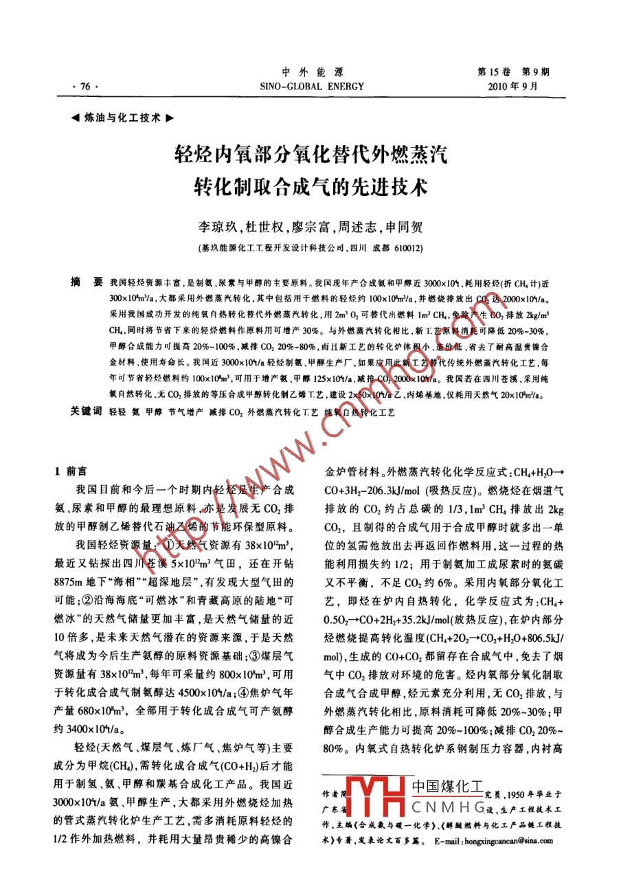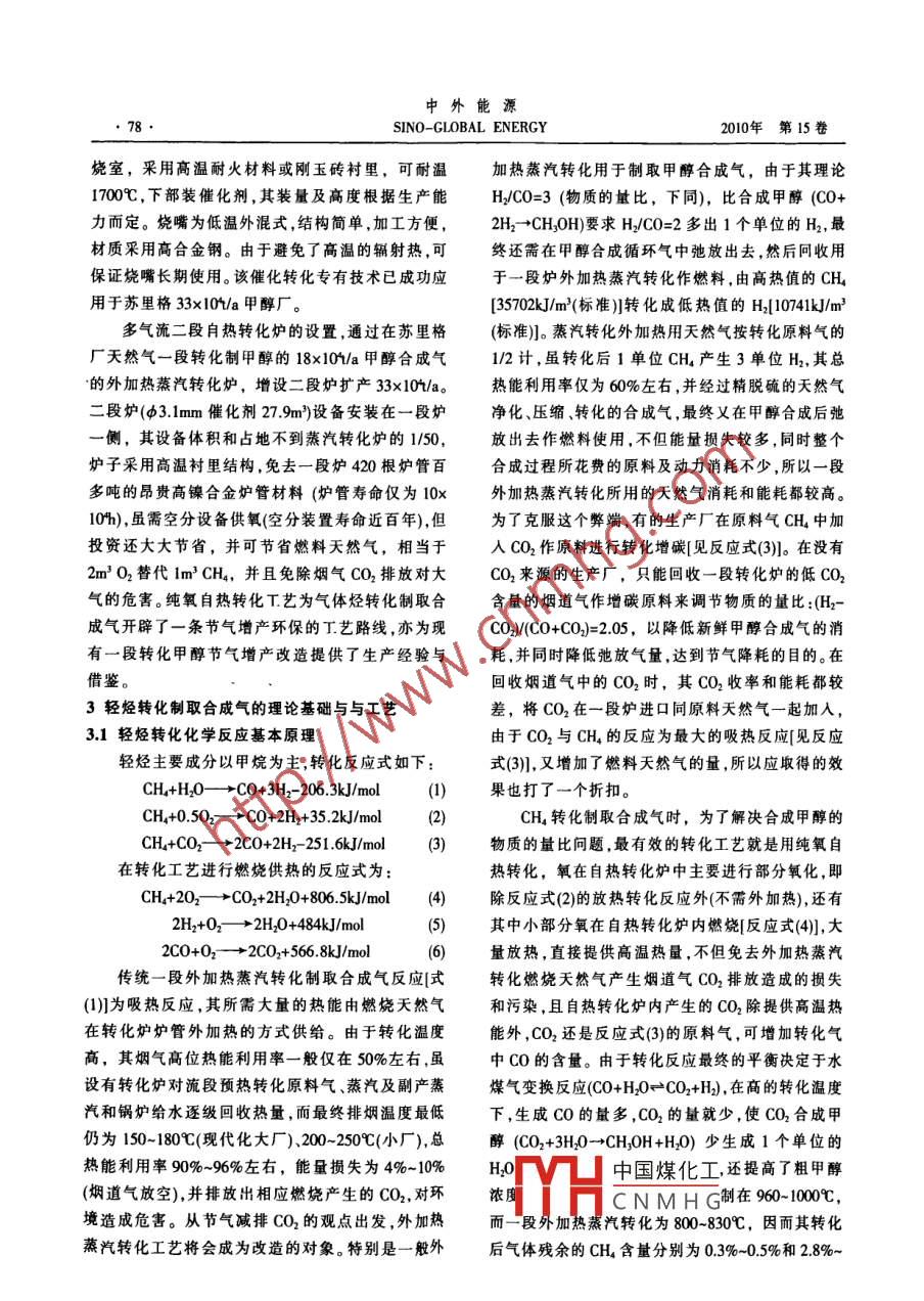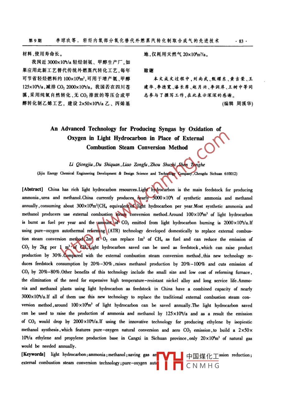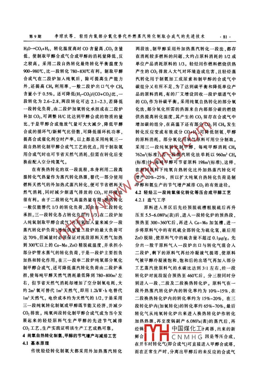 中外能源第15卷第9期SINO-GLOBAL ENERGY2010年9月煉油與化工技術(shù)p輕烴內(nèi)氧部分氧化替代外燃蒸汽轉(zhuǎn)化制取合成氣的先進(jìn)技術(shù)李瓊玖,杜世權(quán),廖宗富,周述志,申同賀基玖能源化工工程開發(fā)設(shè)計(jì)科技公司,四川成都610012)摘要我國輕烴資源豐富是制氨尿素與甲醇的主要原料。我國現(xiàn)年產(chǎn)合成氨和甲醇近300,耗用輕烴(折CH計(jì))近300×0%m/a,大都采用外燃蒸汽轉(zhuǎn)化,其中包括用干燃料的輕烴約100x0%mla,并燃燒排放出CO2達(dá)200010/a。采用我國成功開發(fā)的純氧自熱轉(zhuǎn)化替代外燃蒸汽轉(zhuǎn)化,用2m3O2可替代出燃料1m3CH,免除產(chǎn)生CO2排放lkg/m3CH,同時(shí)將節(jié)省下來的輕烴燃料作原料用可增產(chǎn)30%。與外燃蒸汽轉(zhuǎn)化相比,新T藝原料消耗可降低20%~30%甲醇合成能力可提高20%-100%,減排CO220%-80%,而且新工藝的轉(zhuǎn)化爐體積小,造價(jià)低,省去了耐高溫貴鎳合金材料、使用壽命長。我國近3000×10/a輕烴制氨、甲醇生產(chǎn)廠,如果應(yīng)用此新工藝替代傳統(tǒng)外燃蒸汽轉(zhuǎn)化工藝,每年可節(jié)省輕烴燃料約100×10hm3,可用于增產(chǎn)氨、甲醇125x10%/a,減排CO2000×10%/a。我國若在四川蒼溪,采用純氧自然轉(zhuǎn)化、無CO2排放的等壓合成甲醇轉(zhuǎn)化制乙烯T藝,建設(shè)2×50×10%/a乙、內(nèi)烯基地,僅耗用天然氣20×10%m/a關(guān)鍵詞輕輕氨甲醇節(jié)氣增產(chǎn)減排CO2外燃蒸汽轉(zhuǎn)化T藝純氧自熱轉(zhuǎn)化工藝1前言金爐管材料。外燃蒸汽轉(zhuǎn)化化學(xué)反應(yīng)式:CH+HO我國目前和今后一個(gè)時(shí)期內(nèi)輕烴是生產(chǎn)合成CO+3H2-2063J/mol(吸熱反應(yīng))。燃燒烴在煙道氣氨、尿素和甲醇的最理想原料,亦是發(fā)展無CO2排排放的CO2約占總碳的1/3,1mCHL排放出2kg放的甲醇制乙烯替代石油乙烯的節(jié)能環(huán)保型原料。CO2,且制得的合成氣用于合成甲醇時(shí)就多出一單我國輕烴資源量:①天然氣資源有38×10%m位的氫需弛放出去再返回作燃料用,這一過程的熱最近又鉆探出四川蒼溪5×10%m3氣田,還在開鉆能利用損失約1/2;用于制氨加工成尿素時(shí)的氨碳8875m地下“海相”“超深地層”,有發(fā)現(xiàn)大型氣田的又不平衡,不足CO2約6%。采用內(nèi)氧部分氧化工可能;②沿海海底“可燃冰”和青藏高原的陸地“可藝,即烴在爐內(nèi)自熱轉(zhuǎn)化,化學(xué)反應(yīng)式為:CH4+燃冰”的天然氣儲量更加豐富,是天然氣儲量的近0.502→CO+2H2+35kJ/mo(放熱反應(yīng)),在爐內(nèi)部分10倍多,是未來天然氣潛在的資源來源,于是天然烴燃燒提高轉(zhuǎn)化溫度(CH+202→CO2+HO+8065kJ氣將成為今后生產(chǎn)氨醇的原料資源基礎(chǔ);③煤層氣mo),生成的CO+CO2都留存在合成氣中,免去了煙資源量有38×10m3,每年可采量約800×10%m3,可用氣中CO2排放對環(huán)境的危害。烴內(nèi)氧部分氧化制取于轉(zhuǎn)化成合成氣制氨醇達(dá)4500×0%a;④焦?fàn)t氣年合成氣合成甲醇,烴元素充分利用,無CO2排放,與產(chǎn)量680×10%m3,全部用于轉(zhuǎn)化成合成氣可產(chǎn)氨醇外燃蒸汽轉(zhuǎn)化相比,原料消耗可降低20%-30%;甲約3400×10t/a。醇合成生產(chǎn)能力可提高20%-100%;減排CO20%-輕烴(天然氣、煤層氣、煉廠氣、焦?fàn)t氣等)主要80%。內(nèi)氧式自熱轉(zhuǎn)化爐系鋼制壓力容器,內(nèi)襯高成分為甲烷(CH),需轉(zhuǎn)化成合成氣(CO+H)后才能用于制氫、氨、甲醇和羰基合成化工產(chǎn)品。我國近中國煤化工究員,1950年畢業(yè)于3000×10t/a氨、甲醇生產(chǎn),大都采用外燃燒烴加熱CNMHG設(shè)、生產(chǎn)工程技術(shù)工的管式蒸汽轉(zhuǎn)化爐生產(chǎn)工藝,需多消耗原料輕烴的作,主編《合成氨與碳一化學(xué)》、《醇醚燃料與化工產(chǎn)品饒工程技1/2作外加熱燃料,并耗用大量昂貴稀少的高鎳合米》專蕭,發(fā)論文百多篇。E- mail: hongxingcancan @sinacot第9期李瓊玖等,輕烴內(nèi)氧部分氧化替代外燃蒸汽轉(zhuǎn)化制取合成氣的先進(jìn)技術(shù)77溫耐火材料,體積小、造價(jià)低、不用耐高溫貴鎳合金空而損失,同時(shí)燃燒產(chǎn)生的CO2亦排入大氣對環(huán)境材料、壽命長。內(nèi)氧部分氧化工藝30x×10/a甲醇或造成危害。外加熱管式蒸汽轉(zhuǎn)化爐,需要采用高鎳氨的合成氣設(shè)備體積僅為外燃管式爐的1/50,節(jié)省合金管,壽命僅10×10%h就需要更換,消耗大量昂高鎳合金爐管數(shù)百噸,外燃管式爐爐管壽命僅10貴的稀有鎳合金材料,且該工藝存在排出的煙道氣多年就需更換,稀少昂貴鎳合金消耗量大。內(nèi)氧式、CO2對環(huán)境的危害,以及爐管建設(shè)和更換投資大、雖需用空分制氧,但制氧低溫設(shè)備系鋁合金材料,成本高,消耗稀有金屬多等問題。純氧自熱轉(zhuǎn)化系且可長期運(yùn)轉(zhuǎn),壽命達(dá)百多年。內(nèi)氧烴自熱轉(zhuǎn)化大利用氧在密閉壓力容器內(nèi)同部分可燃?xì)馊紵?化學(xué)約每耗用2m3O2,可節(jié)省1m3CH,即用取之不盡用應(yīng)式:CH+202→CO2+2H1O+8066kJ的放熱反應(yīng),之不竭的空氣中的氧可節(jié)省寶貴的烴輕原料,并免極端溫度高達(dá)2400℃c提供熱源,可促進(jìn)自熱轉(zhuǎn)化的去煙道氣中CO2的排放,成為替代外燃蒸汽轉(zhuǎn)化的催動(dòng)力,大大提高了轉(zhuǎn)化率,且其燃燒供熱產(chǎn)生的節(jié)能減排創(chuàng)新工藝。該工藝已經(jīng)開發(fā)出來,并已用CO2存留在爐