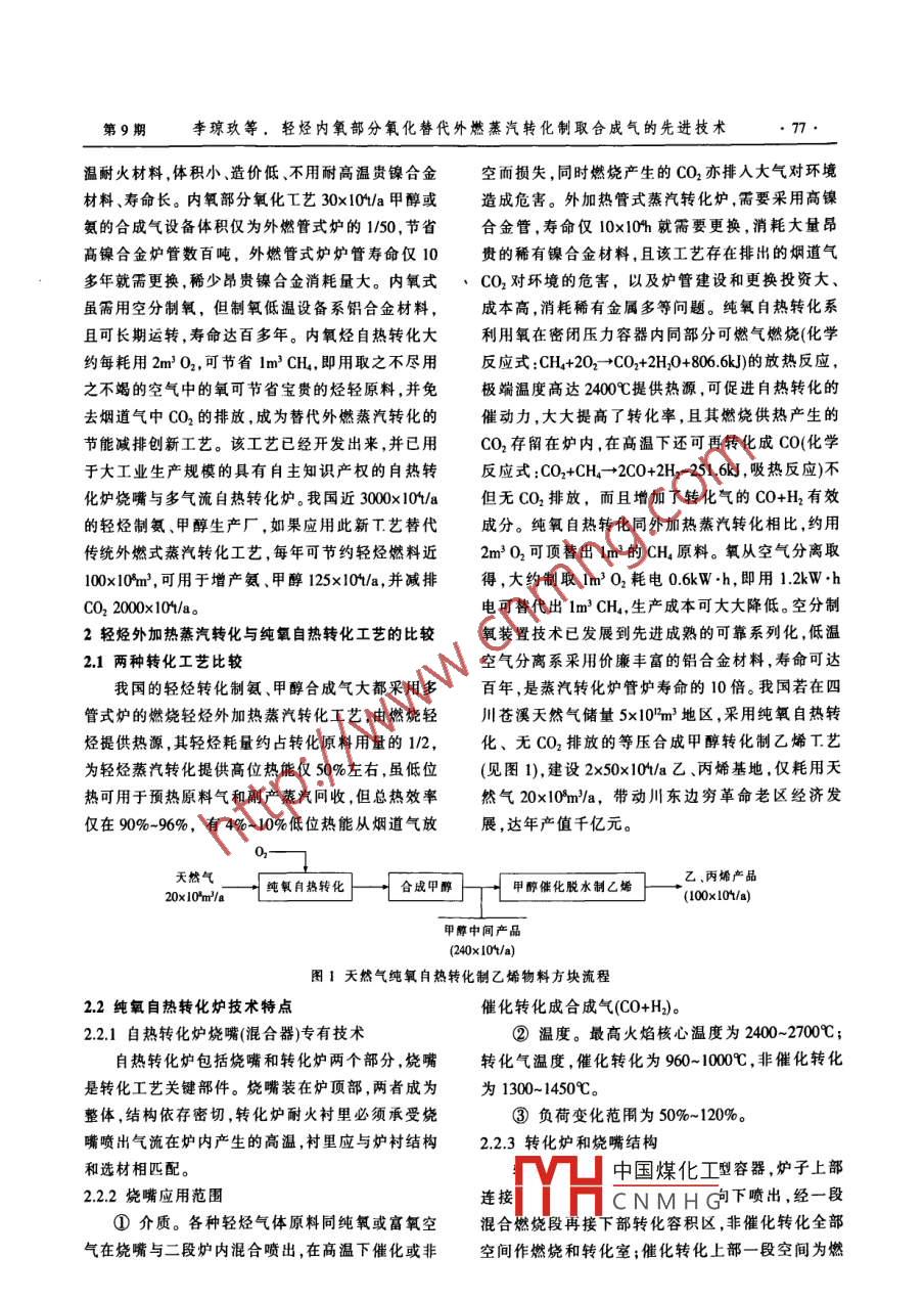 輕烴內(nèi)氧部分氧化替代外燃蒸汽轉(zhuǎn)化制取合成氣的先進(jìn)技術(shù)