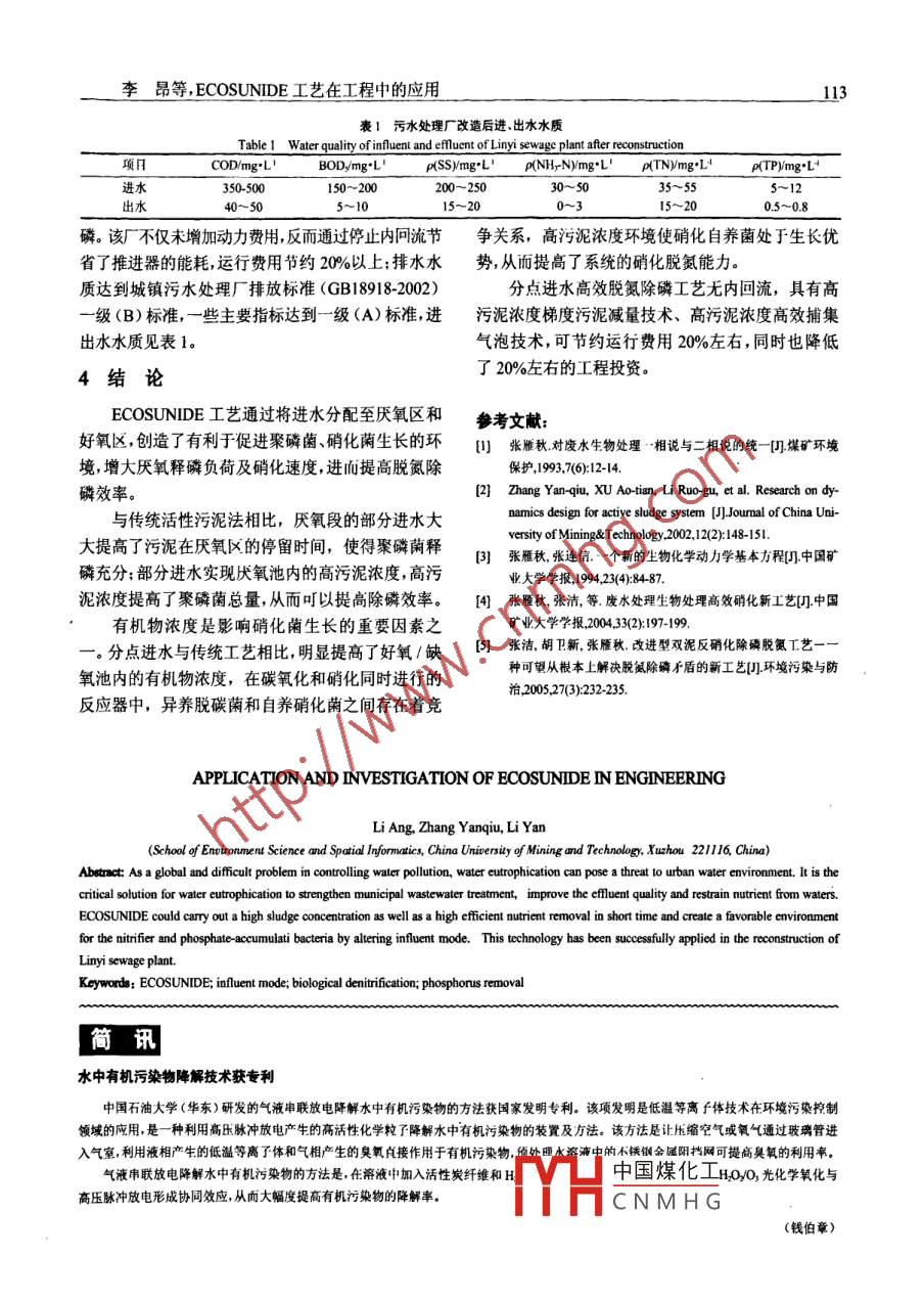 第35卷第l1期水處理技術(shù)Vol 35 No 112009年11月TECHNOLOGY OF WATER TREATMENTNov,2009l11ECOSUNIDE工藝在工程中的應(yīng)用李昂,張雁秋,李燕(中國礦業(yè)大學(xué)環(huán)境與測繪學(xué)院江蘇徐州221116摘龑:水體富營養(yǎng)化對城市水環(huán)境構(gòu)成了嚴重威脅是當今世界性的水污染治理難題加強城市污水的處理提高城市污水處理廠出水的氮、磷指標控制氮、磷等營養(yǎng)物質(zhì)迸入水體,是解決水體富營養(yǎng)化的重要途徑. ECOSUNIDE工藝通過改變進水方式提高活性污泥濃度,創(chuàng)造岀有利于蹦化菌和聚磷莤生長的環(huán)境,實現(xiàn)了短時高效脫氮除磷,并在臨沂市污水處理廠的改造中得到成功應(yīng)用關(guān)鑣詞: ECOSUNIDE;分點進水;生物脫氮;除磷中圖分類號:X703.1文獻標識碼:B文章編號:100377020091-1103隨著城鎮(zhèn)的快速發(fā)展,對于水質(zhì)、水量的要求越水高效脫氮除磷的工藝。該工藝創(chuàng)造出特殊工藝條件來越高,從而使得污水排放標準也在不斷提高但是提高硝化蔭、聚磷菌在活性污泥法中的比例,從而突破我國城市污水處理率低、投入資金有限,因此,如何了活性污泥法硝化速度慢、除磷量較少的瓶頸,實現(xiàn)了提髙污水處理生物脫氮除磷的效率和運行的穩(wěn)定短時高效脫氮除磷。與傳統(tǒng)工藝相比, ECOSUNIDE工性、節(jié)約能源、開發(fā)低耗高效的污水處理新工藝,高藝有其特有的工藝特點:效去除廢水中氮、磷的含量成為水污染控制的系統(tǒng)生態(tài)優(yōu)勢:生物系統(tǒng)長期穩(wěn)定在高污泥濃重要研究內(nèi)容。度及低營養(yǎng)狀態(tài)下工作,有效促進硝化菌、亞硝化1 ECOSUNIDE工藝菌、反硝化菌繁殖的生態(tài)優(yōu)勢。提高污泥濃度:準確分點,多次進水,即厭氧池生物脫氮除磷技術(shù)由于具有同時脫除C、N、P部分進水,后續(xù)池體多段布水的特殊分點進水工藝且處理成本低等優(yōu)點而得到廣泛應(yīng)用,但脫氮除磷技術(shù)使得污泥濃度大幅度提高,末端的污泥質(zhì)量濃過程中存在的基質(zhì)競爭和泥齡不同的矛盾使得處理度可達500mng1以上,首段的污泥質(zhì)量濃度可效果相對較差。就脫氮而言由于硝化菌的增殖速度達1000mng左右,由于采用了先進的生物反應(yīng)緩慢傳統(tǒng)的污水二級生化處理工藝(A30、氧化溝動力學(xué)理論模型及計算機優(yōu)化技術(shù),使得各點配水等活性污泥法)為提高脫氮效率,工程投資較大,曝比例非常準確合理,溶解氧和硝態(tài)氮得到非常充分氣時間較長,需要內(nèi)回流,使得運行成本增加:就除的利用不僅減少了充氧量而且活性污泥反應(yīng)效果磷而言,聚磷菌增殖緩慢在整個生物菌群中所占比更好例較低,脫氮除磷的碳源分配比例難以控制,總磷去節(jié)約工程投資:生物反應(yīng)池總停留時間短,減少除量一般僅能脫除5mg"左右,為提高除磷效果,生化池總?cè)莘e,進而縮短占地面積,與傳統(tǒng)工藝相比常采用化學(xué)除磷法,增加了運行成本??梢詼p少投資20%;生物池內(nèi)無攪拌器、無回流泵、ECOSUNIDE工藝一分點進水城市污水高效污泥減量使脫水系統(tǒng)設(shè)備減少30%脫氮除磷處理新工藝,是張雁秋教授為首的課題組降低運行費用:生物系統(tǒng)采用了分級多次硝化根據(jù)自主提出的統(tǒng)一動力學(xué)理論、動力學(xué)負荷理論、反硝化技術(shù)、同步硝化反硝化技術(shù)、高效曝氣技術(shù)、回流污泥濃度優(yōu)化理論,研發(fā)出的一種用于城市污無內(nèi)回流技術(shù)、高污泥濃度梯度使污泥減量以及高中國煤化工收稿日期:200902-10基金項目;中國礦業(yè)大學(xué)科技基金(0P080307):國家科技成果重點推廣計」CNMHG作者簡介:李昂(1982-),女,博⊥研究生主要從事水污染控制工程方面的研聯(lián)系電話:13852040795:E-mailthellen5s@yahoo.comcn水處理技術(shù)第35卷第11期污泥濃度高效捕集氣泡,運行費用節(jié)約20%以上。調(diào)試控制在50%~80%之間;厭氧池配水占總水量2工程應(yīng)用的一部分,其余部分分為5次配入后續(xù)曝氣池中;曝氣池由1次配水改為5次配水,由一級完全混合改21項目概況為五級推流串聯(lián)運行。剩余污泥由二沉池排出;污泥臨沂市位于山東省東南部,蘇魯兩省交界處,稱沂處于厭氧好氧/缺氧的反復(fù)循環(huán)中。蒙山區(qū)。臨沂因東臨沂河而得名,其河流水系屬淮河流部分水盒域沂沭泅水系。臨沂市污水處理廠的建成使臨沂城區(qū)內(nèi)大部分污水得到有效處理,市內(nèi)護城河、陷泥河、涑好氯缺氧池二沉總河和沂河的水質(zhì)得到很大改善。但由于近年來進水污染負荷有所回升、出水水質(zhì)要求更為嚴格進水水量變污泥國流化幅度大以及尾水回用等問題的出現(xiàn),使得臨沂市污圖2改造工藝流程水處理廠原有的污水處理工藝不能達到處理要求因223工藝改 flow diagram of Linyi sewage plant此需對該污水處理廠進行工藝改造和運行優(yōu)化。(1)配水井:因為改造工藝采用了新的進水方臨沂市污水處理廠設(shè)計規(guī)模100004,進水式,原初沉池配水井的功能不能滿足新工藝的要求,水質(zhì)COD350~500mgL,BOD3150~200mg·L,需作如下改動:NHN質(zhì)量濃度30~50mgL,TN質(zhì)量濃度35~55增加污泥回流進口。在原初沉池配水井適當位mgL,Tp質(zhì)量濃度5~12mgL改造前采用氧化溝置引入污泥回流管,通過配水井將回流污泥均勻布置工藝(流程