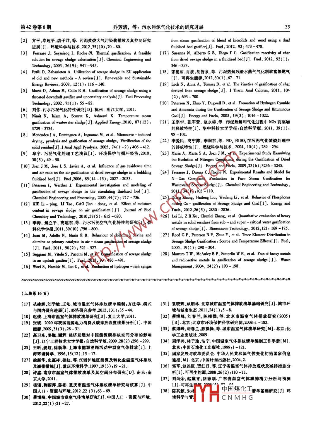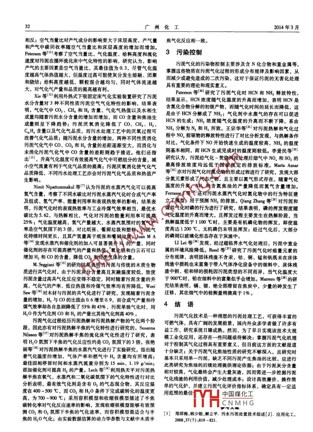 第42卷第6期.廣州化工Vol. 42 No.62014年3月Guangzhou Chemical IndustryMar. 2014污水污泥氣化技術(shù)的研究進(jìn)展喬芳清,申春苗,楊明沁,岳俊楠(天津工業(yè)大學(xué)環(huán)境與化學(xué)工程學(xué)院,天津300387)摘要:氣化技術(shù)作為- -種新興熱化學(xué)處理技術(shù),能將廢棄物轉(zhuǎn)化為穩(wěn)定多用途可利用能源,二次污染小,近年來在污泥處理領(lǐng)城得到國(guó)內(nèi)外的關(guān)注。本文介紹了污泥氣化處理技術(shù)的優(yōu)勢(shì),并從燃?xì)馓匦院臀廴究刂频确矫鎸?duì)國(guó)內(nèi)外理論研究的發(fā)展概況進(jìn)行了綜述,同時(shí)探討了氣化技術(shù)在城市污泥處理領(lǐng)域下一步可能的發(fā)展方向。關(guān)鍵詞:污水污泥;氣化;燃?xì)?污染控制中圖分類號(hào): x705文獻(xiàn)標(biāo)志碼: A文章編號(hào): 1001 -9677(2014)06 -0031 -03Research Advance in Technology of Sewage Sludge by GasificationQIAO Fang - qing, SHEN Chun - miao, YANG Ming -qin, YUE Jun - nan(School of Environmental and Chemical Engineering, Tianjn Polytechnic University , Tianjn 300387 , China)Abstract: Gasification, as a new kind of thermochemical treatment in the field of waste treatment, can convert thematerial into stable and transportable form of energy. The advantage of sewage sludge gasification was introduced. Thedevelopment of gas characteristics and pollution control of gasification of sewage sludge at home and abroad in recent yearswere summarized. Additionally , the future trends of gasification process in sewage sludge treatment were discussed.Key words: sewage sludge; gasification; gas; pollution control隨著我國(guó)社會(huì)經(jīng)濟(jì)的發(fā)展和城市化水平的加快,城市污水年的歷史, 而污泥氣化技術(shù)起步較晚,現(xiàn)在還處于試驗(yàn)研究階處理率不斷提高,污水污泥數(shù)量逐年攀升,如若不加處理而任段, 但也出現(xiàn)了工業(yè)化的成功案例。2005 年,德國(guó)的Balingen意排放勢(shì)必會(huì)造成嚴(yán)重的環(huán)境問題。污泥處置的最終目標(biāo)是實(shí)污水處理廠 將污泥干化、氣化與熱電聯(lián)用工藝組合,充分利用現(xiàn)污泥的減量化、穩(wěn)定化、無害化和資源化。目前,常見的污污泥中 的能量,使得能源損失降到最低,滿足了當(dāng)?shù)?萬居民泥處置方式主要包括衛(wèi)生填埋、土地利用和熱處理。污泥中含的用電需求間。有大量的有機(jī)質(zhì)和可燃組分,具有較高的能源開發(fā)和利用價(jià)污泥氣化技術(shù)是指在-定的溫度和壓力條件下,以空氣、值,采取措施將這些能量予以回收并轉(zhuǎn)化成易于儲(chǔ)存和運(yùn)輸?shù)难鯕饣蛩魵庾鳛闅饣瘎?在還原性氣氛下,通過一系列的熱液體或氣體燃料,對(duì)于優(yōu)化能源結(jié)構(gòu)、促進(jìn)環(huán)境保護(hù)具有重大化學(xué)反應(yīng),將污泥中的有機(jī)物轉(zhuǎn)化為含有H2、CH4、Co、CO2意義"。污泥熱處理即是充分利用了污泥具有一定熱值的特等可燃性氣體、焦油和灰渣的過程。點(diǎn),從而不僅使污泥在熱處理過程中達(dá)到能源化綜合利用的目污泥氣化的影響因素眾多,主要有氣化溫度、反應(yīng)時(shí)間、的,同時(shí)實(shí)現(xiàn)污泥的無害化和減量化。傳統(tǒng)的焚燒處理盡管可氣化劑、空氣當(dāng)量比、催化劑、污水處理工藝和氣化床類型以最大限度地實(shí)現(xiàn)污泥減容,但由于焚燒過程會(huì)產(chǎn)生嚴(yán)重的煙等。根據(jù)氣化劑類型的不同污泥氣化可分為CO2氣化、H0氣氣二次污染,是一種備受爭(zhēng)議的方法[B],而污泥的熱解、氣化化、空氣氣化、O2氣化和混合氣體氣化。相比傳統(tǒng)的污泥氣化可以有效克服此類問題,同時(shí)還將污泥中的潛在能量轉(zhuǎn)化為焦工藝,污泥的超臨界水氣化、等離子氣化和催化氣化以及與煤油或者可燃?xì)怏w。特別地,污泥氣化技術(shù)作為- -種高效清潔、技術(shù)和經(jīng)濟(jì)上或生物質(zhì)的共氣化,由于對(duì)污泥的能量利用率更高亦引起研究均可行且在一定程度上可以實(shí)現(xiàn)能量自持的污泥處理方人員的興趣。法[3-5),近年來得到國(guó)內(nèi)外廣泛的關(guān)注。與焚燒相比,污泥氣2燃?xì)馓匦曰a(chǎn)生的燃?xì)饪梢灾苯佑脕戆l(fā)電,能量利用效率較高,同時(shí)不需外加燃料,SO, 和NO,等有害氣體排放量少,大部分重金屬污泥氣化的主要目的之. -是獲得熱值更高、產(chǎn)率更大的可被固定在灰渣中,漫出毒性低,處理成本相對(duì)較低[6]。另外,燃?xì)怏w,因此國(guó)內(nèi)外學(xué)者對(duì)污泥氣化過程產(chǎn)生氣化氣的析出特相比污泥熱解,污泥氣化能量利用率更高,固體殘?jiān)杏袡C(jī)物性和組成進(jìn)行了 大量研究。和重金屬的浸出較低,后續(xù)處理簡(jiǎn)單[7-8]。Manya等[ 0]采用鼓泡流化床研究了床層高度和空氣當(dāng)量比1污泥氣化技術(shù)對(duì)污泥氣化的影中國(guó)煤化工4、CH和CH的濃度均隨床層n來一量比的增加而減氣化技術(shù)最早用于生產(chǎn)城市煤氣,應(yīng)用至今已經(jīng)有200多小, 而N2的濃度MYHCNMH(為變化規(guī)律則正好作者簡(jiǎn)介:喬芳清(1988-), 男,碩士研究生,主要從事固體廢棄物處理與資源化研究。第42卷第6期喬芳清,等:污水污泥氣化技術(shù)的研究進(jìn)展33[2] 平,岑超平,唐子君,等.污泥焚燒大氣污染物排放及其控制研究from steam gasification of blend of biosolids and wood using a dual進(jìn)展[J].