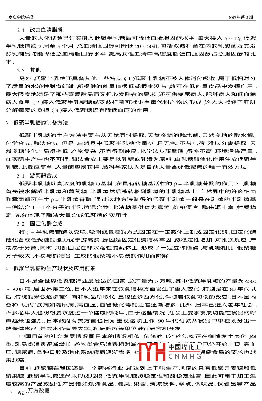 2005年10月棗莊學院學報Oct,2005第22卷第5期JOURNAL OF ZAOZHUANG UNIVERSITVol.22N0.5生物活性物質——一低聚半乳糖王紅妹(棗莊學院生物系山東棗莊277100)[摘要玠介紹了生物活性物質-低聚半乳糖的生理功能及生產方法并對其在食品工業(yè)的應用與發(fā)展前景進行了展望[關鍵詞〕聚半乳糖泩物活性泩生理功能[中圖分類號]Q935[文獻標識碼]A[文章編號]004-707X2005)5-0061-031引言低聚糖主要分為三類柢聚異麥糖、低聚畢乳糖和低聚果糖.其中食療效果最好的是低聚半乳糖.低聚半乳糖σ galactooligosaccharide簡稱GOs是大量存在于動物的乳汁和乳清中的組功能性低聚糖,它是在乳糖分子的半乳糖殘基上以a鍵接上1-4個半乳糖而形成的雜低聚糖.構成式可用Cal-(Gah-lc來表示其中n=1-4其主要成分為6′-半乳糖基乳糖.它具有獨特的生理玏能和理化性質廣泛地應用于烘焙食品、糖果、果醬、清涼飲料、糕點、調味品、療效食品等中.低聚糖因其顯著的生理功能已成為近年糖生物學的硏究熱點.目前,世界上低聚半乳糖的工業(yè)產品主要利用生物技術,以糖苷水解酶的酶法水解和酶法轉移活性來進行生產2低聚半乳糖的生理功能2.1雙岐杄菌增值因子低聚半乳糖在腸道后段可作為營養(yǎng)物質被動物腸道內固定的有益菌消化利用從而使有益菌大量增生起到了有益菌增殖因子的作用.同時低聚糖產生的酸性物質可降低整個腸道HI值從而抑制了有害菌如沙門氏菌等的生長.在食品工業(yè)上抵低聚半乳糖可作為食品添加劑捉進體內雙岐杄菌的生長增強人體的免疫力.雙歧杄菌在腸道內能自然合成維生素B1維生素B2、維生素κ6、維生素B12煙酸和葉酸但不能合成維生素K.雙歧桿菌發(fā)酵乳制品中乳糖已部分轉化乳酸解決了人們乳糖耐受性問題同時也增加了水溶性可吸收鈣的含量使乳制品更易消化吸收由于雙歧桿菌對氧、力、熱和酸的高度敏感性要想直接將它添加入食品中是相當困難的但這對于低聚糖來說卻是易于反掌2.2改善礦物質的吸收試驗表明低聚半乳糖能有效促進鈣、鎂、磷的吸收促進蛋白質的消化.作為鈣、鎂、鐵等礦物質和微量元素的活化因子可以達到促進礦物質和微量元素吸收的效果如在補鈣、鐵、鋅等食品、保健品中添加低聚果糖可以提高產品的功效2.3低齲齒性中國煤化工口腔鏈球菌等口腔細菌的不能利用低聚半乳CNMHG質一葡聚糖也不產生乳酸所以可有效降低齲齒的發(fā)生[收稿日期衛(wèi)005-08-10[作者簡介正紅妹(1970-)女江蘇徐州人棗莊學院生物系講師主要從事微生物學糖代謝研究棗莊學院學報2005年第5期2.4改善血清脂質大量的人體試驗已證實攝入低聚半乳糖后可降低血淸膽固醇水平.毎天攝入6-12g低畢乳糖持續(xù)2周至3個月總血清膽固醇可降低》0~5ol.包括雙歧杄菌在內的乳酸菌及其發(fā)酵乳制品均能降低總血清膽固醇水平提高女性血清中高密度脂蛋白膽固醇占總膽固醇的比率2.5其他另外低聚畢乳糖還具備其他一些特點α胝聚畢乳糖不被人體消化吸收屬于低相對分子質量的水溶性膳食纖維所提倛的能量值很低或根本沒有故可在低能量食品中發(fā)揮作用最大限度地滿足了那些喜愛甜品而又擔心發(fā)胖者的要求還可供糖尿病人、肥胖病人和低血糖病人食用(2囁入低聚半乳糖糖或雙歧桿菌可減少有毒代謝產物的形成這大大減輕了肝臟分解毒素的負擔(3攝入低聚糖還有降低血壓的作用3低聚半乳糖的制備方法低聚半乳糖的生產方法主要有從天然原料提取、天然多糖的酶水解、天然多糖的酸水解化學合成、酶法合成.但是肩然界中低聚畢乳糖含量少且無色、不帶電荷難以分離提取.天然多糖轉化產品得率低產物復雜不宜得到純品.化學法步驟繁瑣得率不髙環(huán)境污染嚴重在實際生產中也不可行.酶法合成主要是以乳糖或乳清為原料由乳糖酶催化作用生成低聚半乳糖此反應簡單大量酶容易獲得被科學家認為是目前大量合成低聚糖的唯一有效方法3.1游離酶合成低聚半乳糖以高濃度的乳糖為基料在具有轉糖基活性的β-半乳糖苷酶的作用下乳糖首先被水解成畢乳糖和葡萄糖泮乳糖然后被轉移到乳糖的半乳糖基上.自然界中的許多細菌和霉菌都可產生β-半乳糖苷酶.通過這種方法制得的低聚半乳糖一般是在乳糖的半乳糖基側結合1~4個分子的半乳糖混合物.此法糖基供體為寡糖價格便宜.酶來源豐富性質穩(wěn)定.充分體現了酶法大量合成低聚糖的實用性3.2固定化酶合成將β-半乳糖苷酶以交聯、吸附或包埋的方式國定在一定載體上制成國定化酶.固定化酶催化合成低聚糖的能力優(yōu)于游離酶原因是國定仳酶結構牢國熱穩(wěn)定性増加可批次反應物易于分離.同時將酶固定在非水溶性的載體上形成了一定立體障礙與乳糖相比低聚糖分子較大不易與酶結合生成的低聚糖不易被酶作用而降解4低聚半乳糖的生產現狀及應用前景曰本是全世界低聚糖行業(yè)最發(fā)達的國家總產量為5萬噸.其中低聚半乳糖的產量為650700噸居世界第二位.日本人近年來在飲食結構方面發(fā)生了重大變化特別是在80年代以后傳統的米飯逐步被牛肉和乳品所取代已經逐步西方化.伴隨著飲食習慣的改變日本國內各種現代"疾病如糖尿病、高血壓、血管硬化等的患者逐漸增多.此外曰本已進入老年社會許多老年人也紛紛要求度過一個健康的晩年.由于這些情況社會上要求發(fā)展功能性食品的
