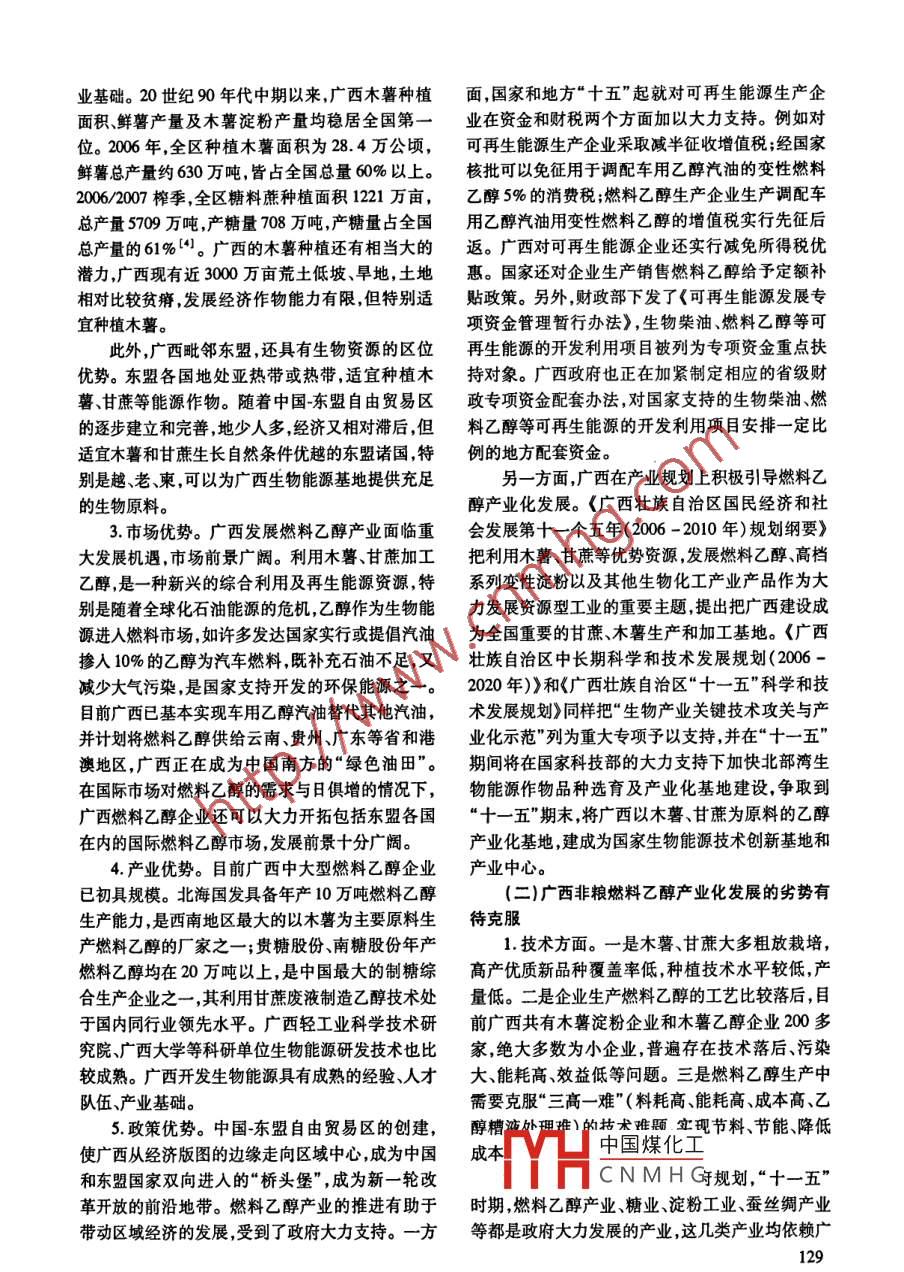 200年第12期NO.12,2008(總第215期)ACADEMIC FORUMCumulatively NO 215)踉食安全枧角下看廣西燃料乙醇產(chǎn)業(yè)化發(fā)展譚彥紅,楊光摘要]近年來,在能源安全、糧食安全的雙重壓力下,中國政府明確提出發(fā)展非糧燃料乙醇的發(fā)展戰(zhàn)略。利用木薯、甘蔗生產(chǎn)燃料乙醇,廣西具有明顯的優(yōu)勢。非糧燃料乙醇產(chǎn)業(yè)化發(fā)展對帶動廣西城鄉(xiāng)經(jīng)濟的發(fā)展意義重大,政府應當大力扶持[關鍵詞]糧食安全;能源安全;燃料乙醇;產(chǎn)業(yè)化作者簡介]譚彥紅,廣西財經(jīng)學院財政系講師,中南科技政法大學博士研究生,廣西南寧530003;楊光,華中師范大學政法學院博士研究生,湖北武漢430079[中圖分類號]F27[文獻標識碼]A[文章編號]1004-4434(2008)12-0127-04當前,世界糧食、石油市場價格不斷上揚,各如果繼續(xù)發(fā)展糧食乙醇將不可避免地要更大規(guī)模國政府高度重視糧食安全和能源安全,集中表現(xiàn)在使用糧食,而大規(guī)模用糧食生產(chǎn)燃料乙醇必將危及各國發(fā)展燃料乙醇產(chǎn)業(yè)的各種政策上。2006年底糧食安全。為了避免出現(xiàn)車與人爭糧食的局面,中以來,中國出臺了一系列政策強調(diào)發(fā)展燃料乙醇國燃料乙醇生產(chǎn)必須另辟蹊徑。應堅持“非糧”原則,嚴格控制玉米工業(yè)產(chǎn)品深加(二)糧食安全問題促使燃料乙醇產(chǎn)業(yè)原料非工的盲目發(fā)展即燃料乙醇的生產(chǎn)由糧食乙醇向非糧化糧乙醇轉變,由扶持燃料乙醇項目向扶持非糧乙醇由于各國生物燃料乙醇大多以玉米等糧食作項目轉變。在此背景下,廣西大力推進木薯等非糧為原料,這種“以缺代缺”的產(chǎn)業(yè)模式必然造成糧燃料乙醇產(chǎn)業(yè)化發(fā)展,既有利于地區(qū)產(chǎn)業(yè)集群的形食原料緊缺,價格飛漲。從世界范圍看,以糧食為成也有利于帶動廣西農(nóng)村經(jīng)濟的發(fā)展,具有廣闊原料的生物燃料的大規(guī)模使用將從長期上改變國的發(fā)展前景際糧食市場固有的價格波動周期,并長期支持糧食廣西燃料乙醇產(chǎn)業(yè)化發(fā)展面臨難得價格上漲。近年來世界各國大量使用糧食生產(chǎn)乙醇已打破了全球以往的糧食平衡體系使得糧食供的發(fā)展機遇給形勢更趨嚴峻各國糧食價格普遍上漲,給糧食(一)能源安全問題催生燃料乙醇新興產(chǎn)業(yè)安全造成威脅部分亞洲國家甚至出現(xiàn)了“糧荒能源短缺是現(xiàn)代社會面臨的一個重大問題。問題。這種情況下,由于非糧乙醇生產(chǎn)有利于解決由于石油的不可再生性和環(huán)境污染性,自從20世糧食安全問題的同時仍然可以達到生物燃料乙醇紀70年代發(fā)生能源危機以來人們一直在尋找新生產(chǎn)的可持續(xù)發(fā)展,燃料乙醇的生產(chǎn)大有“試之的可再生能源來代替石油。近年來隨著國際原油糧,發(fā)之非糧”的態(tài)勢。價格的不斷飆升,越來越多的人將目光投在生物能上世紀末,中國利用糧食相對過剩的條件開始源上燃料乙醇成為了當今世界上可再生能源的發(fā)發(fā)展生物燃料乙醇。中國是一個人口大國和糧食展重點。目前,中國已成為世界上繼巴西、美國之需求大國,利用糧食生產(chǎn)燃料乙醇將面臨嚴峻的形后第三大生物燃料乙醇生產(chǎn)國。國家發(fā)改委《生勢:一方面是以玉米、小麥等糧食為加工原料的燃物燃料乙醇及車用乙醇汽油“十一五”發(fā)展專項規(guī)料乙峰的需求量與日俱劃》中明確了一個目標2010年中國乙醇汽油將占增日趨減少,糧食汽油消費量七成即年產(chǎn)520萬噸。2005年中國產(chǎn)量CNMHG,糧價不斷上漲。乙醇汽油生產(chǎn)能力102萬噸/年,這意味著“十一為此,2000年國務院常務會議審議并原則通過《可五”末期乙醇汽油的產(chǎn)量將是“十五”末的5倍。再生能源中長期發(fā)展規(guī)劃》,嚴格限制使用糧食加工燃料乙醇停止建設糧食乙醇燃料項目,在不得植面積,木薯年產(chǎn)值的28億元中農(nóng)民只有16億元占用耕地、不得消耗糧食、不得破壞生態(tài)環(huán)境的原收入,而在廣西“十一五”規(guī)劃完成之后,木薯的總則下,要求燃料乙醇項目的原料堅持以非糧為主,產(chǎn)值將達到280億元,全區(qū)農(nóng)民的收入也會因此增重點支持木薯甜高粱以及纖維資源等非糧原料產(chǎn)加160億元。在北海市,007年由于20萬噸木業(yè)發(fā)展。薯燃料乙醇項目建成投產(chǎn),鮮木薯收購保護價為可見在能源安全與糧食安全的雙重壓力下,450元/噸最高收購價達600元/噸按照平均收大力發(fā)展非糧燃料乙醇產(chǎn)業(yè)必將成為今后生物燃購價520元/噸計,2007年可使農(nóng)民收入達78億料生產(chǎn)的主要方向。而在利用木薯糖蜜等非糧原元,僅價格因素薯農(nóng)人均增收1050元。該項目還料加工燃料乙醇方面廣西具有明顯的比較優(yōu)勢??梢杂行У卮龠M農(nóng)村就業(yè),按每個薯農(nóng)種植3畝木二、廣西非糧燃料z醇產(chǎn)業(yè)化發(fā)展的重薯計算,可以解決20萬農(nóng)村勞動力就近就業(yè)問大現(xiàn)實意義題2。另一方面如果發(fā)展混合型燃料乙醇,還可有效解決糧食的轉化問題,形成一個長期、穩(wěn)定、可發(fā)展生物質能源,直指中國三大世紀難題:控糧食消費市場,緩解因糧食階段性和結構性過剩三農(nóng)”、環(huán)保和能源問題。廣西作為中國第一個導