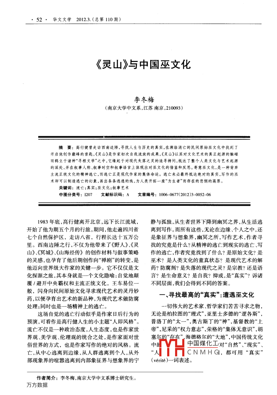 52·華文文學(xué)20123.(總第110期)《靈山》與中國(guó)巫文化李冬梅(南京大學(xué)中文系,江蘇南京,210093)摘要:高行健曾走訪西南邊陲,尋找人生與歷史的真實(shí),在瀕臨消亡的民間原始巫文化中找到了開啟他創(chuàng)作巔峰的密匙?!鹅`山》是作家初次自我流放的成果?!鹅`山》以其對(duì)文化藝術(shù)的真正起源的觸碰而鶴立于諸種“尋根文學(xué)”之中,它緣起于對(duì)現(xiàn)代失落之炅的追尋拷問(wèn),抵達(dá)了整個(gè)人類文化與藝術(shù)起源的深處,并在敘事人稱、敘事時(shí)空和敘事語(yǔ)言上體現(xiàn)出對(duì)巫文化的借鑒和反思。寄意巫文化,是一種背棄主流正統(tǒng)文化的精神逃亡,而逃亡正是現(xiàn)代作家的集體命運(yùn)。逃亡未必最終抵達(dá)絕對(duì)的真實(shí),寫作的巫術(shù)卻可以制造逃亡的幻象,畫出條條逃逸的線,為人類開拓一座“為生者”而存在的悲憫的高原。關(guān)鍵詞:流亡;真實(shí);巫文化;敘事藝術(shù)中圖分類號(hào):D207文獻(xiàn)標(biāo)識(shí)碼:A文章編號(hào):1006-0677(2012)3-0052-061983年底,高行健離開北京,遠(yuǎn)下長(zhǎng)江流域,靜與孤獨(dú),從生者世界下降到幽冥之界,從生活逃開始了他為期五個(gè)月的行旅。期間,他走遍四川省離到寫作。而所有這些,無(wú)論在邊緣、個(gè)人之中,還七個(gè)自然保護(hù)區(qū),走訪八省,行程長(zhǎng)達(dá)十五萬(wàn)公是象征界與想象界,幽冥之所,寫作藝術(shù),作者尋里。西南邊陲之行,不僅為他帶來(lái)了《野人》、《靈找的究竟是什么?從精神的逃亡到現(xiàn)實(shí)的逃亡、寫山》、《冥城》、《山海經(jīng)傳》的創(chuàng)作材料與敘事策略作的逃亡,作者究竟找到了什么?是原始文化?是的靈感,也孕育了他后期創(chuàng)作向“禪”的轉(zhuǎn)變,是巫術(shù)?是人類文化的童真狀態(tài)?是現(xiàn)代藝術(shù)的解他邁向世界級(jí)大作家的關(guān)鍵一步。它不僅僅是文藥?防腐劑?是失落的現(xiàn)代之靈?是宗教?還是語(yǔ)化探源之旅,其本身就是一個(gè)文化隱喻:自覺(jué)地顛言?是生命意義?是自我?抑或,是“真實(shí)”?訴諸覆/避開中央霸權(quán)和主流正統(tǒng)文化,王車易位一不同層面,我們會(huì)得到不同的答案。般,閃身向民間原始文化尋求現(xiàn)代藝術(shù)的靈丹妙藥,以便孕育出藝術(shù)的新品種,為現(xiàn)代藝術(shù)做防腐尋找最高的“真實(shí)”:遭遇巫文化處理;同時(shí)也是一場(chǎng)精神上的逃亡。一切偉大的藝術(shù)家、哲學(xué)家們苦苦尋求之物,這場(chǎng)自覺(jué)的逃亡行動(dòng)似乎是作家日后行為的無(wú)論是柏拉圖的“理式”,亞里士多德的“邏各斯”,預(yù)演,可看作是高行健人生的小主題“人即風(fēng)格”。普洛丁的“太一”,奧古斯丁的“神”,基督教的“上流亡不僅是一種政治態(tài)度,人生態(tài)度,也是作家世帝”,尼采的“權(quán)力意志”,榮格的“集體無(wú)意識(shí)”,胡界觀、美學(xué)觀、倫理觀的統(tǒng)合之處,是作家面對(duì)世塞爾的“在在”海德格爾的“大地”,中國(guó)傳統(tǒng)文化俗世界的方式,也是作家寫作的絕對(duì)的風(fēng)格。流中的中國(guó)煤化工對(duì)“自然”、“現(xiàn)實(shí)”、亡,從中心逃離到邊緣,從人群逃離到個(gè)人,從外“人CNMHG,都可用“真實(shí)部現(xiàn)象界的喧囂逃離到內(nèi)部象征界與想象界的寧( verte)-詞表述。作者簡(jiǎn)介:李冬梅,南京大學(xué)中文系博士研究生。《靈山》與中國(guó)巫文化·53·真實(shí)”屬于西方文化的形而上學(xué)傳統(tǒng)是形問(wèn)“如今這些村鎮(zhèn)還在不在?”這些有靈的村而上欲望的“客體”。文學(xué)進(jìn)人現(xiàn)代主義以來(lái),“真鎮(zhèn),有靈的文化,有靈的男女,還在不在?整部《靈實(shí)”被賦予了完全倒置的含義。如卡夫卡認(rèn)為世俗山》緣起于對(duì)失落的現(xiàn)代中國(guó)之靈的追尋與拷問(wèn)意義上的“現(xiàn)實(shí)”生活才是不“真實(shí)”的;所謂的“真《靈山》起源于1983年底開始的漫游,從實(shí)”并不存在,只是一種“幻象”??ǚ蚩ㄏ饬恕罢?984年寫起,到1989年高行健定居法國(guó)才告殺實(shí)”的概念,使“真實(shí)”成為幻象,同時(shí)也使幻象成青,寫作時(shí)間恰好與在八十年代中期大熱的“尋根為真實(shí)。事實(shí)上,所有偉大的藝術(shù)家都是如此堅(jiān)守文學(xué)”吻合?!鹅`山》究競(jìng)與當(dāng)時(shí)風(fēng)行國(guó)內(nèi)的“尋根著一種“詩(shī)”的、更高的“真實(shí)”,以此與外部世界的文學(xué)”有何不同,以致成為高行健獲諾貝爾文學(xué)獎(jiǎng)菲利士”相對(duì)抗,并賦予自己的創(chuàng)作以永恒的價(jià)的決勝之作?倘若我們能夠排除“東方主義”殖民值。基于如此“真實(shí)觀”,卡夫卡為筆下人物畫出的主義等政治性解讀,集中對(duì)高行健創(chuàng)作的美學(xué)價(jià)是一個(gè)走不出的怪圈?!爸挥袕膬?nèi)部才能維護(hù)住自值和藝術(shù)觀念進(jìn)行考察,不難發(fā)現(xiàn),《靈山》正是以己并且使世界保持平靜和真實(shí)”,這種在一個(gè)荒誕其對(duì)文化藝術(shù)的真正起源的觸碰而鶴立于諸種現(xiàn)實(shí)中得以自我釋放,居守作為個(gè)體的“存在”本“尋根文學(xué)”之中,它超越了浮光掠影的風(fēng)光記載、身的途