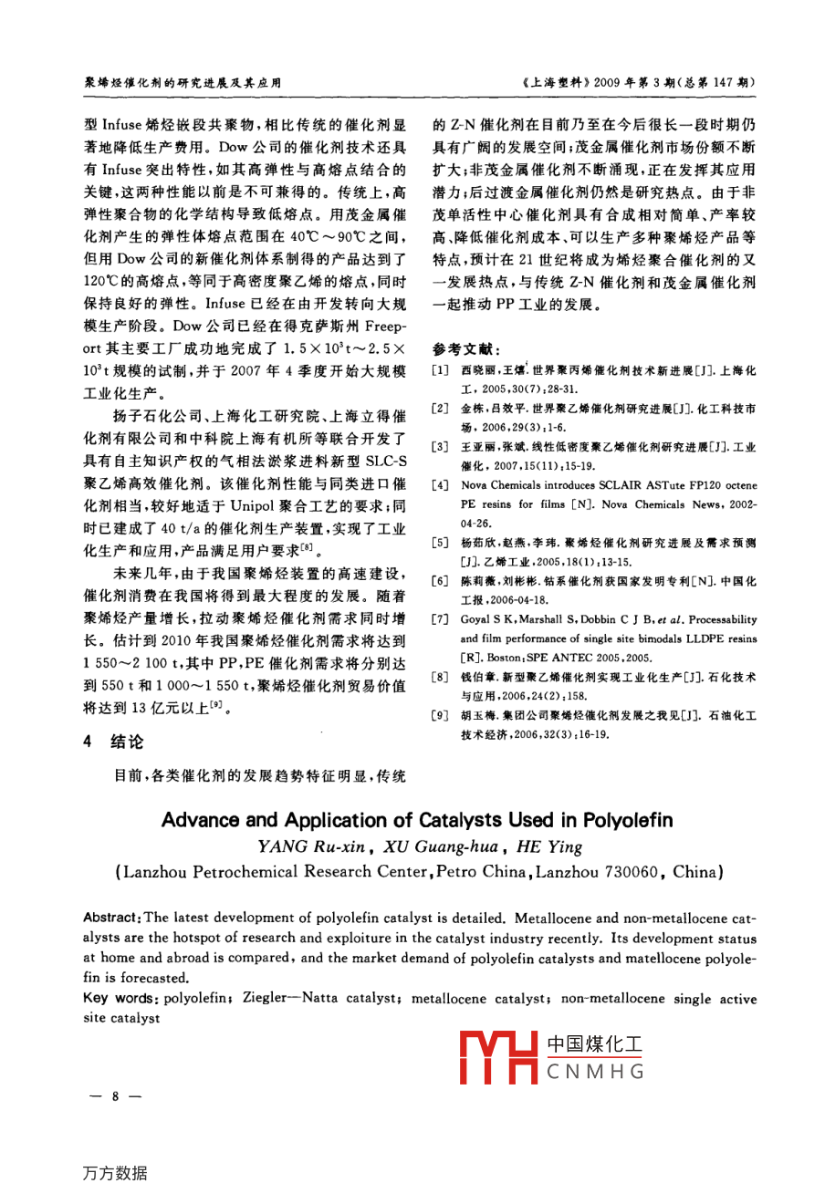 聚烯烴催化劑的研究進(jìn)展及其應(yīng)用《上海塑料》2009年第3期(總第147期)楊茹欣,徐光華,何穎(中國(guó)石油蘭州化工研究中心,甘肅蘭州730060)摘要闌述了聚烯烴催化劑的最新進(jìn)展。 茂及非茂催化劑是當(dāng)前催化劑行業(yè)研究和開發(fā)的熱點(diǎn)。對(duì)國(guó)內(nèi)外該領(lǐng)域的發(fā)展現(xiàn)狀進(jìn)行了對(duì)比,并對(duì)聚烯烴催化劑及茂金屬聚烯烴的市場(chǎng)需求進(jìn)行了預(yù)測(cè)。關(guān)鍵詞聚烯烴; Z-N催化劑;蔑金屬催化劑;非茂單中心催化劑中圖分類號(hào):TQ 325. 1文獻(xiàn)標(biāo)識(shí)碼:A文章編號(hào):1009-5993(2009)03- 0006-03聚烯烴是合成樹脂中產(chǎn)量最大、用途最廣的高聚乙烯裝置。381 萬t/a的裝置于2001年投產(chǎn),第分子材料;催化劑則是生成聚烯烴的核心。伴隨著- -批新產(chǎn)品為Sclair ASTute FP120系列的5種優(yōu)聚烯烴工業(yè)的發(fā)展,聚烯烴催化劑也經(jīng)歷了一次次質(zhì)辛烯-LLDPE薄膜,顯示出優(yōu)良的耐落鏢沖擊、成功改進(jìn),到目前已形成齊格勒-納塔催化劑(Z-N耐穿刺性、良好的抗撕強(qiáng)度、密封能力和光學(xué)催化劑)茂金屬催化劑、后過渡金屬催化劑等多種性[2。Nova公司還和BP公司合作開發(fā)出Nova-催化劑共同發(fā)展的格局,不斷推動(dòng)著聚烯烴工業(yè)高cat系列具有單一活性中心的z-N催化劑,用于氣速發(fā)展。相PE裝置生產(chǎn)LLDPE0.由大慶化工研究中心開發(fā)研制的聚丙烯球形1Z-N催化劑催化劑工業(yè)試產(chǎn)成功,共生產(chǎn)了兩個(gè)批次5.62t聚Z-N催化劑是在高活性、高定向性的基礎(chǔ)上向丙烯產(chǎn)品,且全部合格。聚丙烯球型催化劑長(zhǎng)期依系列化、高性能化發(fā)展,開發(fā)的性能更好的新產(chǎn)品。靠進(jìn)口局面由此改變。該催化劑具有工藝控制穩(wěn)自20世紀(jì)90年代以來,美國(guó)、日本和西歐等國(guó)主定、活性釋放平穩(wěn),生產(chǎn)的聚合物形態(tài)好.細(xì)粉含量要PP生產(chǎn)商將大部分研究工作集中于該類催化低、堆積密度高等優(yōu)點(diǎn)。由于催化劑中活性金屬含劑體系的改進(jìn)上。Basel 公司在采用鄰苯二甲酸酯量低,不僅降低了活化劑和外給電子體的用量,而作為給電子體的第4代催化劑基礎(chǔ)上,開發(fā)了以二且降低了聚合物的生產(chǎn)成本,減少了聚合物的醚作為給電子體的第5代新型Z-N催化劑,催化活灰分。性高達(dá)90 kg/g(以1g催化劑生產(chǎn)的PP的質(zhì)量計(jì))。Brelis 公司開發(fā)出一種適用于其 Borsaer 2茂金屬催化劑雙峰工藝的專用Z-N催化劑BCI,既能生產(chǎn)相對(duì)分目前,全球許多有實(shí)力的聚烯烴生產(chǎn)廠家都在子質(zhì)量分布很窄的單峰產(chǎn)品,也能生產(chǎn)相對(duì)分子質(zhì)加速開發(fā)茂金屬催化劑技術(shù),并使之工業(yè)化。其中量分布很寬的雙峰產(chǎn)品(包括均聚物和無規(guī)共聚Exxon,三井石化,Dow公司是申請(qǐng)專利最多的公物)。目前,這種催化劑已經(jīng)在Borealis公司現(xiàn)有司。用茂金屬催化劑生產(chǎn)共聚PP是最近一個(gè)重的PP裝置上得到工業(yè)化應(yīng)用。該公司還成功開要的發(fā)展方向。采用茂金屬催化劑可以合成出許發(fā)出第二代催化劑BCI 10。多Z-N催化劑難于合成的新型丙烯共聚物,如丙Nova化學(xué)公司開發(fā)出先進(jìn)的SclartechZ-N烯-苯乙烯的無規(guī)和嵌段共聚物,丙烯與長(zhǎng)鏈烯烴、催化劑,將其用于Jofre,Alberta的Unipol氣相法環(huán)烯烴及二烯烴的共聚物等。用茂金屬催化劑生中國(guó)煤化工機(jī)插入性很好,可收稿日期:200806-12作者筒介:楊茹欣(1979- -) ,女,從事信息研究與咨詢工作。以制TH共聚物,有潛力開發(fā)出.. C.NMH Gxon公司采用雙一6-聚烯烴催化劑的研究進(jìn)展及其應(yīng)用《上海塑料) 2009年第3期(總第147期)茂金屬催化劑在單反應(yīng)器中制備了雙峰分布的丙手性可調(diào)節(jié)性;(4)形成的M-C鍵容易極化。烯~乙烯共聚物。其加工溫度比常用的共聚PP的最近幾年非茂有機(jī)金屬烯烴聚合催化劑的研加工溫度更寬(約15C) ,克服了單峰茂金屬PP究已從金屬中心為前過渡金屬(第N副族)轉(zhuǎn)移到的樹脂加工溫度范圍窄的缺點(diǎn),在生產(chǎn)PP薄膜時(shí)后過渡金屬,如鎳(II),鈀(II),鐵lI),鈷(II)和釕.拉伸更均勻,不易破裂,可以在低于傳統(tǒng)PP的加(I])等,如圖1所示。相對(duì)前過渡金屬而言,后過工溫度下生產(chǎn)性能良好的PP薄膜。Basell 公司介渡金屬具有較低的親氧性,易與- -些含有官能團(tuán)的紹了其正在開發(fā)的茂金屬基PP材料(商品名為有機(jī)化合物配位,如含氮、磷元素的有機(jī)化合物。Metocene)是- -種無規(guī)多相共聚物。它具有優(yōu)異的抗沖擊強(qiáng)度、透明性以及柔軟性。據(jù)預(yù)計(jì),該材料.1年以后可實(shí)現(xiàn)商業(yè)化,其應(yīng)用領(lǐng)域?yàn)樽⑺艹尚虳VD盒子以及較厚薄膜的吹塑成型。Ph-IN- -Ph /MAO中國(guó)石化科技開發(fā)部開發(fā)了金屬有機(jī)化學(xué)的合成新方法。首次提出“茂金屬加合物”的概念,屬B原創(chuàng)性知識(shí)創(chuàng)新和實(shí)用性技術(shù)創(chuàng)新,獲得中國(guó)專利授權(quán),同時(shí)也在美國(guó)、歐洲獲得專利授權(quán)。2006 年9月,茂金屬催化劑在齊魯分公司直徑400 mm氣Fig 1 dimine complex相流化床上進(jìn)行了長(zhǎng)達