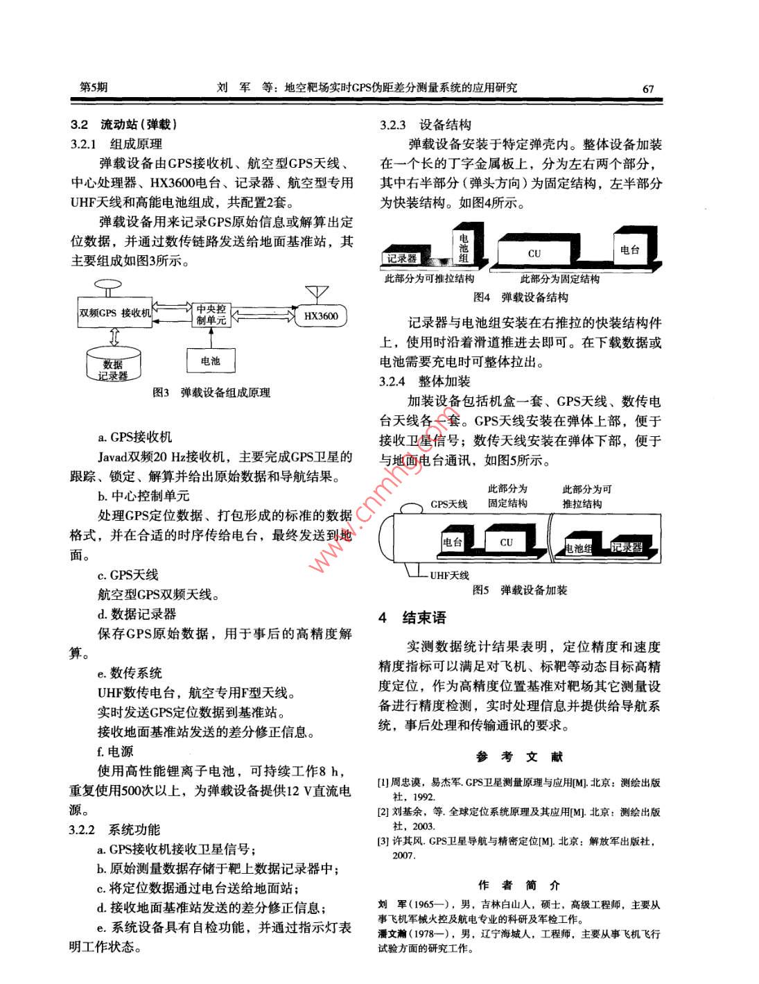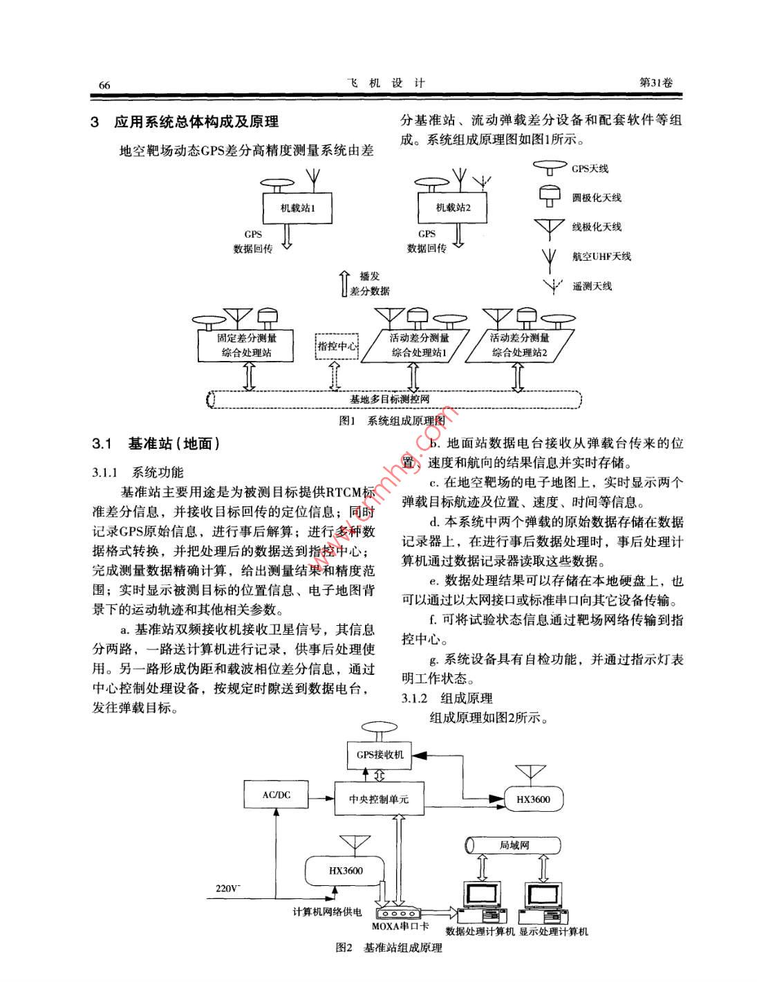 第31卷第5期飛機設(shè)計Vol 31 No 52011年10月AIRCRAFT DESIGNOct 2011文章編號:1673-4599(2011)05-006404地空靶場實時GPS偽距差分測量系統(tǒng)的應(yīng)用研究劉軍,潘文瀚2(1.海軍駐沈陽地區(qū)航空軍代表室,遼寧沈陽110034(2沈陽飛機工業(yè)(集團)有限公司,遼寧沈陽110034)摘要:地空靶場實時GPS差分高精度測量系統(tǒng)是當(dāng)代飛機飛行試驗中解決火控系統(tǒng)標(biāo)校、測控系統(tǒng)校飛或?qū)椢淦飨到y(tǒng)精度試驗等問題的有效手段,是地空靶場測控系統(tǒng)的重要組成部分。本文基于偽距觀測量的GPS實時差分定位的原理以及對數(shù)學(xué)模型的分析,論述了將GPS實時定位技術(shù)應(yīng)用于地空靶場中機載或彈載導(dǎo)航系統(tǒng)的實現(xiàn)方法。文中詳細(xì)的規(guī)劃了基準(zhǔn)站和移動站以及它們之間實時互訪的構(gòu)建方案。關(guān)鍵詞:差分GPS(DCFS);實時測量;偽距;地空靶場試驗中圖分類號:V264.3文獻(xiàn)標(biāo)識碼:AStudying about application of Real Time GPs Measuring Systemby False Distance in the Shooting Range of Ground and SkyLIU Jun Pan Wen-han(1. Aeronautical Military Commissary Office of Navy in Shengyang RegionShenyang 110034, China(2. Shenyang Aircraft Industries( group)Co. Ltd, Shenyang 110034, ChinaAbstract The real time differential GPS measuring system in the shooting range of ground and sky isthe valid instrument for solving the problem for example marking the system of firepower controling,flying checking about the system of measuring and controlling or the precision test of missilesystem, and is the important composition in system of measuring and controlling of the shootingrange of ground and sky. This design and fabrication introduces the way of realization of using thetechnology of GPs real time positioning in the system of navigation carried by airplane or missile inthe shooting range of ground and sky based on the principle of real time GPS measuring system byfalse distance in the shooting range of ground and sky and also the analyzing of maths model. Layoutthe project of building the fiducial station and movement station and also real time exchange visitsbetween themKey words: differential GPS( DGPS ) real time measing; false distance test about shooting rangeof ground and sky現(xiàn)代地空靶場試驗中經(jīng)常完成以下測量任測量設(shè)備精度驗收、火控系統(tǒng)的標(biāo)校和測控系統(tǒng)務(wù):導(dǎo)彈武器系統(tǒng)精度試驗、空中靶標(biāo)測量的校飛。這些項目要求本系統(tǒng)既能夠?qū)︼w機、標(biāo)收稿日期:201008-31;修訂日期:2011-07-13劉軍等:地空靶場實時GPS偽距差分測量系統(tǒng)的應(yīng)用研究靶等動態(tài)目標(biāo)髙精度定位,又作為髙精度位置基要求不高,可以忽略不計。忽略衛(wèi)星星歷的誤準(zhǔn)對靶場其它測量設(shè)備進(jìn)行精度檢測,同時還具差,將由廣播星歷所得的衛(wèi)星坐標(biāo)作為已知值有強大的信息實時處理、事后處理和傳輸通訊能由上述改正之后,式(1)中的未知數(shù)只有測站坐力。地空靶場實時GPS差分高精度測量系統(tǒng)是解標(biāo)x,y,z和接收機鐘差,則只需觀測4顆衛(wèi)星就決以上問題的有效手段,是地空靶場測控系統(tǒng)的可解出這4個未知數(shù)。將觀測方程繞測點近似坐標(biāo)重要組成部分。本文采用測碼偽距觀測量進(jìn)行實進(jìn)行線性化,將觀測歷元所有的觀測量寫成矩陣時GPS定位。偽距單點定位精度較低,使用P碼形式(或Y碼)的精密定位服務(wù)(PPS),只有美國軍L +V=AX(4)方及特許用戶使用。使用C/A碼的標(biāo)準(zhǔn)定位服務(wù)式中:L為觀測值向量;V為改正數(shù)向量;X為未(SPs),精度在30m左右。美國為自身的安全利知數(shù)向量(XYZ6T);A為相應(yīng)的系數(shù)矩陣。設(shè)所益,采取選擇可用性政策(SA),利用CA碼的平有的偽距觀測量為等精度,權(quán)陣設(shè)為單位陣。面定位精度降到約100m,垂直誤差約150m,使當(dāng)觀測量n<4時,無解;許多導(dǎo)航定位不能采用C/A碼偽距單點定位技術(shù)。n=4時,有唯一解X=AL為提高定位精度,必須采用差分定位技術(shù),因為m>4時,有最小二乘解X=(AA)ALSA政策對差分法可認(rèn)為沒有影響,因而基于偽距當(dāng)測站坐標(biāo)的初始值誤差較大時,可采用迭觀測值的差分法定位,近年來成為國內(nèi)外研究的代法求解。課題。22實時差分法動態(tài)定位動態(tài)相對定位是采用2臺GPS接收機。一臺接2動態(tài)定位的數(shù)學(xué)模型收機在已知點上固定,稱為參考站;一臺接收機21單點動態(tài)定位安置在運動載體上,稱為流動站。參考站和流動GPS定位的原理可敘述如下。將運動的衛(wèi)星站同步觀測視場中的衛(wèi)星,確定流動站與參考站作為已知點。設(shè)T為衛(wèi)星發(fā)射信號時的理想GPS之間的瞬時位置。具體實現(xiàn)DPS有4種方法:時刻;T為接收機收到信號的GPS時刻;ST為接①基準(zhǔn)站發(fā)播偽距校正,在流動站上處理;收機時鐘誤差;67為衛(wèi)星時鐘誤差;則考慮鐘差③基準(zhǔn)站發(fā)播位置校正,在流動站上處理的傳播時間為:③用戶粗測偽距值送基準(zhǔn)站,在基準(zhǔn)站進(jìn)行△=(768+7)-(Tms+67“)=(T-Tm)+8T6-67°差分處理再考慮電離層折射對測距的影響δ和對流層④用戶未校正的位置數(shù)據(jù)送基準(zhǔn)站,在基準(zhǔn)折射對測距的影響6,最后得衛(wèi)星至接收機的偽站進(jìn)行差分處理。距為我們選擇了第1種實現(xiàn)方式。動態(tài)相對定位P=C·(7-Tas)+C.0-C.8°+80、(1