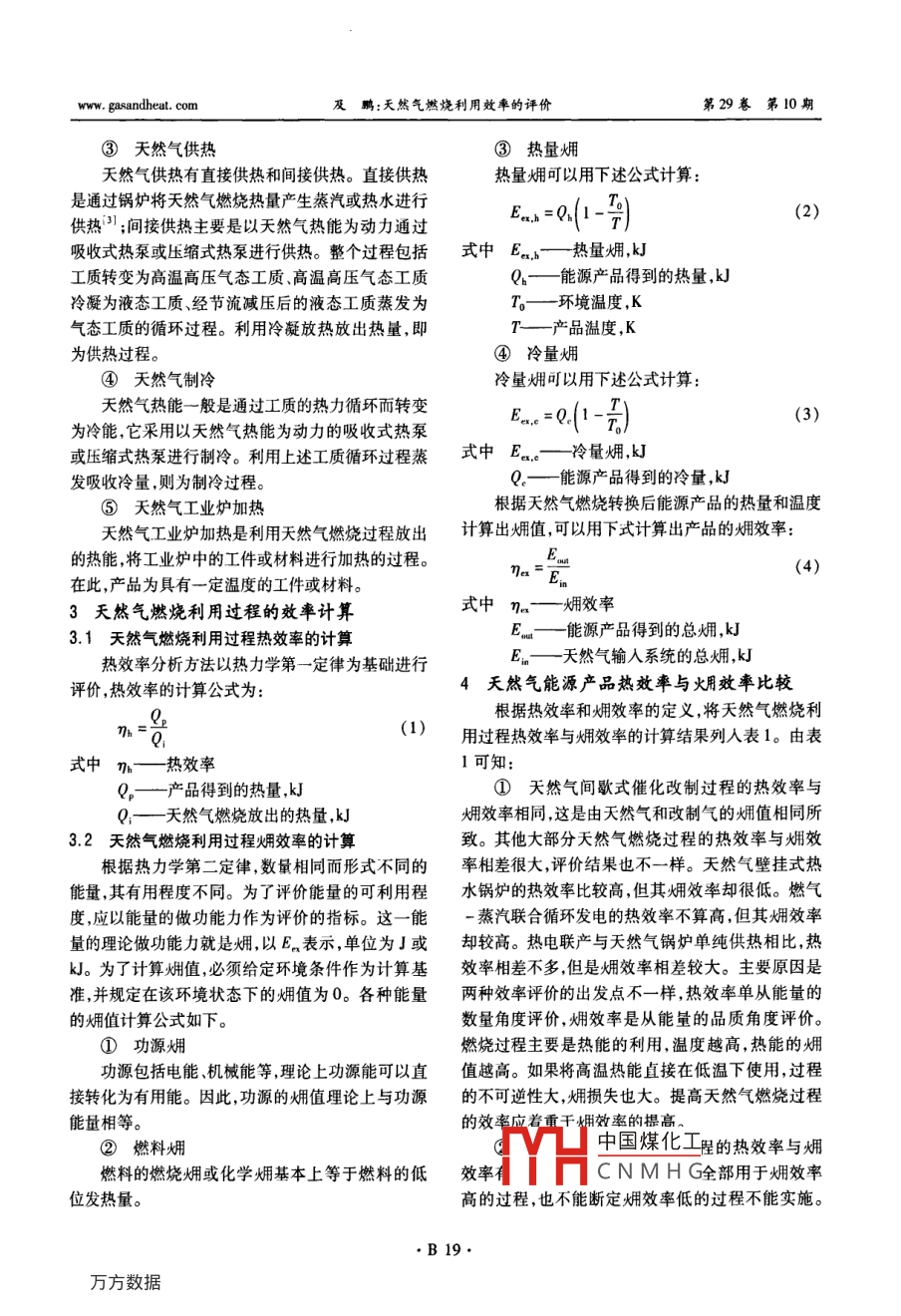 第29卷第10期煤氣與熱力Vol 29 No 102009年10月Gas heatOct.2009燃?xì)馊紵c應(yīng)用咚 Saa天然氣燃燒利用效率的評(píng)價(jià)及鵬(中國(guó)市政工程華北設(shè)計(jì)研究總院,天津300074)摘要:分析了天然氣燃燒應(yīng)用過(guò)程的類型,論迷了天然氣燃燒利用過(guò)程的熱效率和灲效率的計(jì)算方法,比較了天然氣燃燒應(yīng)用過(guò)程熱效率與效率。關(guān)鍵詞:天然氣利用;燃燒;效率評(píng)價(jià);熱效率;煙效率中圖分類號(hào):TU996文獻(xiàn)標(biāo)識(shí)碼:B文章編號(hào):1000-4416(2009)10-0B18-03Evaluation of Utilization Efficiency of Natural Gas CombustionJI PeAbstract: The types of natural gas combustion applications are analyzed. The calculation methodsof thermal efficiency and exergy efficiency during natural gas combustion applications are discussed. Thethermal efficiency and exergy efficieney during natural gas combustion applications are comparedKey words: natural gas utilization; combustion; efficiency evaluation; thermal efficiency;1概述①天然氣改制近年來(lái)隨著天然氣的大量使用,天然氣的應(yīng)用天然氣改制是利用天然氣燃燒產(chǎn)生的熱能為天技術(shù)發(fā)展很快,出現(xiàn)了許多新型技術(shù)。為了選擇優(yōu)然氣改制提供熱源進(jìn)行天然氣水蒸氣改制得到與化的天然氣利用方案,首先要對(duì)天然氣應(yīng)用過(guò)程的現(xiàn)有城市燃?xì)馊紵阅芟喈?dāng)?shù)娜細(xì)?可直接用于現(xiàn)效率進(jìn)行評(píng)價(jià)。有的城市燃?xì)庠O(shè)施。該技術(shù)屬于天然氣調(diào)質(zhì)技術(shù)的天然氣作為一次能源,通過(guò)燃燒或部分燃燒可種以轉(zhuǎn)化為二次能源產(chǎn)品電能、城市燃?xì)狻⒖照{(diào)用冷②天然氣發(fā)電能、供暖用熱能、生活熱水等。為了對(duì)天然氣應(yīng)蒸汽透平發(fā)電是用天然氣燃燒熱在鍋爐中產(chǎn)生用過(guò)程的效率進(jìn)行評(píng)價(jià),需要計(jì)算天然氣能量的轉(zhuǎn)高壓蒸汽作為工作介質(zhì),通過(guò)熱力循環(huán)將蒸汽壓力化效率。過(guò)去主要采用熱效率來(lái)進(jìn)行考核,由于不能轉(zhuǎn)化為機(jī)械能進(jìn)行發(fā)電的過(guò)程;燃?xì)廨啓C(jī)發(fā)電是同熱能產(chǎn)品的做功能力不同,因此還應(yīng)該采用反映利用天然氣與空氣燃燒產(chǎn)生的高壓高溫燃燒氣體直能源品質(zhì)的娳效率來(lái)考核。下面主要探討天然氣接作為工作介質(zhì)進(jìn)行熱力循環(huán)而發(fā)電;天然氣-蒸燃燒應(yīng)用過(guò)程二次能源產(chǎn)品的評(píng)價(jià)。汽聯(lián)合循環(huán)發(fā)電是將上述兩種循環(huán)結(jié)合起來(lái),先將2天然氣燃燒應(yīng)用過(guò)程天然氣與空氣燃燒產(chǎn)生的高壓高溫燃燒氣體通過(guò)燃天然氣燃燒應(yīng)用除烹飪用以外,主要有下述種氣輪機(jī)進(jìn)行發(fā)電,然后將高溫?zé)煔馔ㄟ^(guò)余熱鍋爐產(chǎn)類生中國(guó)煤化工°CNMHG基金項(xiàng)目:國(guó)家科技支撐計(jì)劃課題(2006BA03B02)18www.gasandheat.com及鵬:天然氣然燒利用效率的評(píng)價(jià)第29卷第10期③天然氣供熱③熱量嫻天然氣供熱有直接供熱和間接供熱。直接供熱熱量可以用下述公式計(jì)算是通過(guò)鍋爐將天然氣燃燒熱量產(chǎn)生蒸汽或熱水進(jìn)行T供熱;間接供熱主要是以天然氣熱能為動(dòng)力通過(guò)ER,h=Q. 1吸收式熱泵或壓縮式熱泵進(jìn)行供熱。整個(gè)過(guò)程包括式中EaA—熱量工質(zhì)轉(zhuǎn)變?yōu)楦邷馗邏簹鈶B(tài)工質(zhì)、高溫高壓氣態(tài)工質(zhì)Q—能源產(chǎn)品得到的熱量,k冷凝為液態(tài)工質(zhì)、經(jīng)節(jié)流減壓后的液態(tài)工質(zhì)蒸發(fā)為T——環(huán)境溫度,K氣態(tài)工質(zhì)的循環(huán)過(guò)程。利用冷凝放熱放出熱量,即7—產(chǎn)品溫度,K為供熱過(guò)程。④冷量娳④天然氣制冷冷量可以用下述公式計(jì)算天然氣熱能一般是通過(guò)工質(zhì)的熱力循環(huán)而轉(zhuǎn)變Ere =Q為冷能,它采用以天然氣熱能為動(dòng)力的吸收式熱泵或壓縮式熱泵進(jìn)行制冷。利用上述工質(zhì)循環(huán)過(guò)程蒸式中Ea?!淞快?好發(fā)吸收冷量,則為制冷過(guò)程。Q—能源產(chǎn)品得到的冷量,kJ⑤天然氣工業(yè)爐加熱根據(jù)天然氣燃燒轉(zhuǎn)換后能源產(chǎn)品的熱量和溫度天然氣工業(yè)爐加熱是利用天然氣燃燒過(guò)程放出計(jì)算出值可以用下式計(jì)算出產(chǎn)品的姐效率:的熱能,將工業(yè)爐中的工件或材料進(jìn)行加熱的過(guò)程。在此,產(chǎn)品為具有一定溫度的工件或材料。3天然氣燃燒利用過(guò)程的效率計(jì)算式中η—效率3.1天然氣燃燒利用過(guò)程熱效率的計(jì)算能源產(chǎn)品得到的總,kJ熱效率分析方法以熱力學(xué)第一定律為基礎(chǔ)進(jìn)行Em天然氣輸人系統(tǒng)的總,J評(píng)價(jià),熱效率的計(jì)算公式為4天然氣能源產(chǎn)品熱效率與火用效率比較根據(jù)熱效率和娳效率的定義,將天然氣燃燒利(1)用過(guò)程熱效率與嫻效率的計(jì)算結(jié)果列入表1。由表式中熱效率1可知:Q—產(chǎn)品得到的熱量,kJ①天然氣間歇式催化改制過(guò)程的熱效率與Q天然氣燃燒放出的熱量,kJ效率相同,這是由天然氣和改制氣的娳值相同所3.2天然氣燃燒利用過(guò)程嫻效率的計(jì)算致。其他大部分天然氣燃燒過(guò)程的熱效率與娳效根據(jù)熱力學(xué)第二定律,數