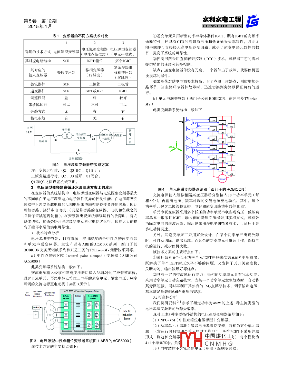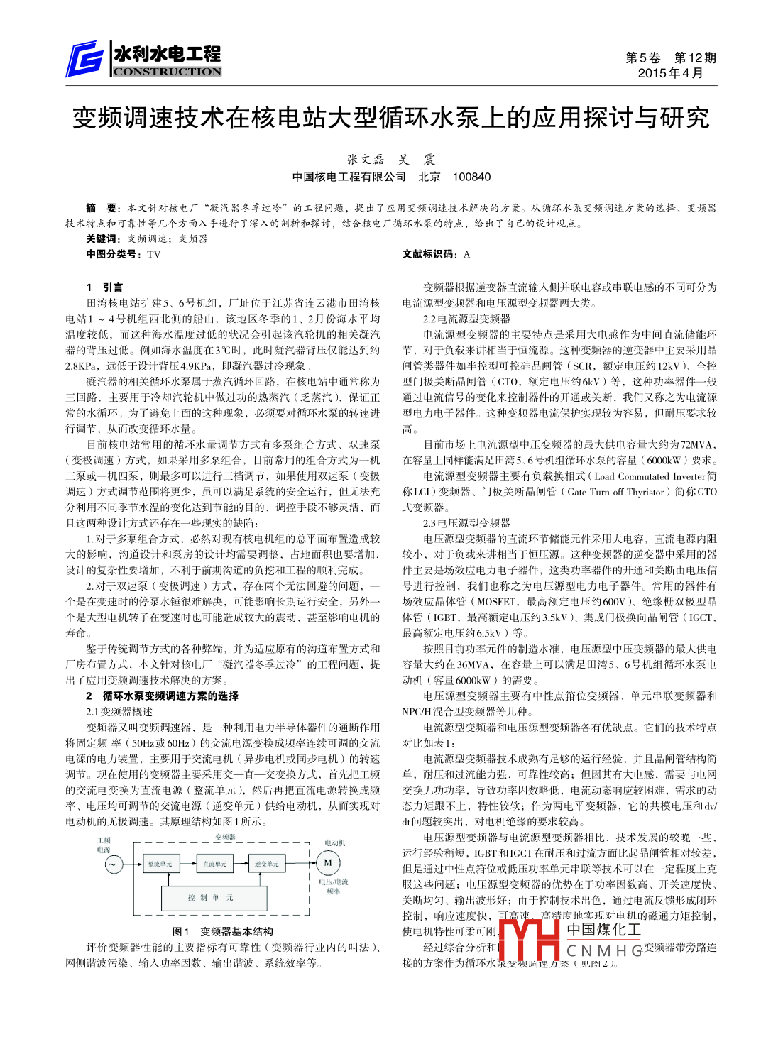 水利水電工程第5卷第12期匠|ICONSTRUCTION2015年4月變頻調(diào)速技術(shù)在核電站大型循環(huán)水泵上的應(yīng)用探討與研究張文磊吳震中國核電工程有限公司北京100840摘要:本文針對(duì)核電廠“凝汽器冬季過冷”的工程問題,提出了應(yīng)用變頻調(diào)速技術(shù)解決的方案。從循環(huán)水泵變頻調(diào)速方案的選擇、變頻器技術(shù)特點(diǎn)和可靠性等幾個(gè)方面入手進(jìn)行了深入的剖析和探討,結(jié)合核電廠循環(huán)水泵的特點(diǎn),給出了自己的設(shè)計(jì)觀點(diǎn)。關(guān)鍵詞:變頻調(diào)速;變頻器中圖分類號(hào): TV文獻(xiàn)標(biāo)識(shí)碼: A引言變頻器根據(jù)逆變器直流輸入側(cè)并聯(lián)電容或串聯(lián)電感的不同可分為田灣核電站擴(kuò)建5、6號(hào)機(jī)組,廠址位于江蘇省連云港市田灣核電 流源型變頻器和電壓源型變頻器兩大類。電站1 ~ 4號(hào)機(jī)組西北側(cè)的船山,該地區(qū)冬季的1、2月份海水平均2.2電流源型變頻器溫度較低,而這種海水溫度過低的狀況會(huì)引起該汽輪機(jī)的相關(guān)凝汽電流源型變頻器的主要特點(diǎn)是采用大電感作為中間直流儲(chǔ)能環(huán)器的背壓過低。例如海水溫度在39C時(shí),此時(shí)凝汽器背壓僅能達(dá)到約節(jié), 對(duì)于負(fù)載來講相當(dāng)于恒流源。這種變頻器的逆變器中主要采用晶2.8KPa,遠(yuǎn)低于設(shè)計(jì)背壓4.9KPa,即凝汽器過冷現(xiàn)象。閘管類器件如半控型可控硅晶閘管(SCR,額定電壓約12kV).全控凝汽器的相關(guān)循環(huán)水泵屬于蒸汽循環(huán)回路,在核電站中通常稱為型i ]極關(guān)斷晶閘管(GTO,額定電壓約6kV)等,這種功率器件- -般三回路,主要用于冷卻汽輪機(jī)中做過功的熱蒸汽(乏蒸汽),保證正通 過電流信號(hào)的變化來控制器件的開通或關(guān)斷,我們又稱之為電流源常的水循環(huán)。為了避免上面的這種現(xiàn)象,必須要對(duì)循環(huán)水泵的轉(zhuǎn)速進(jìn)型電 電子器件。這種變頻器電流保護(hù)實(shí)現(xiàn)較為容易,但耐壓要求較行調(diào)節(jié),從而改變循環(huán)水量。目前核電站常用的循環(huán)水量調(diào)節(jié)方式有多泵組合方式、雙速泵目前市場(chǎng)上電流源型中壓變頻器的最大供電容量大約為72MVA,(變極調(diào)速)方式,如果采用多泵組合,目前常用的組合方式為一機(jī)在容量 上同樣能滿足田灣5、6號(hào)機(jī)組循環(huán)水泵的容量(000kW )要求。三泵或- -機(jī)四泵,則最多可以進(jìn)行三檔調(diào)節(jié),如果使用雙速泵(變極電流源型變頻器主要有負(fù)載換相式(LoadCommutatedInverter簡調(diào)速)方式調(diào)節(jié)范圍將更少,雖可以滿足系統(tǒng)的安全運(yùn)行,但無法充稱LCI) 變頻器、門極關(guān)斷晶閘管( Gate Tum off Thyristor)簡稱GTO分利用不同季節(jié)水溫的變化達(dá)到節(jié)能的目的,調(diào)控手段不夠靈活,而式變頻器。且這兩種設(shè)計(jì)方式還存在- -些現(xiàn)實(shí)的缺陷:2.3電壓源型變頻器1.對(duì)于多泵組合方式,必然對(duì)現(xiàn)有核電機(jī)組的總平面布置造成較電壓源型變頻器的直流環(huán)節(jié)儲(chǔ)能元件采用大電容,直流電源內(nèi)阻大的影響,溝道設(shè)計(jì)和泵房的設(shè)計(jì)均需要調(diào)整,占地面積也要增加,較小, 對(duì)于負(fù)載來講相當(dāng)于恒壓源。這種變頻器的逆變器中采用的器設(shè)計(jì)的復(fù)雜性要增加,不利于前明溝道的負(fù)挖和工程的順利完成。件主要是場(chǎng)效應(yīng)電力電子器件,這類功率器件的開通和關(guān)斷由電壓信2.對(duì)于雙速泵 (變極調(diào)速)方式,存在兩個(gè)無法回避的問題.號(hào)進(jìn)行控制,我們也稱之為電壓源型電力電子器件。常用的器件有個(gè)是在變速時(shí)的停泵水錘很難解決,可能影響長期運(yùn)行安全,另外一場(chǎng)效 應(yīng)晶體管( MOSFET,最高額定電壓約600V )、絕緣柵雙極型晶個(gè)是大型電機(jī)轉(zhuǎn)子在變速時(shí)也可能造成較大的震動(dòng),甚至影響電機(jī)的體管 ( IGBT,最高額定電壓約3.5kV )、集成門極換向晶閘管( IGCT,壽命。最高額定電壓約6.5kV )等。鑒于傳統(tǒng)調(diào)節(jié)方式的各種弊端,并為適應(yīng)原有的溝道布置方式和按照目前功率元件的制造水準(zhǔn),電壓源型中壓變頻器的最大供電廠房布置方式,本文針對(duì)核電廠“凝汽器冬季過冷”的工程問題,提容量大約在36MVA, 在容量上可以滿足田灣5、6號(hào)機(jī)組循環(huán)水泵電出了應(yīng)用變頻調(diào)速技術(shù)解決的方案。動(dòng)機(jī)(容量6000kW )的需要。2循環(huán)水泵變頻調(diào)速方案的選擇電壓源型變頻器主要有中性點(diǎn)箝位變頻器、單元串聯(lián)變頻器和2.1變頻器概述NPC/H混合型變頻器等幾種。變頻器又叫變頻調(diào)速器,是一種利用電力半導(dǎo)體器件的通斷作用電流源型變頻器和電壓源型變頻器各有優(yōu)缺點(diǎn)。它們的技術(shù)特點(diǎn)將固定頻率( 50Hz或60Hz )的交流電源變換成頻率連續(xù)可調(diào)的交流對(duì)比如表1:電源的電力裝置,主要用于交流電機(jī)(異步電機(jī)或同步電機(jī))的轉(zhuǎn)速電流源型變頻器技術(shù)成熟有足夠的運(yùn)行經(jīng)驗(yàn),并且晶閘管結(jié)構(gòu)簡調(diào)節(jié)?,F(xiàn)在使用的變頻器主要采用交- -直一 交變