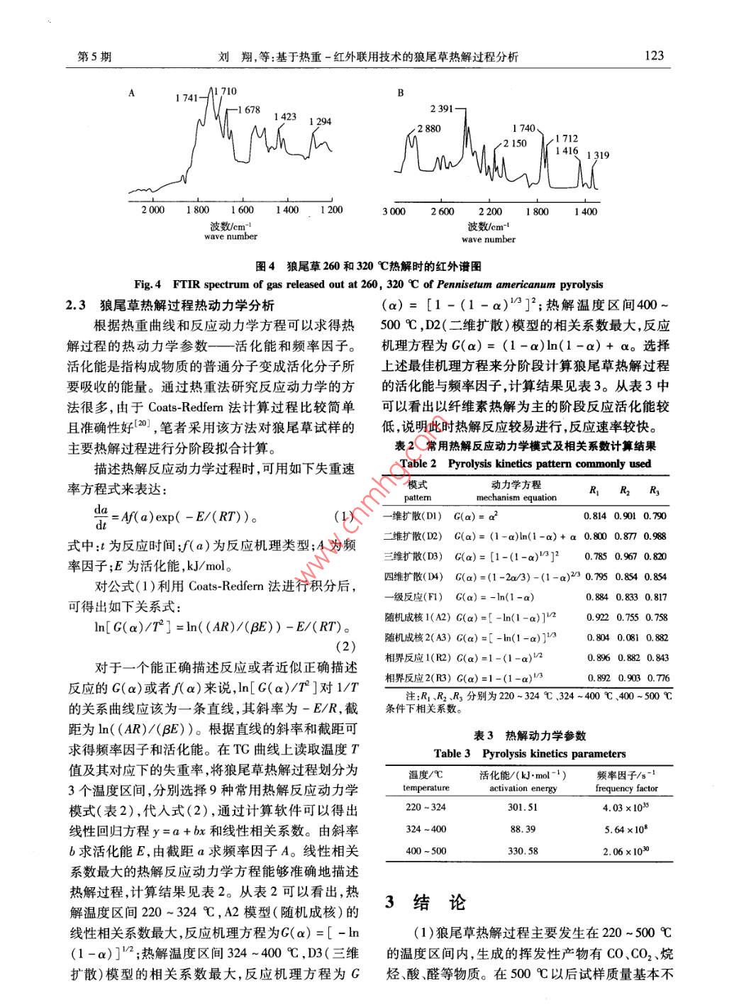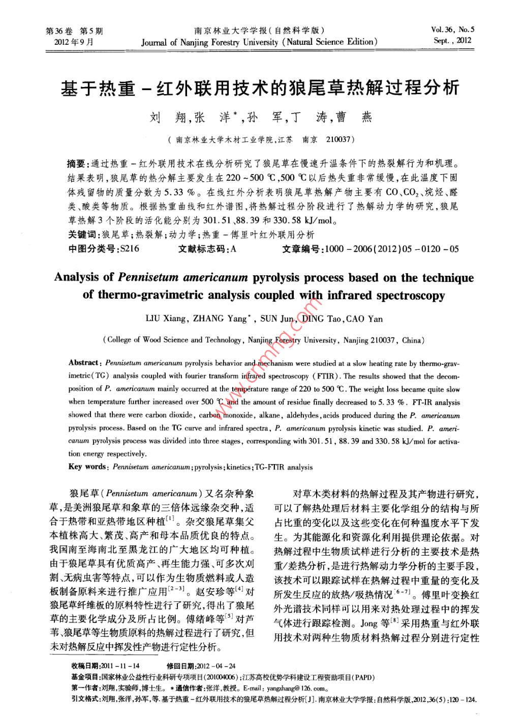 第36卷第5期南京林業(yè)大學學報(自然科學版)Vol. 36, No.52012年9月Joumal of Nanjing Forestry University (Natural Science Edition)Sept. , 2012基于熱重-紅外聯用技術的狼尾草熱解過程分析劉翔,張洋*,孫軍,丁濤,曹燕(南京林業(yè)大學木材工業(yè)學院,江蘇 南京210037)摘要:通過熱重-紅外聯用技術在線分析研究了狼尾草在慢速升溫條件下的熱裂解行為和機理。結果表明,狼尾草的熱分解主要發(fā)生在220~500 C ,500 C以后熱失重非常緩慢,在此溫度下固體殘留物的質量分數為5.33 %。在線紅外分析表明狼尾草熱解產物主要有CO、CO2、烷烴、醛類、酸類等物質。根據熱重曲線和紅外譜圖,將熱解過程分階段進行了熱解動力學的研究,狼尾草熱解3個階段的活化能分別為301.51、88. 39和330. 58 kJ/ mol。關鍵詞:狼尾草;熱裂解;動力學;熱重-傅里葉紅外聯用分析中圖分類號:S216文獻標志碼:A文章編號:1000 - 2006(2012)05 -0120 -05Analysis of Pennisetum americanum pyrolysis process based on the techniqueof thermo-gravimetric analysis coupled with infrared spectroscopyLIU Xiang, ZHANG Yang", sUN Jun, DING Tao , CAO Yan(Colle of Wood Science and Technology , Nanjing Forestry University, Nanjing 210037, China)Abstract: Peniseum americanum pyrolysis behavior and mechanism were studied at a slow heating rate by thermo-grav-imetric(TC) analysis coupled with fourier transform infared spectroscopy (FTIR). The results showed that the decom-position of P. americanum mainly ocrred at the temperature range of 220 to 500 C. The weight loss became quite slowwhen temperature further increased over 500 C and the amount of residue finally decreased to5. 33 %. FT-IR analysisshowed that there were carbon dioxide , carbon monoxide , alkane, aldehydes , acids produced during the P. americanumpyrolysis process. Based on the TG curve and infrared spectra, P. americanum pyrolysis kinetic was studied. P. ameri-canum pyrolysis process was divided into three stages , corresponding with 301.51, 88.39 and 330.58 kJ/ mol for activa-tion energy respectively.Key words: Pennisetum americanum ;pyrolysis ; kinetics ;TG-FTIR analysis狼尾草( Pennisetum americanum)又名雜種象對草木類材料的熱解過程及其產物進行研究,草,是美洲狼尾草和象草的三倍體遠緣雜交種,適可以了解熱處理后材料主要化學組分的結構與所合于熱帶和亞熱帶地區(qū)種植"。雜交狼尾草集父占比重的變化以及這些變化在何種溫度水平下發(fā)本植株高大、繁茂、高產和母本品質優(yōu)良的特點。生。為其能源化和資源化利用提供理論依據。對我國南至海南北至黑龍江的廣大地區(qū)均可種植。熱解過程中生物質試樣進行分析的主要技術是熱由于狼尾草具有優(yōu)質高產、再生能力強、可多次刈重/差熱分析,是進行熱解動力學分析的主要手段,割、無病蟲害等特點,可以作為生物質燃料或人造該技術可以跟蹤試樣在熱解過程中重量的變化及板制備原料來進行推廣應用(2-3]。趙安珍等[4]對所發(fā)生反應的放熱/吸熱情況-”。傅里葉變換紅狼尾草纖維板的原料特性進行了研究,得出了狼尾外光譜技術同樣可以用來對熱處理過程中的揮發(fā)草的主要化學成分及所占比例。傅緒峰等'5]對蘆氣體進行跟蹤檢測。Jong 等[8]采用熱重與紅外聯葦狼尾草等生物質原料的熱解過程進行了研究,但用技術對兩種生物質材料熱解過程分別進行定性未對熱解反應中揮發(fā)性產物進行定性分析。收稿日期:2011-11-14修回日期:2012 -04 -24基金項目:國家林業(yè)公益性行業(yè)科研專項項(01004006) ;江蘇高校優(yōu)勢學科建設工程資助項目(PAPD)第一作者:劉翔,實驗師,博士生。* 通信作者:張洋,教授。E-mail: yangzhang@ 126. com。引文格式:劉翔,張洋,孫軍,等基于熱重-紅外聯用技術的狼尾草熱解過程分析[J].南京林業(yè)大學學報:自然科學版2012 ,36(5) :120 - 124.第5期劉翔,等:基于熱重 -紅外聯用技術的狼尾草熱解過程分析121分析。姚燕等!91通過熱重實驗對木質素的熱解動驗儀器為德國NETZSCH STA 409PC型同步熱分析力學進行了研究。王樹榮等[ 10)采用熱紅聯用系統(tǒng)儀和Bruker TENSOR 27傅里葉紅外光譜儀。對半纖維素熱解機制進行了研究,計算了半纖維素實驗條件如下:升溫速率為20C/min,從室溫熱解階段的活化能。筆者綜合熱重法在材料熱解25 C到終止溫度1 000 C ,氮氣流量為50 mL/min。動力學研究上的優(yōu)點以及紅外光譜在解析熱解過2結果與分析程中氣體產物方面的優(yōu)點,采用熱重-紅外聯用技術對狼尾草熱解行為與機制進行了研究。2.1狼尾草元素分析狼尾草與無煙煤及楊木的元素含量比較見表1材料與方法1。從表1可以看出,狼尾草的元素成分和楊木相1.1試驗材料近,含碳量要明顯低于常規(guī)燃料,這也意味著狼尾試驗材料為狼尾草粉末,取自江蘇省農科院,草的熱值要低于煤炭。作為-種生物質材料, 含氫狼尾草經自然風干、研磨、篩選處理,粒徑在量和含氧量明顯高于無煙煤,說明在熱解燃燒過程0.2 mm以下。中揮發(fā)分也比較多,同時灰分比較少。1.2元素含量的測定表1狼尾草的元素含分析采用動態(tài)燃燒法進行C、H、N .S元素含量的分Table 1 Element analysis of Pennisetum americanum析測定。在1150C的高溫下,樣品在被通人高濃試樣元素含量/% element contentsampleCN度的氧和氦氣流的燃燒管內發(fā)生氧化分解,分解產物按- -定順序分別通過熱導池檢測器被檢測。采狼尾草46.90 6.20 0.390. 1044.50用高溫裂解法來進行0元素的分析測定。在無煙煤80.403.1035.700.286 5. 141 150 C的高溫下,