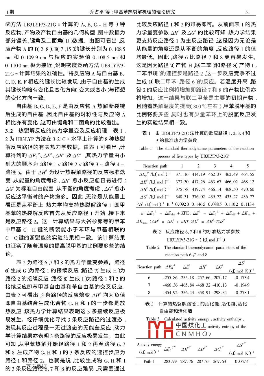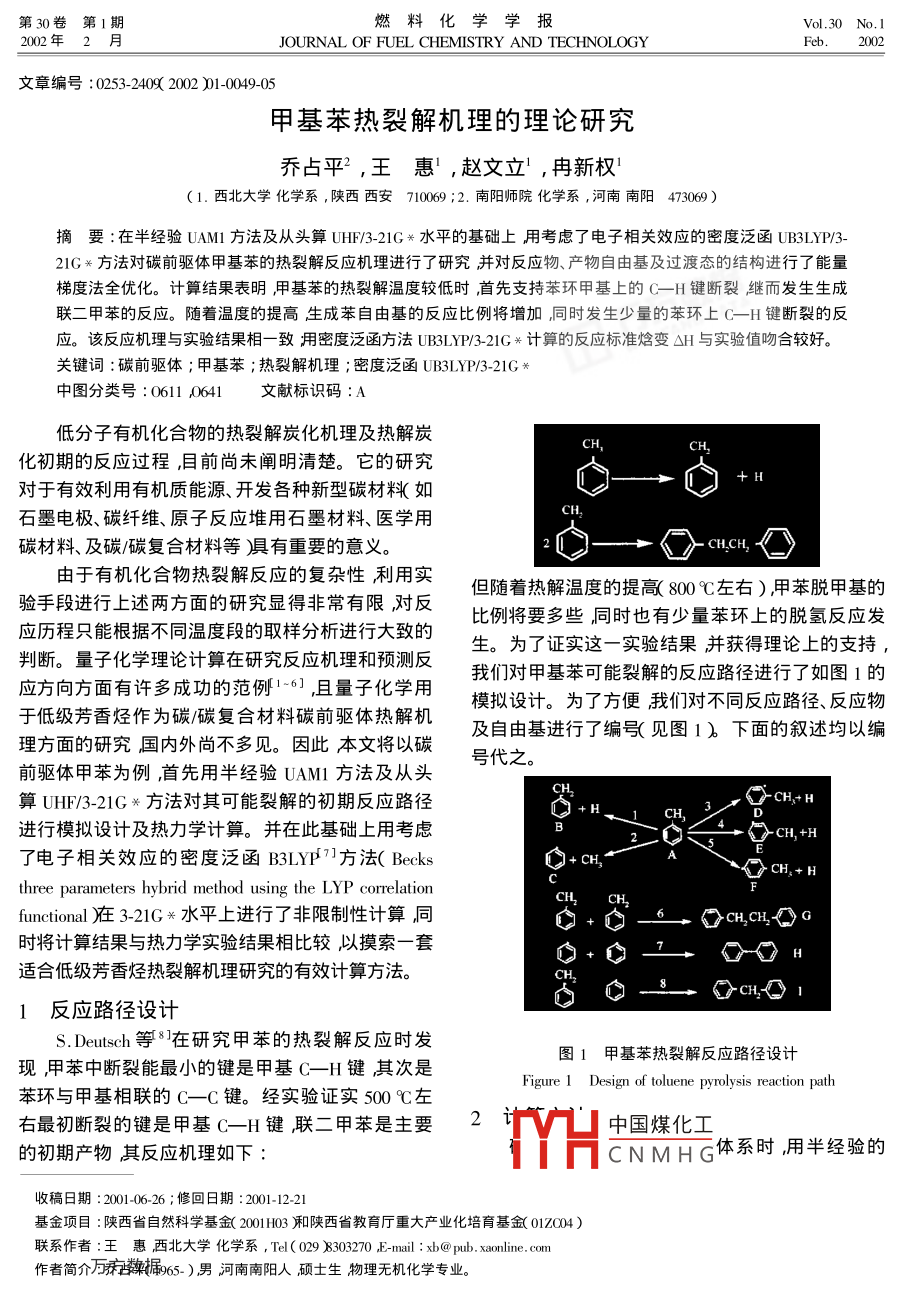 第30卷第1期燃料化學(xué)學(xué)報(bào)ol. 30 No I2002年2月JOURNAL OF FUEL CHEMISTRY AND TECHNOLOGY文章編號:0253-24092002m1-0049-05甲基苯熱裂解機(jī)理的理論研究喬占平2,王惠,趙文立,冉新權(quán)(1.西北大學(xué)化學(xué)系,陜西西安710069;2.南陽師院化學(xué)系,河南南陽473069)摘要:在半經(jīng)驗(yàn)UAM方法及從頭算UHF/3-21G*水平的基礎(chǔ)上用考慮了電子相關(guān)效應(yīng)的密度泛函UB3LYP321G※方法對碳前驅(qū)體甲基苯的熱裂解反應(yīng)機(jī)理進(jìn)行了研究并對反應(yīng)物、產(chǎn)物自由基及過渡態(tài)的結(jié)構(gòu)進(jìn)行了能量梯度法全優(yōu)化。計(jì)算結(jié)果表明甲基苯的熱裂解溫度較低時(shí),首先支持苯環(huán)甲基上的C-H鍵斷裂繼而發(fā)生生成聯(lián)二甲苯的反應(yīng)。隨著溫度的提高生成苯自由基的反應(yīng)比例將增加同時(shí)發(fā)生少量的苯環(huán)上C-H鍵斷裂的反應(yīng)。該反應(yīng)機(jī)理與實(shí)驗(yàn)結(jié)果相一致用密度泛函方法UB3LYP321G興計(jì)算的反應(yīng)標(biāo)準(zhǔn)焓變?chǔ)與實(shí)驗(yàn)值吻合較好。關(guān)鍵詞:碳前驅(qū)體;甲基苯;熱裂解機(jī)理;密度泛函UB3LYP3-21G興中圖分類號:0611,0641文獻(xiàn)標(biāo)識碼:A低分子有機(jī)化合物的熱裂解炭化機(jī)理及熱解炭化初期的反應(yīng)過程,目前尚未闡明清楚。它的研究T H對于有效利用有機(jī)質(zhì)能源、開發(fā)各種新型碳材料如石墨電極、碳纖維、原子反應(yīng)堆用石墨材料、醫(yī)學(xué)用碳材料、及碳/碳復(fù)合材料等具有重要的意義。CH CH,由于有機(jī)化合物熱裂解反應(yīng)的復(fù)雜性利用實(shí)驗(yàn)手段進(jìn)行上述兩方面的研究顯得非常有限對反但隨著熱解溫度的提高(800℃左右)甲苯脫甲基的應(yīng)歷程只能根據(jù)不同溫度段的取樣分析進(jìn)行大致的比例將要多些同時(shí)也有少量苯環(huán)上的脫氬反應(yīng)發(fā)生。為了證實(shí)這一實(shí)驗(yàn)結(jié)果并荻得理論上的支持判斷。量子化學(xué)理論計(jì)算在研究反應(yīng)機(jī)理和預(yù)測反應(yīng)方向方面有許多成功的范例1-61且量子化學(xué)用我們對甲基苯可能裂解的反應(yīng)路徑進(jìn)行了如圖1的于低級芳香烴作為碳碳復(fù)合材料碳前驅(qū)體熱解機(jī)模擬設(shè)計(jì)。為了方便我們對不同反應(yīng)路徑、反應(yīng)物理方面的研究國內(nèi)外尚不多見。因此本文將以碳及自由基進(jìn)行了編號見圖1下面的敘述均以編前驅(qū)體甲苯為例首先用半經(jīng)驗(yàn)UAM方法及從頭號代之。算UHF/3-21G興方法對其可能裂解的初期反應(yīng)路徑進(jìn)行模擬設(shè)計(jì)及熱力學(xué)計(jì)算。并在此基礎(chǔ)上用考慮CH. +H了電子相關(guān)效應(yīng)的密度泛函B3LYP7方法( Becksthree parameters hybrid method using the LYP correlationfunctional在3-21G水平上進(jìn)行了非限制性計(jì)算同cHc④時(shí)將計(jì)算結(jié)果與熱力學(xué)實(shí)驗(yàn)結(jié)果相比較以摸索一套適合低級芳香烴熱裂解機(jī)理研究的有效計(jì)算方法。反應(yīng)路徑設(shè)計(jì)S Deutsch等8在研究甲苯的熱裂解反應(yīng)時(shí)發(fā)圖苯熱裂解反應(yīng)路徑設(shè)計(jì)現(xiàn)甲苯中斷裂能最小的鍵是甲基C—H鍵其次是Figure 1 Design of toluene pyrolysis reaction path苯環(huán)與甲基相聯(lián)的C—C鍵。經(jīng)實(shí)驗(yàn)證實(shí)500℃左右最初斷裂的鍵是甲基C—H鍵朕二甲苯是主要2的初期產(chǎn)物其反應(yīng)機(jī)理如下TYH中國煤化工CNMHG體系時(shí)用半經(jīng)驗(yàn)的收稿日期:201-06-26;修回日期:2001-1221基金項(xiàng)目:陜西省自然科學(xué)基金2001H03和陜西省教育廳重大產(chǎn)業(yè)化培育基金017004)聯(lián)系作者:王惠西北大學(xué)化學(xué)系,Te(0298303270E-mil:xb@pub,kaoline.com作者簡介萬病|5)男河南南陽人碩士生物理無機(jī)化學(xué)專業(yè)。燃料化學(xué)學(xué)報(bào)30卷SCF-MO-AM方法進(jìn)行非限制性 Hartree-Fock( UHF)計(jì)反應(yīng)的△HF、△E、△E、△H、△C和△S。對熱計(jì)算雖耗時(shí)短但結(jié)果有時(shí)不太可靠。若計(jì)算時(shí)考力學(xué)支持的主反應(yīng)路徑用UAM法進(jìn)行了過渡慮電子相關(guān)效應(yīng)則計(jì)算大分子體系的UHF/3-21G*態(tài)的尋找和優(yōu)化并通過振動(dòng)頻率分析和RC方法方法又有一定的缺陷。而密度泛函理論在考慮電子對過渡態(tài)進(jìn)行了驗(yàn)證得到了主反應(yīng)的活化能。具相關(guān)效應(yīng)的同時(shí)不僅可進(jìn)行大分子體系的計(jì)算而體計(jì)算過程如下:于設(shè)計(jì)的熱裂解反應(yīng)為單分子且計(jì)算結(jié)果準(zhǔn)確、可靠”。為了摸索適合低級芳香反應(yīng)因此使單分子熱解可能得到的自由基之間保烴類化合物尤其是分子結(jié)構(gòu)較復(fù)雜的化合物熱分解持一個(gè)大的距離約為正常鍵長的3倍~5倍作為反應(yīng)機(jī)理研究的理論計(jì)算方法我們首先以〔s-產(chǎn)物構(gòu)型用Qsn方法優(yōu)化并經(jīng)振動(dòng)頻率分析確sian98程序包中的半經(jīng)驗(yàn)方法UAMI及從頭算UHF定有唯一的虛頻最后用RC法驗(yàn)證當(dāng)ⅢRC法得到方法對各反應(yīng)物及產(chǎn)物的幾何構(gòu)型進(jìn)行優(yōu)化。將優(yōu)的反應(yīng)物和產(chǎn)物與優(yōu)化的構(gòu)型和熱力學(xué)量一致