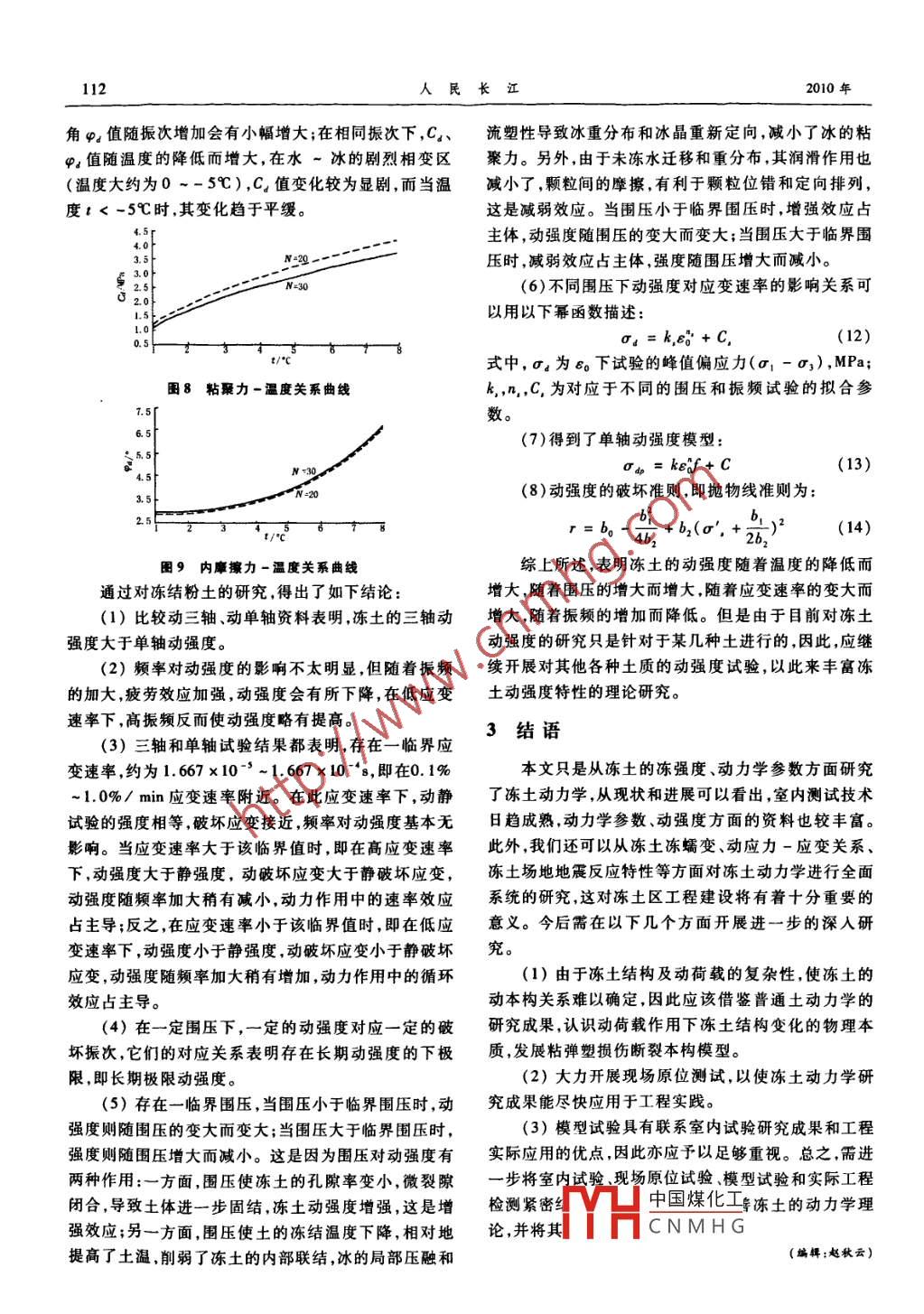第41卷增刊人民長江Vol. 41, Supplement200年11月Yangtze RiverNov.,2010文章編號:1001-479(2010)s1-0109-04凍土動力學特性分析王守,鞏立亮,烏晨曦,常顴彬,王越(1.黃河勘測規(guī)劃設(shè)計有隈公司,河南鄭州475003;2.河南黃河河務(wù)局信息中心,河南鄭州4500033.河南孟州黃河河務(wù)局,河南焦作472300;4.黃河水利職業(yè)技術(shù)學院,河南開封475003)犢要:在我因廣泛分布的特殊土一凍土具有獨特、復雜的動力學性質(zhì)和較高的致災性,與之相關(guān)的動力學問題巳成為工程界關(guān)注的焦點。為了滿足在振動荷載作用下凍土地基基礎(chǔ)設(shè)計的需要,近幾年來進行了大量凍土動力學性能研究,包括凍土的動蠕變和動強度。從一些瘳數(shù)和動強度角度介紹了凍土動力學的研究現(xiàn)狀概迷了研究和試驗的過程以及從中得出的結(jié)論,并就今后的研究方向和研究重點提出了的建議。關(guān)锽詞:凍土;動蠕變;動強度;動力學棗數(shù);動力學特性中圖法分類號:P642.14文獻標志碼:A凍土的動力學特性是寒區(qū)地球物理勘探、爆破開(即強度試驗)兩種。恒應力幅值動荷載試驗是施加挖工程、抗震及有振動機械的建筑設(shè)計的重要依據(jù)之正弦變化的軸向循環(huán)周期荷載,但應力幅值保持恒定。我國大部分季節(jié)性凍土區(qū)都屬于地震活動區(qū),開即展凍土區(qū)地震反應研究,對凍土區(qū)工程建設(shè)有著十分(1)重要的意義。另外,隨著寒區(qū)工程建設(shè)的迅速發(fā)展,現(xiàn)Constant有的一些理論和方法已經(jīng)滿足不了工程建設(shè)的需求(1+因而要求人們必須對凍土的動力特性進行系統(tǒng)而深入的研究。本文將主要從動強度和動力學參數(shù)方面來介恒應變速率等幅動應變試驗是控制應變變幅的紹凍土動力學的研究現(xiàn)狀。上、下界隨時間以同一速率等速增長,且應變變幅保持不變。1凍土的動力學參數(shù)及測試方法1.1.2共振柱法凍土的動力學參數(shù)主要有動彈性模量E4、動剪切共振柱法適用于小應變(103~103)、高頻率模量G4和動阻尼比η及泊松比μ。(幾赫茲到幾百赫茲)范圍測試,是無損檢測。根據(jù)共1.1參數(shù)測試方法振原理,在一個圓形試樣上施加縱向激振力或扭轉(zhuǎn)激目前用于凍土動力學參數(shù)測試的主要手段有動振力改變振動頻率使其產(chǎn)生共振,由共振頻率、試樣三(單)軸試驗法、共振柱法和波速法。尺寸邊界條件求得試樣的動模量,計算公式為:1.1.1動三(單)軸試驗法2PfH、E4=Q((4)B動三(單)軸試驗法適用于大應變(10~10-)2Pf,H低頻率(零點幾赫茲到十幾赫茲)范圍測試,可以模擬(5地震動荷載作用是目前使用最多的一種方法。圍壓式中,為共振頻率阻尼比通過自振法得到,即給試R1=0時為動單軸試驗。加載方式分恒應力幅值動荷件施加一個初始角位移,之后突然釋放試樣就處于自載(即蠕變試驗)和恒應變速率等幅動應變振動試驗由振動狀態(tài)。中國煤化工CNMHG收稿日期:2010-10-19作者簡介:王寧,男,助理工程師,主要從事土工試驗工作。E-mail:50372307@ qq. cont110人民長江2010年A的方程來描述,即:E/G AlnH +B(10)式中,A為第N次的振幅,A為第N+m次的振幅。式中,H為負溫絕對值;A和B是與土質(zhì)和含水率有關(guān)1.1.3波速法的參數(shù)。而且,顆粒越粗,動彈性模量和動剪切模量就波速法也是無損檢測,模擬地震波在土體中的傳越大。凍土的動泊松比隨著溫度的降低而減小。播,利用聲波儀測得縱波及橫波波速,從而求得土的動彈性模量、動剪切模量及動泊松比,計算公式為:黃士{u=18.86%)3pv(vp-3v)36±(u=3100%)EV: -V(8)Vp-2vs圖1動彈性模量與溫度關(guān)系V2-V2式中,V為縱波波速;V為橫波波速;p為密度。黃士(=18.8%)1.2凍土動力學特性分析貼土(u=31.00%)1.2.1動彈性模量、動剪切模量和動泊松比凍土的動彈性模量E4和動剪切模量G是凍土動超度/C力學參數(shù)中的重要指標,影響它們的主要因素有土質(zhì)、圖2動剪切模量與溫度關(guān)系含水量、溫度、圍壓頻率、應變幅值和應力等。目前已黏土(u=31.0%)得到普遍認可并通過3種試驗方法都得到的結(jié)論是:→篾土(u=18.86%(1)凍土的動彈性模量E與動剪切模量G4的變化規(guī)律相似;(2)土質(zhì)不同,E不同,凍土的E比未凍土的大土u=17,60兩個量級或更多粗顆粒土的E4大于細顆粒土的EA;(3)動模量隨溫度降低而增大,隨頻率加快而變圖3動泊松比與溫度關(guān)系大,隨應變幅值的增大而減小。圖4-6為一定溫度下凍結(jié)粘土與凍結(jié)黃土的動(4)隨著圍壓的增大,E總體上呈現(xiàn)出降低的趨彈性模量、動剪切模量及動泊松比隨含水率的變化曲勢,這種趨勢在粗粒土中的表現(xiàn)比細粒土的較為明顯,線。此外,可能還存在一個臨界圍壓,當圍壓變大時,E4先莫士(=-10°c)變大后變小,而在臨界圍壓處達到最大。當前,很多有關(guān)凍土動力學特性的研究工作都是5050針對某一種土質(zhì)和某一種方法進行的。下述試驗是王t(=-5·c)大雁、朱元林等人運用UVM-2型聲速測定儀,測定的不同含水率的凍結(jié)砂土、凍結(jié)黃土和凍結(jié)粘土在不同溫度下的超聲波波速(縱波波速和橫波波速),試驗圖4動彈性模量與含水率的關(guān)系土質(zhì)為哈爾濱粘土、蘭州黃土(粉土)及北京細砂。根由圖4~6可見:在低含水率范圍內(nèi)的凍結(jié)黃土,據(jù)彈性理論利用所測得的超聲波波速計算了被測凍其動彈性模量和動剪切模量隨