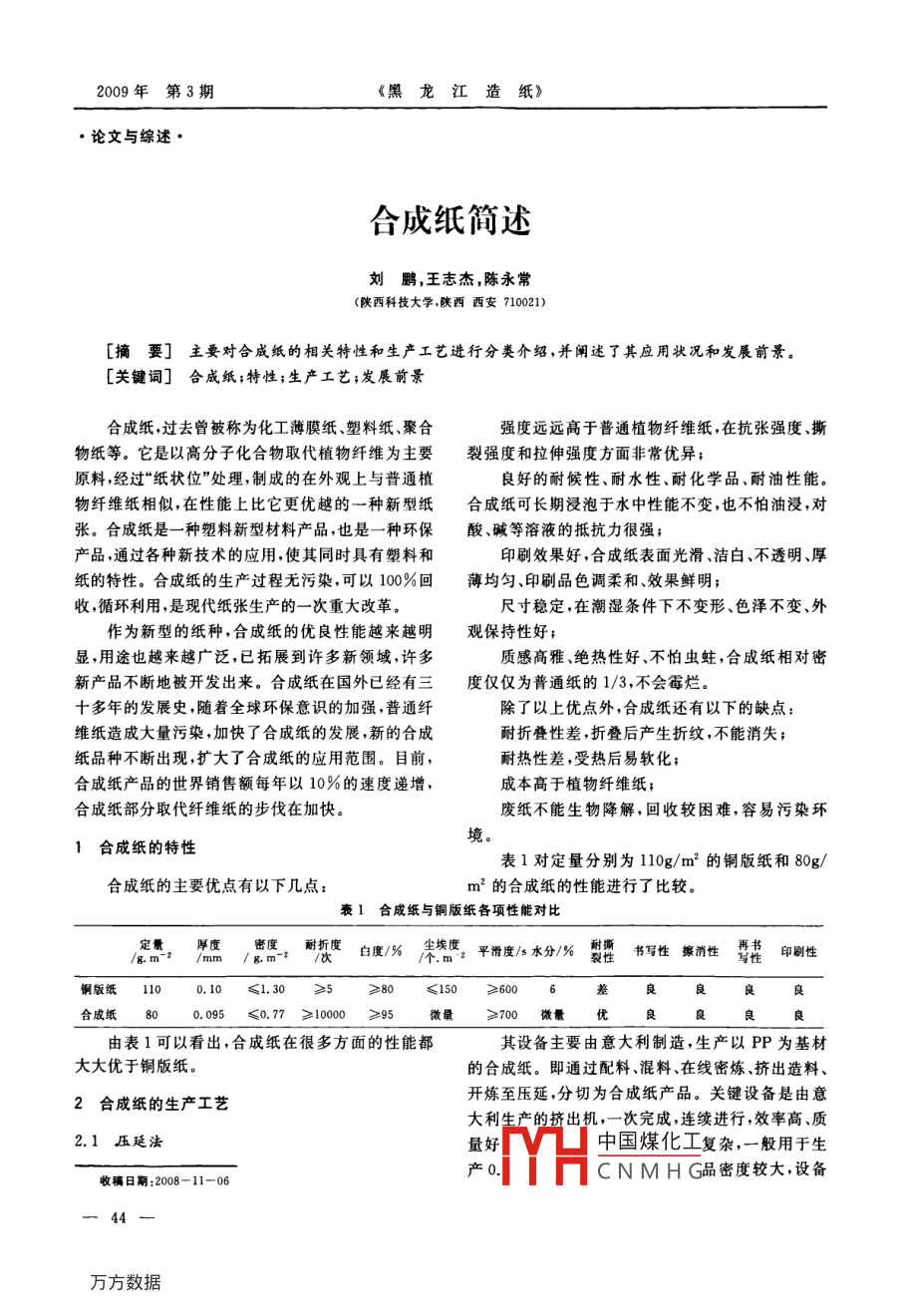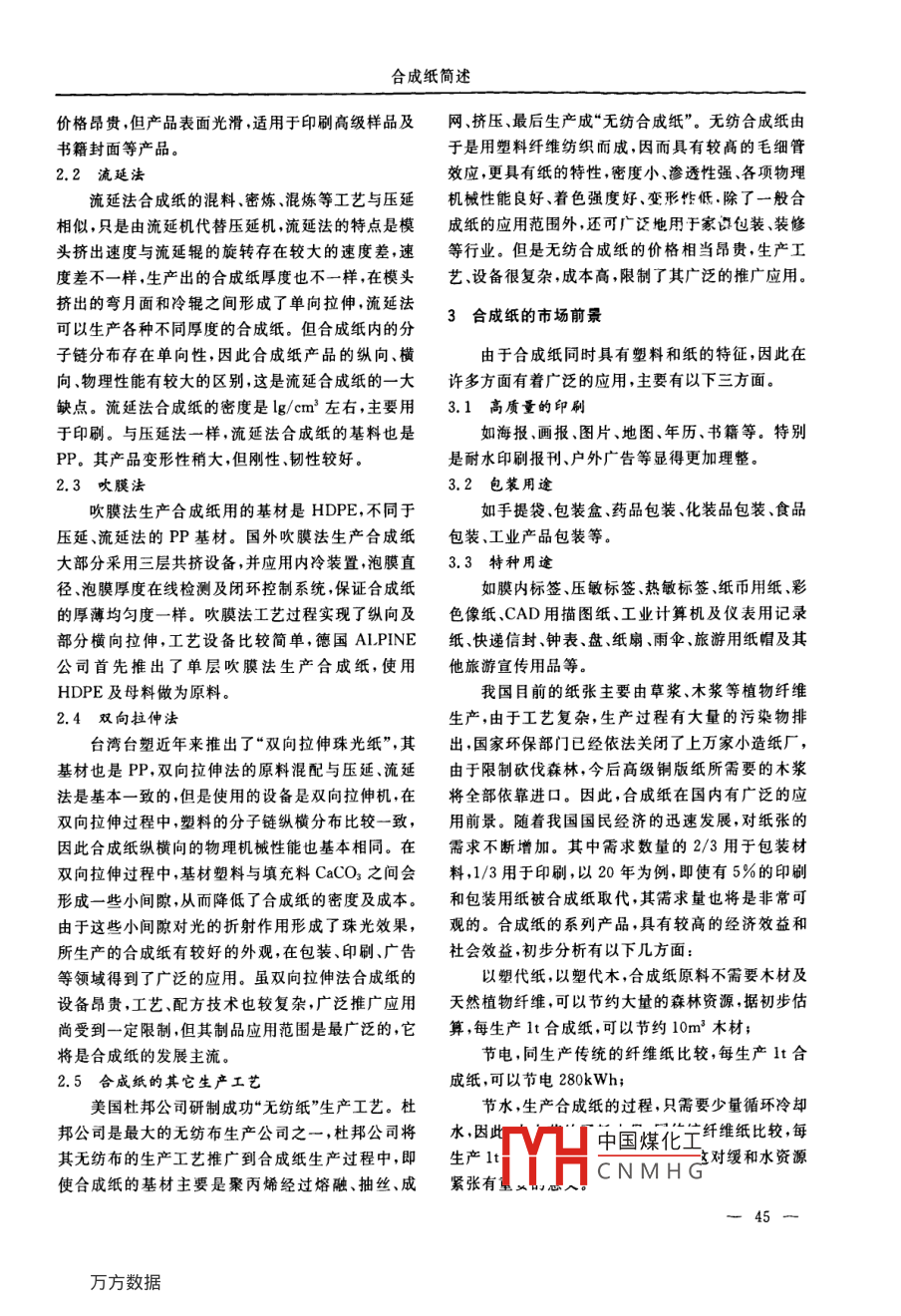 2009年第3期《黑龍江造紙》●論文與綜述●合成紙簡述劉鵬,王志杰,陳永常(陜西科技大學,陜西西安710021)[摘要]主要對合成紙的相關(guān)特性和生產(chǎn)工藝進行分類介紹,并闡述了其應用狀況和發(fā)展前景。[關(guān)鍵詞]合成紙;特性;生產(chǎn)工藝;發(fā)展前景合成紙,過去曾被稱為化工薄膜紙、塑料紙、聚合強度遠遠高于普通植物纖維紙,在抗張強度、撕物紙等。它是以高分子化合物取代植物纖維為主要裂強度和拉伸強度方面非常優(yōu)異;原料,經(jīng)過“紙狀位”處理,制成的在外觀上與普通植良好的耐候性、耐水性、耐化學品、耐油性能。.物纖維紙相似,在性能上比它更優(yōu)越的一種新型紙合成紙可長期浸泡于水中性能不變,也不怕油浸,對張。合成紙是一-種塑料新型材料產(chǎn)品,也是一種環(huán)保酸、堿等溶液的抵抗力很強;產(chǎn)品,通過各種新技術(shù)的應用,使其同時具有塑料和印刷效果好,合成紙表面光滑、潔白.不透明、厚紙的特性。合成紙的生產(chǎn)過程無污染,可以100%回薄均勻、印刷品色調(diào)柔和、效果鮮明;收,循環(huán)利用,是現(xiàn)代紙張生產(chǎn)的一次重大改革。尺寸穩(wěn)定,在潮濕條件下不變形、色澤不變、外作為新型的紙種,合成紙的優(yōu)良性能越來越明觀保持性好;顯,用途也越來越廣泛,已拓展到許多新領(lǐng)域,許多質(zhì)感高雅、絕熱性好、不怕蟲蛀,合成紙相對密新產(chǎn)品不斷地被開發(fā)出來。合成紙在國外已經(jīng)有三度僅僅為普通紙的1/3,不會霉爛。十多年的發(fā)展史,隨著全球環(huán)保意識的加強,普通纖除了以上優(yōu)點外,合成紙還有以下的缺點: .維紙造成大量污染,加快了合成紙的發(fā)展,新的合成耐折疊性差,折疊后產(chǎn)生折紋,不能消失;紙品種不斷出現(xiàn),擴大了合成紙的應用范圍。目前,耐熱性差,受熱后易軟化;合成紙產(chǎn)品的世界銷售額每年以10%的速度遞增,成本高于植物纖維紙;合成紙部分取代纖維紙的步伐在加快。廢紙不能生物降解,回收較困難,容易污染環(huán)境。1合成紙的特性表1對定量分別為110g/m’的銅版紙和80g/合成紙的主要優(yōu)點有以下幾點:m2的合成紙的性能進行了比較。表1合成紙與銅版紙各項性能對比,定最厚度密度。耐折度 白度/%塵埃度,平滑度/s水分/%教性書寫性 擦消性再書印刷性/g. m-/mmg m-2/個.m 2銅版紙1100.10≤1. 30.≥≥80≤150≥600良合成紙800.095≤0.77≥ 1000≥95微量≥700微量優(yōu)由表1可以看出,合成紙在很多方面的性能都其設(shè)備主要由意大利制造,生產(chǎn)以PP為基材大大優(yōu)于銅版紙。的合成紙。即通過配料、混料.在線密煉、擠出造料、開煉至壓延,分切為合成紙產(chǎn)品。關(guān)鍵設(shè)備是由意2合成紙的生產(chǎn)工藝大利生產(chǎn)的擠出機,一次完成,連續(xù)進行,效率高、質(zhì)2.1壓延法量好中國煤化工復雜,一般用于生產(chǎn)0.|YHCNMHG品密度較大,設(shè)備收稿日期:2008-11-06一44一合成紙簡述價格昂貴,但產(chǎn)品表面光滑,適用于印刷高級樣品及網(wǎng).擠壓.最后生產(chǎn)成“無紡合成紙”。無紡合成紙由書籍封面等產(chǎn)品。于是用塑料纖維紡織而成,因而具有較高的毛細管.2.2流延法效應,更具有紙的特性,密度小、滲透性強.各項物理流延法合成紙的混料.密煉、混煉等工藝與壓延機械性能良好、著色強度好、變形性低.除了一般合相似,只是由流延機代替壓延機,流延法的特點是模成紙的應用范圍外,還可廣泛地用于家濕包裝、裝修頭擠出速度與流延輥的旋轉(zhuǎn)存在較大的速度差,速等行業(yè)。但是無紡合成紙的價格相當昂貴,生產(chǎn)工.度差不一樣,生產(chǎn)出的合成紙厚度也不一樣,在模頭藝.設(shè)備很復雜,成本高,限制了其廣泛的推廣應用。擠出的彎月面和冷輥之間形成了單向拉伸,流延法3合成紙的市場前景可以生產(chǎn)各種不同厚度的合成紙。但合成紙內(nèi)的分子鏈分布存在單向性,因,此合成紙產(chǎn)品的縱向、橫由于合成紙同時具有塑料和紙的特征,因此在向、物理性能有較大的區(qū)別,這是流延合成紙的一-大許多方面有著廣泛的應用,主要有以下三方面。缺點。流延法合成紙的密度是lg/cm2左右,主要用3.1高質(zhì)量的印 刷于印刷。與壓延法一樣,流延法合成紙的基料也是如海報,畫報、圖片、地圖、年歷、書籍等。特別PP。其產(chǎn)品變形性稍大,但剛性、韌性較好。是耐水印刷報刊、戶外廣告等顯得更加理整。2.3吹膜法3.2包裝用途吹膜法生產(chǎn)合成紙用的基材是HDPE,不同于如手提袋、包裝盒、藥品包裝、化裝品包裝、食品壓延、流延法的PP基材。國外吹膜法生產(chǎn)合成紙包裝.工業(yè)產(chǎn)品包裝等。大部分采用三層共擠設(shè)備,并應用內(nèi)冷裝置,泡膜直3.3特種用途徑、泡膜厚度在線檢測及閉環(huán)控制系統(tǒng),保證合成紙如膜內(nèi)標簽、壓敏標簽、熱敏標簽、紙幣用紙、彩的厚薄均勻度一樣。吹膜法工藝過程實現(xiàn)了縱向及色像紙.CAD用描圖紙.工業(yè)計算機及儀表用記錄部分橫向拉伸,工藝設(shè)備比較簡單,德國AILPINE紙快遞信封、鐘表、盤、紙扇、雨傘、旅游用紙帽及其公司首先推出了單層吹膜法生產(chǎn)合成紙,使用他旅游宣傳用品等。HDPE及母料做為原料。我國目前的紙張主要由草漿、木漿等植物纖維2.4 雙向拉伸法生產(chǎn),由于工藝
