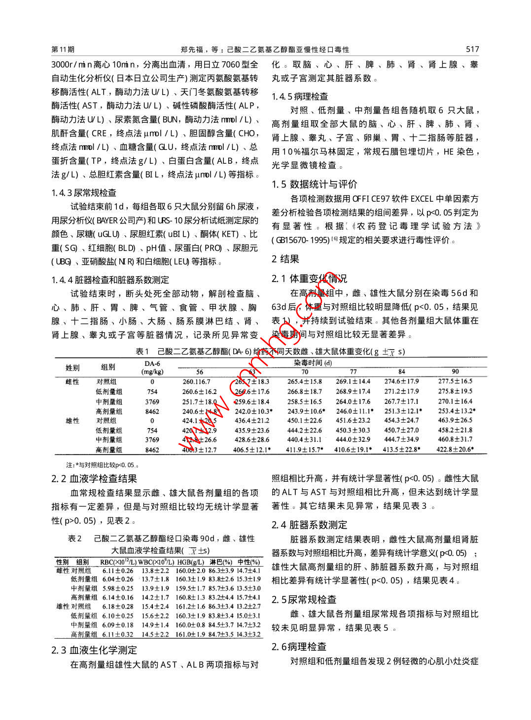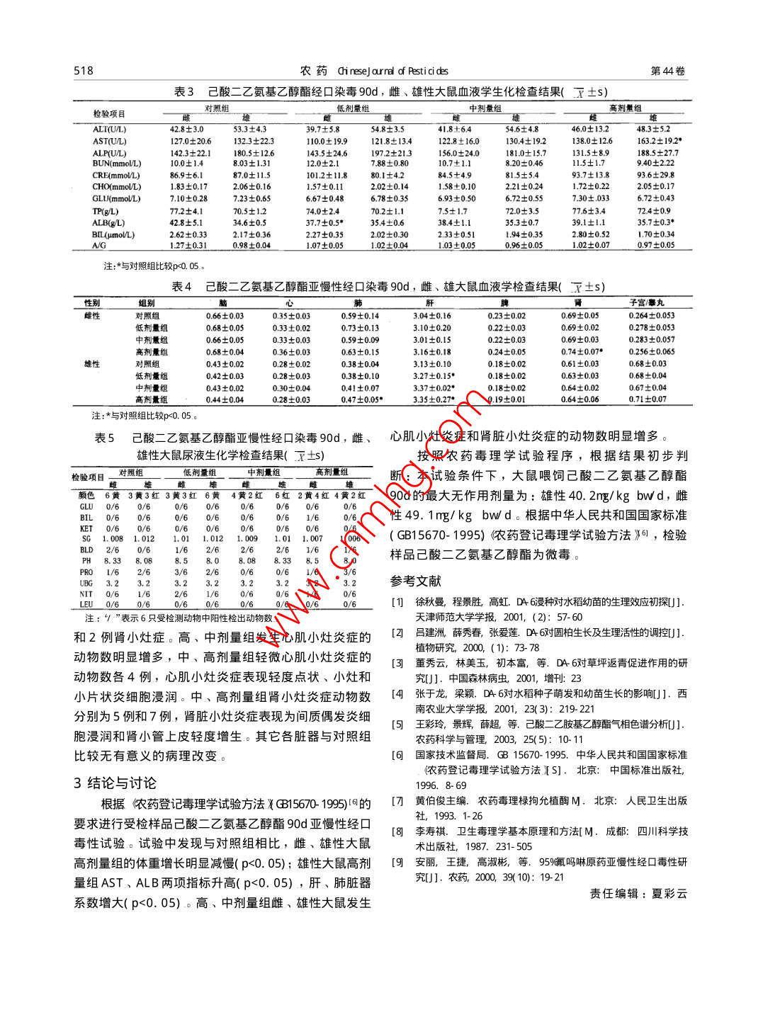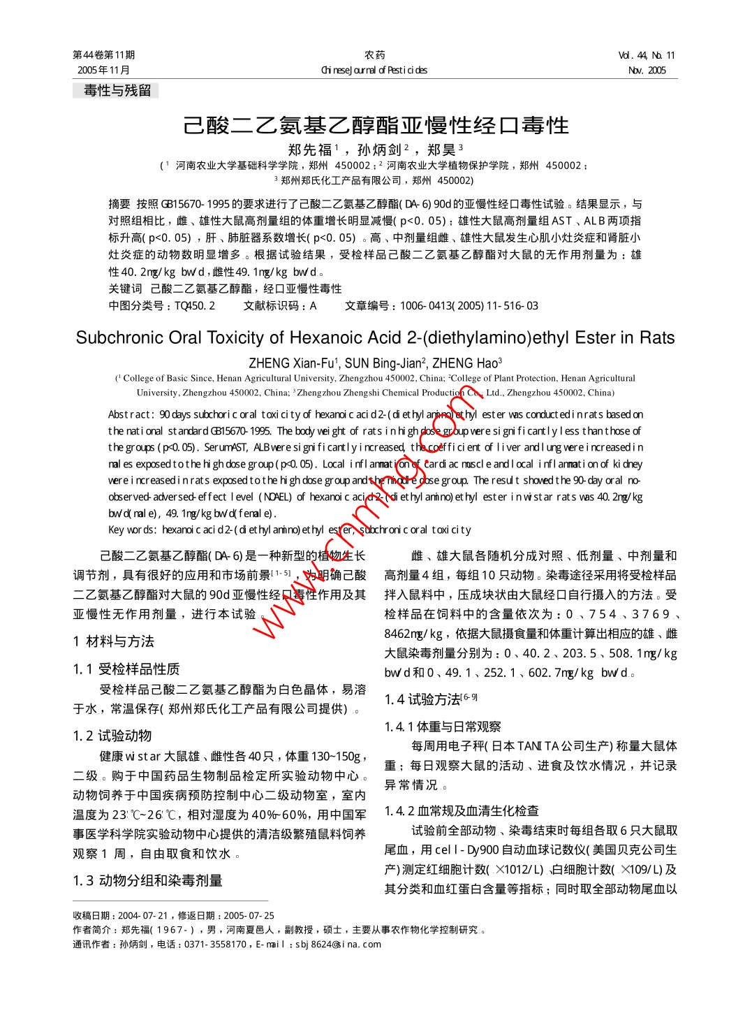 第44卷第11期農(nóng)藥.44N112005年11月Cinese arral d pesti cidesNbM.2005毒性與殘留己酸二乙氨基乙醇酯亞慢性經(jīng)口毒性鄭先福1,孫炳劍2,鄭昊31河南農(nóng)業(yè)大學(xué)基礎(chǔ)科學(xué)學(xué)院,鄭州450002;2河南農(nóng)業(yè)大學(xué)植物保護(hù)學(xué)院,鄭州450002;3鄭州鄭氏化工產(chǎn)品有限公司,鄭州450002)摘要按照B15670-1995的要求進(jìn)行了己酸二乙氨基乙醇酯(DA6)90d的亞慢性經(jīng)口毒性試驗(yàn)。結(jié)果顯示,與對(duì)照組相比,雌、雄性大鼠高劑量組的體重增長明顯諴慢〔p<0.05);雄性大鼠高劑量組AST、ALB兩項(xiàng)指標(biāo)升高(p<0.05),肝、肺臟器系數(shù)增長(p<0.05)。高、中劑量組雌、雄性大鼠發(fā)生心肌小灶炎癥和腎臟小灶炎癥的動(dòng)物數(shù)明顯增多。根據(jù)試驗(yàn)結(jié)果,受檢樣品己酸二乙氨基乙醇酯對(duì)大鼠的無作用劑量為:雄性40.2ng/ kg bw d,雌性49.1rg/ kg bw d關(guān)鍵詞己酸二乙氨基乙醇酯,經(jīng)口亞慢性毒性中圖分類號(hào):TQ450.2文獻(xiàn)標(biāo)識(shí)碼:A文章編號(hào):106-0413(2005)11-516-03Subchronic Oral Toxicity of Hexanoic Acid 2-diethylamino)ethyl Ester in RatsZHENG Xian-Fu, SUN Bing-Jian ZHENG HaosCollege of Basic Since, Henan Agricultural University, Zhengzhou 450002, China; College of Plant Protection, Henan AgriculturalUniversity, Zhengzhou 450002, China; Zhengzhou Zhengshi Chemical Production Co, Ltd, Zhengzhou 450002, China)Abstract: 90 days subchori c oral toxi ci ty of hexanoi c aci d 2(d et hyl annno)et hyl est er was conduct edi nrats based anthe nati onal st andard GB15670-1995. The body wei ght of rats in hi gh dose group were si gni fi cant ly less than those ofthe groups(p<0. 05). SerumAST, ALBwere si gni fi cantl y i ncreased the coef fi ci ent of l i ver and l ung were i ncreased i nal es exposed to the hi gh dose group p<0. 05). Local i nf I amati on of card ac uscl e and l ocal inf I amat i on of ki heywere i ncreased i n rat s exposed to the hi gh dose group and the dd e dose group. The resul t shoved the 90-day or al noobserved- adversed- ef fect I evel(NDAEL)of hexanoi c aci d 2(d et hyl annno)et hyl ester in wst ar rats was 40. 2ng/kgbwd al e), 49. 1ng/kg bwdferal eKey wor ds: hexanoi c aci d2( d et hyl annno)et hyl ester, subchron c oral toxi city己酸二乙氨基乙醇酯(D6)是一種新型的植物生長雌、雄大鼠各隨機(jī)分成對(duì)照、低劑量、中劑量和調(diào)節(jié)劑,具有很好的應(yīng)用和市場(chǎng)前景{1引,為明確己酸高劑量4組,每組10只動(dòng)物。染毒途徑采用將受檢樣品二乙氨基乙醇酯對(duì)大鼠的90d亞慢性經(jīng)口毒性作用及其拌入鼠料中,壓成塊狀由大鼠經(jīng)口自行攝入的方法。受亞慢性無作用劑量,進(jìn)行本試驗(yàn)。檢樣品在飼料中的含量依次為:0、754、37691材料與方法8462rg/kg,依據(jù)大鼠攝食量和體重計(jì)箅出相應(yīng)的雄、雌大鼠染毒劑量分別為:0、40.2、203.5、508.1mg/kg1.1受檢樣品性質(zhì)bwd和0、49.1、252.1、602.7mg/ kg bw d受檢樣品己酸二乙氨基乙醇酯為白色晶體,易溶1.4試驗(yàn)方法69于水,常溫保存(鄭州鄭氏化工產(chǎn)品有限公司提供1.2試驗(yàn)動(dòng)物1.4.1體重與日常觀察健康 w star大鼠雄、雌性各40只,體重130-150g,每周用電子秤(日本 TANITA公司生產(chǎn))稱量大鼠體重;每日觀察大鼠的活動(dòng)、進(jìn)食及飲水情況,并記錄二級(jí)。購于中國藥品生物制品檢定所實(shí)驗(yàn)動(dòng)物中心。異常情況動(dòng)物飼養(yǎng)于中國疾病預(yù)防控制中心二級(jí)動(dòng)物室,室內(nèi)溫度為23℃-26℃,相對(duì)濕度為40%60%,用中國軍142血常規(guī)及血清生化檢查事醫(yī)學(xué)科學(xué)院實(shí)驗(yàn)動(dòng)物中心提供旳清潔級(jí)繁殖鼠料飼養(yǎng)試驗(yàn)前全部動(dòng)物、染毒結(jié)束時(shí)每組各取6只大鼠取觀察1周,自由取食和飲水尾血,用cel|-D900自動(dòng)血球記數(shù)儀(美國貝克公司生產(chǎn))測(cè)定紅細(xì)胞計(jì)數(shù)(×1012/L)白細(xì)胞計(jì)數(shù)(×109/L及1.3動(dòng)物分組和染毒劑量其分類和血紅蛋白含量等指標(biāo);同時(shí)取全部動(dòng)物尾血以收稿日期:200407-21,修返日期:2005-07-25作者簡介:鄭先福(1967·),男,河南夏邑人,副教授,碩士,主要從事農(nóng)作物化學(xué)控制研究通訊作者:孫炳劍,電話:0371-3558170,E-maiI:sb8624@ina.com第11期鄭先:己酸二乙氨基乙醇酯亞慢性經(jīng)口毒性5173000r/mn離心10mn,分離出血清,用日立7060型全化。取腦、心、肝、脾、肺、腎、腎上腺、睪自動(dòng)生化分析儀(日本日立公司生產(chǎn))測(cè)定丙氨酸氨基轉(zhuǎn)丸或子宮測(cè)定其臟器系數(shù)移酶活性(ALT,酶動(dòng)力法UL)、天門冬氨酸氨基轉(zhuǎn)移4.5病理檢查酶活性(AST,酶動(dòng)力法U/L)、堿性磷酸酶活性(ALP,對(duì)照、低劑量、中劑量各組各隨機(jī)取6只大鼠,酶動(dòng)力法UL)、尿素氮含量(BUN,酶動(dòng)力法mo/凵)、高劑量組取全部大鼠的腦、心、肝、脾、肺、腎肌酐含量(CRE,終點(diǎn)法μmo/L)、膽固醇含量(CHo,腎上腺、睪丸、子宮、卵巢、胃、十二指腸等臟器,終點(diǎn)法mo/L)、血糖含量(GLU,終點(diǎn)法mo/L)、總用10%福爾馬林固定,常規(guī)石臘包埋切片,HE染色蛋折含量(TP,終點(diǎn)法g/L)、白蛋白含量(ALB,終點(diǎn)光學(xué)顯微鏡檢查法g/L)、總膽紅素含量(BIL,終點(diǎn)法μnol/L)等指標(biāo)。1.5數(shù)據(jù)統(tǒng)計(jì)與評(píng)價(jià)1.4.3尿常規(guī)檢查試驗(yàn)結(jié)束前1d,每組各取6只大鼠分別