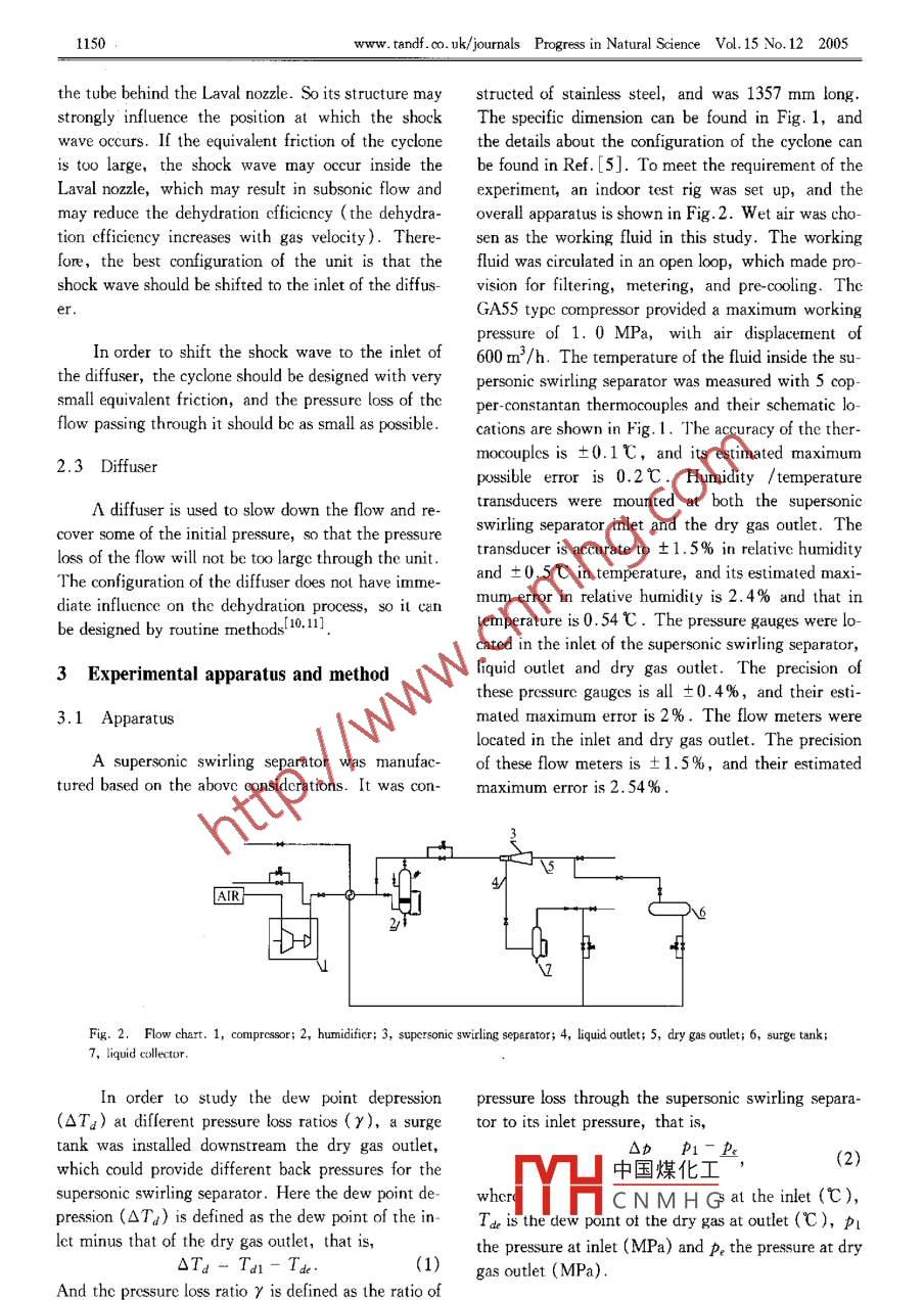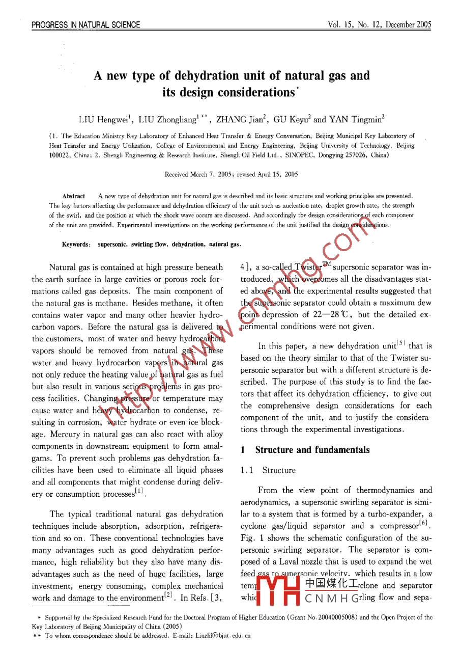 ROGRESS IN NATURAL SCIENCVol. 15. No. 12, December 2005A new type of dehydration unit of natural gas andits design considerationsLIU Hengwei, LIU Zhongliang", ZHANG Jian, GU Keyu and YaN Tingmi(1. The Education Ministry Key Laboratory of Enhanced Heat Transfer Energy Conversation, Beijing Municipal Key Laboratory ofHeat Transfer and Energy Utilization, College of Environmental and Energy Engineering, Beijing University of Technology, Beijing100022, China: 2. Shengli Engineering Research Institute, Shengli (I Field Lid. SINOPEC, Dongying 257026, ChinaRcccivcd March 7, 2005; revised April 15, 2005Abstract A new type of dehydration unit for natural gas is described and iis basir strueture and working principles are presentedThe key factors affecting the performance and dehydration efficiency of the unit such as nucleation rate droplet growth rate, the strengthof the swirl, and the position at which the shock wave occurs are discussed. And accordingly the design considerations of eadof the unit are provided. Experimental investigations on the working performance of the umit justified the design considerationsKeywords: supersonic, swirling now, dehydration, natural gas.Natural gas is contained at high pressure beneath 4], a so-called T M supersonic separator wasthe earth surface in large cavities or porous rock for- troduced, which overcomes all the disadvantages statmations called gas deposits. The main component of ed above, and the experimental results suggested thatthe natural gas is mcthane. Besides methane, it often the supersonic separator could obtain a maximum dewcontains water vapor and many other heavier hydro- point depression of 22-28 C, but the detailed excarbon vapors. Before the natural gas is deliveredperimental conditions were not giventhe customers, most of water and heavy hydrocarbonvapors should be removed from natural gas. TheseIn this paper, a new dehydration unit that iswater and heavy hydrocarbon vapors in natural gasbased on the theory similar to that of the twister su-not only reduce the heating value of natural gas as fuel personi separator but with a different structure is debut also result in various serious problems in gas pro-cribed. The purpose of this study is to find the factors that affect its dehydration efficiency, to give outcess facilities. Changing pressure or temperature may the comprehensive design considerations for eachcausc water and heavy hydrocarbon to condense, resulting in corrosion, water hydrate or even ice blockcomponent of the unit, and to justify the consideraage. Mercury in natural gas can also react with alloytions through the experimental investigationscomponents in downstream equipment to form amal1 Structure and fundamentalsgams. To prevent such problems gas dehydration facilities have been used to eliminate all liquid phases1 Structureand all componcnts that might condense during delinery or consurnption processesFrom the view point of thermodynamics andaerodynamics, a supersonic swirling separator is simiThe typical traditional natural gas dehydration lar to a system that is formed by a turbo-expander, atechniques include absorption, adsorption, refrigera- cyclone gas/liquid separator and a compressor 6)tion and so on. These conventional technologies have Fig. 1 shows the schematic configuration of the sumany advantages such as good dehydration perfpersoni swirling separator. The separator is commance, high reliability but they also have many dis- posed of a Laval nozzle that is used to expand the wetdvantages such as the need of huge facilities, large feed gas tnic velocity which results in a lowinvestment, energy consuming, complex mechanical temp中國煤化工 clone and separatorwork and damage to the environment 2. In Refs. [3, whCN MH Grling flow and sepaSupporledl hy the Specialized Research Fund for the Doctoral Program of Higher Education( Grant No. 20040005008)and thc Opcn Projcct of theKey laboratory of Beijing Municipality of China(2005)*Towhoncorrespondenceshouldbeaddressed.E-mail:Liuzhi(@bjut.edu.cnProgressinNaturalScienceVol.15No.122005www.tandf.co.uk/journals1149rate liquid from the gas and a diffuser that slows strength of swirling is another factor influencing thedown the flow and recovers some of the initial pres- dehydration efficiencysureIn addition, supersonic swirling separator is aval no?According to the theory of aerodynamicsthe position at which the shockwave occurs influences the performance of the unitsignificantly, so the position where the shock waveccur is also a key factor that affects the workieffiFig. 1. Schematic configuration of supersonic swirling separator1, L Aval nozzle; 2, cyclone; 3, diffuser: 4, wet gas inlct; 5, dryIn order to obtain good dehydration efficiency,gas outlet;6, liquid outle②-⑩, thermocouple;①and⑦,h-all the factors stated above should be considered formidity/ termperature transduce2. 1 Laval nozzleundanozzle, and is accelerated to the supersonicand with phasDue to the isentropic acceleration the temperalure andMacroscopically, this will result in the release of lasure of the natural gas will drop, making the nat- tent hcat to the flow and the spontaneous generationural gas mixture supersaturated. Nucleation will take of a liquid droplet cloud, whose properties stronglydepend on the coupling between the flow and the con-place and droplets will start to grow. Subsequently, a densation process itself. The non-equilibrium conden-swirl is induced in the gas nlow by means of a cyclone,which is placed in the tube behind the Laval sation can be separated into two distinct processes,nozzle. The droplets in the flow will be swirled to theamely, homogeneous nuclcation process and dropletwall of the tube. As a result, the core of the flow growth process. The homogeneous nucleation processhrough the tube becomes dry and the boundary layer phase, of stable clusters by the kinetic process of e-part of the flow ncar the tube wall contains most ofthe vapor components. The boundary lay
