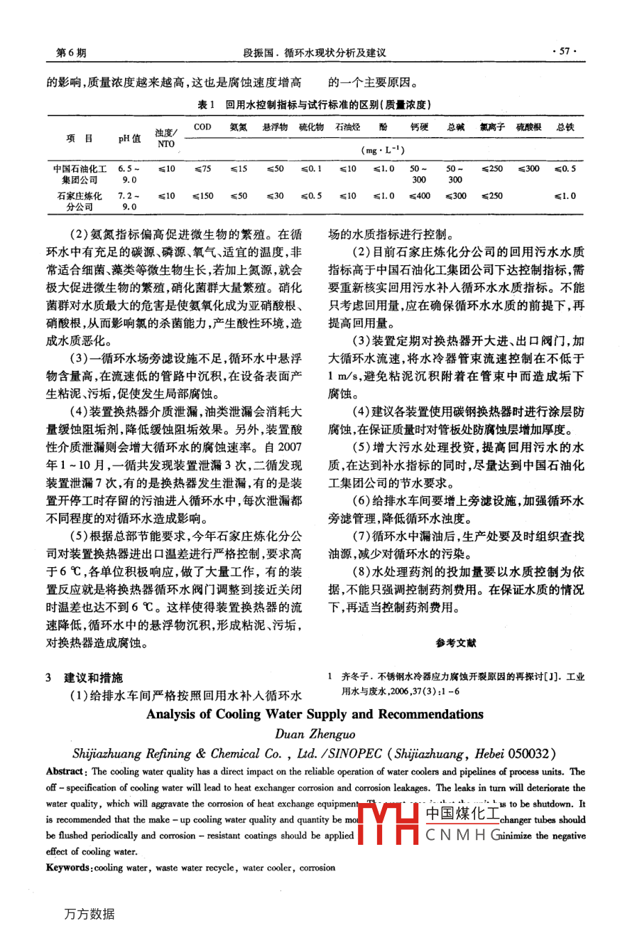 應用技術Corrosion Protection in Petrochemical Ind2008,25(6)循環(huán)水現(xiàn)狀分析及建議段搌國(中國石油化工股份有限公司石家莊煉化分公司,河北石家莊050032)摘要:循環(huán)水的水質(zhì)直彩響裝置水冷器及管路的安全透行,水質(zhì)超標,對換熱器形成腐蝕,造咸泄漏,泄渦進一步使水質(zhì)惡化,惡化的水質(zhì)再對冷換設備加重腐蝕,形成惡性循環(huán),嚴重時造威裝歪停產(chǎn)。建議對回用補充水的水質(zhì)指標和回用量應加強監(jiān)控,與此同時定期加大冷卻水氣對冷卻器管東進行沖洗以及對碳鋼水冷器采取涂層防護等措施,可減輕循水的危害。關鍵詞:循環(huán)水污水回用水冷器腐蝕中圖分類號:X912文獻標識碼:B文章編號:1007-015X(2008)06-0056-02中國石油化工股份有限公司石家莊煉化分公偏低司(以下簡稱石家莊煉化分公司)循環(huán)水投用污水(2)電脫鹽排放的含鹽污水COD(化學耗氧回用水以來從裝置冷卻器檢修的情況來看,有腐量)較高,達4000~1000mg/,且產(chǎn)生的油渣很蝕加劇的趨勢,大多數(shù)情況是循環(huán)水側腐蝕,尤其多,得不到及時有效處理,造成浮選運行效果差,使是管板管子的焊縫腐蝕最嚴重,許多管束的管板管生化及回用水COD偏高。子焊縫產(chǎn)生了裂紋。3)前期含硫污水汽提裝置運行異常,造成凈冷卻水重復利用是節(jié)水減排的必然趨勢,但也化水氨氮偏高。凈化水回用電脫鹽然后產(chǎn)生上述不是無條件的。一方面,在水的重復利用過程中,含鹽污水。該裝置于2007年9月26~28日檢修隨著水分的蒸發(fā)水中的溶解鹽類、懸浮固體及非目前裝置已運行正常,凈化水已達標揮發(fā)性有機物質(zhì)量濃度逐步增大,超過一定質(zhì)量濃(4)由于含油污水中氯離子質(zhì)量濃度偏高,目度時在管道、設備特別是在換熱面上發(fā)生結垢;另前沒有處理手段,造成回用水氯離子濃度偏高影方面,在水中有溶解氧存在的條件下,以鐵素體響污水回用。主要是1號罐區(qū)、200dam3原油脫水的陽極發(fā)生反應,可促進形成腐蝕電池,造成嚴重的垢下腐蝕;污垢覆蓋下的貧氧區(qū)與裸露的富氧區(qū)氯離子很高。1號罐區(qū)氯離子質(zhì)量濃度為1800mg/L,200dam3原油脫水氯離子質(zhì)量濃度為之間也能形成氧濃差電池,使金屬遭受局部腐蝕。反之,腐蝕也必然改變金屬的表面形狀,使結垢加5143mg/L,重整污水質(zhì)量濃度為497mg/L劇。這樣,結垢、腐蝕相互促進,形成錯綜復雜的協(xié)(5)監(jiān)測數(shù)據(jù),環(huán)保數(shù)據(jù)與水凈化數(shù)據(jù)有差同效應,影響甚至破壞生產(chǎn)系統(tǒng)的正常運行。別,環(huán)保測的數(shù)據(jù)大于水凈化數(shù)據(jù),有些數(shù)據(jù)水凈化的合格但環(huán)保檢測超標。1循環(huán)水情況分析(6)石家莊煉化分公司回用水控制指標與中(1)總磷、總鐵、異養(yǎng)菌、濁度、試管腐蝕速率國石油化工集團公司回用水試行標準有很大差別粘附速率等指標的合格率不小于95%,異養(yǎng)菌、試見表1管腐蝕速率和粘附速率有不合格的情況,異養(yǎng)菌和從上表1可以看出石家莊煉化分公司的控制粘附速率的不合格會增加設備的結垢速度。指標明顯低于集團公司的控制指標按此控制會增(2)氯離子質(zhì)量濃度偏高,平均在600~加給排水的水質(zhì)控制帶來壓力。700mg/L,最高為945mg/L。氯離子起到促進電22給排水循環(huán)水問題荷轉(zhuǎn)移提高電化學腐蝕速率,還會形成奧氏體不(1)循環(huán)水中氯離子,受回用污水氯離子較高銹鋼的晶間腐蝕。2目前存在的問題YH中國煤化工202-09-18石家莊人。1995年畢CNMHG高級工程師?,F(xiàn)在中2.1凈化回用水問題國石油化工股份有限公司石家莊煉化分公司從事設備和防(1)生化系統(tǒng)硝化反硝化反應失調(diào)造成pH值腐管理工作第6期段振國.循環(huán)水現(xiàn)狀分析及建議的影響,質(zhì)量濃度越來越高,這也是腐蝕速度增高的一個主要原因表1回用水控制指標與試行標準的區(qū)別(質(zhì)量濃度)PH值濁度/COD氮氮懸浮物硫化物石油烴酚鈣硬總堿氯離子硫酸根總鐵(mg·L-1)中國石油化工6.5≤10≤75≤15≤50≤0.1≤10≤1.050~50-≤250≤300≤0.5集團公司石家莊煉化7.29.0≤10≤150≤50≤30≤0.5≤10≤1.0≤300≤250≤1.0(2)氨氮指標偏高促進微生物的繁殖。在循場的水質(zhì)指標進行控制。環(huán)水中有充足的碳源、磷源、氧氣、適宜的溫度,非(2)目前石家莊煉化分公司的回用污水水質(zhì)常適合細菌藻類等微生物生長,若加上氮源就會指標高于中國石油化工集團公司下達控制指標,需極大促進微生物的繁殖,硝化菌群大量繁殖。硝化要重新核實回用污水補入循環(huán)水水質(zhì)指標。不能菌群對水質(zhì)最大的危害是使氨氧化成為亞硝酸根、只考慮回用量,應在確保循環(huán)水水質(zhì)的前提下,再硝酸根,從而影響氯的殺菌能力,產(chǎn)生酸性環(huán)境,造提高回用量。成水質(zhì)惡化(3)裝置定期對換熱器開大進、出口閥門,加(3)一循環(huán)水場旁濾設施不足,循環(huán)水中懸浮大循環(huán)水流速,將水冷器管束流速控制在不低于物含量高,在流速低的管路中沉積,在設備表面產(chǎn)1m/s,避免粘泥沉積附著在管束中而造成垢下生粘泥污垢,促使發(fā)生局部腐蝕。腐蝕。(4)裝置換熱器介質(zhì)泄漏,油類泄漏會消耗大4)建議各裝置使用碳鋼換熱器時進行涂層防量緩蝕阻垢劑,降低緩蝕阻垢效果。另外,