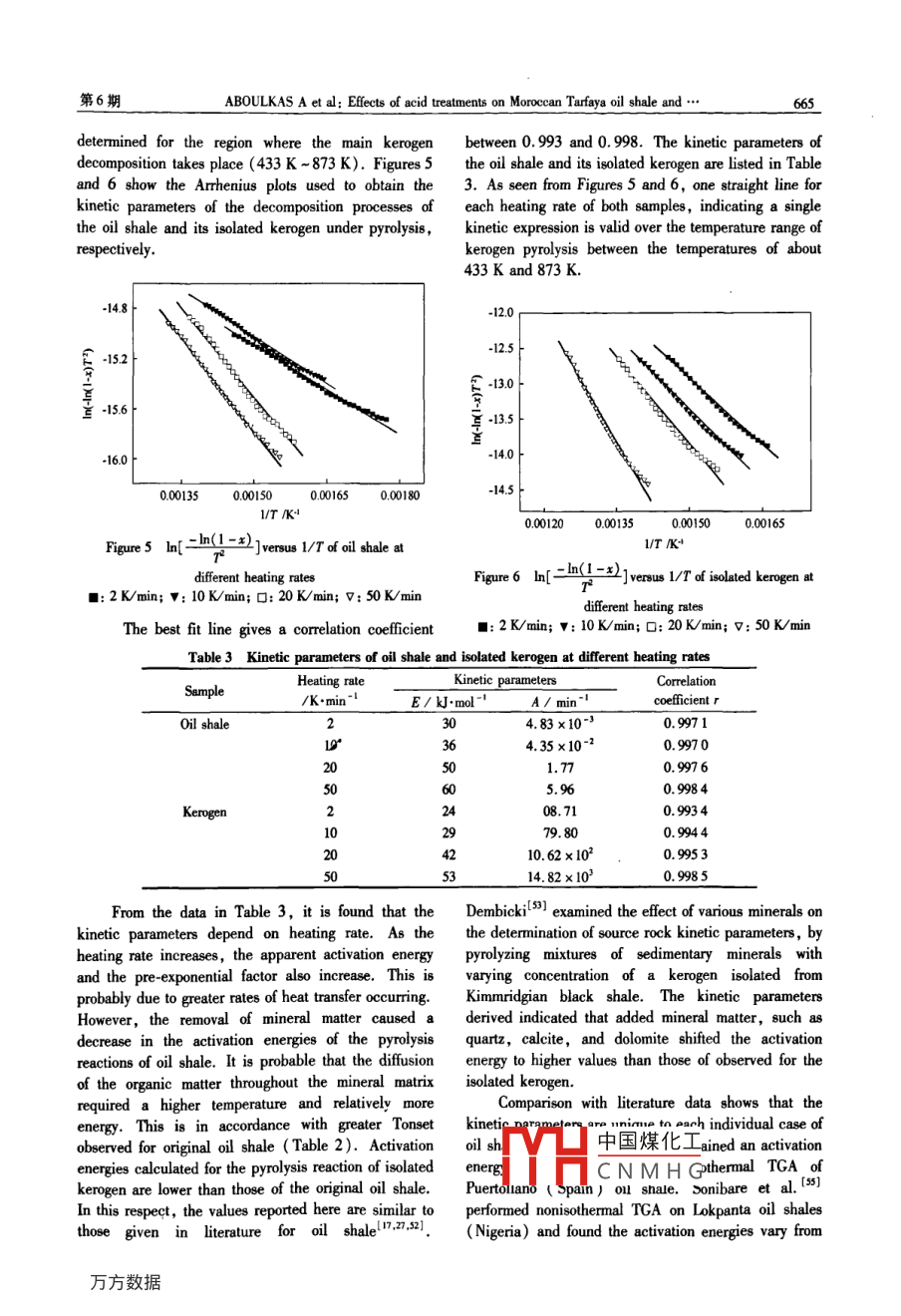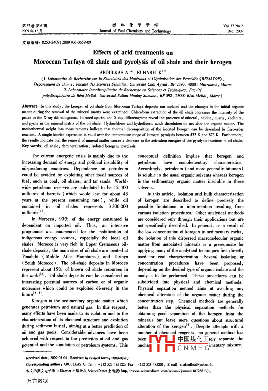 第37卷第6期燃料化學(xué)學(xué)報(bào)Vol.37 No.62009年12月Joumal of Fuel Chemistry and TechnologyDec. 2009文章編號(hào): 0253-2409(2009)06-0659-09Effects of acid treatments onMoroccan Tarfaya oil shale and pyrolysis of oil shale and their kerogenABOULKAS A'2, EI HARFI K!2(1. Laboratoire de Recherche sur la Reactivites des Materiaux et lOptimisation des Procedes《REMATOP> ,Deparement de chimie, Faculte des Sciences Semlalia, Universite Cadi Ayyad, BP 2390, 40001 Marrakech, Maroc .2. Laboratoire Interdisciplinaire de Recherche en Sciences et Techniques, Facultepolydisciplinaire de Beni-Mellal, Universite Sultan Moulay Slimane, BP 592 , 23000 Beni Melal, Maroc)Abstract: In this study, the kerogen of oil shale from Moroccan Tarfaya deposits was isolated and the changes in the initial organicmatter during the removal of the mineral matrix were examined. Chloroform extraction of the oil shale increases the intensity of thepeaks in the X-ray dffactograms. Infrared spectra and X-ray difractograms reveal the presence of mineral , calcite , quartz, kaolinite ,and pyrite in the mineral matrix of the oil shale. Hydrochloric and hydroluoric acids dissolution do not alter the organice matter. Thenonisothermal weight loss measurements indicate that thermal decomposition of the isolated kerogen can be described by first-orderreaction. A single kinetic expression is valid over the temperature: range of kerogenpyrolysis between 433 K and 873 K. Furthermore,the results indicate that the removal of mineral malter causes a decrease in the activation energies of the pyrolysis reactions of oil shale.Key words: oil shale; demineralization; isolated kerogen; pyrolysisThe curent energetic crisis is mainly due to theconceptual definition implies that kerogen andincreasing demand of energy and political instability ofpetroleum have complementarycharacteristics.oil-producing countries. Dependence on petroleumAccordingly, petroleum ( and more generally bitumen)could be avoided by exploiting other fossil sources of is soluble in the usual organic solvents whereas kerogenfuel, such as coal, oil shales, and tar sands. World-is the sedimentary organic matter insoluble in thesewide petroleum reserves are calculated to be 12 400solvents.milliards of barrels ( which would last for about 43In this article ,isolation and bulk characterizationyears at the present consuming rate) ,while oilof kerogen are described to define precisely thecontained in oil shales represents 3 300 000possible limitations in interpretation resulting frommilliards'various isolation procedures. Other analytical methodsIn Morocco, 90% of the energy consumed isare considered only through their applications but aredependent on imported oil. Thus, an intensivenot specifically described. In general, as a result ofprogramme was commenced for the mobilzation ofthe low concentration of kerogen in sedimentary rocks,indigenous energy sources, especially the local oithe isolation of this dispersed macromolecular organicshales. Morocco is very rich in Upper Cretaceous oilmatter from associated minerals is a prerequisite forshale deposits, the main sites of oil shale are located atapplying many of the analytical techniques first directlyTimahdit ( Middle Atlas Mountains ) and Tarfayaused for coal characterization. Several isolation or( South Morocco). The oil-shale deposits in Moroccoconcentrationprocedures have been proposed,represent about 15% of known oil shale resources independing on the desired type of organic isolate and thethe world!2). Oil-shale deposits can be considered asanalysis to be performed. These procedures can beinteresting potential sources of carbon or of organicsubdivided into physical and chemical methods.molecules which could be exploited diversely in thePhysical separation method aims at avoiding anyfuturel3-5].chemical alteration of the organic matter during theKerogen is the sedimentary organic matter whichconcentration step. Chemical methods are generallygenerates petroleum and natural gas. In this respect ,better than the physical separation methods formany efforts have been made to its isolation and to theobtaining good separation of the kerogen from thechatacterization of its chemical structure and evolutionminerals but leave more questions about structuralduring sediment burial, aiming at a better prediction ofalteration of the kerogen'Despite attempts with aoil and gas pools. Considerable advances have beennumber of chemical reagents. no general method hasachieved with respect to the prediction of oil and gasbeen中國(guó)煤化工tely separate thpotential and the simulation of petroleum systems. Thisunchai.FYTHCNMHGimentary mixture.Received date: 2009-0504; Received in rerised form: 2009 08-10.Corresponding author; ABOULKAS A: Tel.: +212 523 485122; Fax: +212 523 485201。E-mail: a. aboulkas@ yahoo. fr。本文的英文電子版由Elserier出版社在ScienceDiret上出版( htp://www siencedrect. con/sience/jouma/18725813)。660燃料化學(xué)學(xué)報(bào)第37卷The conventionalhydrochloric/hydrofluoric acidGoymuk and Green River oil shale. Berkorich et al18])treatment is efective for removing most carbonate ,presented a novel technique to the thermaloxide,and monosulfide minerals from sedimentarycharacterization of oil shale. This approach involves therocks and leaves kerogen and pyrite largelyseparation of the unique components of oil shale, theunaffected-9. Effective removal of pyrite is usuallykerogen and the clay minerals, using chemical andthe main problem' 0. Petroleum geochemists have longphysical techniques. Enthalpy data for dehydration andbeen interested in obtaining pyrite free and chemicallypyrolysis of kerogen were also determined.unaltered kerogen concentrates. Quantiative removalThe aim of this study was to investigate the effectsof pyrite is not possible without alteration of the organicof hydrochloric and hydrofluoric acids treatments. Thecomposition. The magnitude of the change in