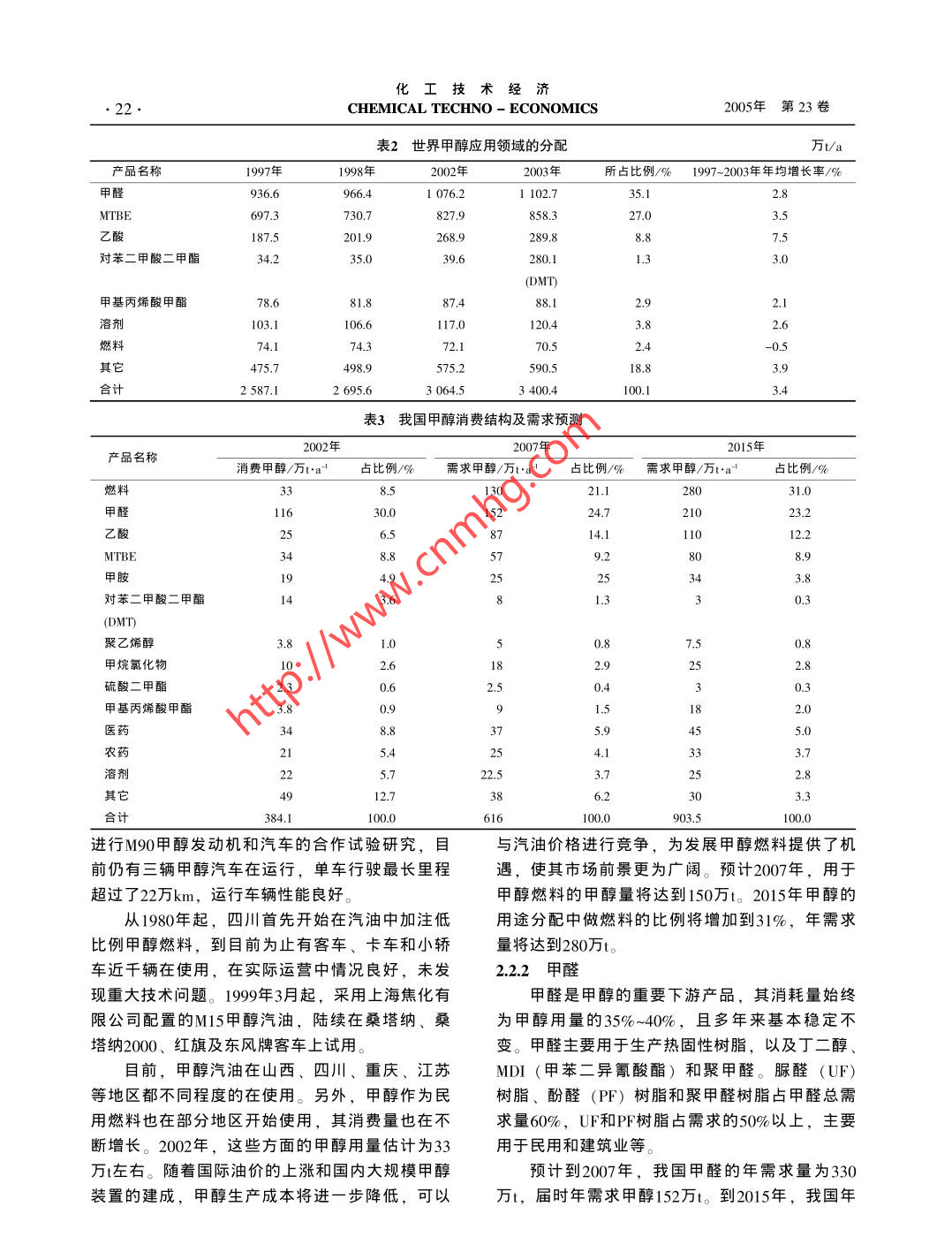 化工技術(shù)經(jīng)濟(jì)第23卷第2期.20.CHEMICAL TECHNO - ECONOMICS2005年2月市場(chǎng)及遒勢(shì)甲醇及下游產(chǎn)品供需現(xiàn)狀與預(yù)測(cè)張寶軍,肖海成,邢立華,孫永成,韓云光(大慶石化公司研究院,大慶163714)摘要:論述了甲醇供需現(xiàn)狀與預(yù)測(cè),甲醇下游產(chǎn)品消費(fèi)結(jié)構(gòu)與需求發(fā)展趨勢(shì),提出了對(duì)發(fā)展我國甲醇工業(yè)的建議。關(guān)鍵詞:甲醇;衍生物;市場(chǎng)需求分析;預(yù)測(cè)文章編號(hào): 1006- -253X 2005) 02- 0020-05中圖分類號(hào): TQ223.12*1文獻(xiàn)標(biāo)識(shí)碼: A甲醇為無色透明易燃、易揮發(fā)的極性液體,今后幾年世界甲醇生產(chǎn)能力分布格局的變化,是一種重要的基本有機(jī)化工原料。在世界范圍內(nèi)有三個(gè)方面因素值得考慮:第一,到2010年,全的化工產(chǎn)品中,其產(chǎn)量僅次于乙烯、丙烯和苯,世界的甲醇產(chǎn)能及消費(fèi)遞增將保持在2%~3%。屆居第四位。廣泛用于有機(jī)中間體、醫(yī)藥、農(nóng)藥、時(shí),按開工率為80%計(jì),全世界甲醇供需基本維染料、涂料、塑料、合成纖維、合成橡膠等其他持平衡。第二,-些工業(yè)發(fā)達(dá)國家紛紛關(guān)閉效率化工生產(chǎn)中,還用作溶劑和工業(yè)、民用燃料等。不高的甲醇生產(chǎn)裝置而轉(zhuǎn)向進(jìn)口甲醇。美國1999甲醇用于化工生產(chǎn)的產(chǎn)品達(dá)數(shù)百種,主要衍生物年關(guān)閉了6套總計(jì)生產(chǎn)能力達(dá)320萬/a的生產(chǎn)裝有:甲醛、甲基叔丁基醚、乙酸、甲胺、二甲醚、置; Methanex公司也關(guān)閉了新西蘭2套總計(jì)生產(chǎn)能甲酸甲酯、硫酸二甲酯、對(duì)苯二甲酸二甲酯、力97萬t/a的生產(chǎn)裝置;日本唯一的一套甲醇生產(chǎn)基丙烯酸甲酯、氯甲烷類、合成燃料等。甲醇及裝置也已經(jīng)關(guān)閉,成為甲醇進(jìn)口國。第三,拉丁其下游產(chǎn)品的供求關(guān)系對(duì)國民經(jīng)濟(jì)發(fā)展有影響。美洲和中東地區(qū)因具有廉價(jià)的天然氣資源,今后1市場(chǎng)需求及供應(yīng)現(xiàn)狀幾年新增甲醇生產(chǎn)能力較快,其次為東亞地區(qū)1.1 世界.2003年,由于中東具有石化原料充足、產(chǎn)品生產(chǎn)20世紀(jì)90年代以來,世界甲醇的生產(chǎn)能力與成本低廉等眾多優(yōu)勢(shì),以及亞洲迅速增長的市場(chǎng),實(shí)際使用量逐年增加,世界甲醇產(chǎn)量以較穩(wěn)健的致使沙特阿拉伯和其他中東國家紛紛加快投資甲速率增長,見圖1。美洲是世界上最大的甲醇生產(chǎn)醇行業(yè)。地,占世界總生產(chǎn)能力的40%。世界甲醇生產(chǎn)具1.2 國內(nèi)體分布:北美洲21%,拉丁美洲20%,西歐10%,20世紀(jì)90年代以來,我國甲醇工業(yè)發(fā)展迅東歐12%,中東16%,非洲2%,東亞13%,大洋速,生產(chǎn)能力增長很快。1990年,我國甲醇生產(chǎn)能力為86萬t/a,到2003年已達(dá)到600萬t/a,年增6000r長率高達(dá)31%。我國近年甲醇生產(chǎn)能力和產(chǎn)量見圖2,甲醇進(jìn)口量見圖3,甲醇開工率和自給率情5 000能力求況見圖4400020世紀(jì)90年代以前,我國甲醇年消費(fèi)量在300100萬t左右,20世紀(jì)80年代后期僅50萬~60萬t,進(jìn)口數(shù)量不到10萬t,自給率在90%以上,裝置開000-工率在80%以上。但從20世紀(jì)90年代中期起,設(shè)01997 1998 20002001 2005 2010收稿日期: 2004-09-17作者簡介:張寶軍(1973-), 男,黑龍江省人,工程師,從事天圖1世界甲醇供需 情況與預(yù)測(cè)然氣化工科研工作。第2期張寶軍等:甲醇及下游產(chǎn)品供需現(xiàn)狀與預(yù)測(cè).21●1200表1 國內(nèi)擬建10萬t/a以上規(guī)模甲醇裝置一覽萬v/a企業(yè)名稱能力特點(diǎn)1 000中海油富島化工公司60 以南海大陸架天然氣為原料6反800兗礦集團(tuán)煤化工基地60 以兗州煤為原料瀘天化集團(tuán)公司40與日本東洋工程公司合作量晉城煤化工基地50以100元/t高硫無煙煤為原料制開400取燃料甲醇20中原氣化公司化工二廠0以河南煤為原料中原氣化公司光山化工廠20 以河南煤為原料1994 1995 1996 1997 1998 1999 2000 2001 2002 2003 2007晉中市煤化工基地60以當(dāng)?shù)?0元/高硫煤為原料京煤集團(tuán)京東煤化工基地60 聯(lián)產(chǎn)5萬/a二甲醚發(fā)電25 MW重慶建峰化工廠合成氣工60聯(lián)產(chǎn)5萬t/a二 甲醚發(fā)電25 MW圖2我國甲醇生產(chǎn)能力和產(chǎn)量業(yè)園區(qū)180神木化工公司60以當(dāng)?shù)?0元/低硫煤為原料160安陽化工集團(tuán)公司20以煙煤為原料140上?;萆こ碳夹g(shù)公司120陜西渭河煤化工集團(tuán)公司13 聯(lián)產(chǎn)1萬t/a二甲 醚100山東聯(lián)盟化工公司)煙煤為原料30 t山西焦化集團(tuán)公司2以焦?fàn)t氣為原料河南駿馬化工集團(tuán)公司以煤為原料山西大洋公司60 以焦?fàn)t氣為原料0 1994 1999 199 1997 1998 1999 2000 2001 2002 2003 -寶鋼集團(tuán)煤山鋼鐵公司10以焦?fàn)t氣、高爐氣、轉(zhuǎn)爐氣為原料年份圖3我國甲醇進(jìn)口量2甲醇消費(fèi)結(jié)構(gòu)分析2.1世界在甲醇衍生物消費(fèi)結(jié)構(gòu)中,甲醛是第一消費(fèi)號(hào)80-70家大戶(占35.1%), MTBE是第二位(占27%), 乙酸,白給率僅次之(占8.8%)。 另外還有很多種產(chǎn)品,體現(xiàn)了甲醇下游產(chǎn)品的多樣性。世界甲醇應(yīng)用領(lǐng)域分配: 405 30情況見表2。床22.2國內(nèi)目前,我國很多甲醇用作燃料及添加劑,而1994 1995 1996 1997 1998 1999 2000 