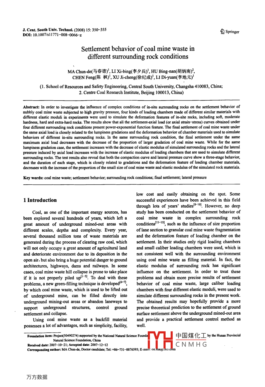 J. Cent. South Univ. TechnoL.(2008)15: 350-355DOI:10.1007/sl171-0080066zSettlement behavior of coal mine waste indifferent surrounding rock conditionsMA Chun-de(馬春德),LIXi-bing(李夕兵), HU Bing-nan(胡炳南)2,CHEN Feng(陳楓), XU Ji-cheng(徐紀成)},LIDi-yuan(李地元)(1. School of Resources and Safety Engineering, Central South University, Changsha 410083, China;2. Centre Coal Research Institute, Beijing 100013, China)Abstract: In order to investigate the influence of complex conditions of in-situ surrounding rocks on the settlement behavior ofnubbly coal mine waste subjected to high gravity pressure, four kinds of loading chambers made of different similar materials withdifferent elastic moduli in experiments were used to simulate the deformation features of in-site rocks, including soft, moderatehardness, hard and extra-hard rocks. The results show that all the settlement-axial load(or axial strain-stress)curves obtained underfour different surrounding rock conditions present power-exponential function feature. The final settlement of coal mine waste underthe same axial load is closely related to the lumpiness gradations and the deformation behavior of chamber materials used to simulatebehaviors of different in-situ surrounding rocks. In the same surrounding rock condition, the final settlement under the samemaximum axial load decreases with the decrease of the proportion of larger gradation of coal mine waste, while for the samelumpiness gradation case, the settlement increases with the decrease of elastic modulus of simulated surrounding rocks and the lateralpressure induced by axial load increases with the increase of elastic modulus of loading chambers that are used to simulate differentsurrounding rocks. The test results also reveal that both the compaction curve and lateral pressure curve show a three-stage behavior,and the duration of each stage, which is closely related to gradations and the deformation feature of loading chamber materials,decreases with the increase of the proportion of the small size of coal mine waste and elastic modulus of the simulated rock materials.Key words: coal mine waste; settlement behavior; surrounding rock conditions; final settlement; lateral pressurelow cost and easily obtaining on the1 Introductionsuccessful experiences have been achieved in this fieldthrough lots of years'studies 8-10, However, no deepCoal, as one of the important energy sources, has study has been conducted on the settlement behavior ofbeen explored several hundreds of years, which left a coal mine waste in complex surrounding rockgreat amount of underground mined-out areas with conditions!l-15), such as the influence of size proportiondifferent scales, depths and complexity. Every year, of lane section to granular coal mine waste fragmentationseveral thousand million tons of waste materials are and the deformation feature of loading chamber on thegenerated during the process of clearing raw coal, which settlement. In their studies only rigid loadingwill not only occupy a great amount of agricultural land and small caliber loading chambers were used,and deteriorate environment due to its deposition in the not consistent well with the surrounding enviopen air, but also bring a huge potential danger to ground using coal mine waste as filling material. In fact, thearchitectures, highways, dams and railways. In some elastic modulus of surrounding rock has significantcases, coal mine waste hill collapse is prone to take place influence on the settlement. In order to treat theseif it is not properly piled up>. To deal with these problems and obtain more precise results of settlementproblems, a new green-filling technique is developed(6-7, behavior of coal mine waste, large caliber loadingby which coal mine waste, which is used to be lifted out chambers with four different elastic moduli, were used toof underground mine, can be filled directly into simulate different surrounding rocks in the present work.underground mining-out areas or abandon laneways to The obtained results may hopefully provide a moresupport underground structures, control ground precise theoretical prediction to the settlement of groundsettlement and collapsesurface settlement above the underground mined-out areaUsing coal mine waste as a backfill material and provide a practical settlement control mepossesses a lot of advantages, such as simplicity, facility,Foundation item: Project(50490274)supported by the National Natural Science Founda中國煤化工 the Hunan provincialNatural Science Foundation, ChinaReceived date: 2007-10-21; Accepted date: 2007-12-12HCNMHGCorresponding author: MA Chun-de, Doctor candidate; TeL:+86-731-8876593; E-mail:camaigJ Cent. South Univ. Technol. (2008)15: 350-355thick wall cylinders with 320 mm in inside diameter, 402 Experimental method and proceduresmm in wall thickness, and 300 mm in height, and thechamber in Fig. 1(d) used to simulate the extra-hard2.1 Sample preparationsurrounding rock was made of seamless steel pipe, withAll coal mine wastes used in the test were chosen 320 mm in inside diameter, 10 mm in wall thickness, andfrom the Gaokeng Coal Mine in Jiangxi Province, China, 300 mm in height. The elastic modulus of the similarwhich were hoisted currently from underground coal material was measured by the standard samplesmine. They was divided first into five granular size artificially made using the same material when thelevels from large to small using sieving method: Pl homologous loading chambers were moulded10 mm) and P5(<10 mm), and then different samples 2.3 Experimental design and procedureswere built up according to the lumpiness gradationsIn this work, four surrounding rock conditioncases listed in Table 1corresponding to soft, moderate hardness, hard and extrahard coal bed, were simulated to investigate theTable 1 Lumpiness gradations cases of contrastive samples settlement behavior of coal mine waste located at about800 m in depth underground mined
